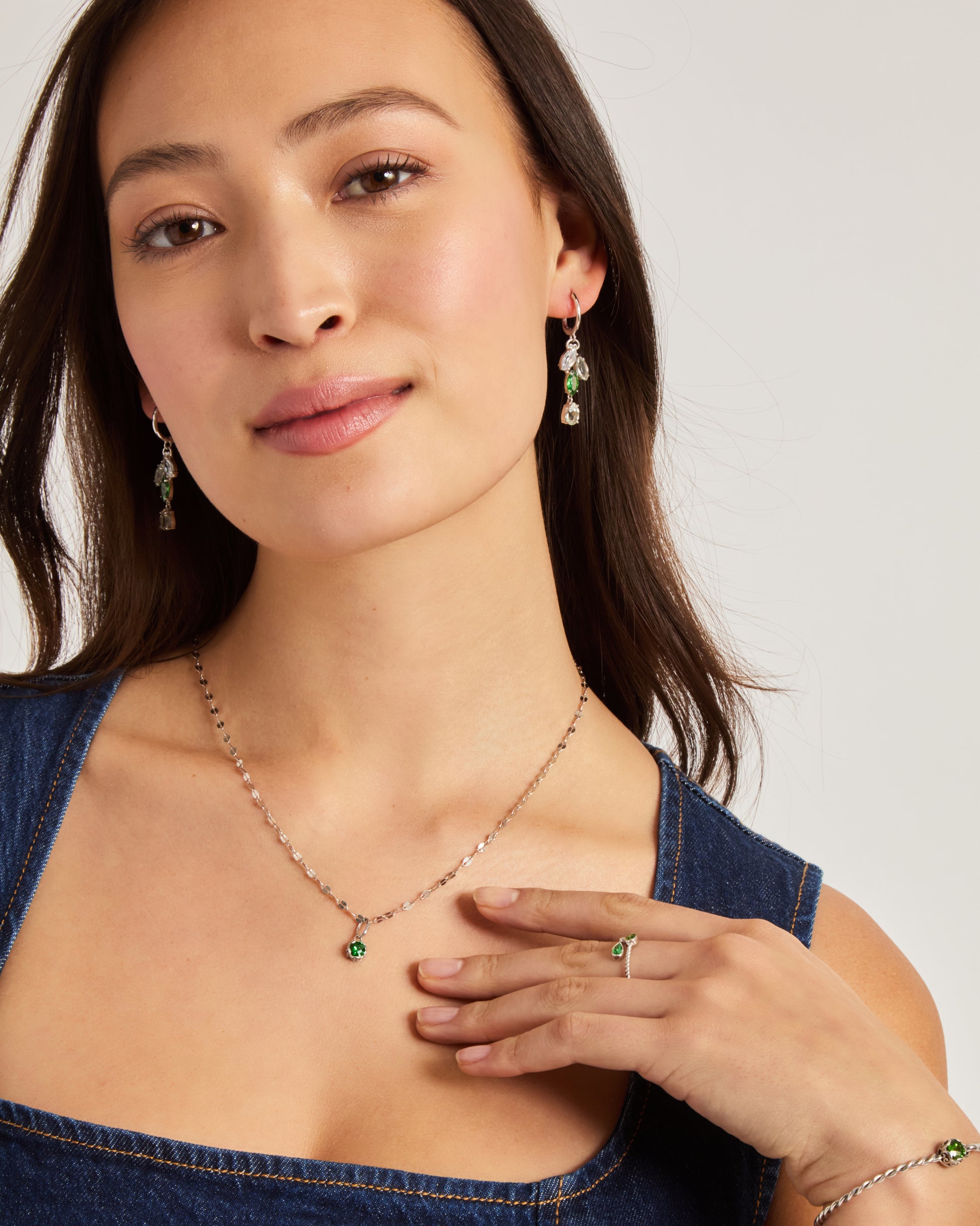 Merging two classic styles, the Gemstone Chandelier Drop Huggie features a sterling silver huggie hoop with delicate chandelier drops, showcasing four faceted stones suspended from our signature petroglyph replica. This elegant design is perfect for both special occasions and everyday wear.