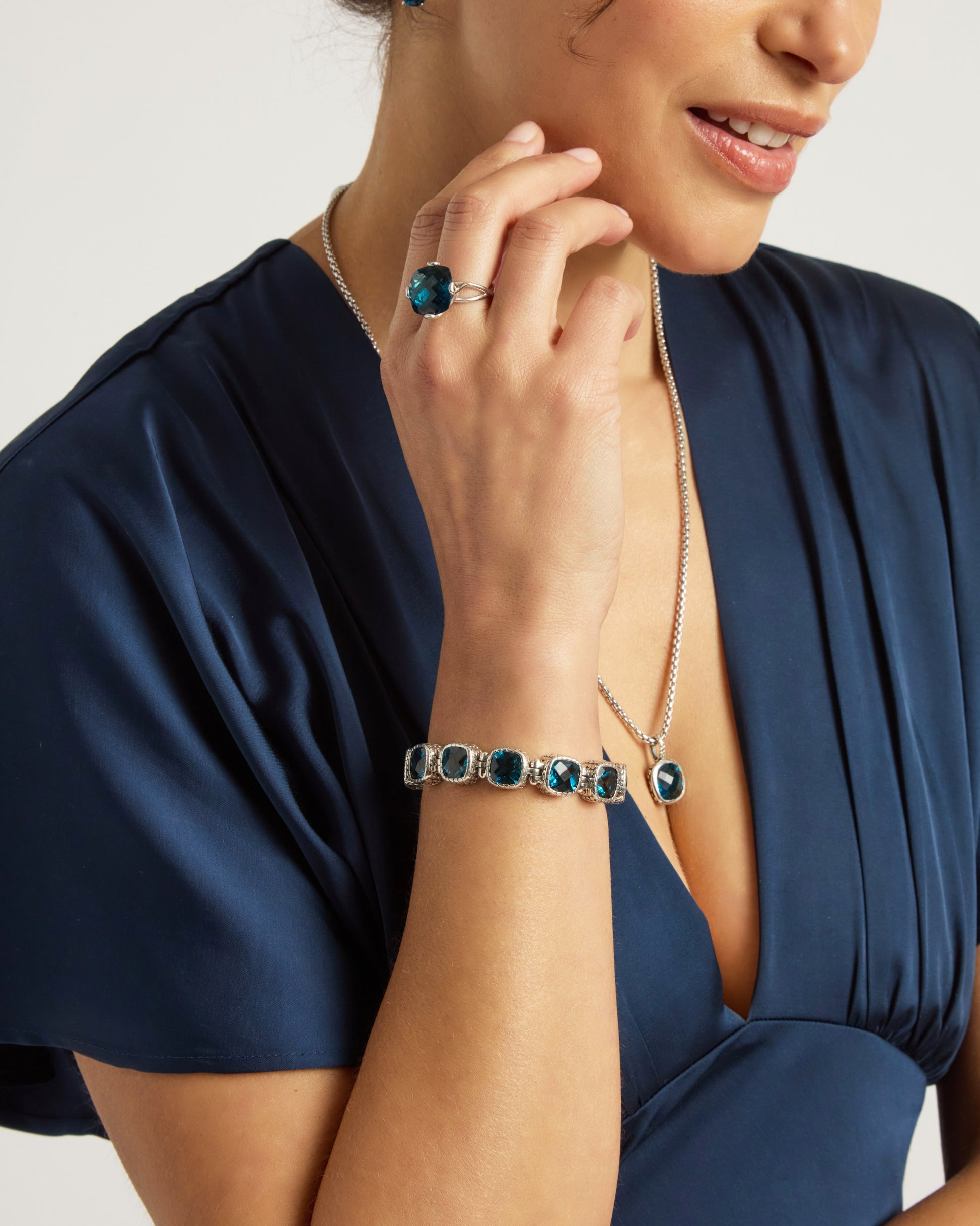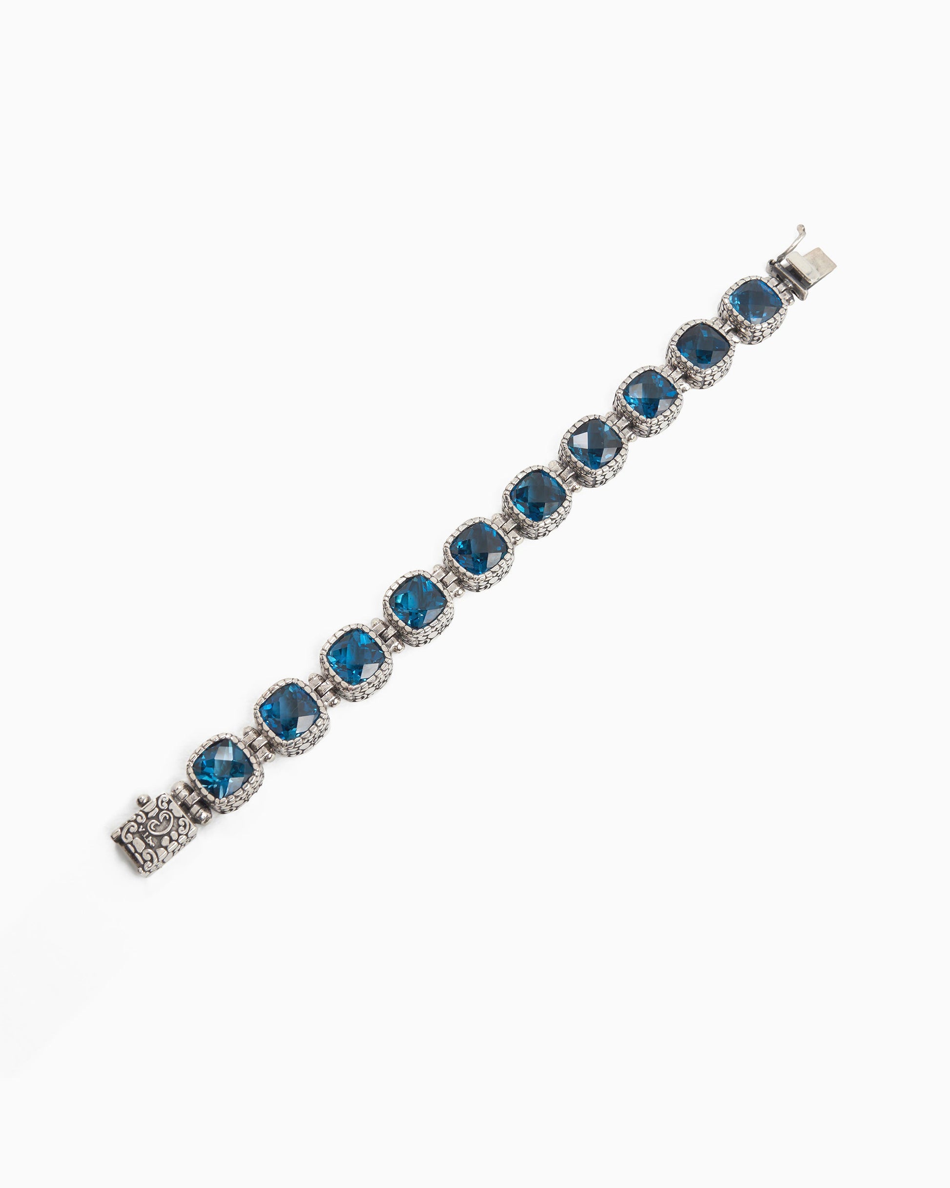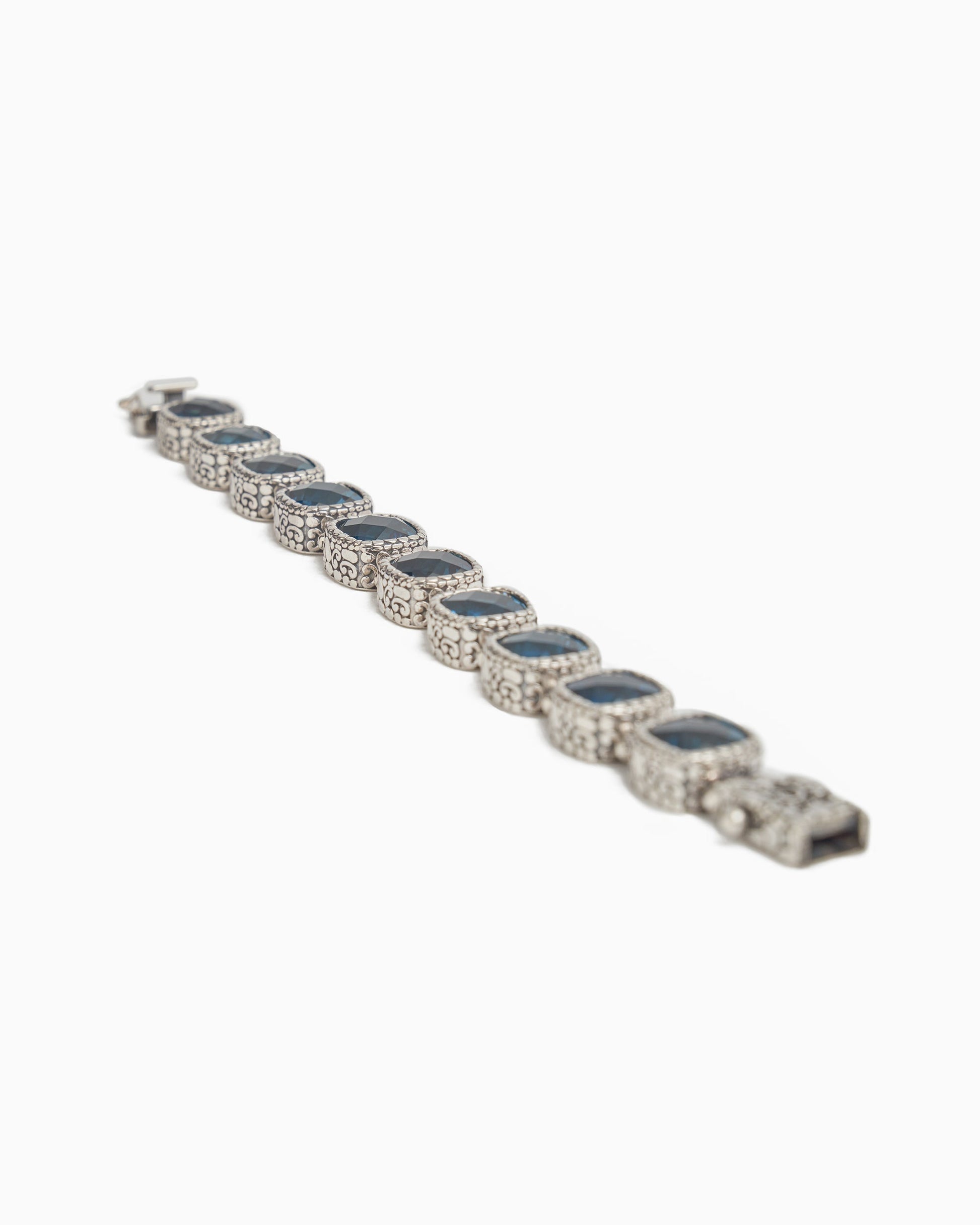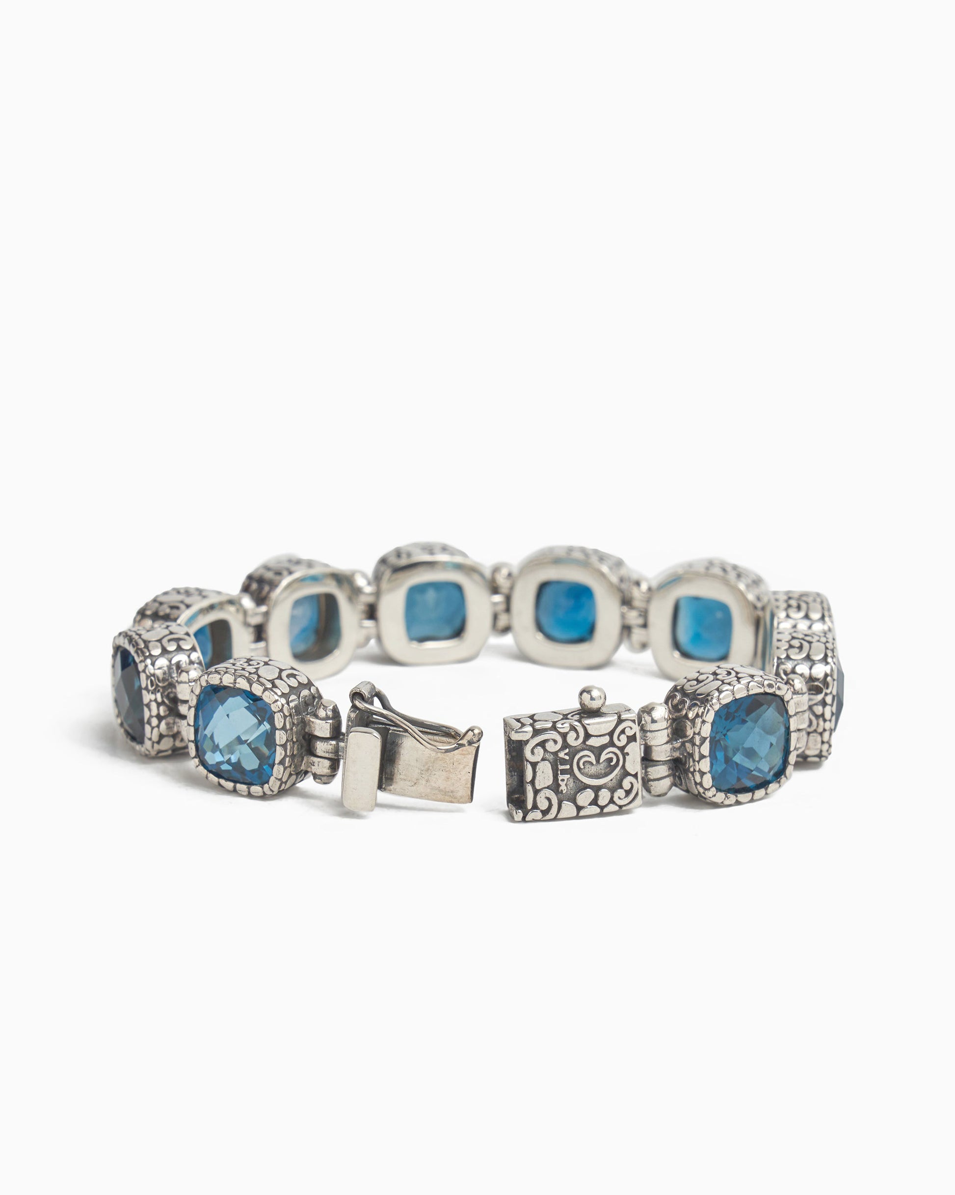 The Gemstone Link Bracelet with Turtle Texture features luminous cushion cut London blue topaz stones throughout the band. Each stone is set in a sterling silver link featuring our signature turtle texture with petroglyphs. This piece is guaranteed to make a statement and will dazzle any look.