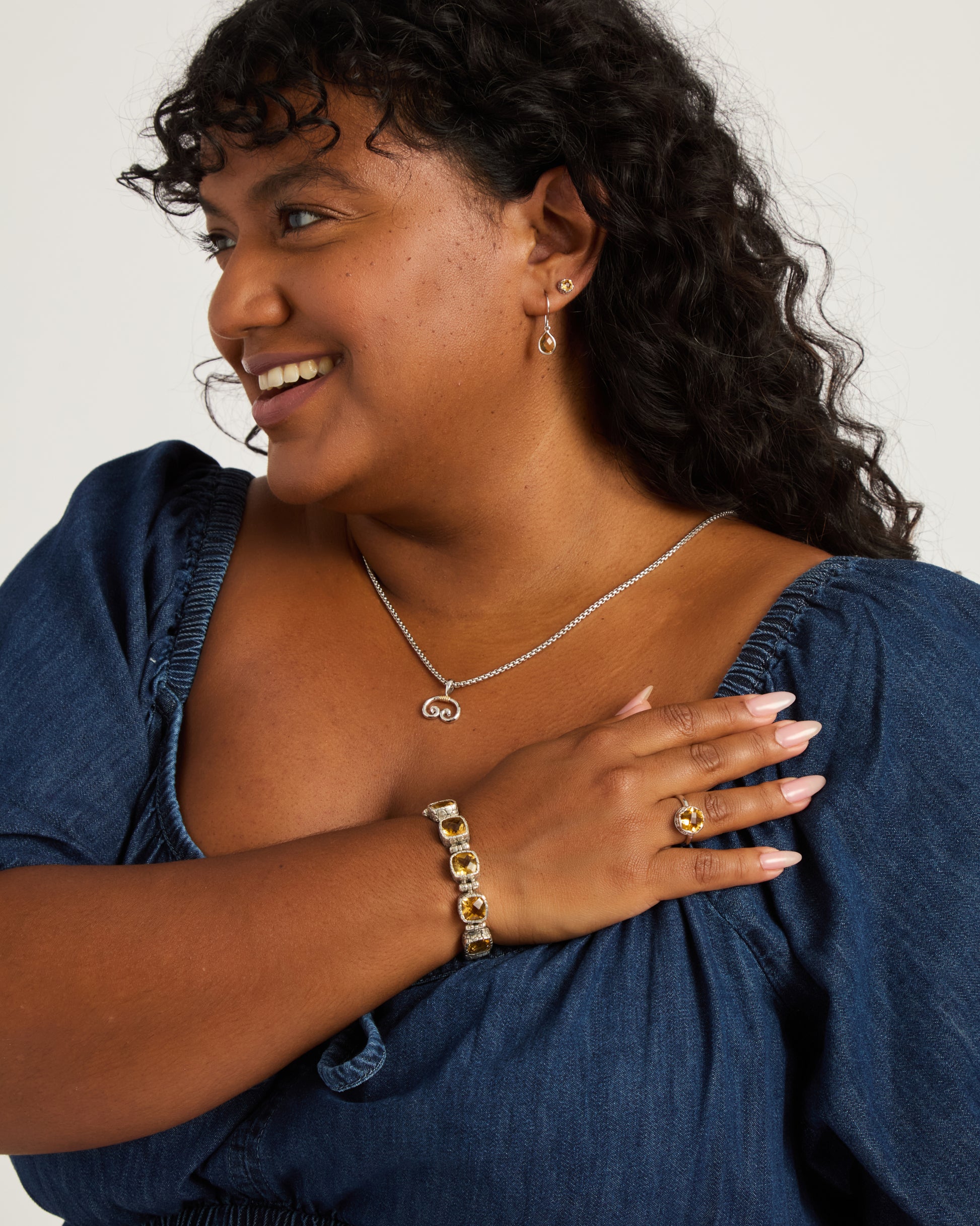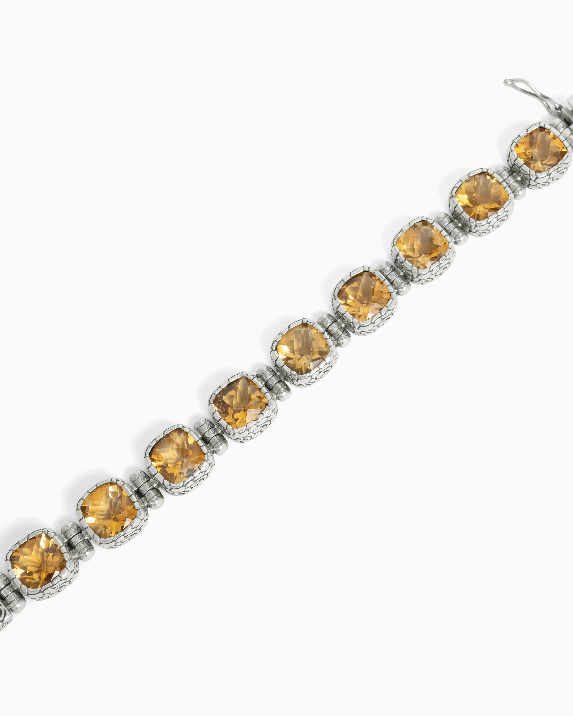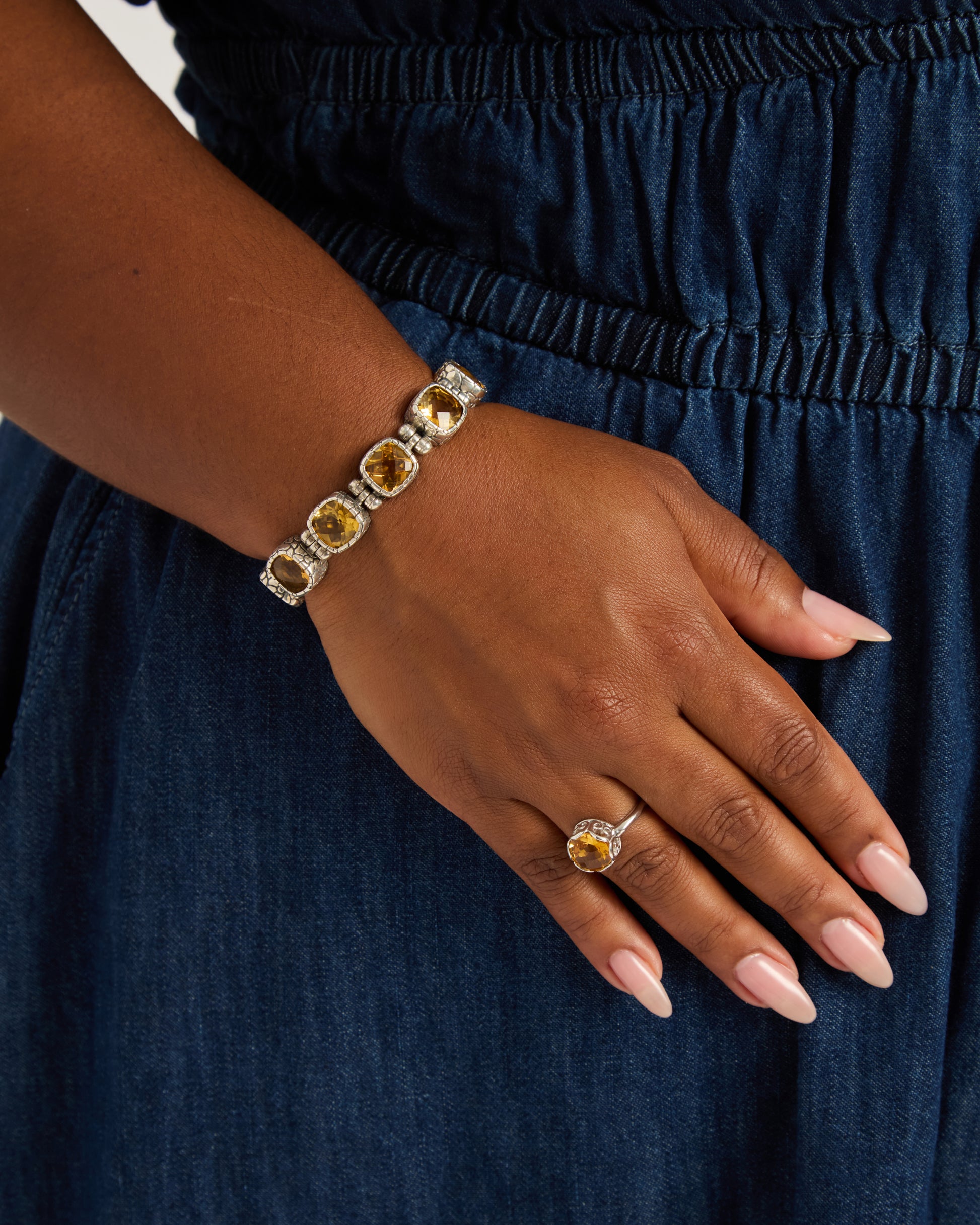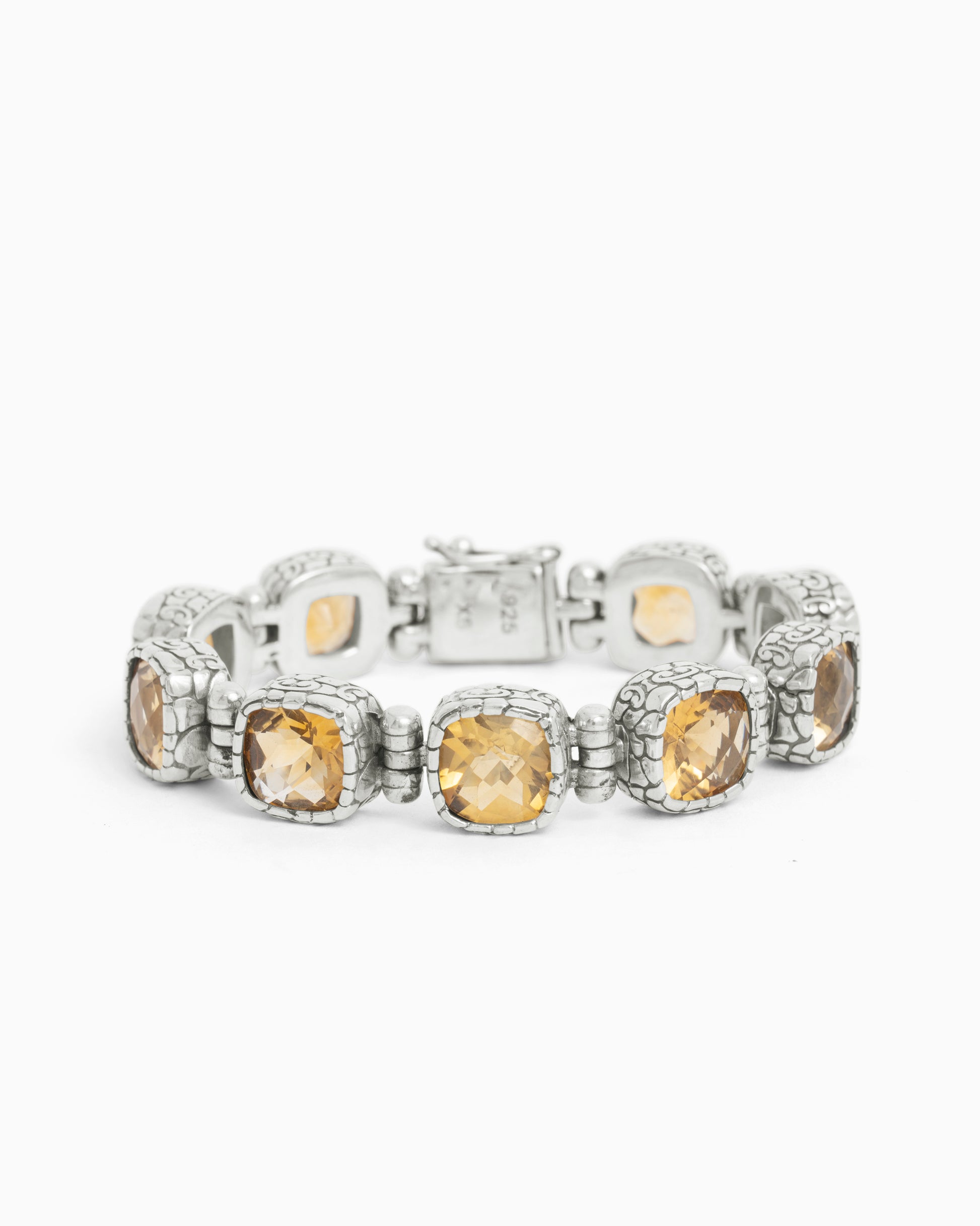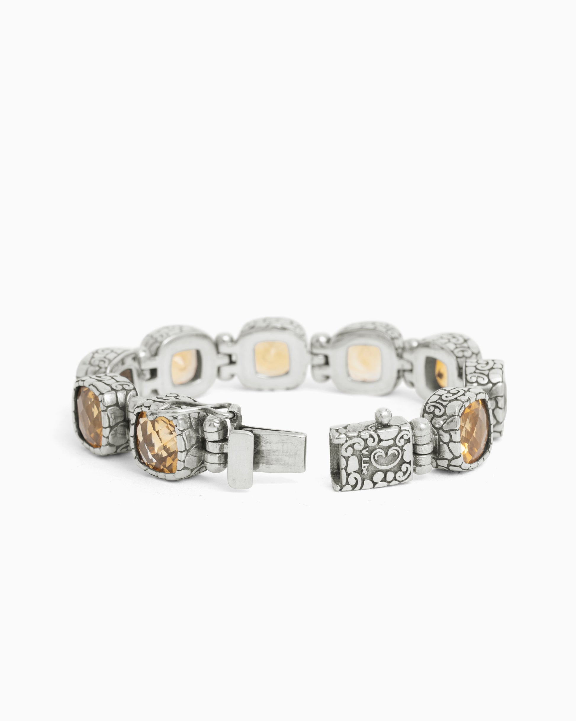 The Gemstone Link Bracelet with Turtle Texture features luminous cushion cut citrine stones throughout the band. Each stone is set in a sterling silver link featuring our signature turtle texture with petroglyphs. This piece is guaranteed to make a statement and will dazzle any look.