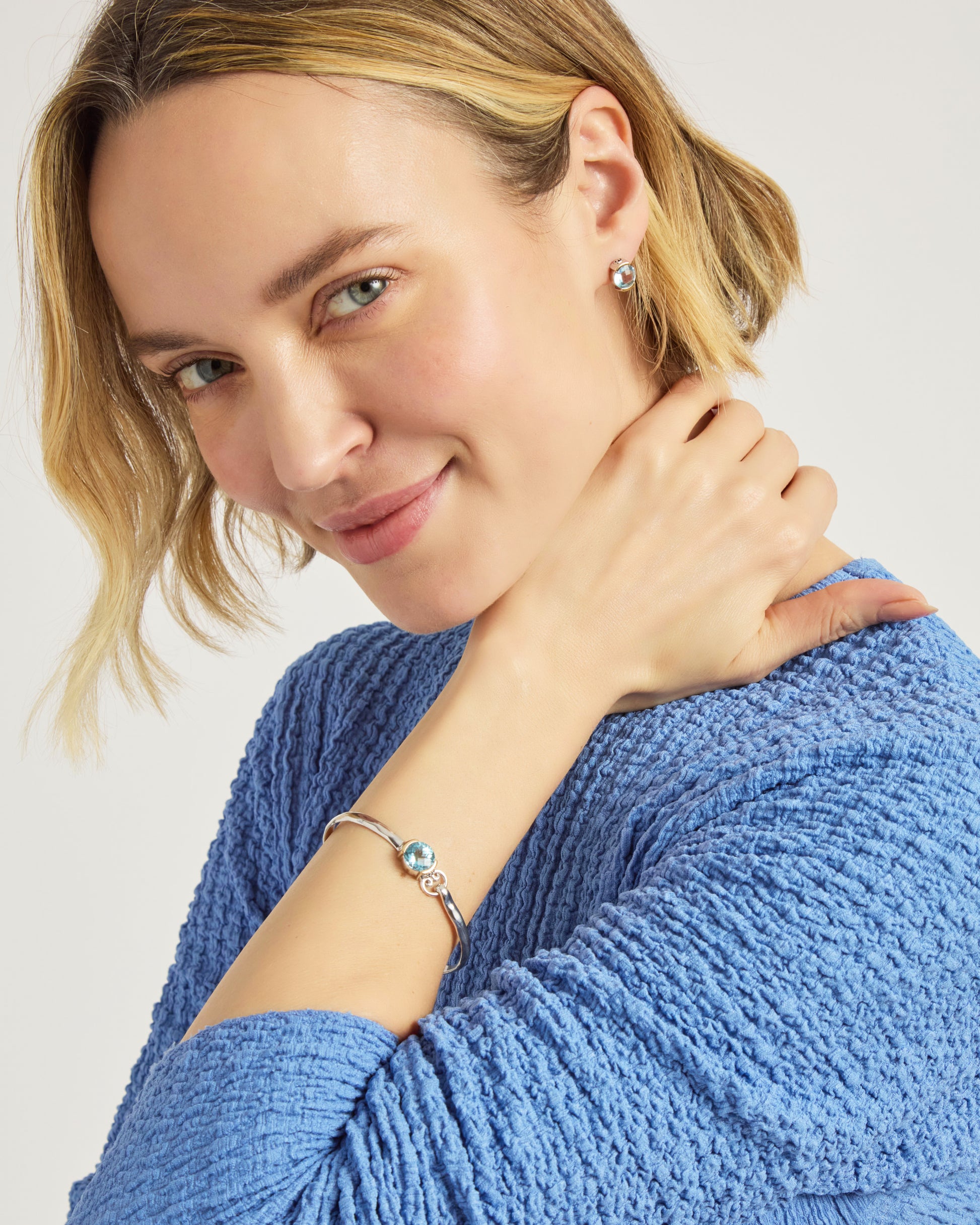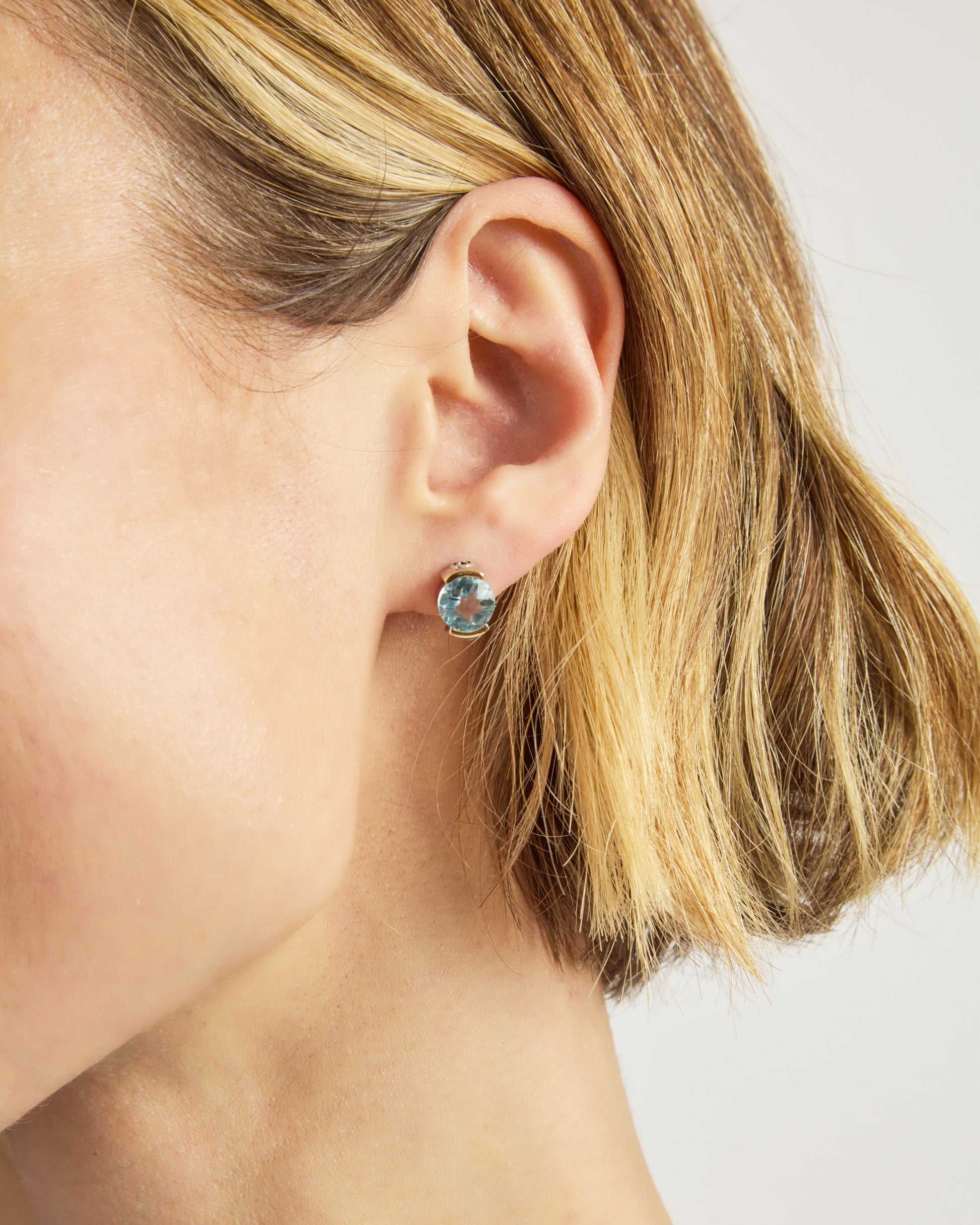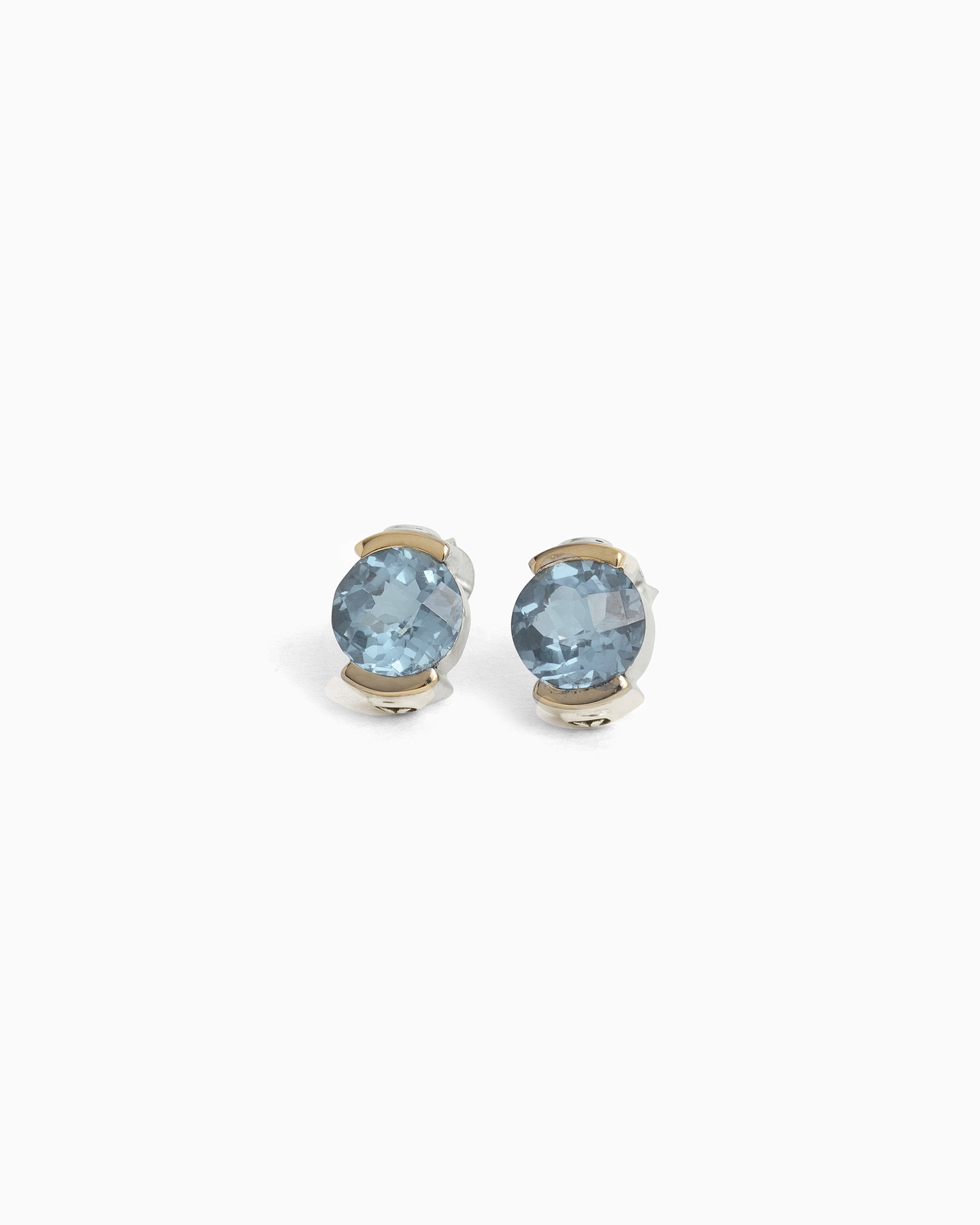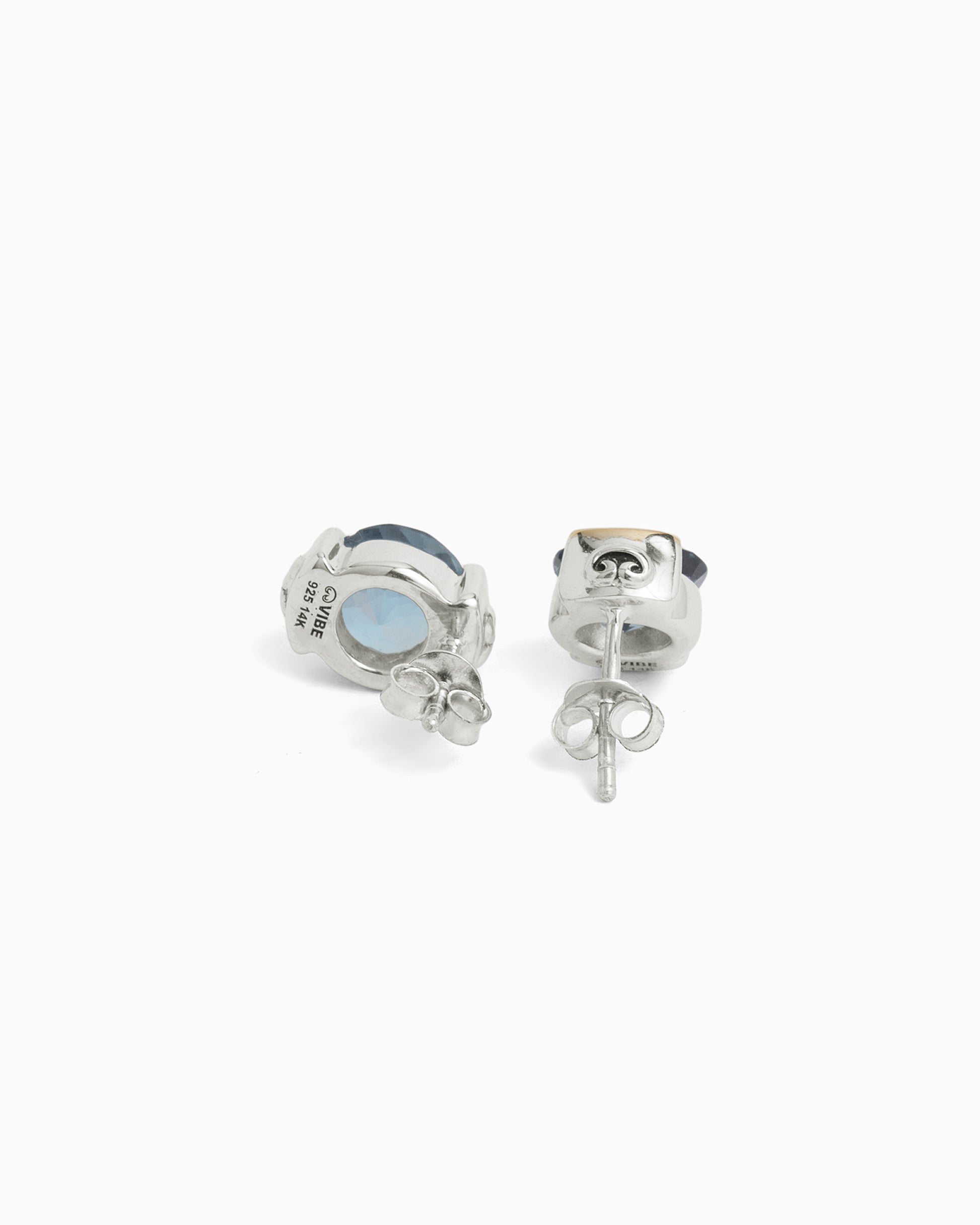 The Gemstone Studs with 14K Gold Bezel features luminous sky blue topaz stones set in sterling silver with a 14K gold bezel. Pair with our Stone & Petroglyph Bangle and Ring for an elegant look.