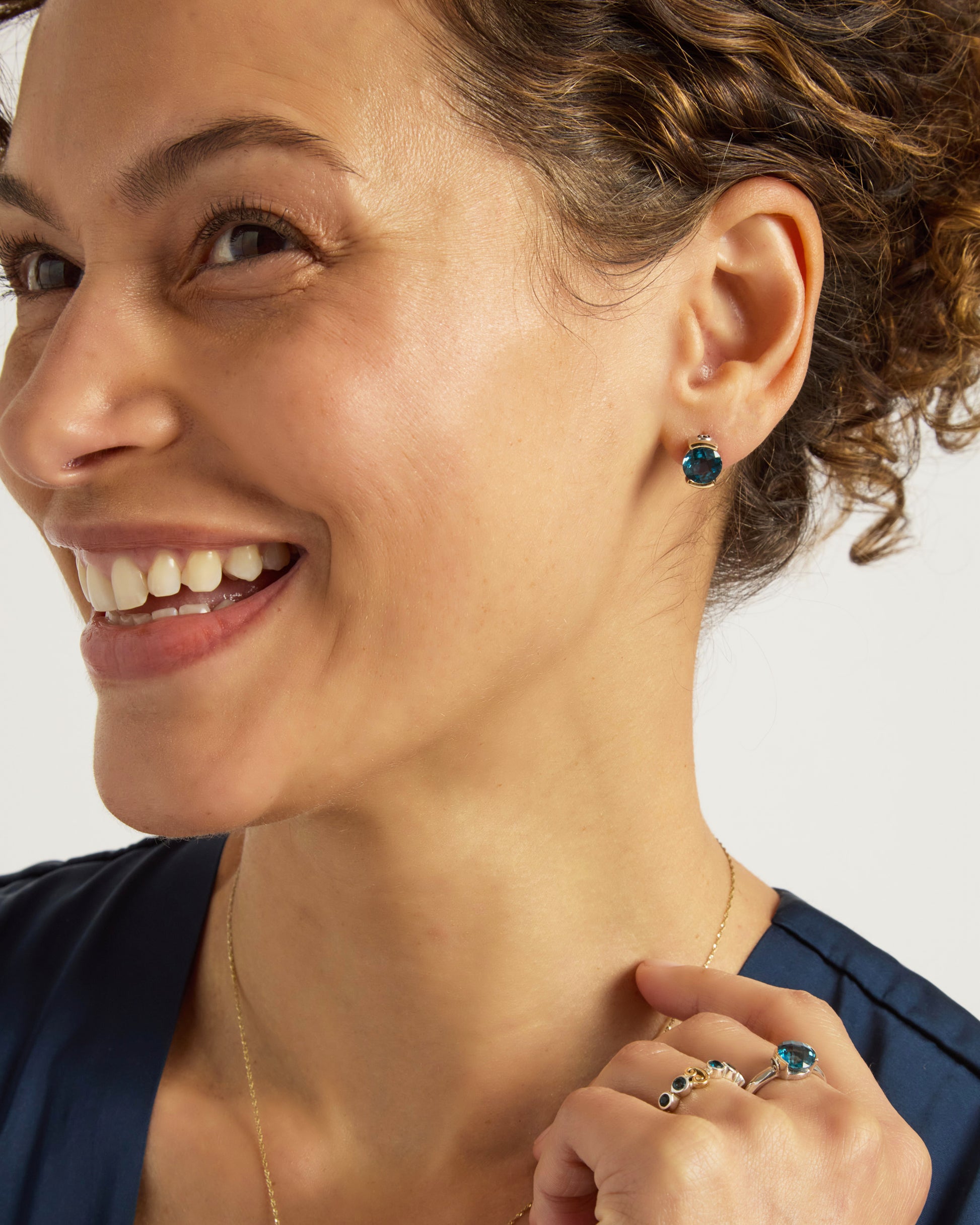 The Gemstone Studs with 14K Gold Bezel features luminous London blue topaz stones set in sterling silver with a 14K gold bezel. Pair with our Stone & Petroglyph Bangle and Ring for an elegant look.