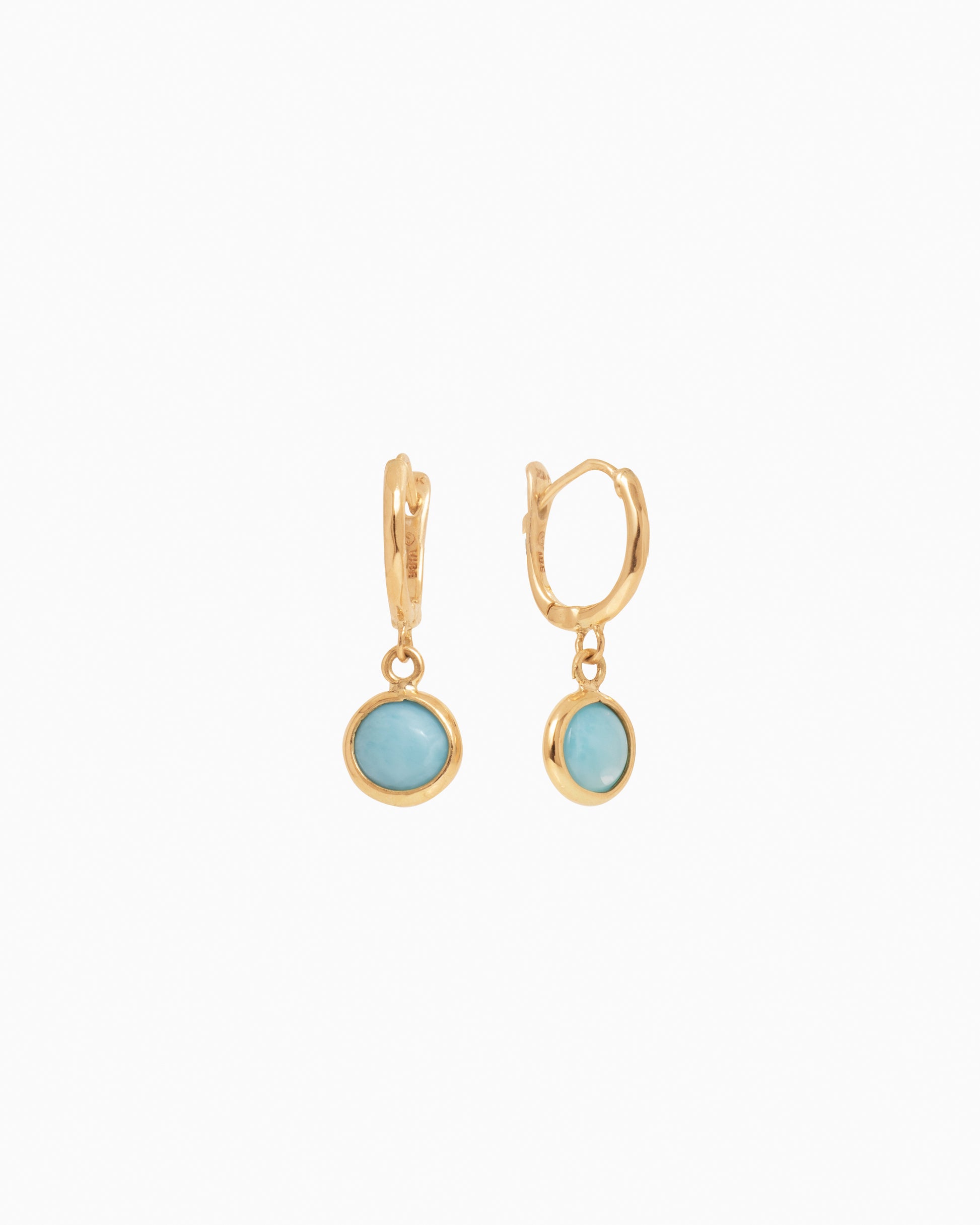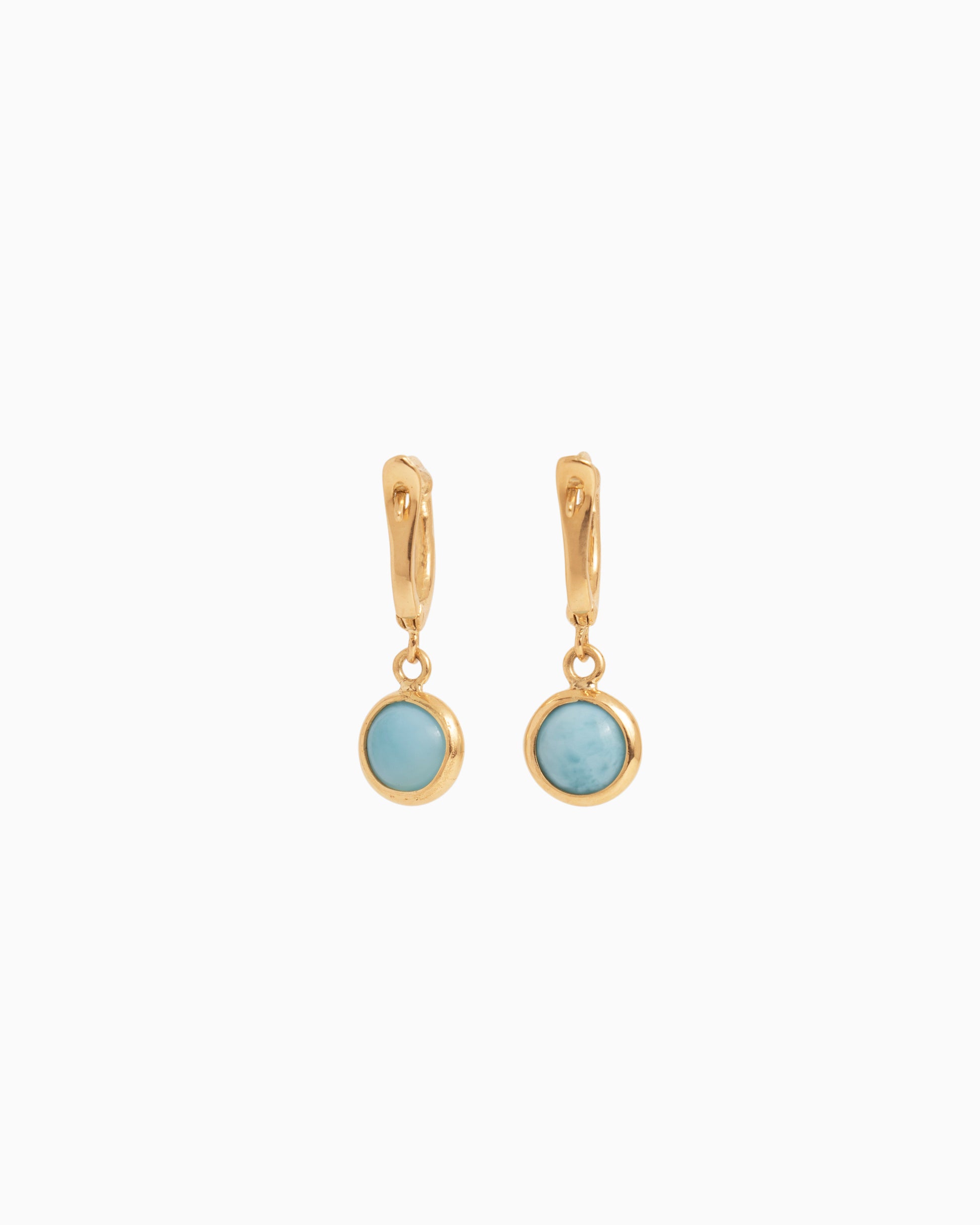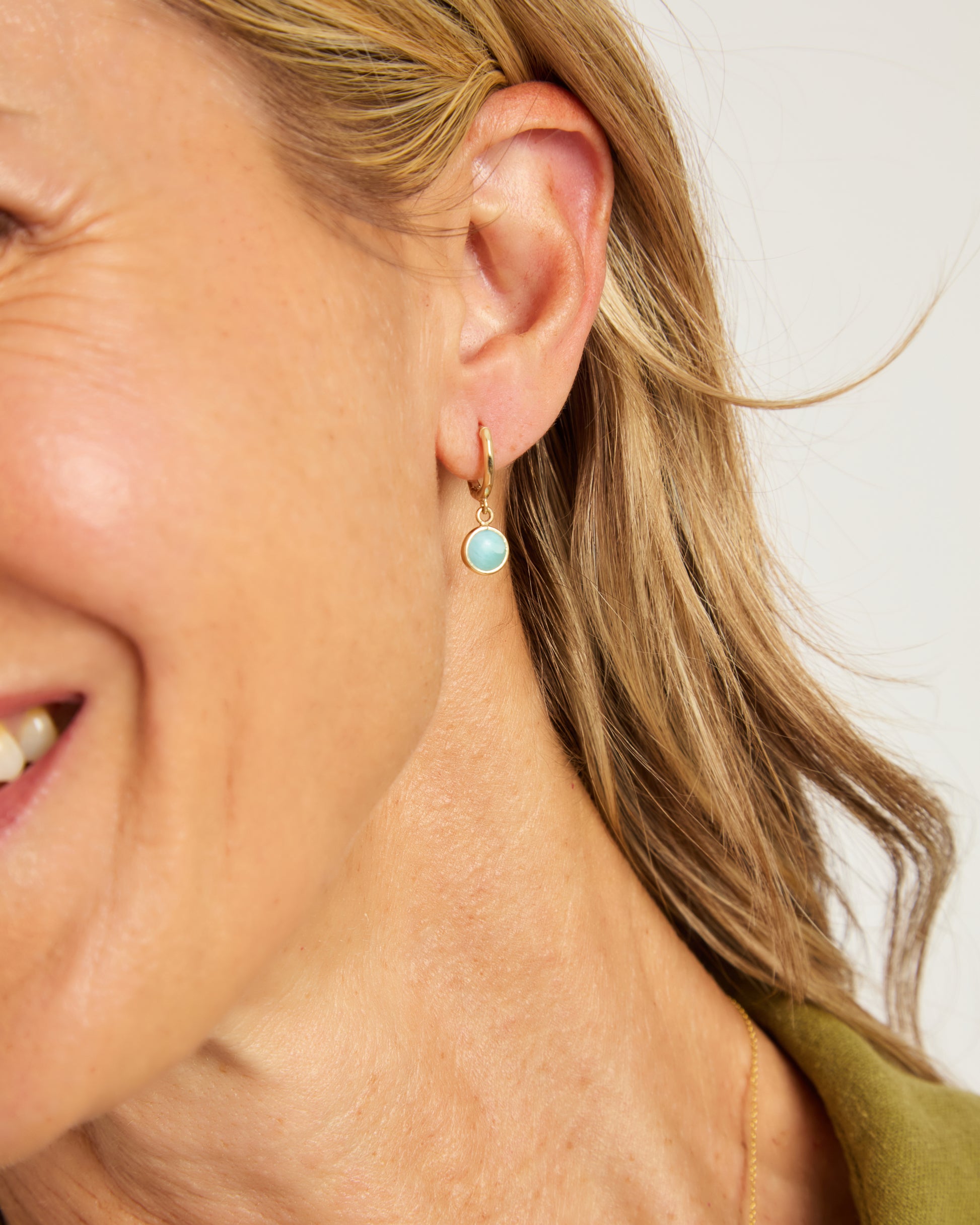 The Circle Stone Huggie showcases a circle larimar cabochon set dangling from a huggie hoop earring. Handcrafted in 14K solid gold, these stunning earrings are the perfect style to add to your collection that can be worn everyday or for a more special occasion. Add the perfect pop of color to you look with these huggie earrings.