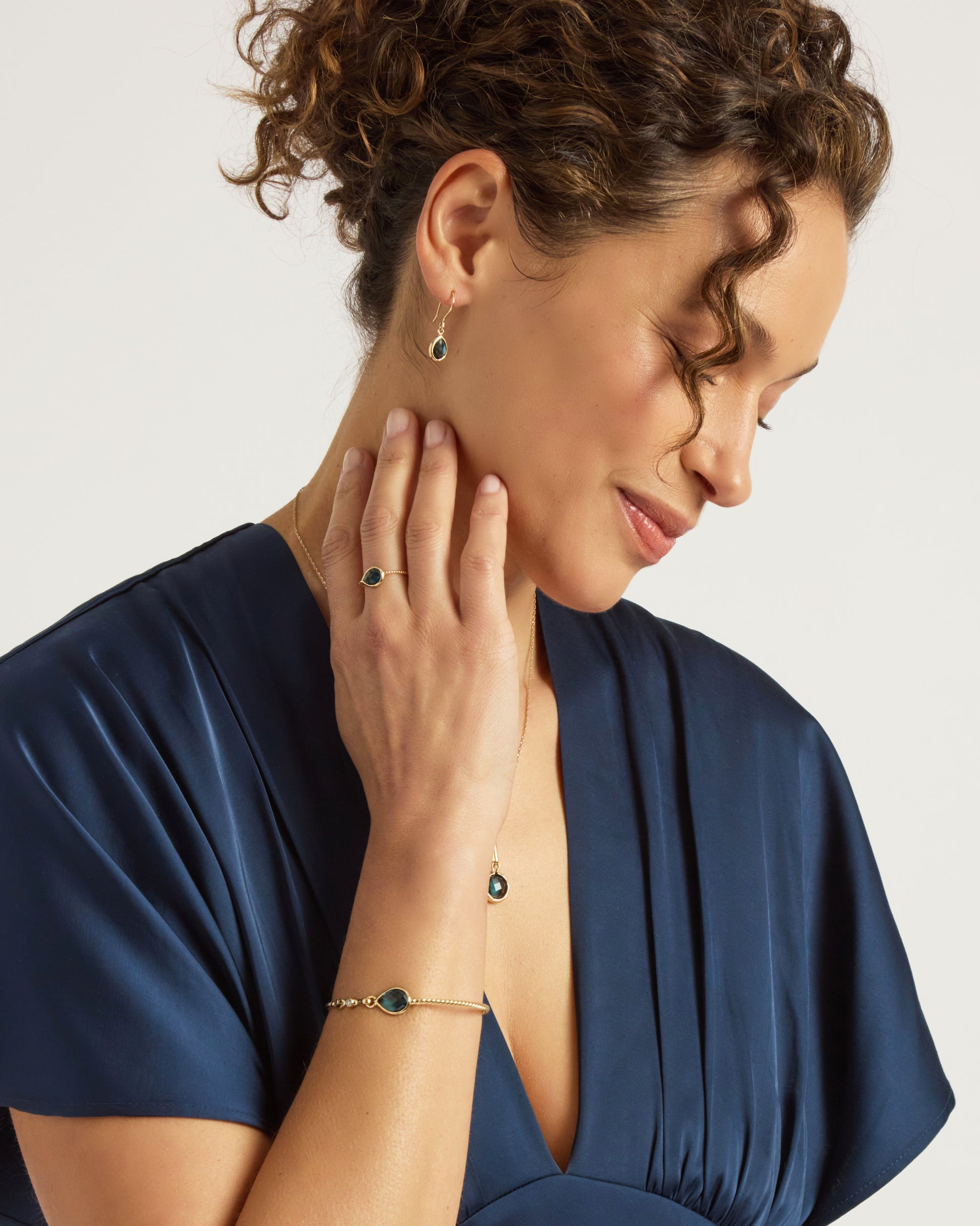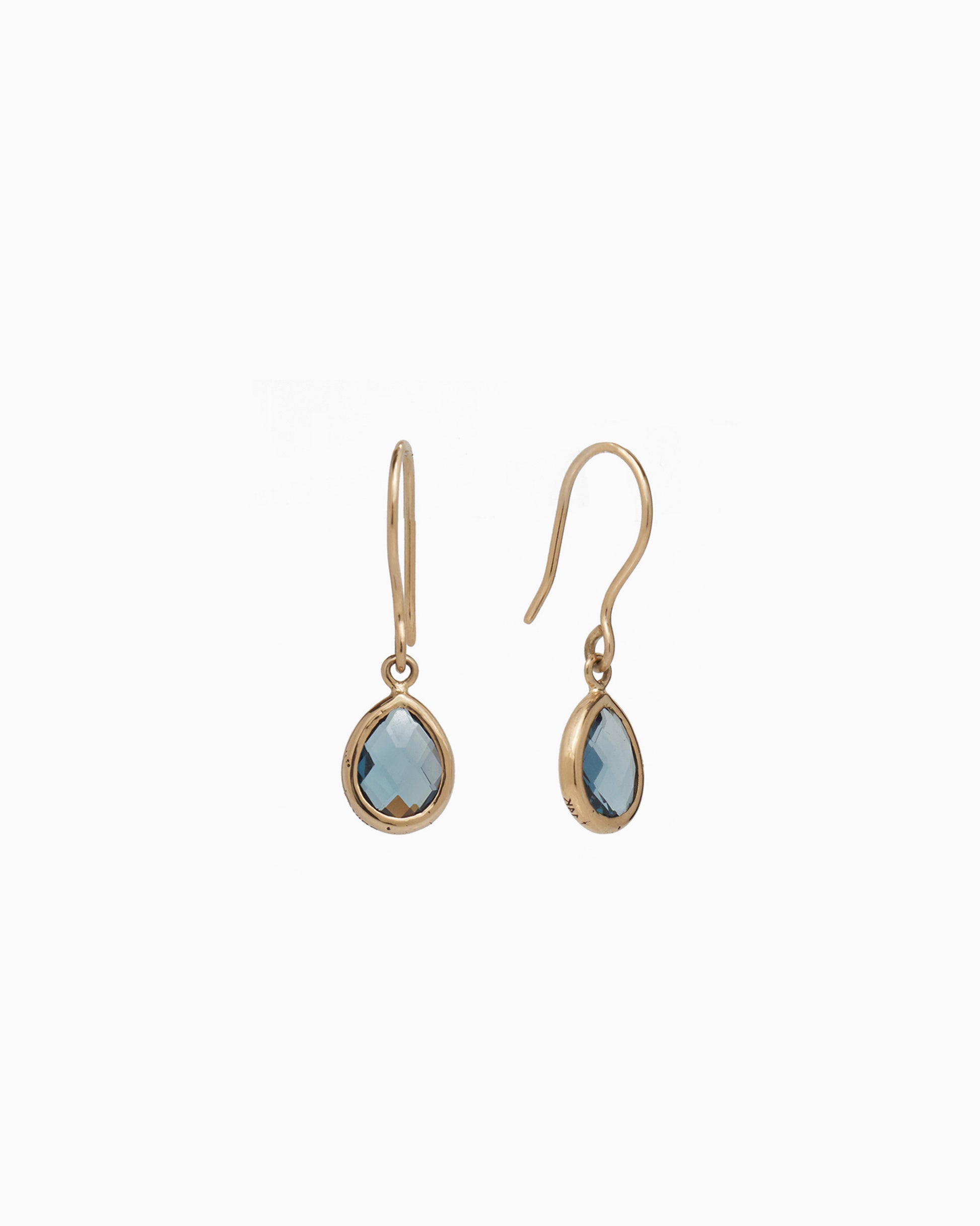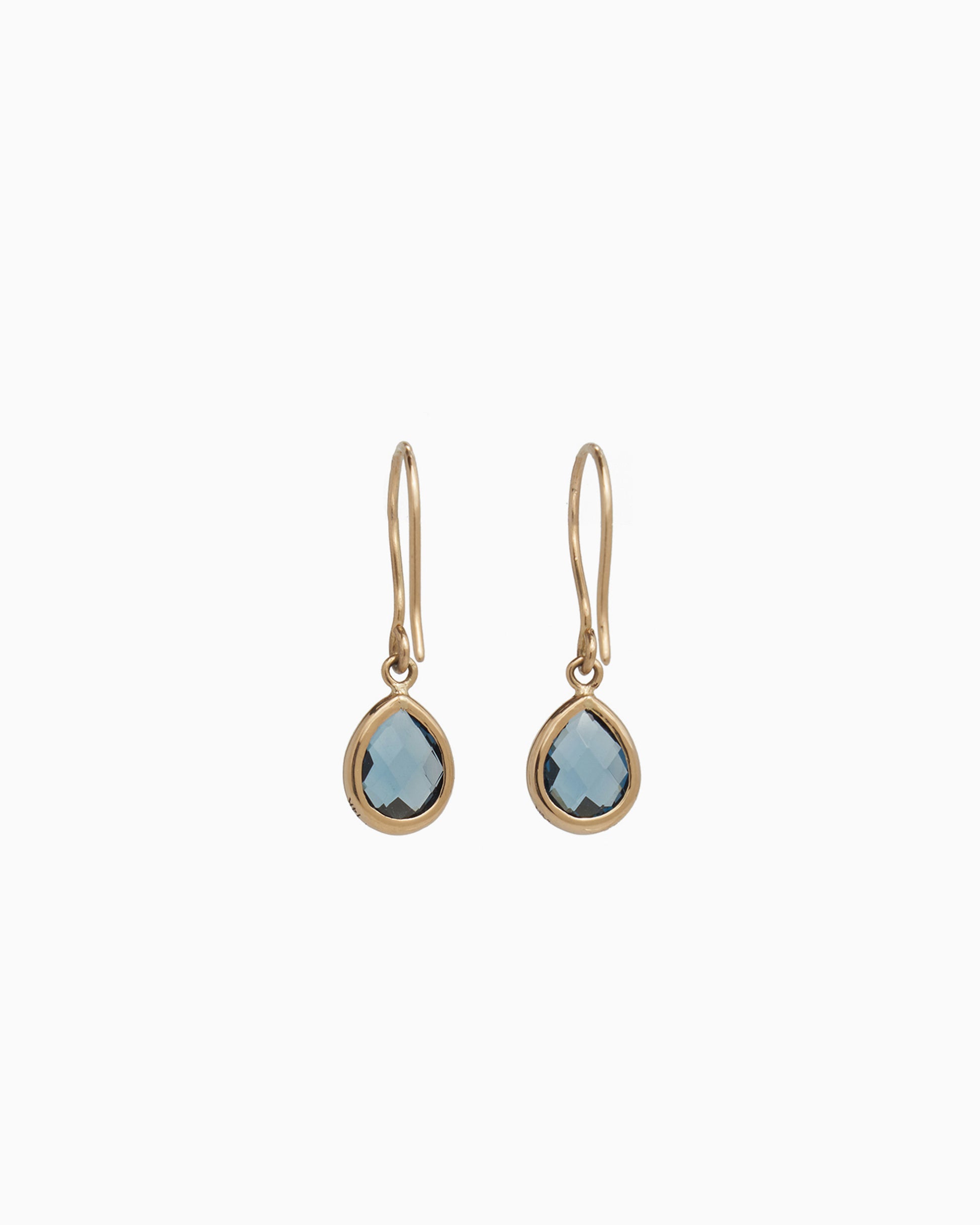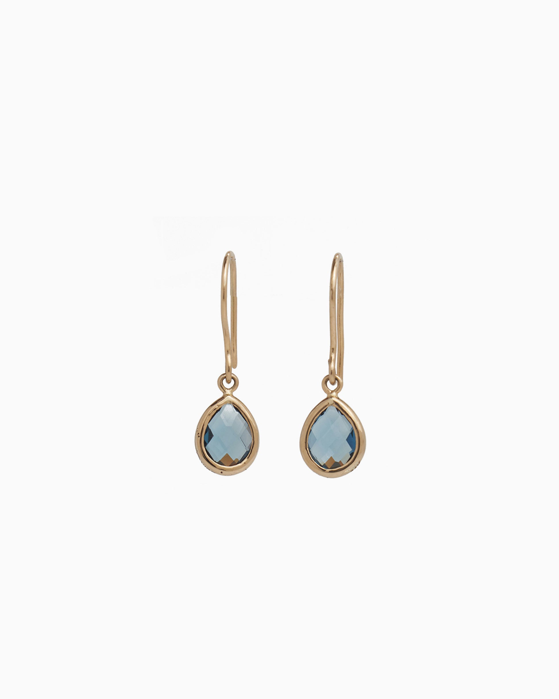 The Dewdrop Stone Earrings are handcrafted with 14K solid gold highlighting a faceted pear-shaped London blue topaz stone. These dainty earrings serve as the perfect finishing touch for your next night out, elevating your look with subtle elegance and timeless beauty.
