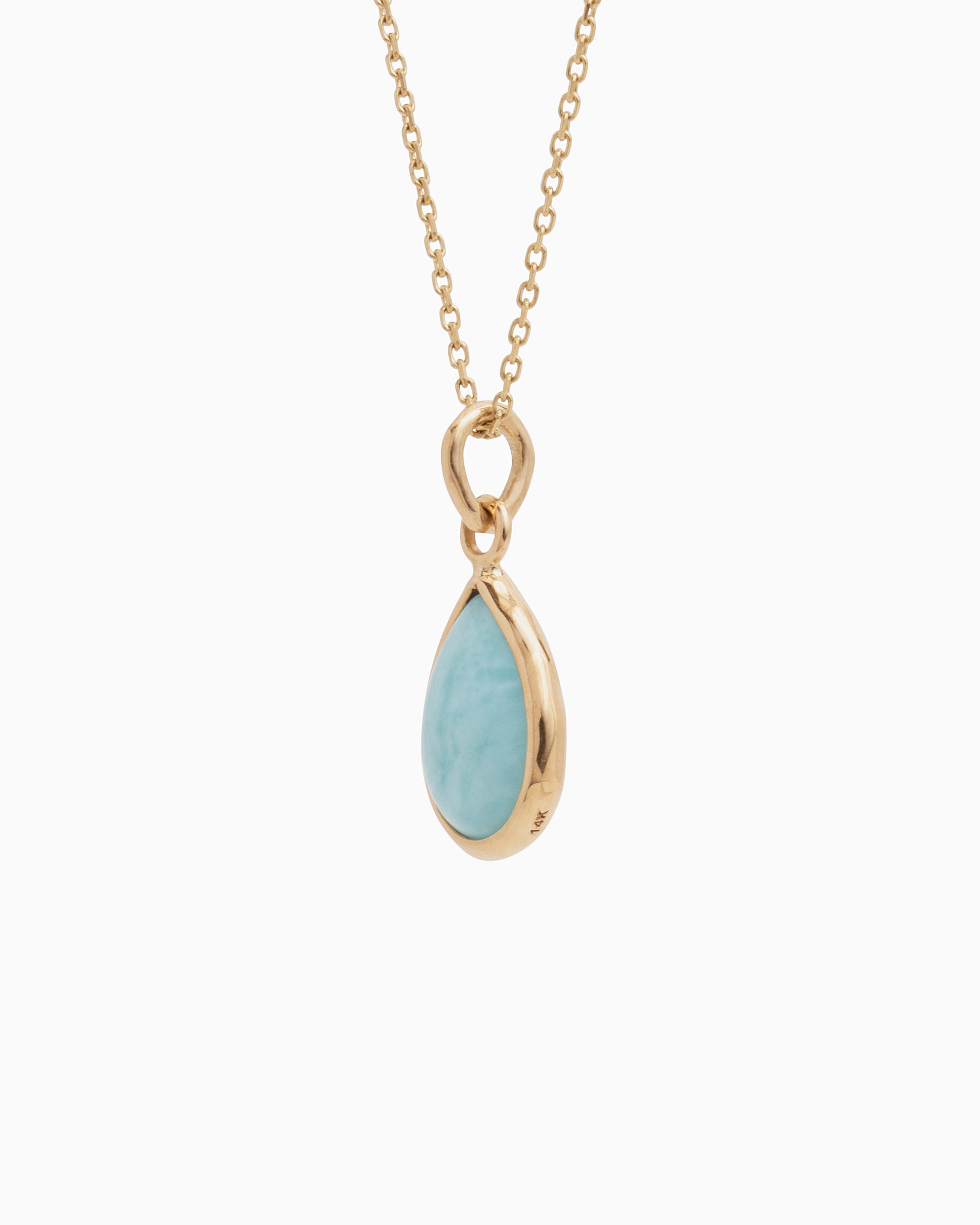 The Dewdrop Pendant boasts a distinctively timeless design, featuring a pear-shaped larimar cabochon cradled in 14K solid gold. Whether worn on its own for understated elegance or paired with other pieces, this pendant adds a touch of sophistication to any outfit.