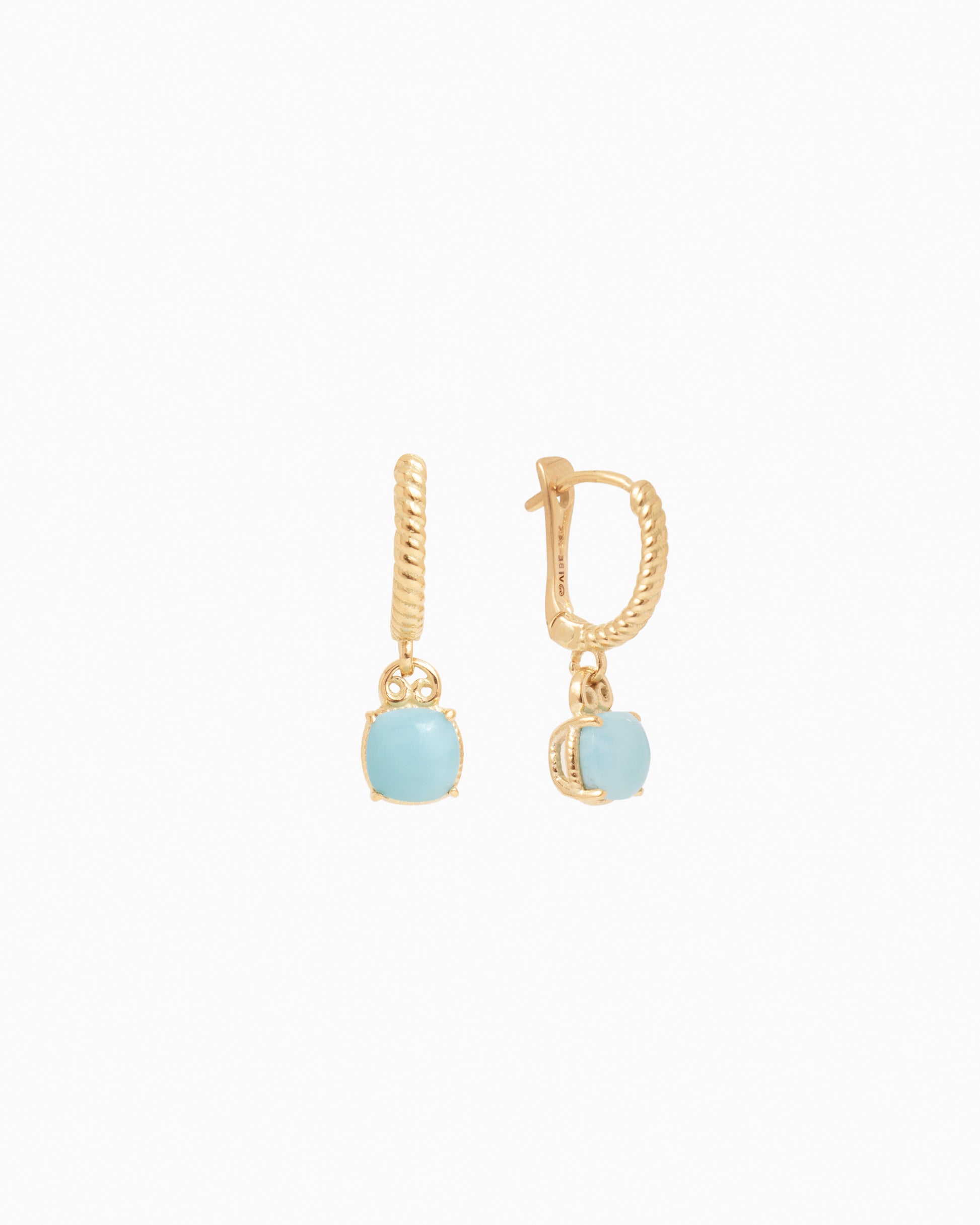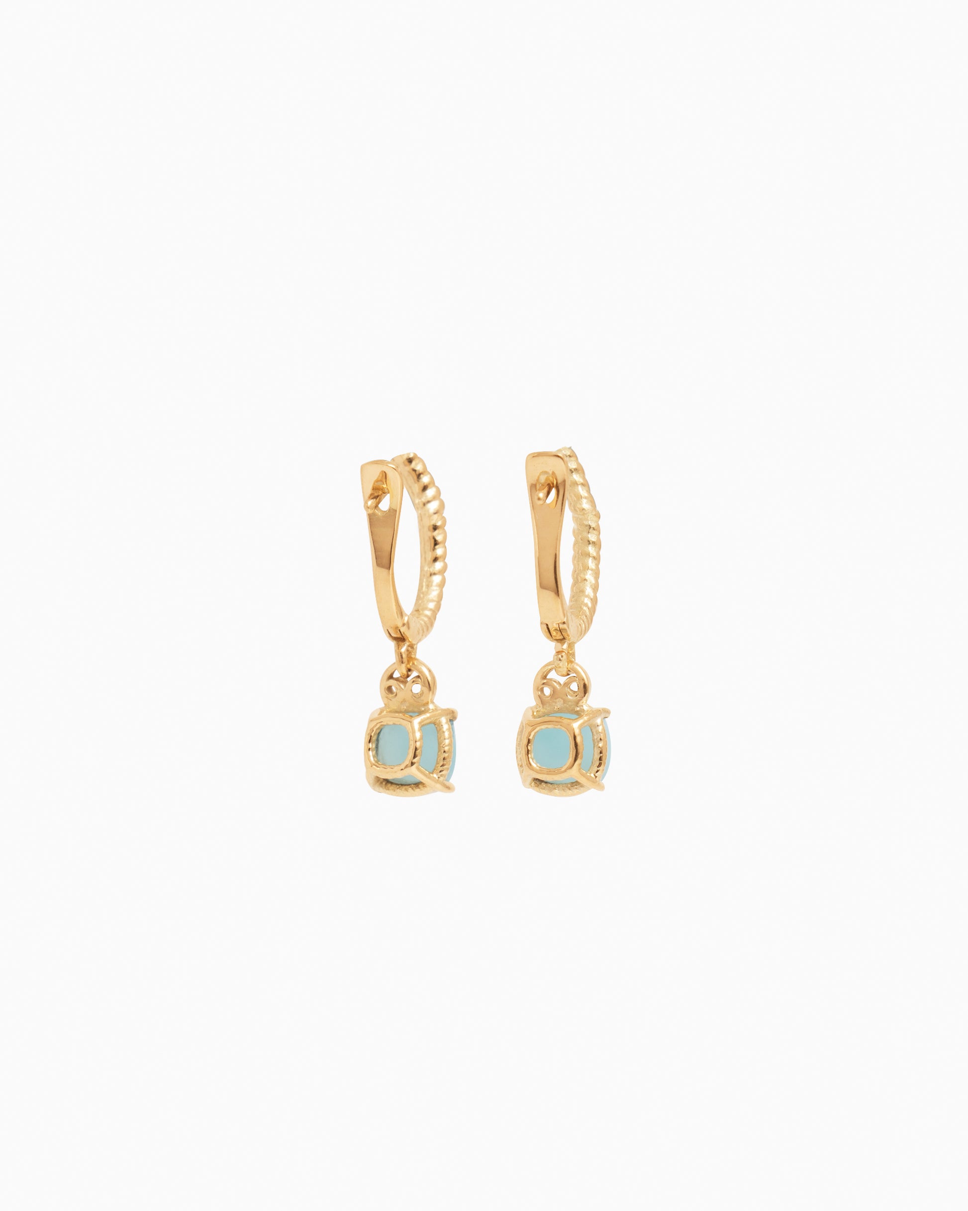 The Gemstone Drop Huggies are a stunning style handcrafted in 14K solid gold. These earrings showcase a larimar cabochon within a twisted basket setting. Also featuring a petroglyph bail that connects the earring to the ear hoop, which also features a twisted texture, this style is sure to make a statement!