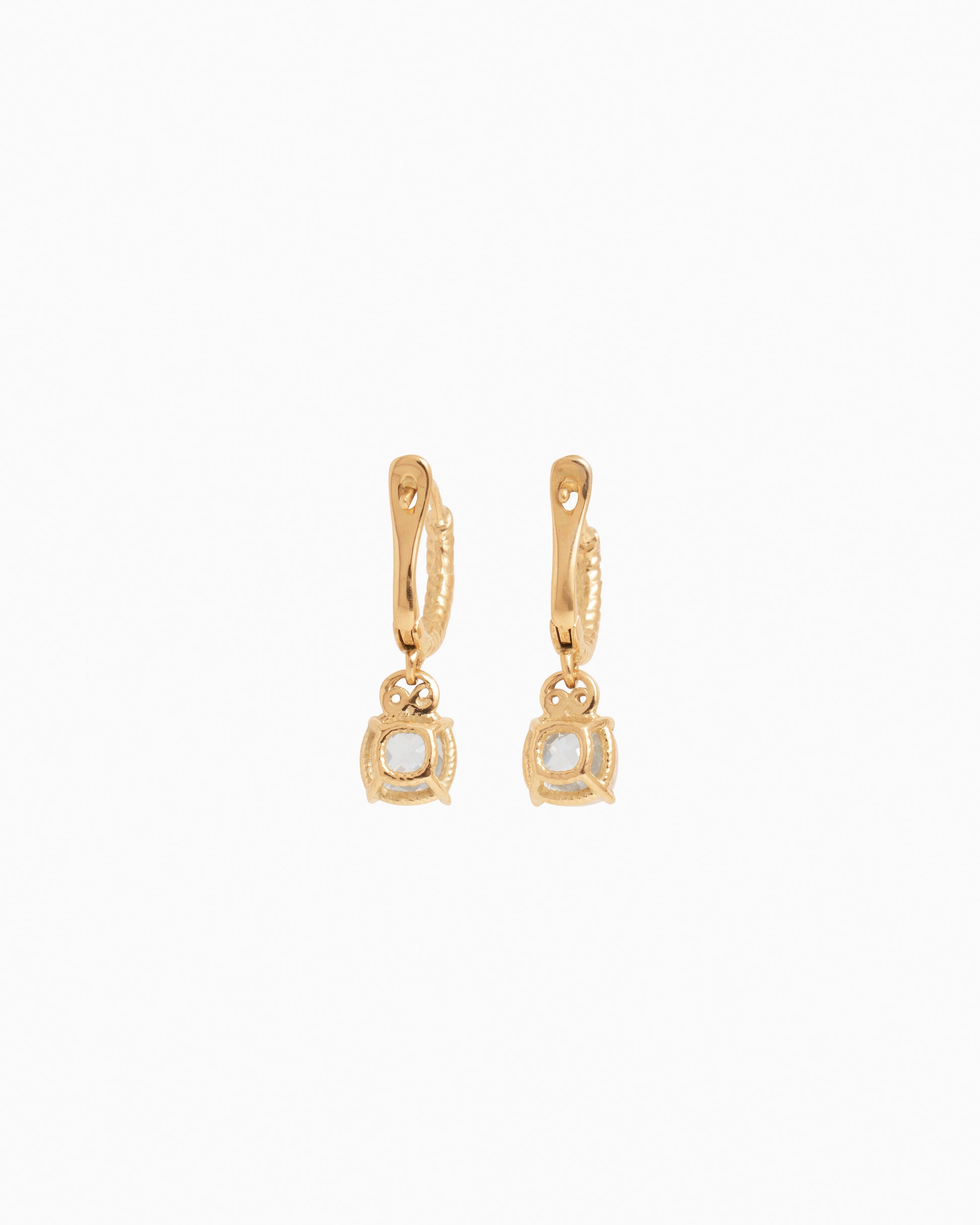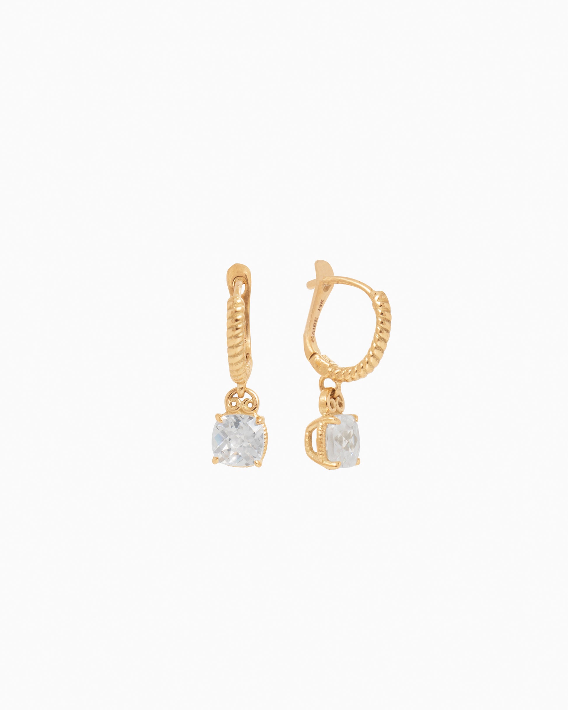 The Gemstone Drop Huggies are a stunning style handcrafted in 14K solid gold. These earrings showcase a faceted white zircon stone within a twisted basket setting. Also featuring a petroglyph bail that connects the earring to the ear hoop, which also features a twisted texture, this style is sure to make a statement!
