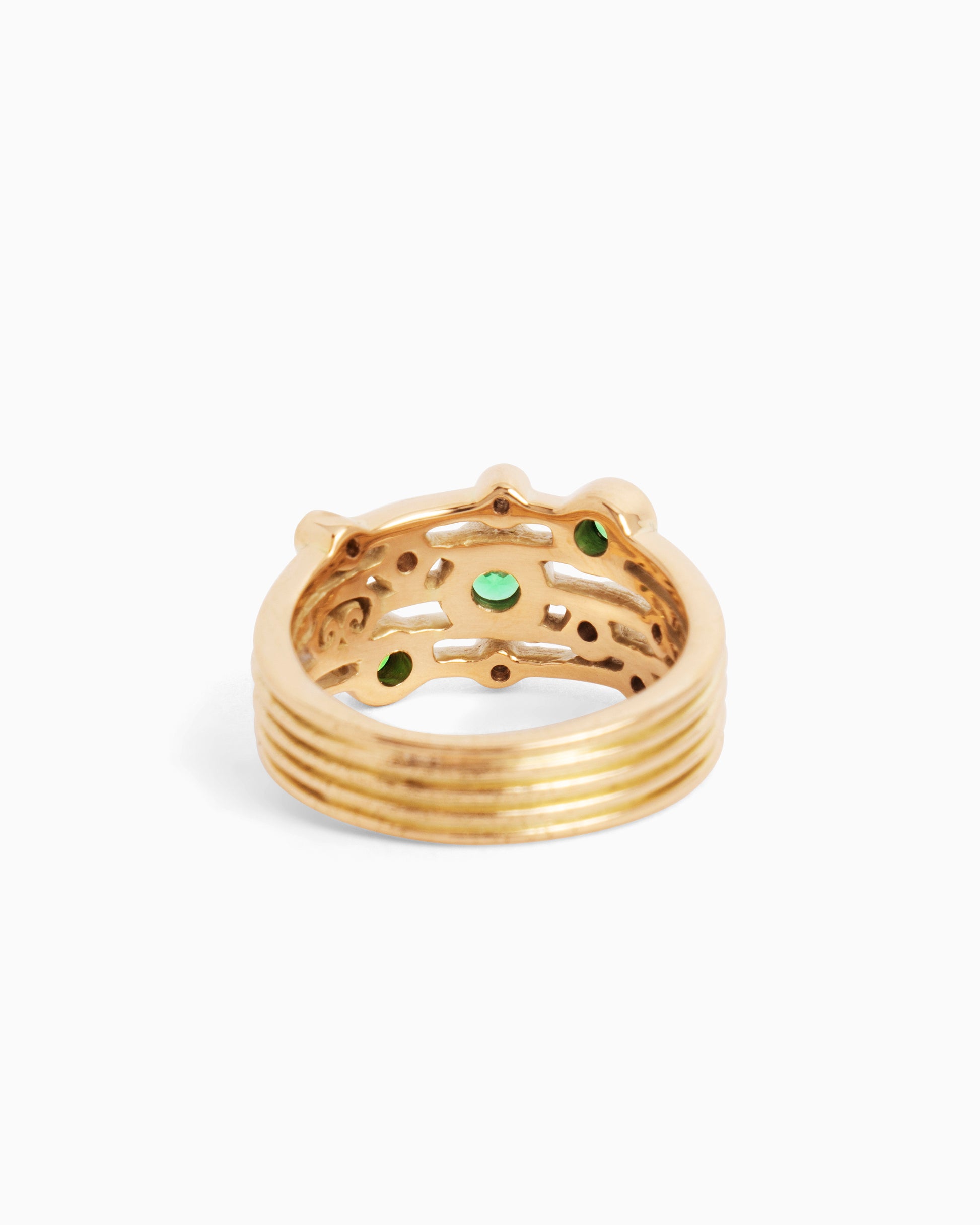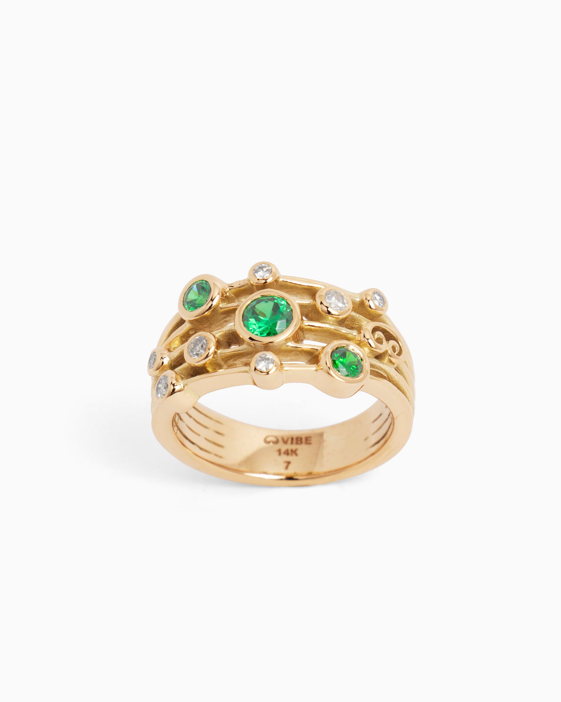 If you want to make a statement, this ring is perfect for you! The Multi Band Bubble Ring is handcrafted in 14K solid gold and features multiple bands with an assortment of diamonds and green zircon stones. Discover a hidden petroglyph placed perfectly between the bands and stones.