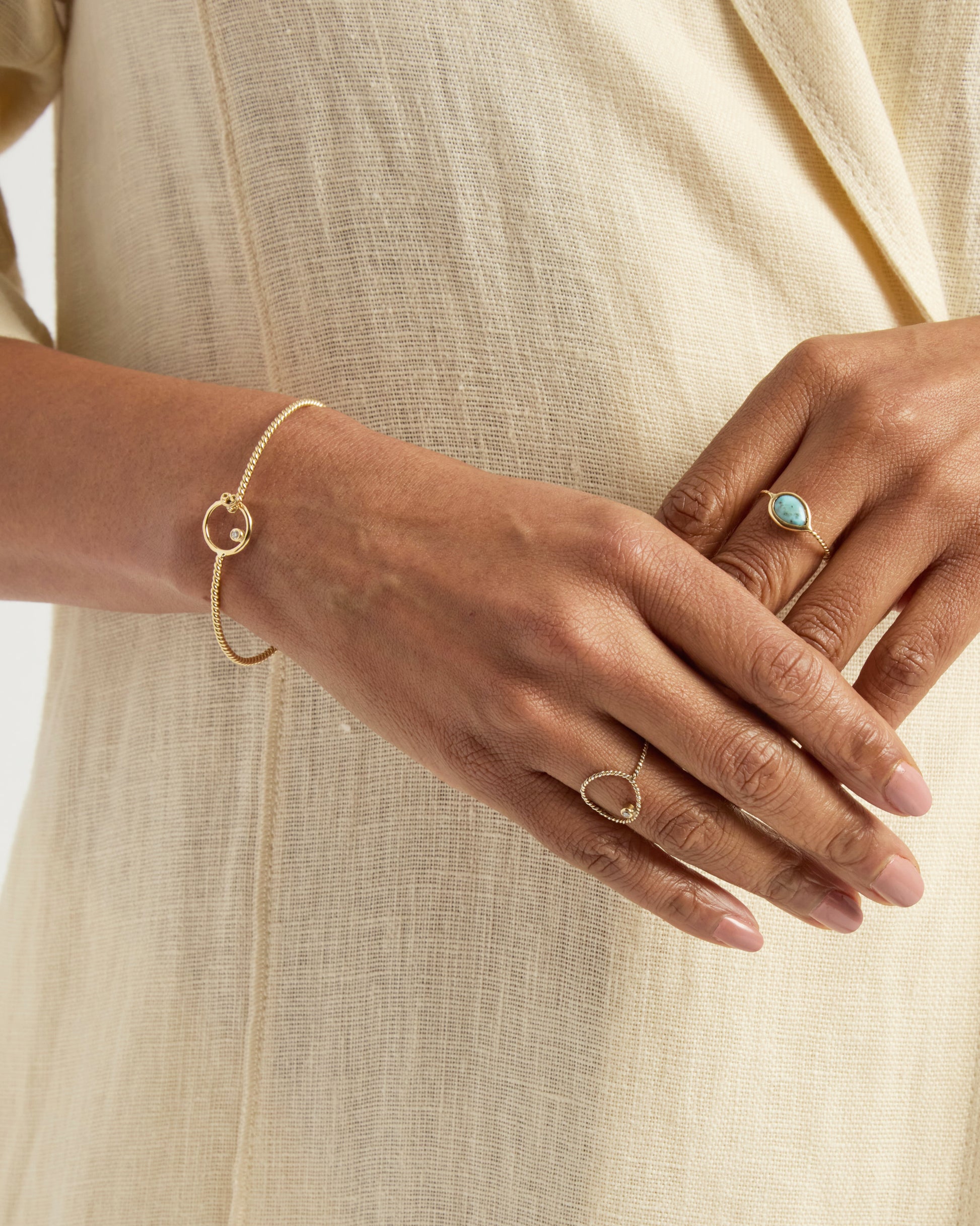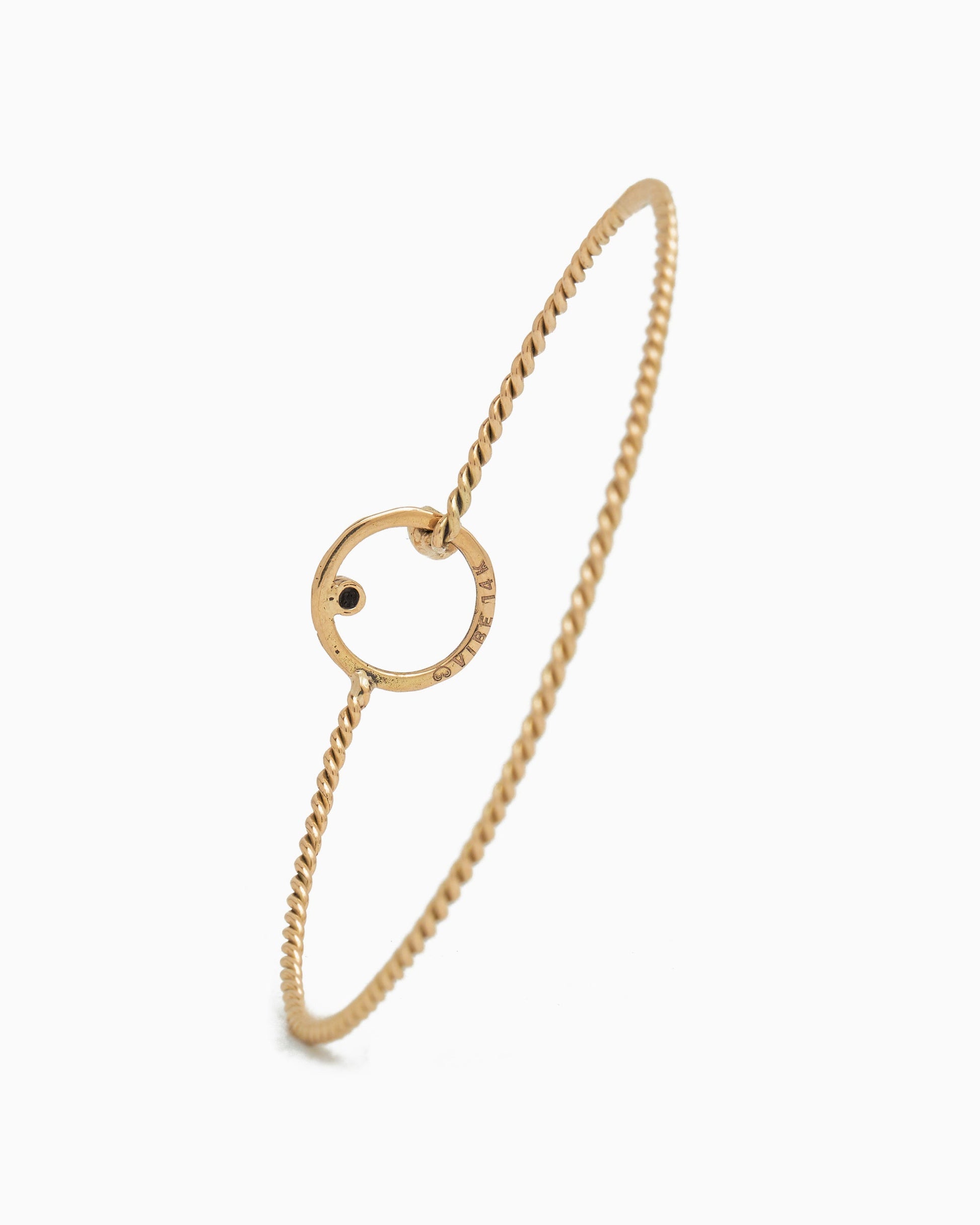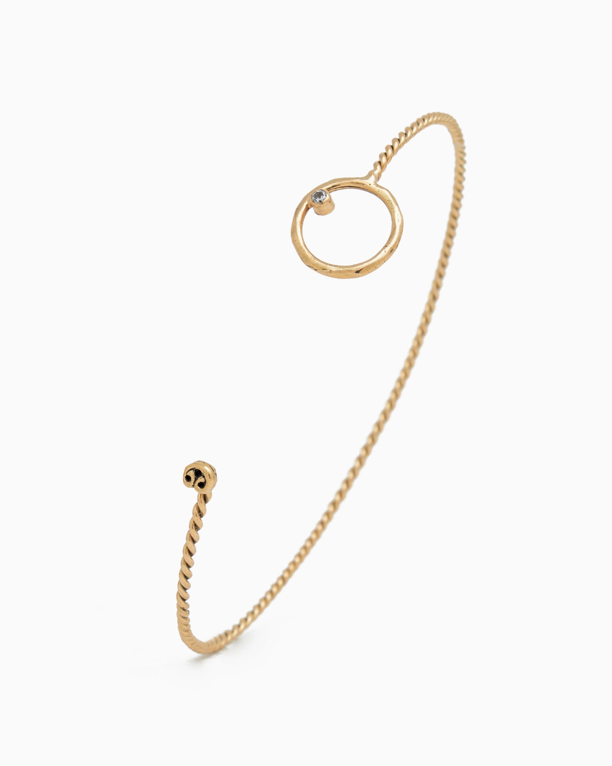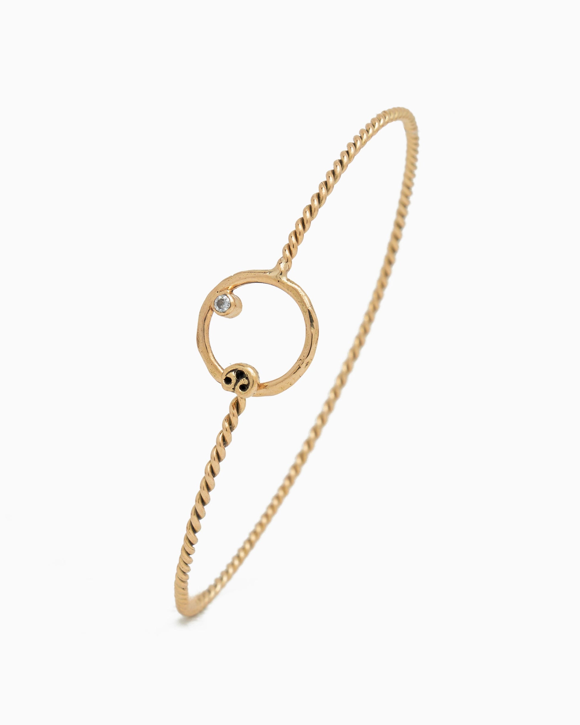 Part of our One Love Collection, the One Love Twisted Hook Bracelet with Diamond is handcrafted from 14K solid gold and features a intertwined rope-inspired band with a symbolic circle clasp, petroglyph closure, and diamond accent.