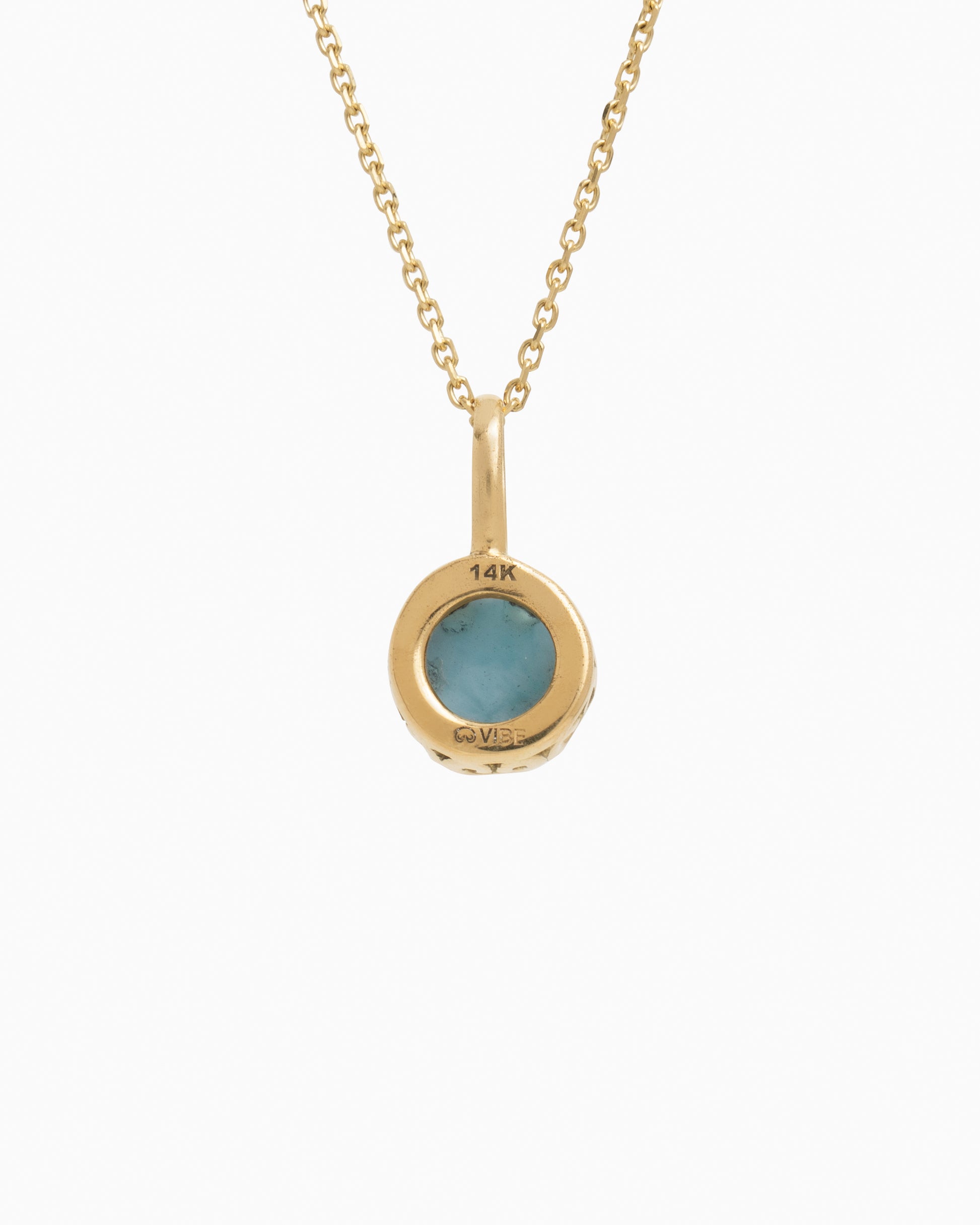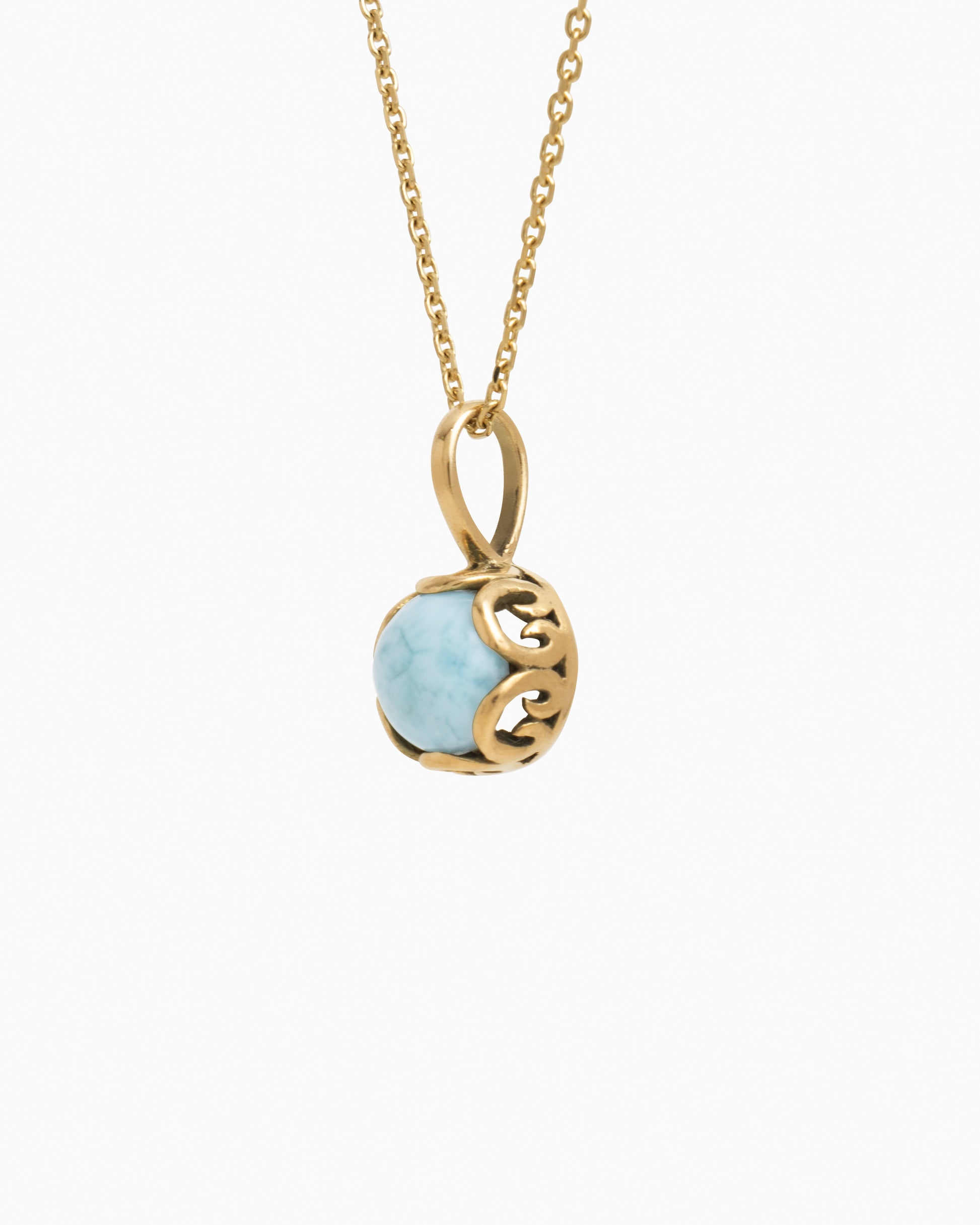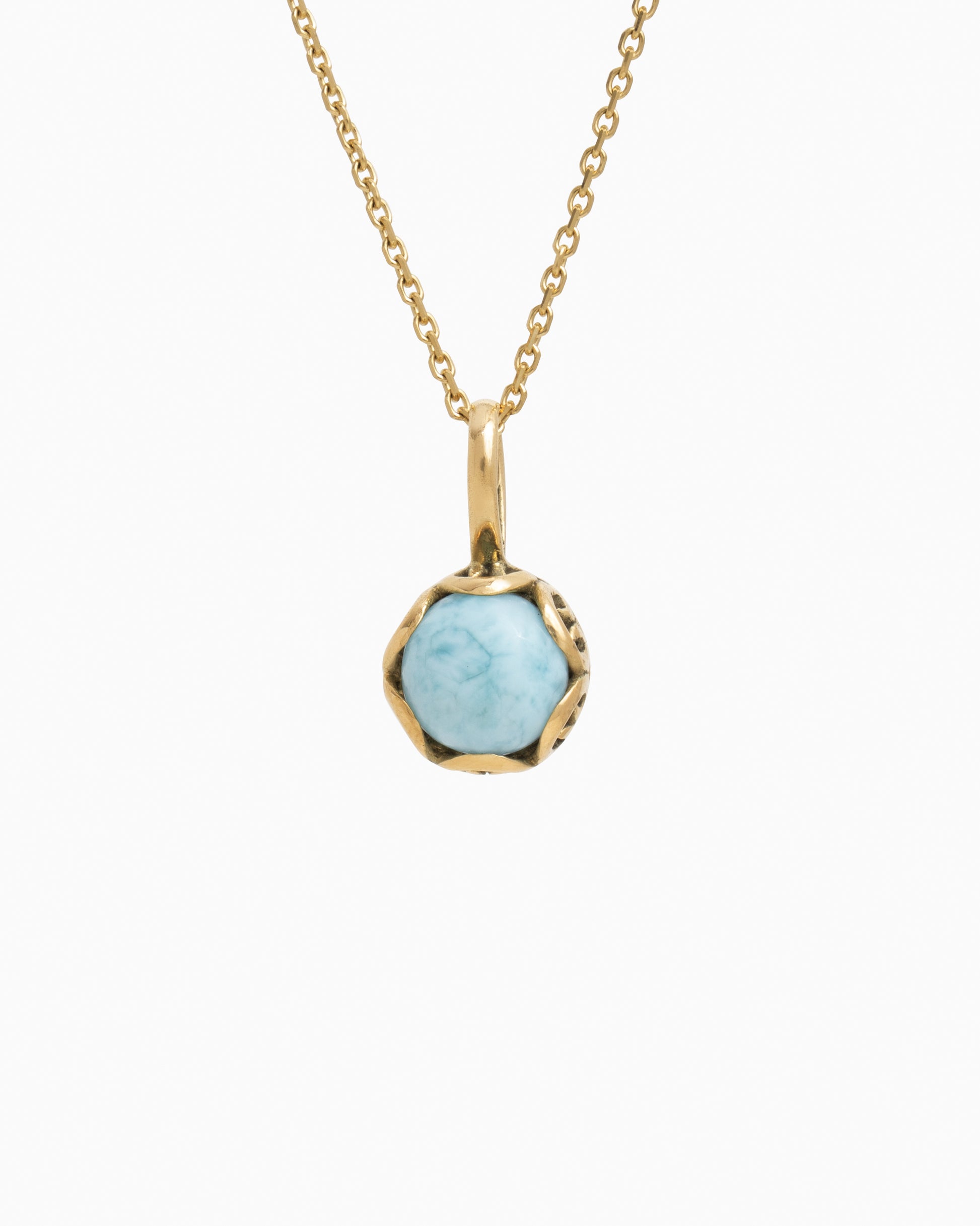 Crafted in 14K solid gold, the Princess Petroglyph Stone Pendant features a larimar cabochon encircled by intricate petroglyphs. Its unique design adds a touch of elegance to any outfit, and pairs wonderfully with our Princess Petroglyph Stone Studs.