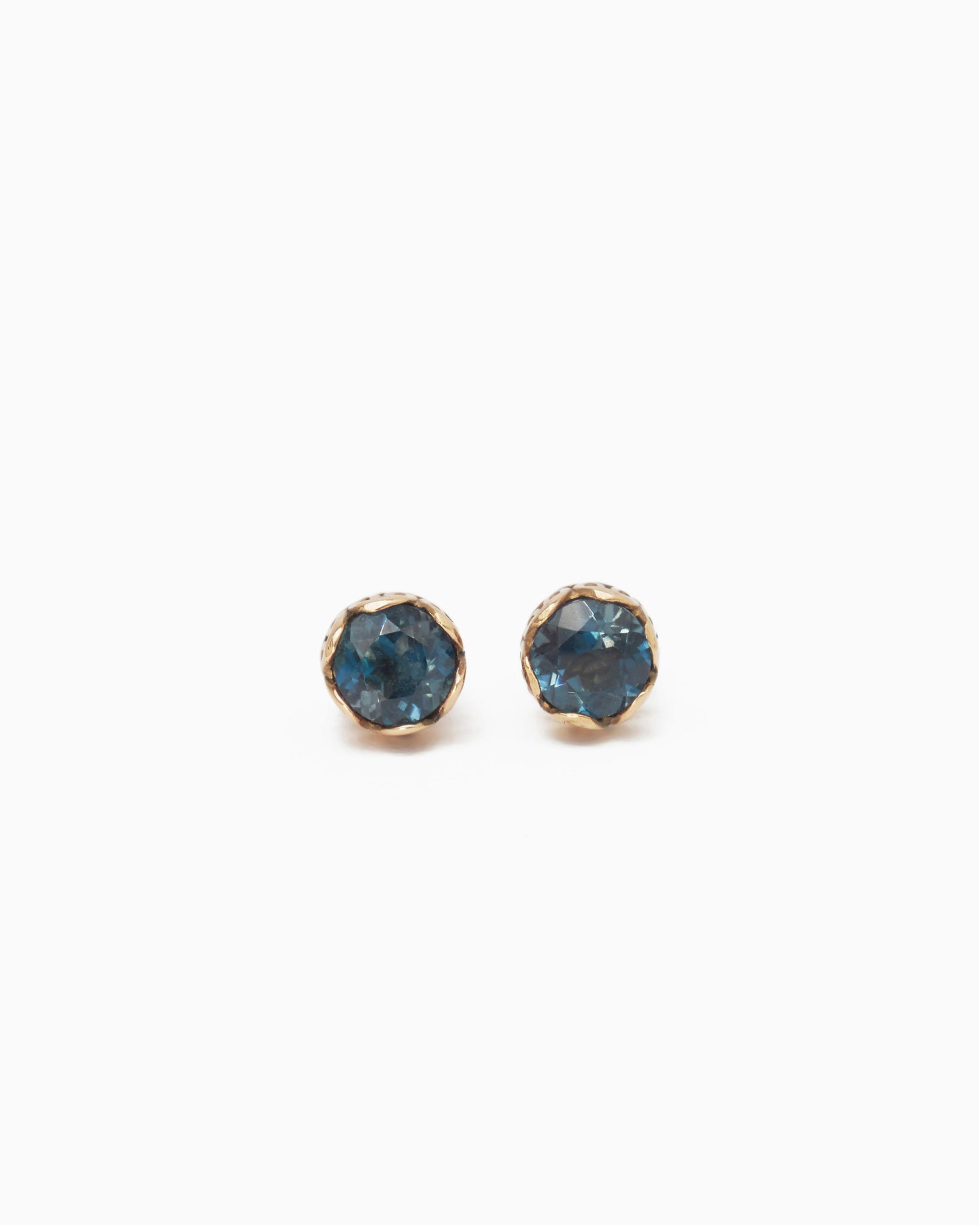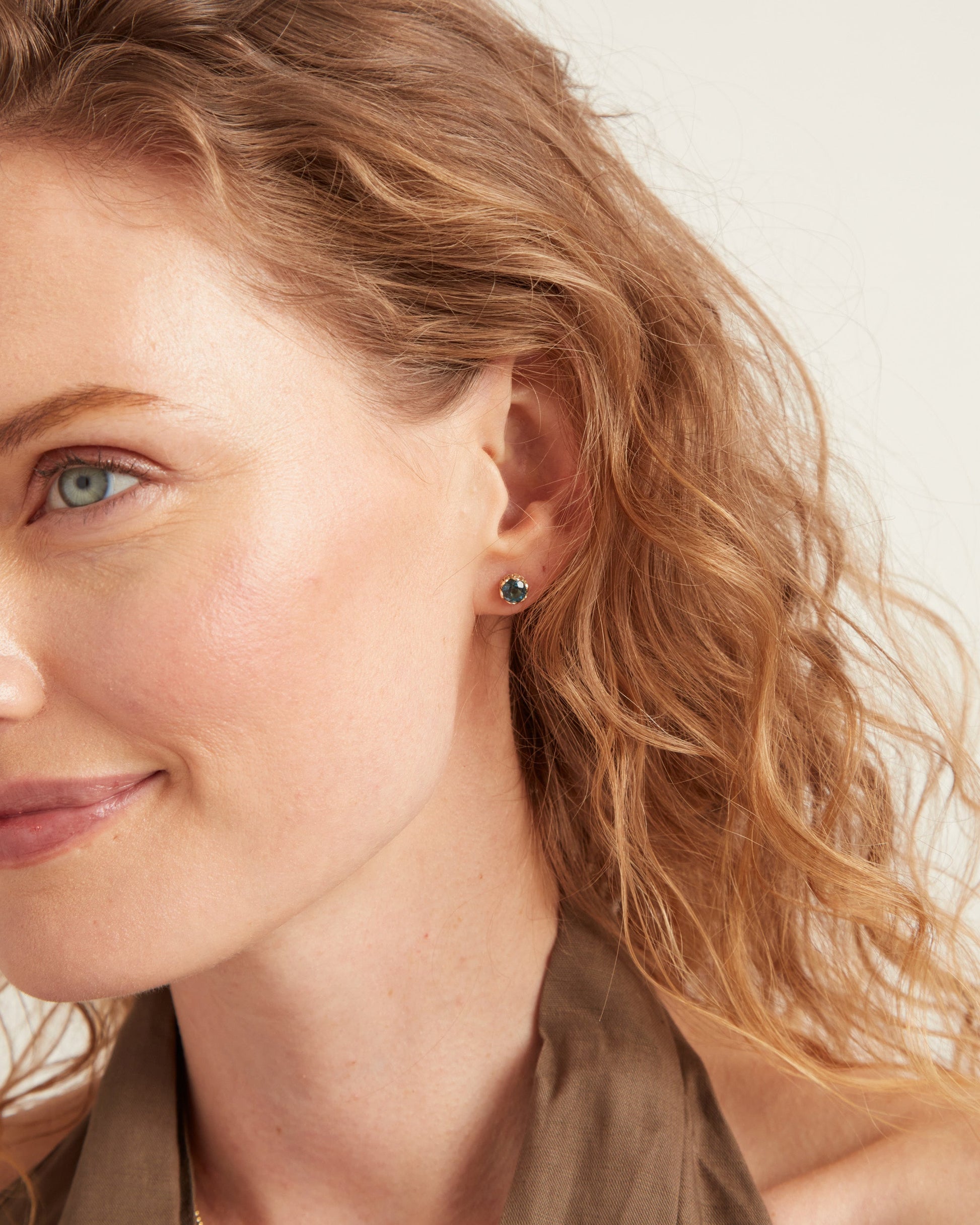 Elevate any ensemble with the Princess Petroglyph Stone Studs in 14K solid gold. These unique earrings feature faceted London blue topaz stones encircled by intricate petroglyphs, combining timeless elegance with contemporary style. Perfect for adding a touch of sophistication to any outfit, these studs pair beautifully with our Princess Petroglyph Stone Pendant.