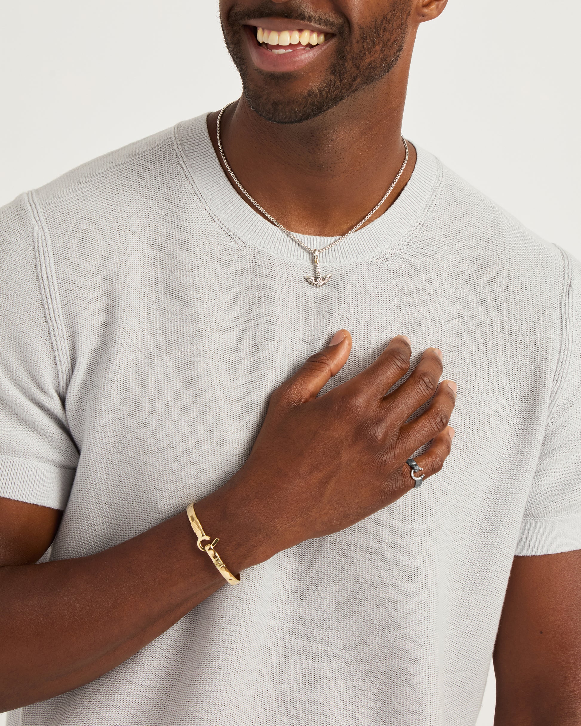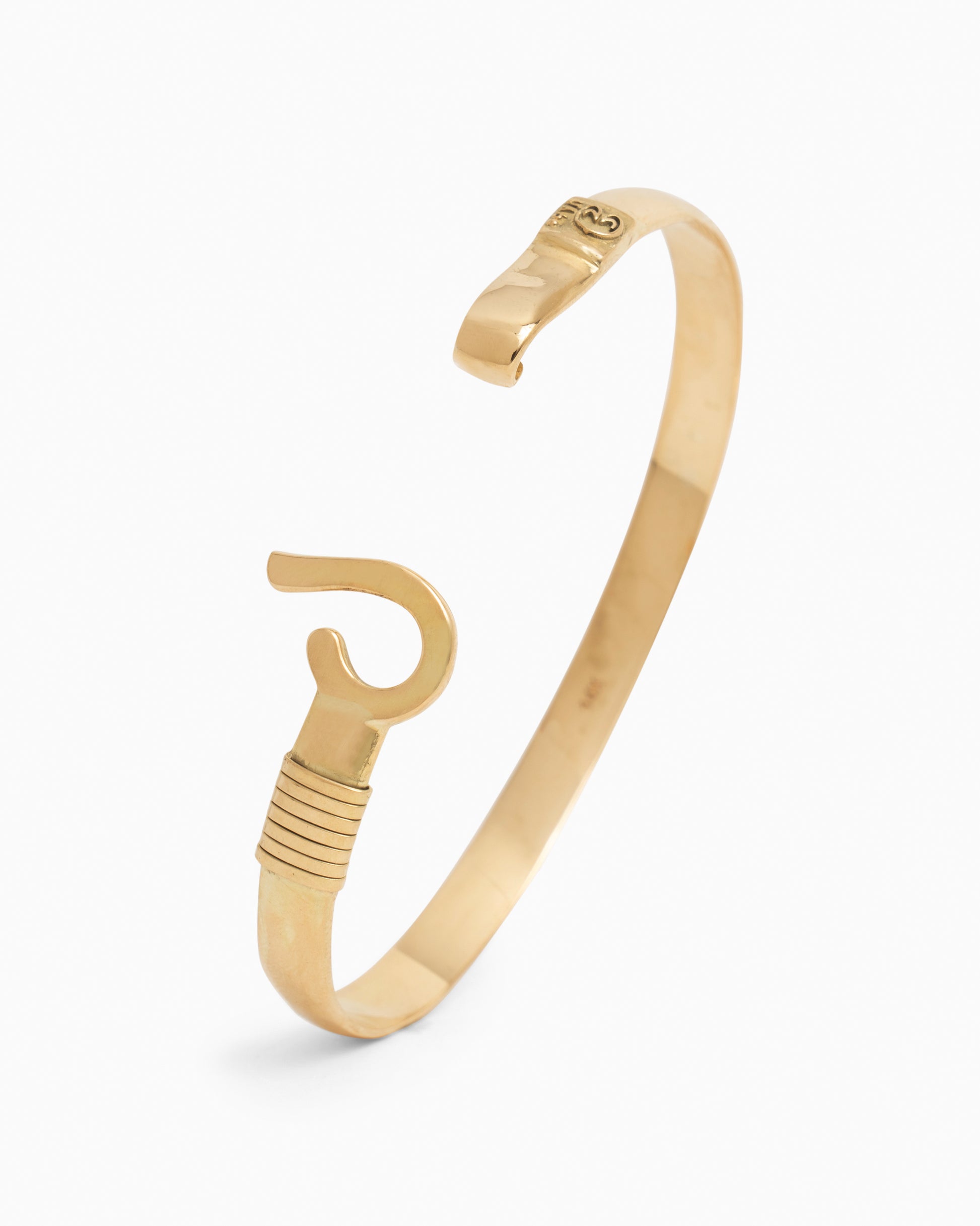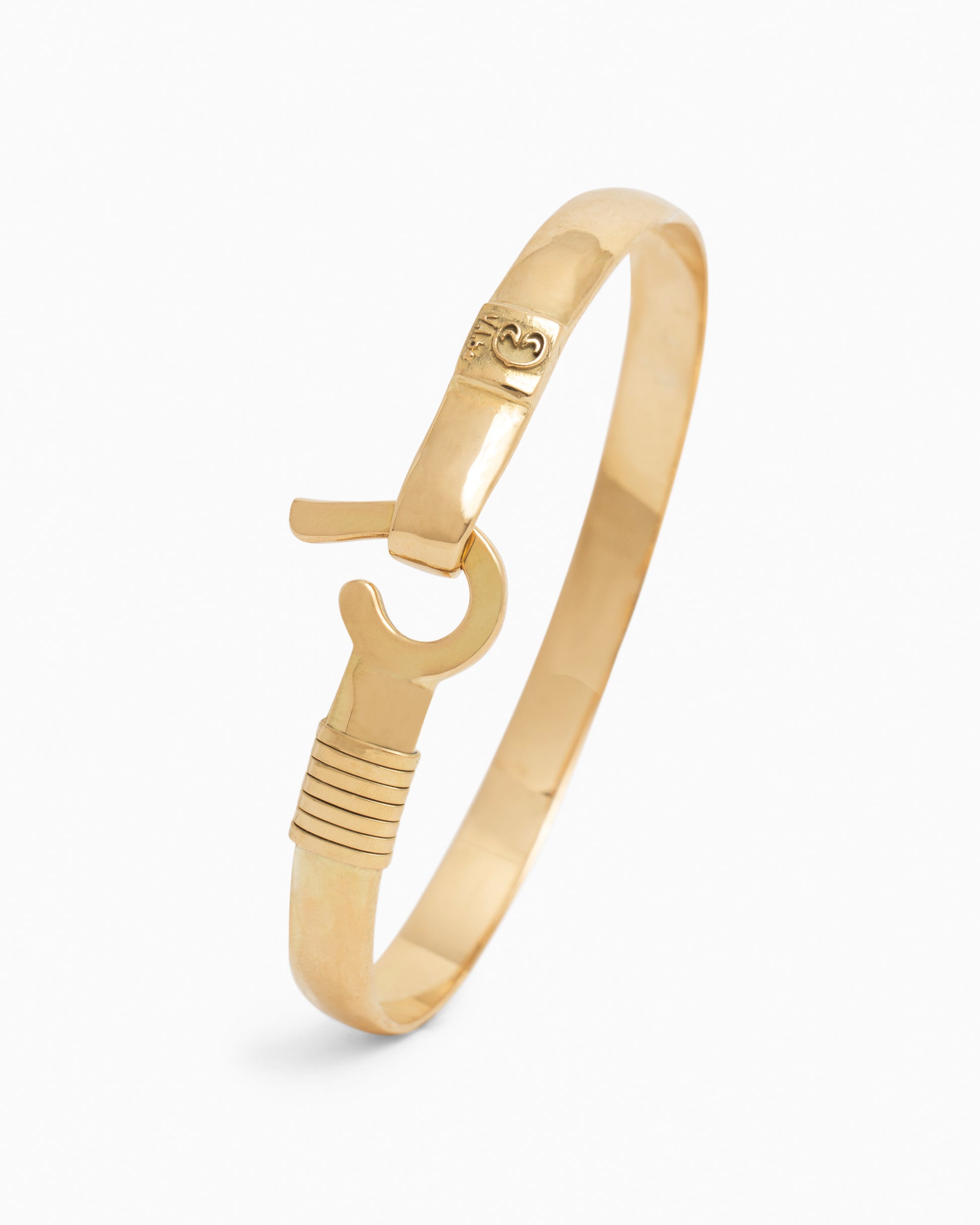 A Vibe signature, the St. John Hook Bracelet is fashioned in gently hammered 14K solid gold with a "J" hook clasp to honor the island of St. John. Featuring a replica of the St. John petroglyph and seven good luck wraps, solo or stacked, it is sure to be a favorite statement piece. Found in many of our designs, Vibe’s seven good luck wraps represent love, laughter, happiness, good fortune, health, unity, and peace. In the Caribbean tradition, wear your hook facing in to keep love close to your heart, and facing out if you are open to a new love in your life. Wear this piece on its own or stack it with other bracelets for a layered look. For added fun, embellish your new hook bracelet with one or more of Vibe's fun and unique charms!