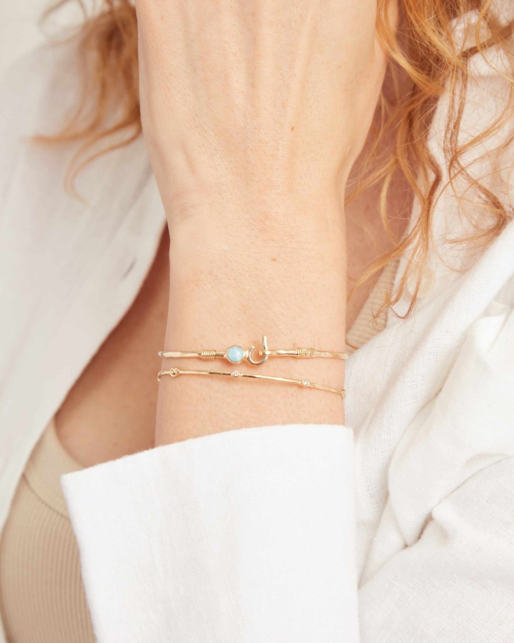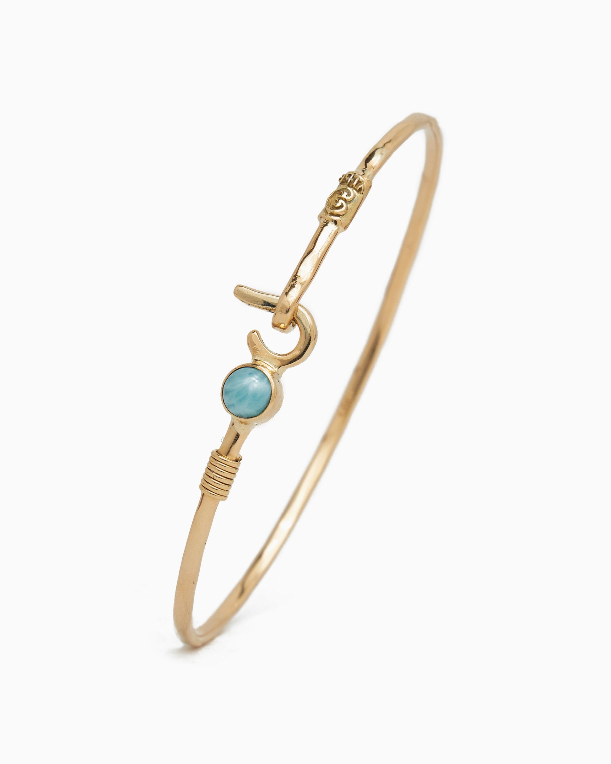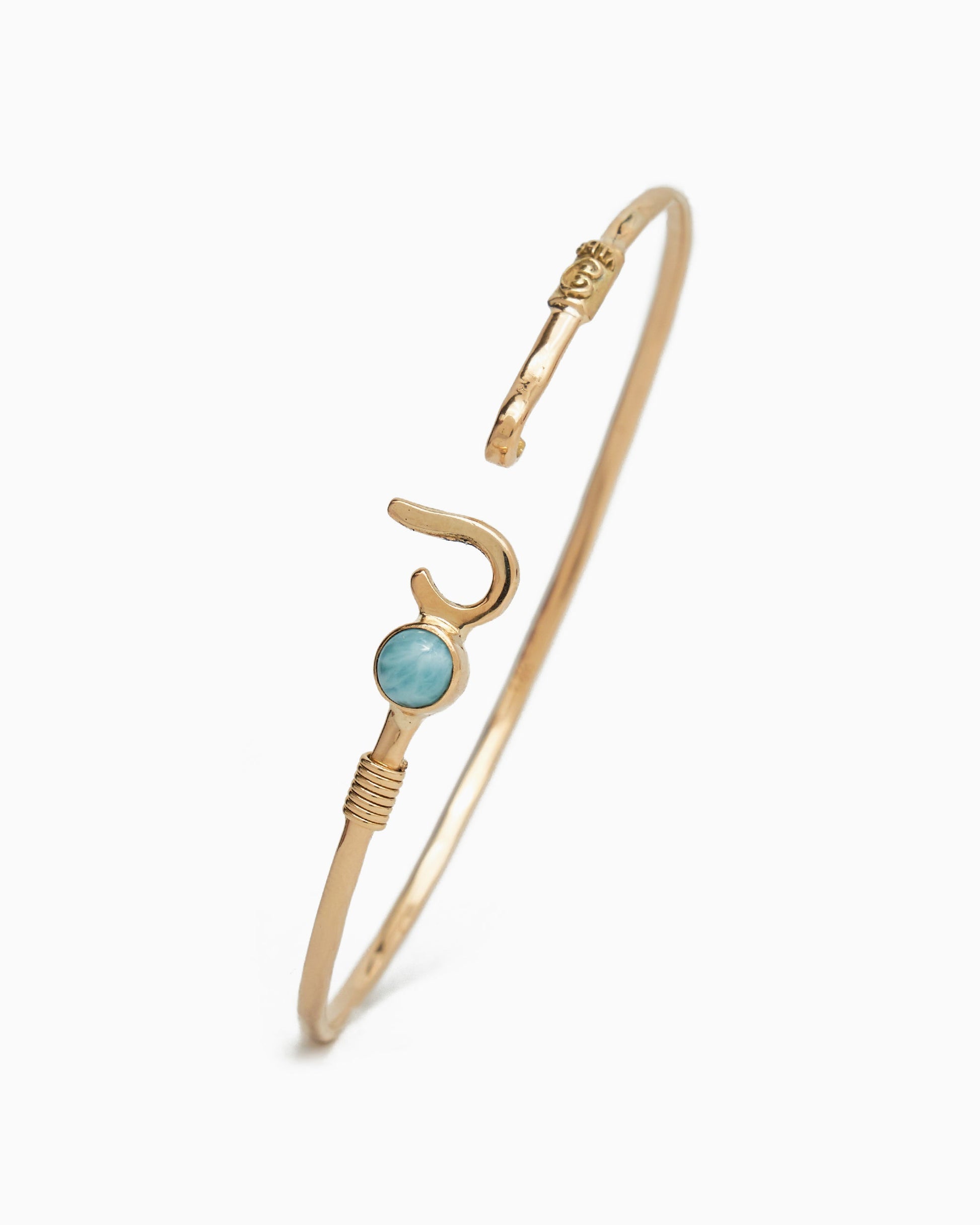 A Vibe signature, the St. John Hook Bracelet with Stone is fashioned in gently hammered 14K solid gold with a larimar cabochon and "J" hook clasp. Featuring a replica of the St. John petroglyph and seven good luck wraps, solo or stacked, it is sure to be a favorite piece. Found in many of our designs, Vibe’s seven good luck wraps represent love, laughter, happiness, good fortune, health, unity, and peace. In the Caribbean tradition, wear your hook facing in to keep love close to your heart, and facing out if you are open to a new love in your life. Wear this piece on its own or stack it with other bracelets for a layered look.