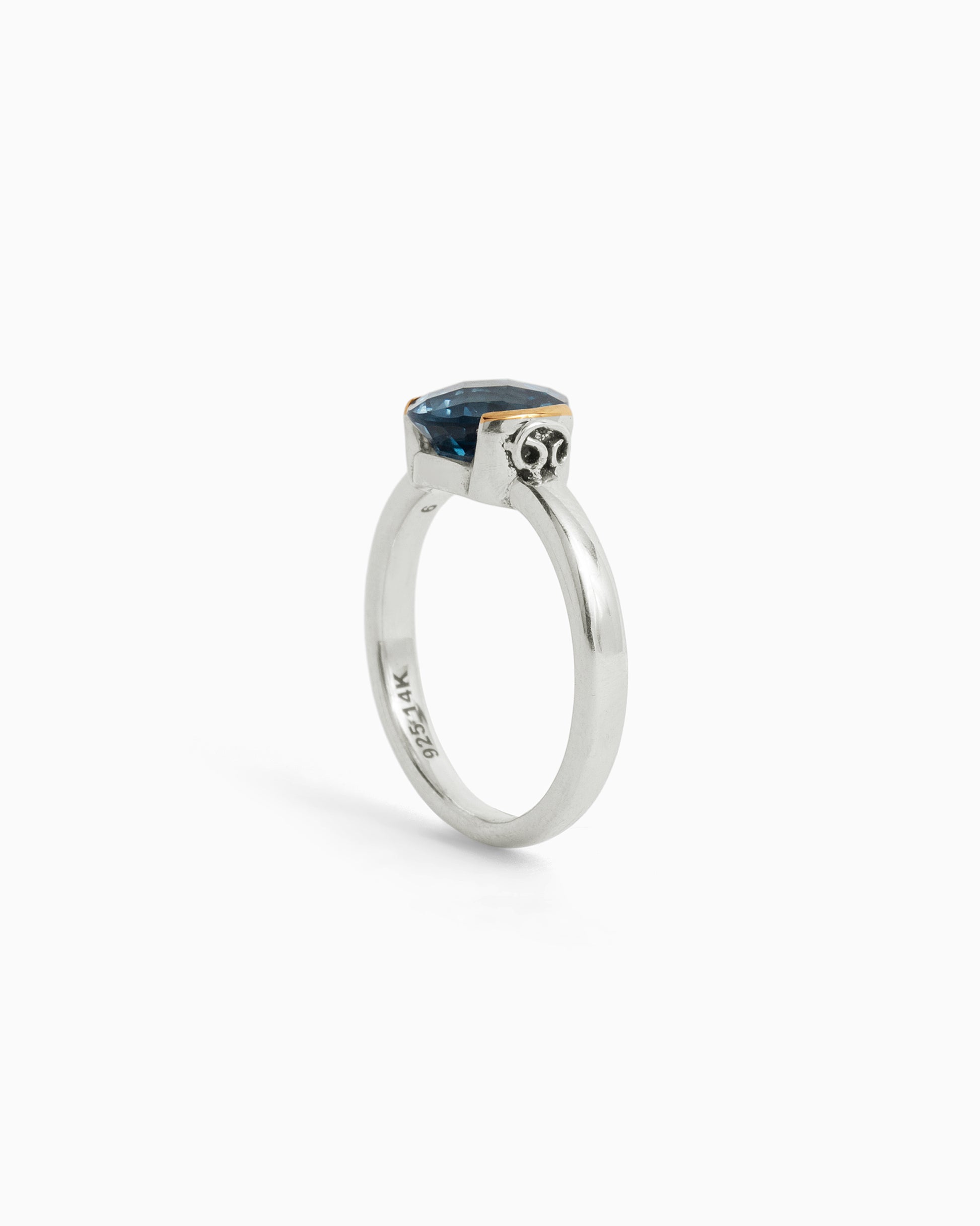 The Gemstone Ring is meticulously handcrafted in gently hammered sterling silver, adorned with a 14K gold half bezel that accentuates a stunning faceted London blue topaz stone. This unique design is elevated further by the presence of the iconic St. John petroglyph, intricately detailed on the side.
