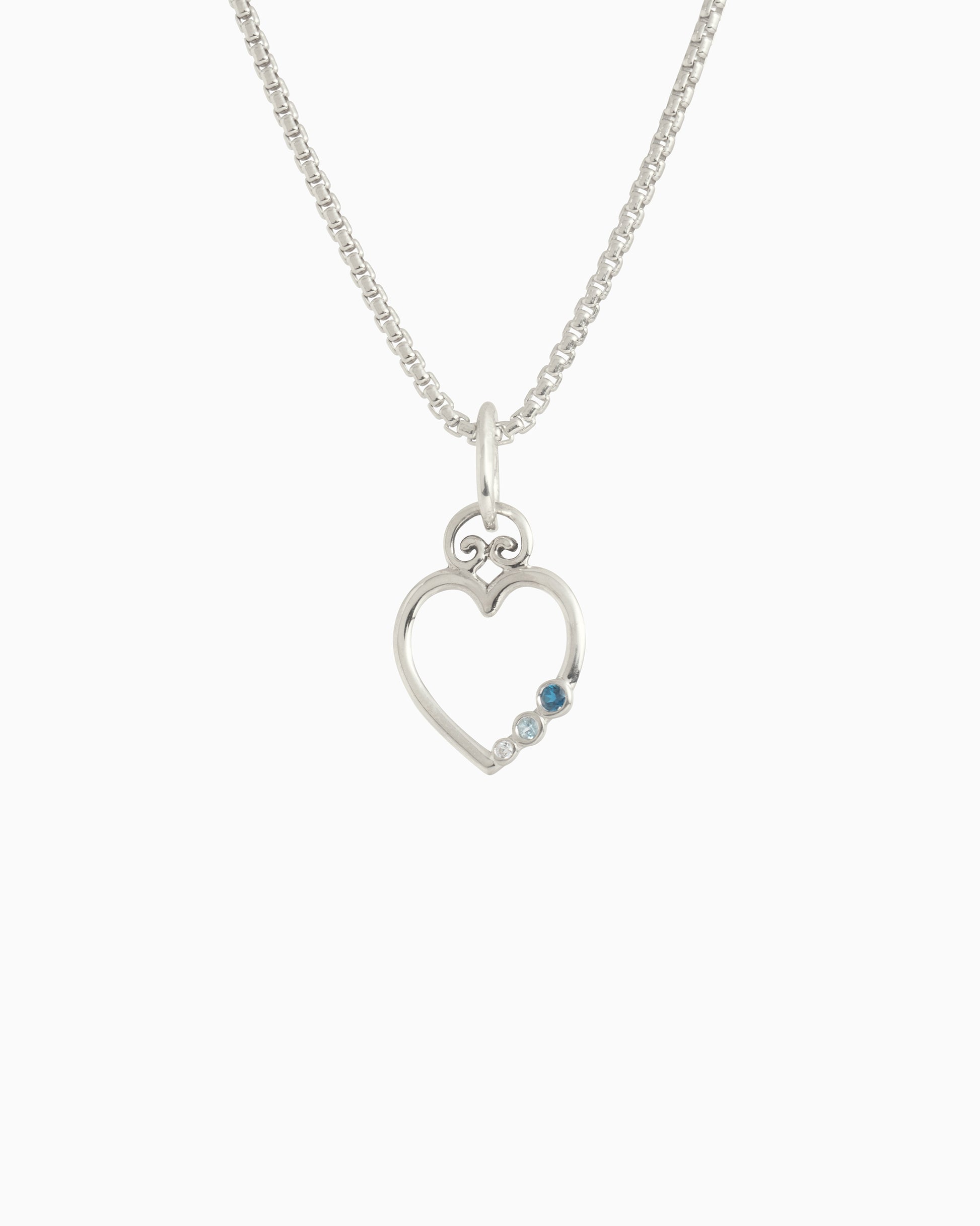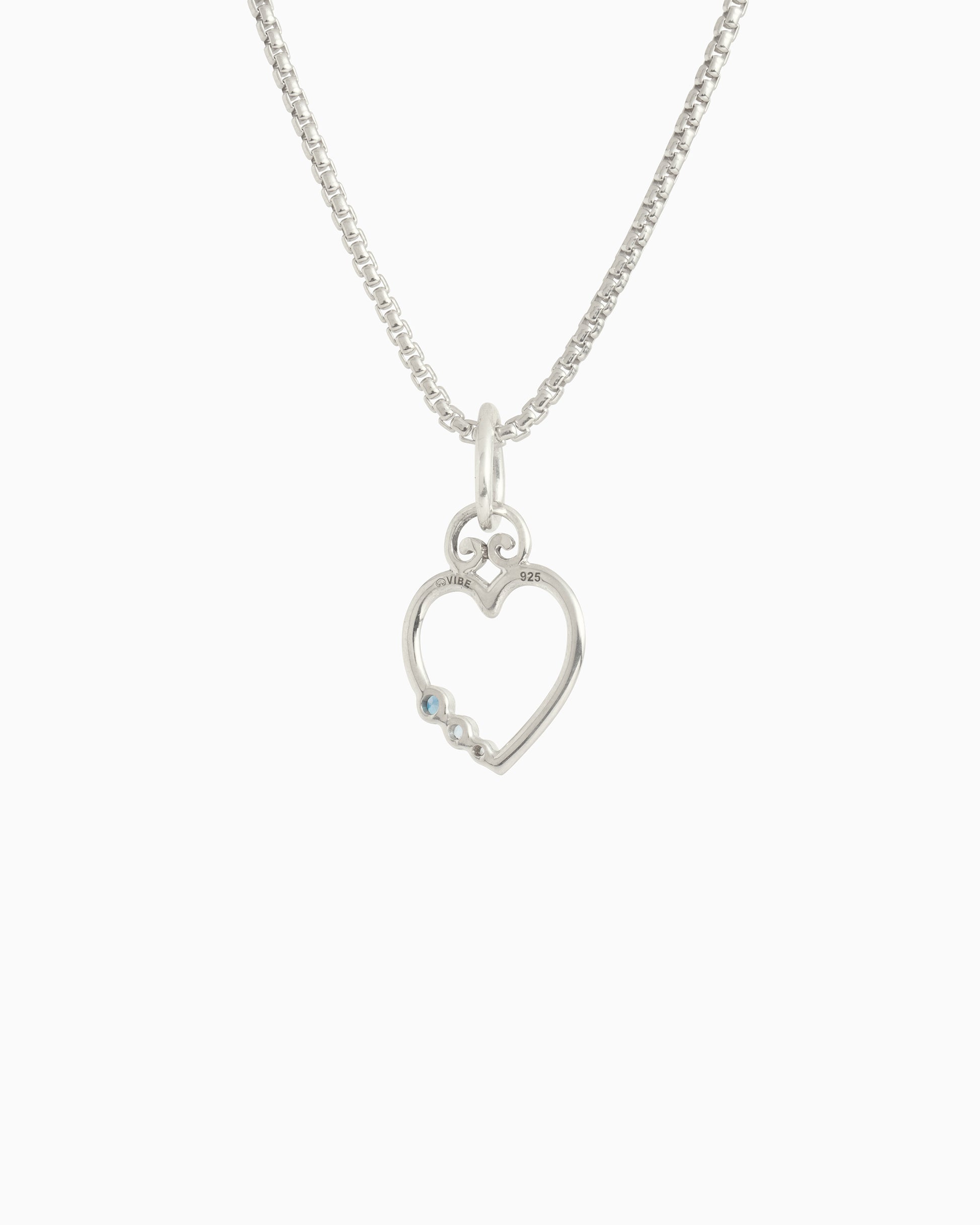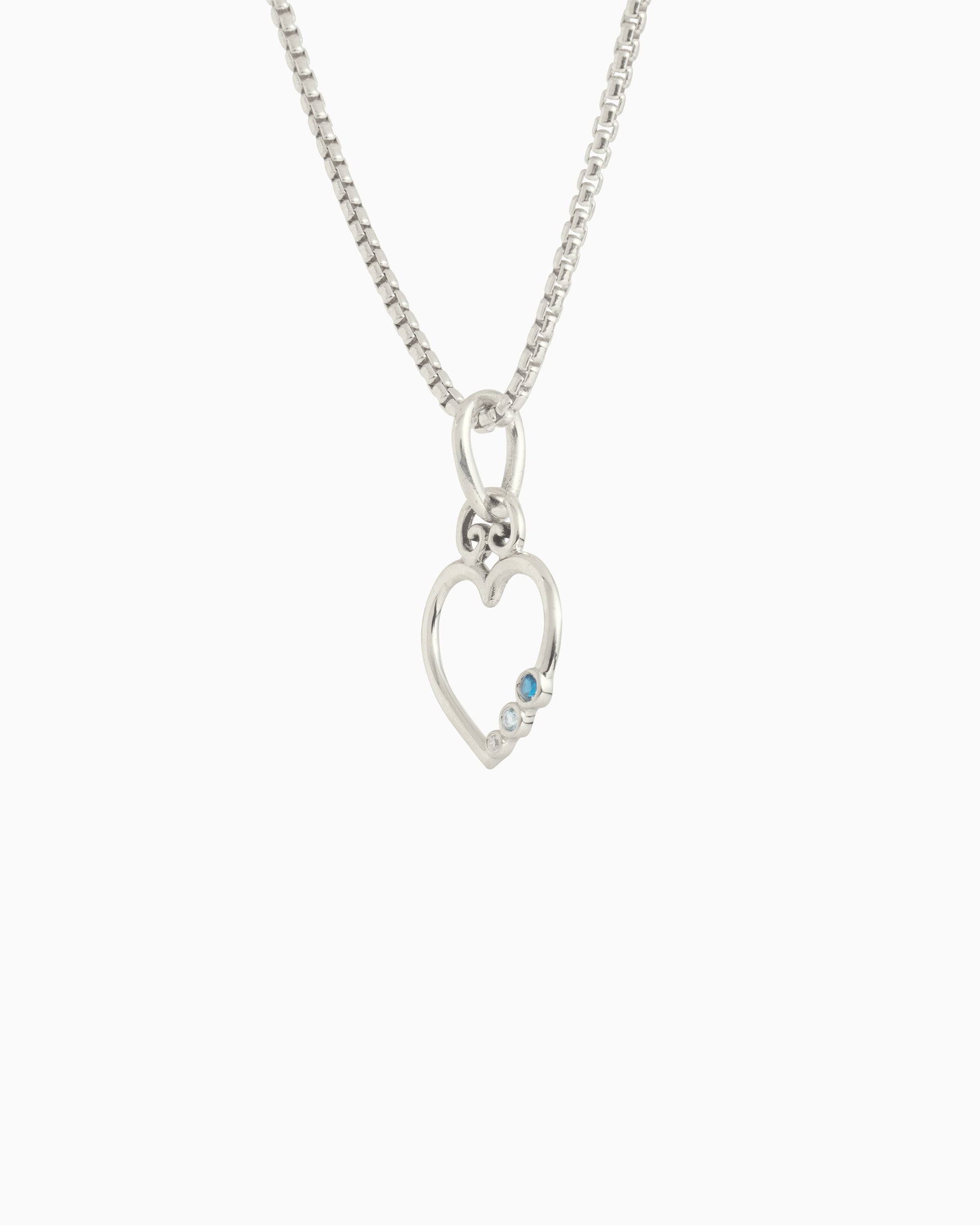 The Open Heart Pendant with Triple Stones is handcrafted in sterling silver, featuring a heart shape with a faceted white zircon, Hampton blue topaz, and London blue topaz stone. A petroglyph connects the heart to the bail, adding an extra Vibe touch to this dainty piece. Pair with your favorite chain, sold separately.
