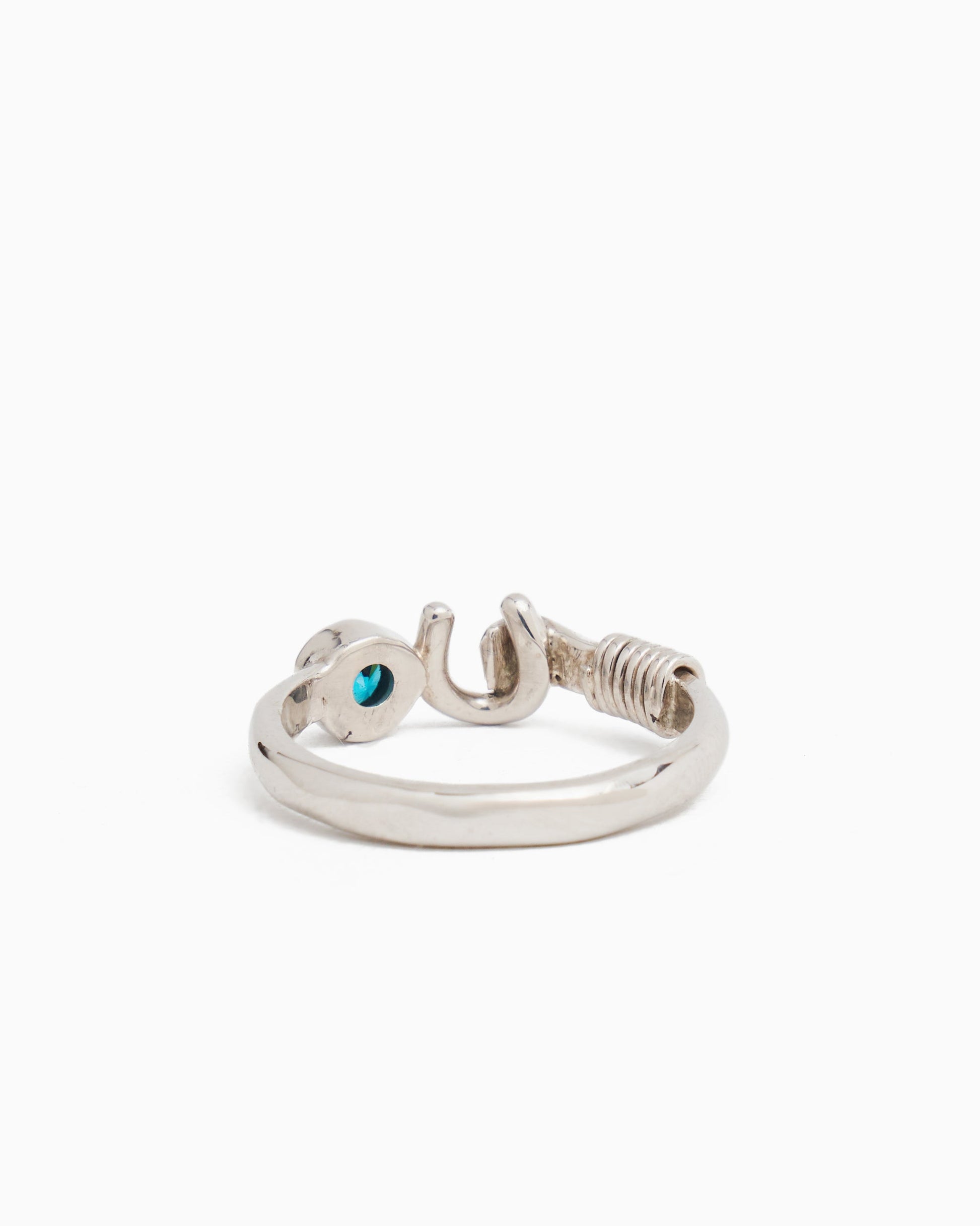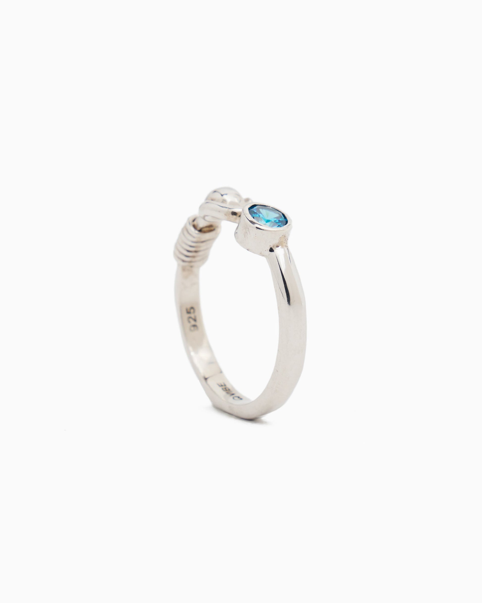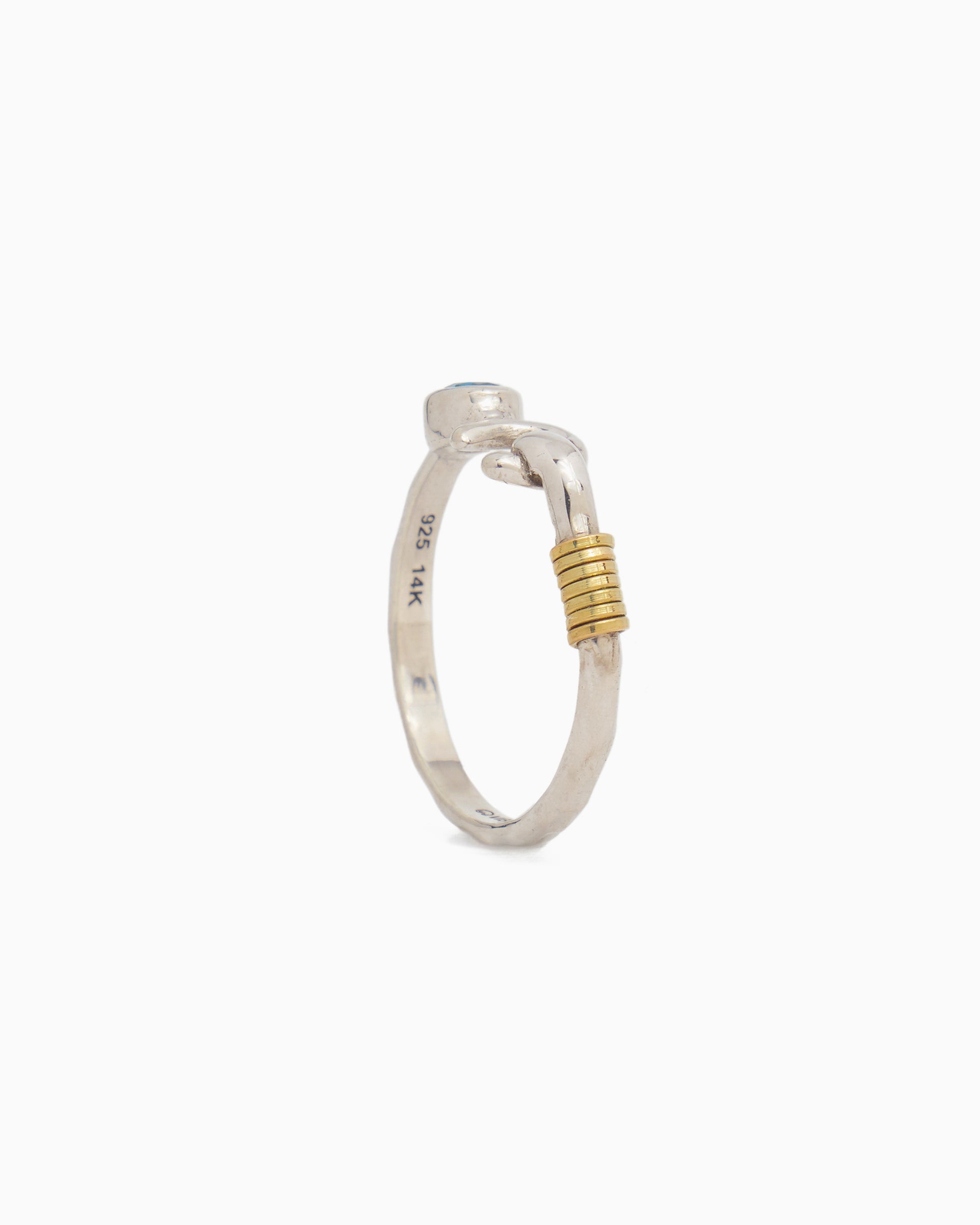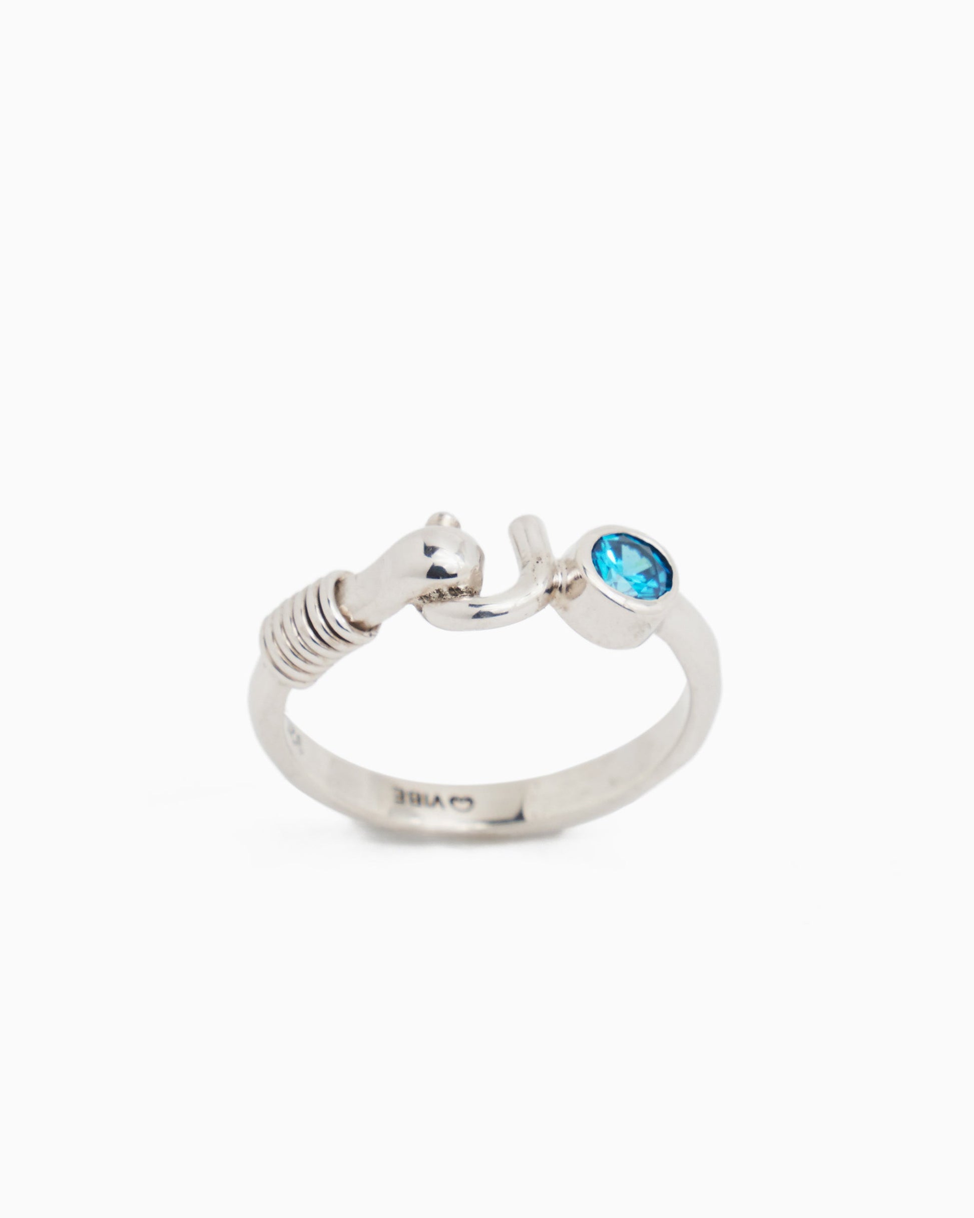 A Vibe signature, The Hook Ring is fashioned in gently hammered sterling silver with a faceted blue zircon stone and a "C" hook. Featuring a replica of the St. John petroglyph, and seven good luck wraps, it is sure to be a favorite piece. Found in many of our designs, Vibe’s seven good luck wraps represent love, laughter, happiness, good fortune, health, unity, and peace. In the Caribbean tradition, wear your hook facing in to keep love close to your heart, and facing out if you are open to a new love in your life.