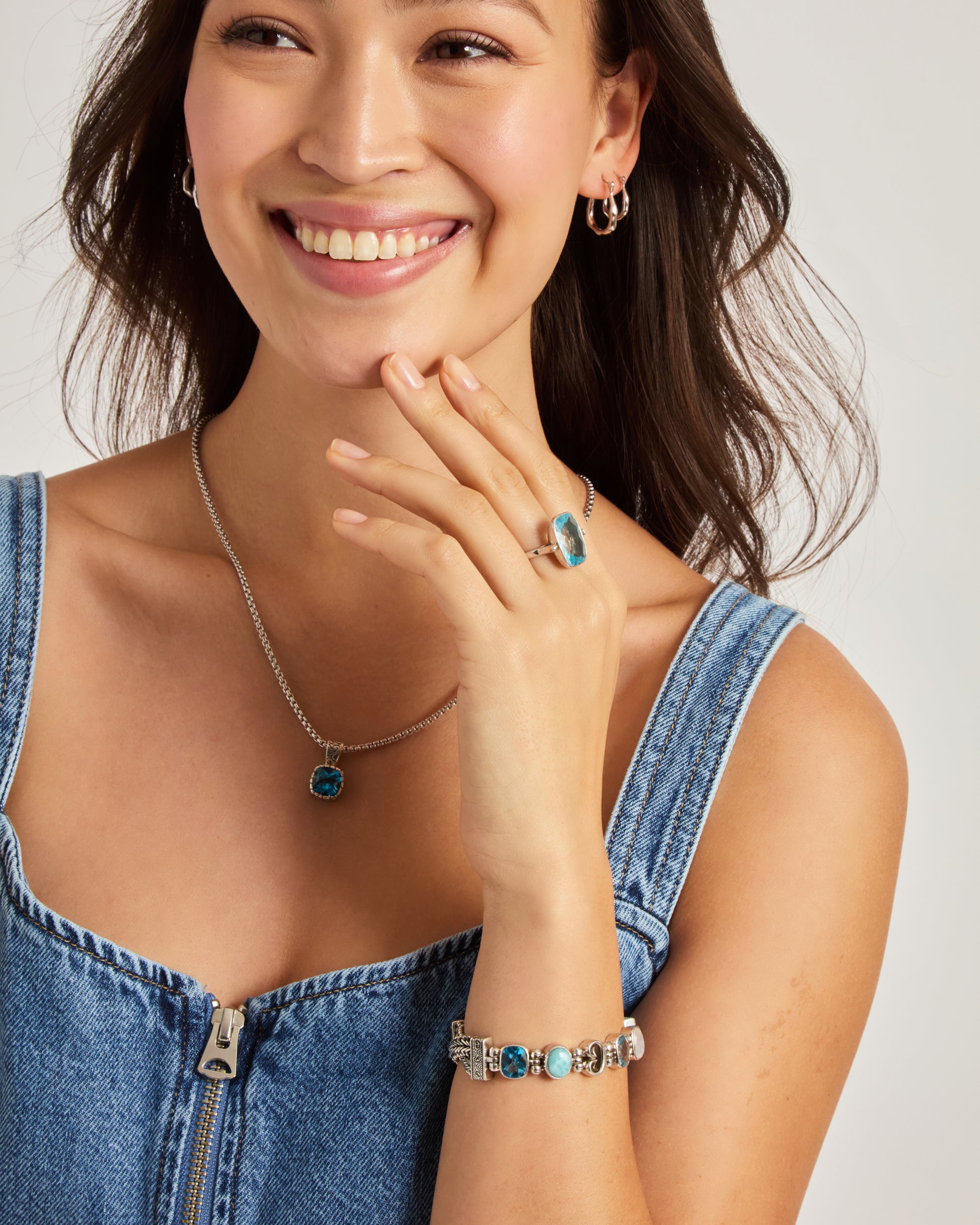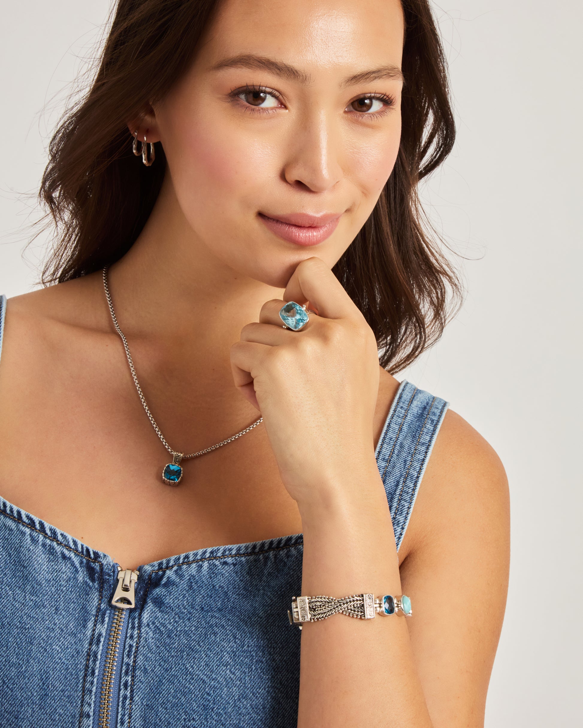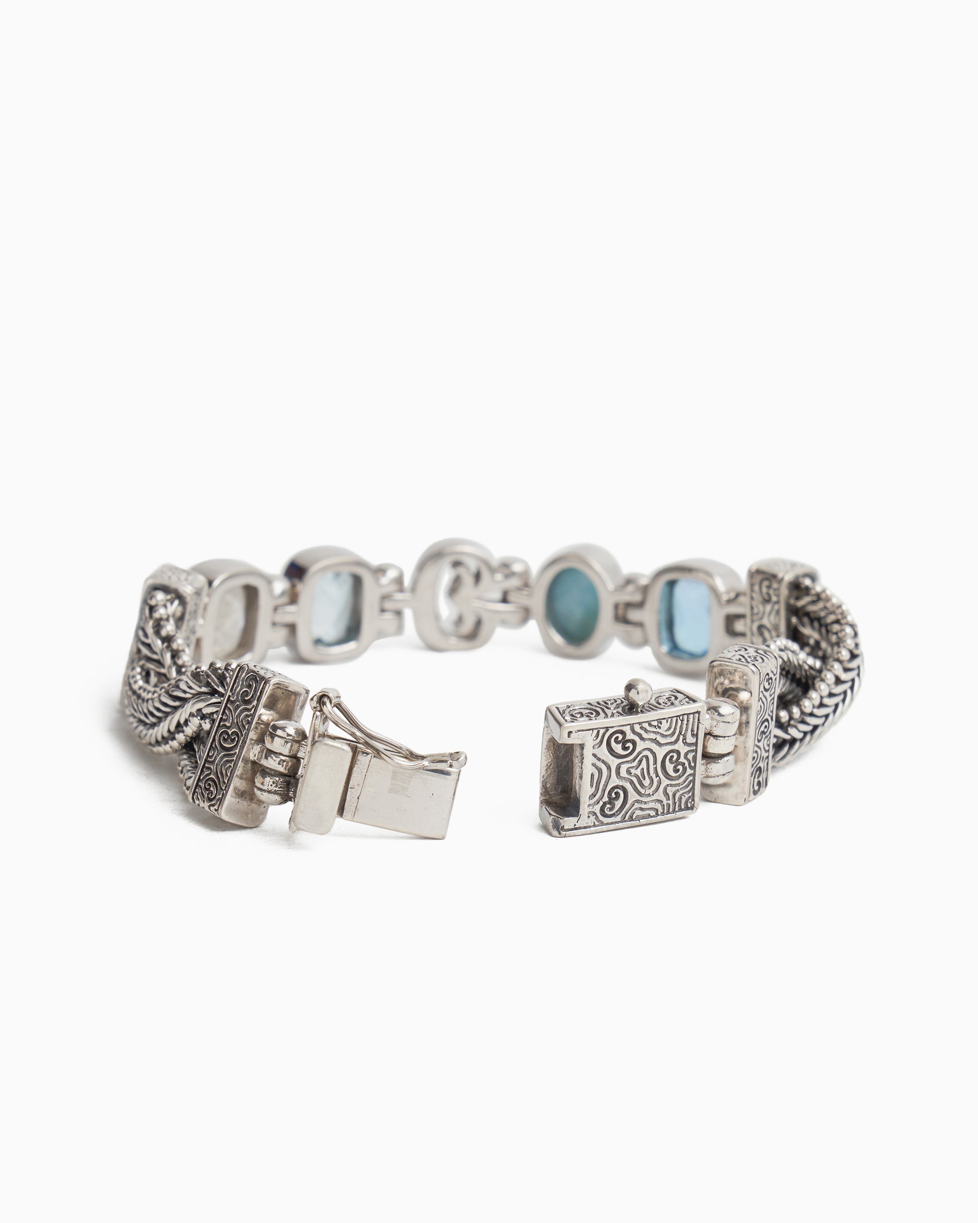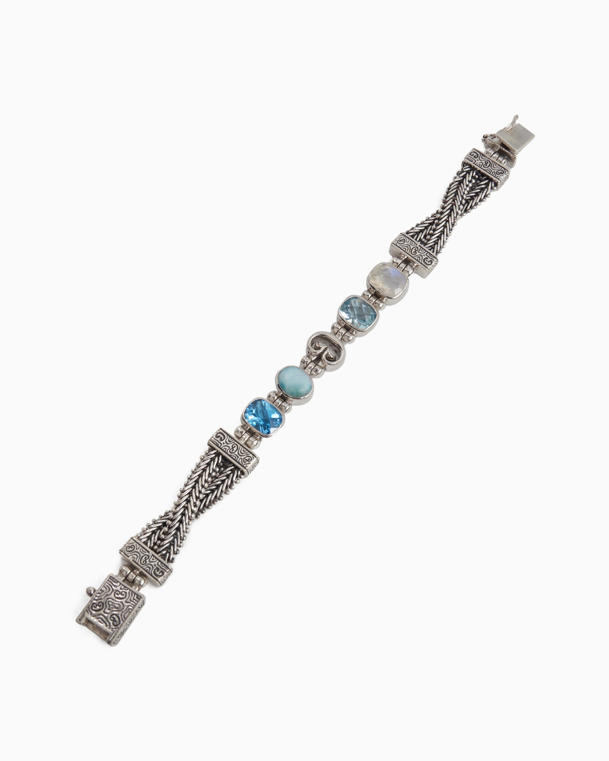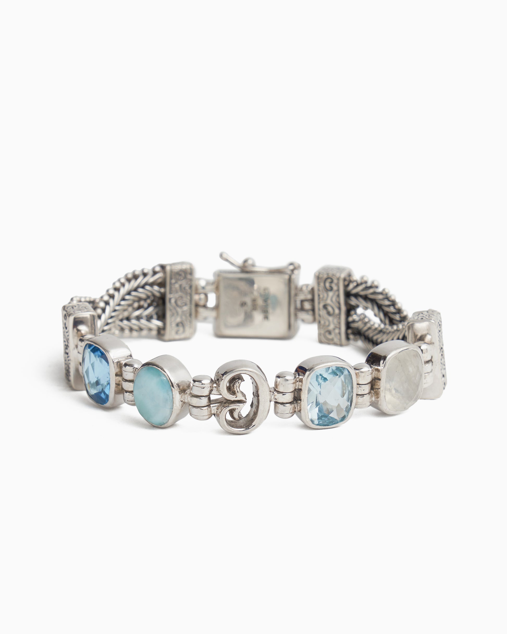 Handcrafted in sterling silver, the Hummingbird Stone Link Bracelet features a unique blend of links and criss-cross flat rope chains connected with petroglyph-textured stations. The links showcase a combination of rectangular faceted stones, including a Hampton blue topaz, sky blue topaz, and moonstone, along with a rounded larimar cabochon, and is completed with a replica of the iconic St. John petroglyph.