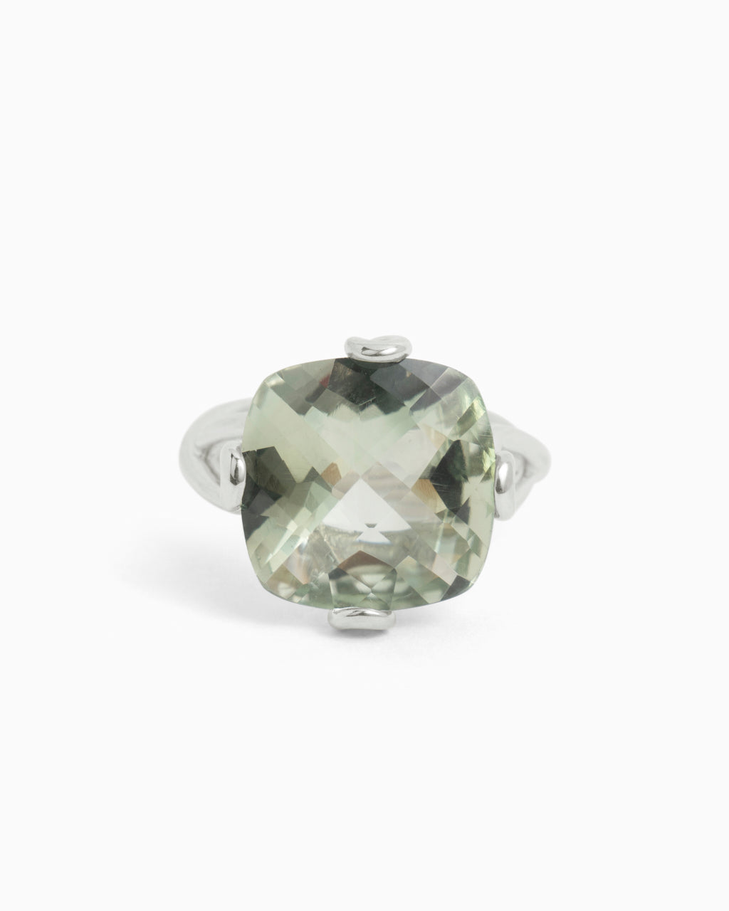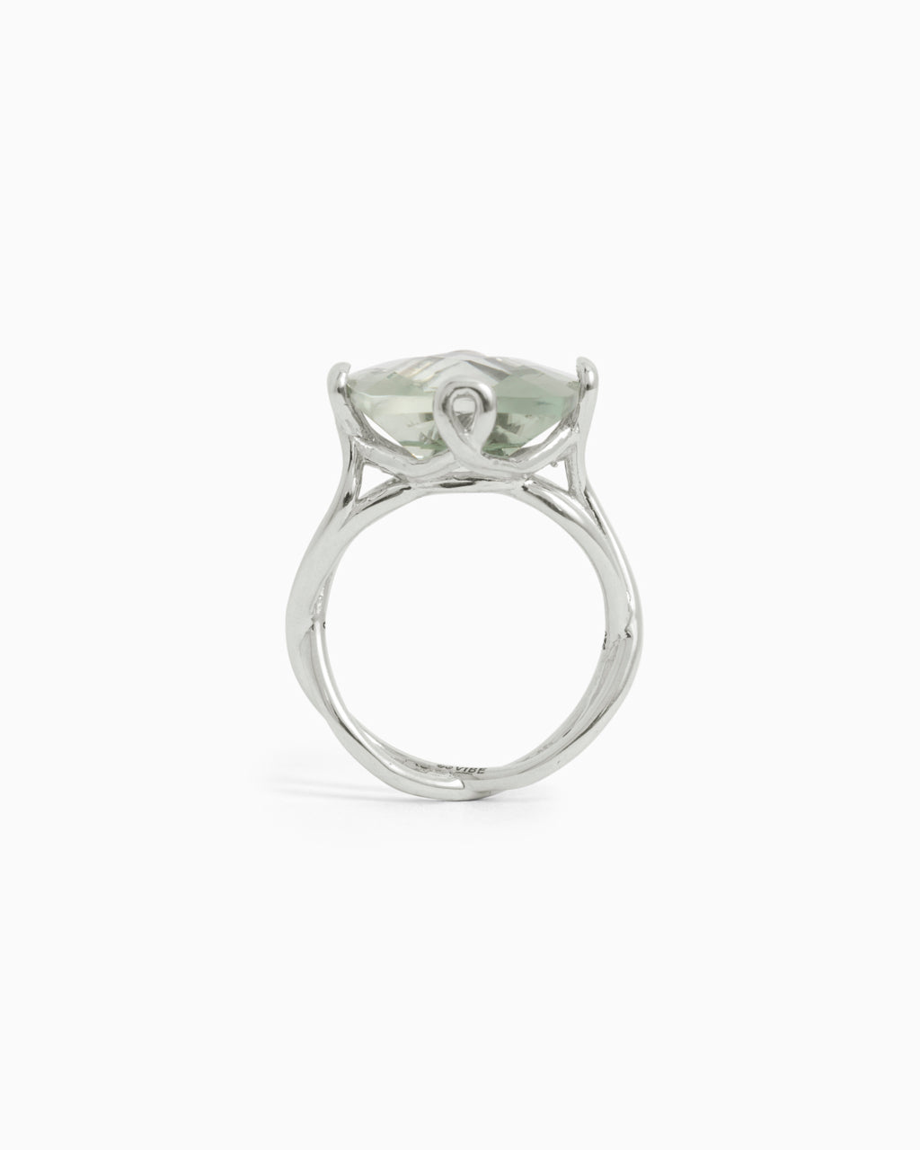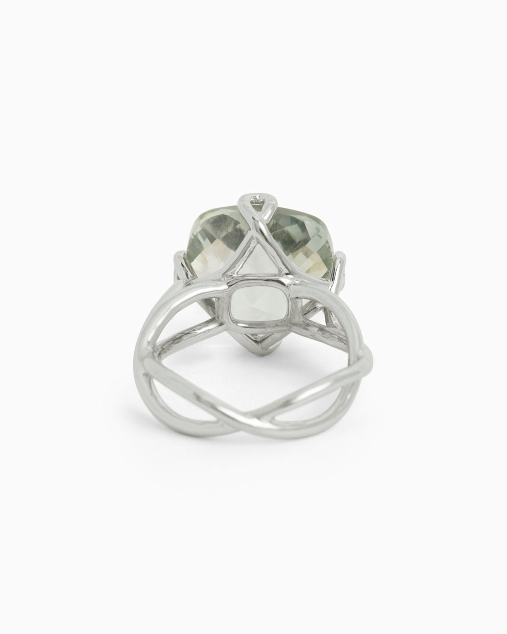 The Intertwined Band Ring is sure to make a statement! Handcrafted in sterling silver and featuring a faceted prasiolite stone, this piece is the perfect addition to your collection. The stone is not the only detail that will turn heads, this ring has an intertwined band that will wrap around your finger with ease. Style this ring alone or go bold and pair with others.