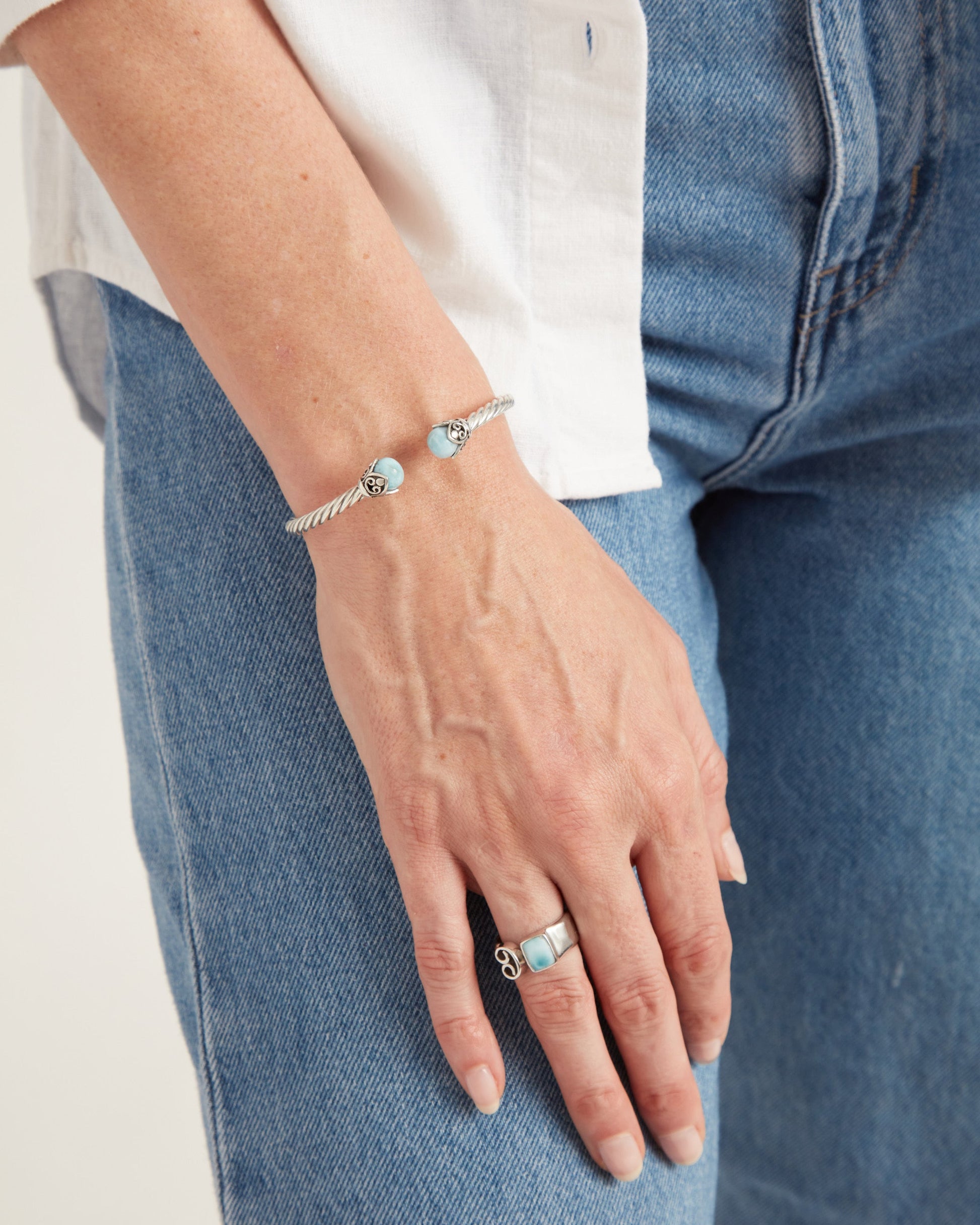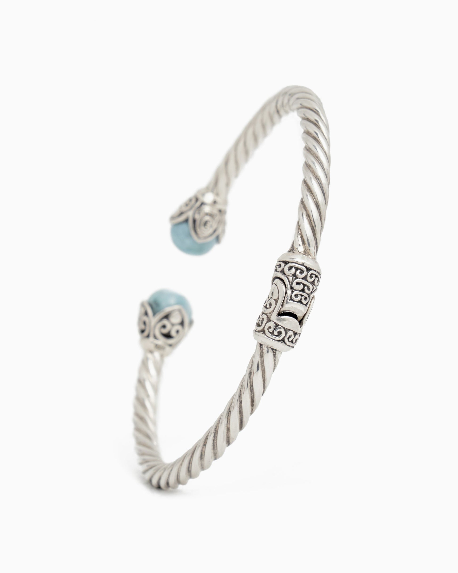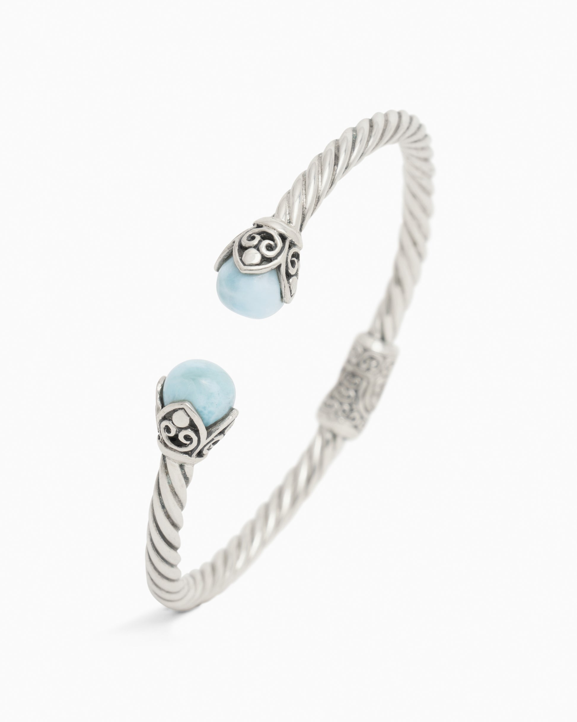 The Island Bloom Twisted Hinge Bracelet is an elegant sterling silver piece with a twisted rope-inspired band and two blooming larimar cabochons surrounded by petroglyph adorned petals. The open design and hinge closure makes this piece especially easy to wear.