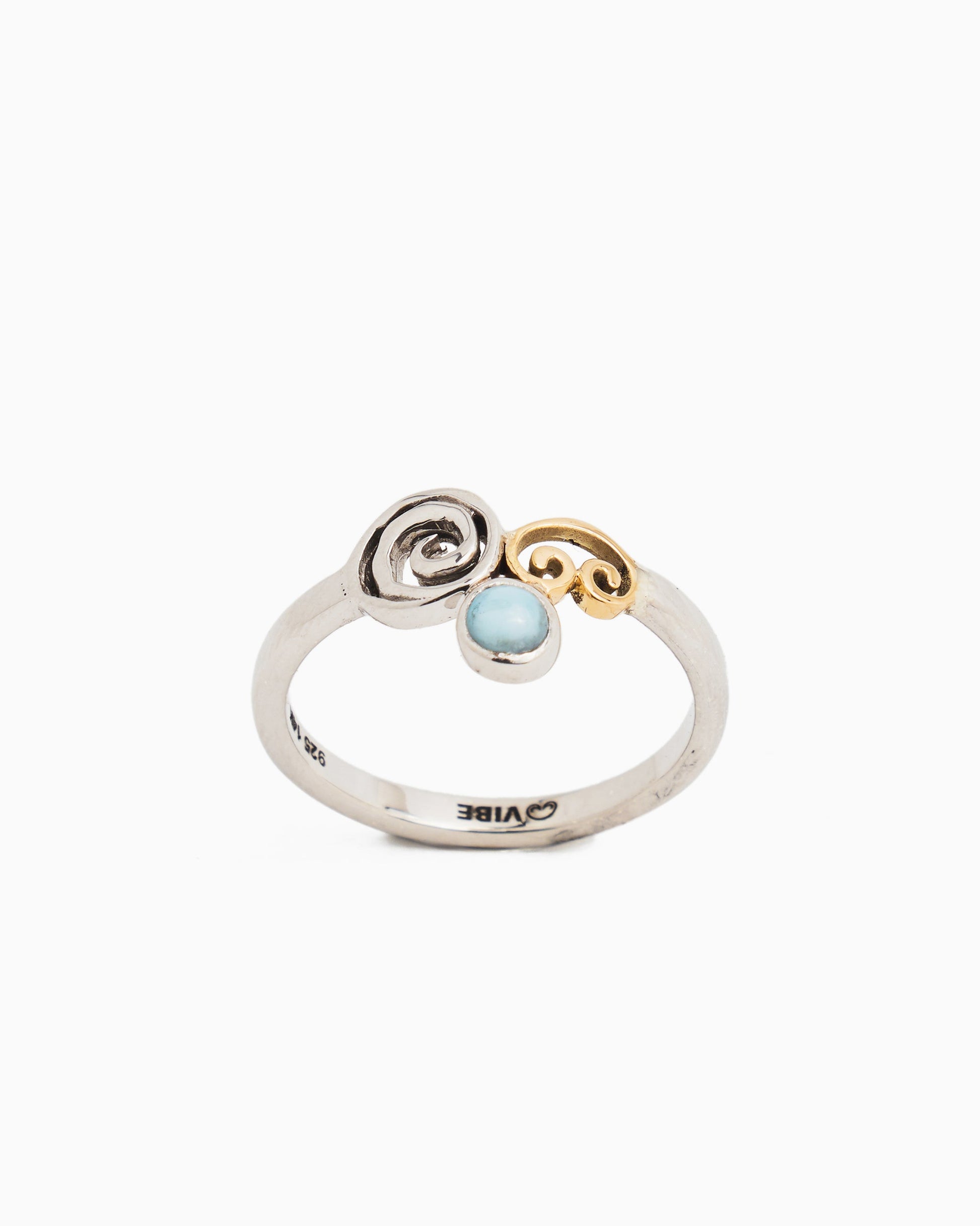 With lots of symbolism in a small package, the Island Spirit Ring features unique details with Caribbean inspiration. This sterling silver ring has a 14K solid gold petroglyph, a larimar cabochon, and a swirl design replicated after a Taino carving believed to represent water or wind. This is the perfect addition to your everyday jewelry collection.