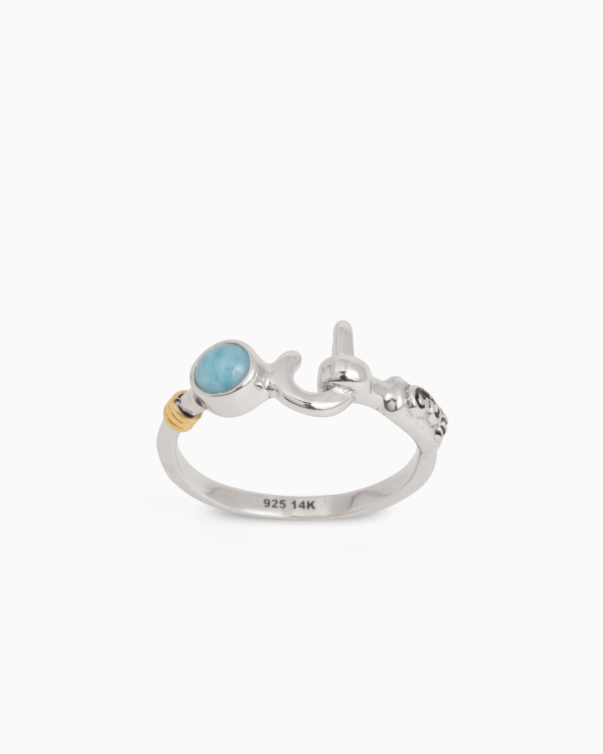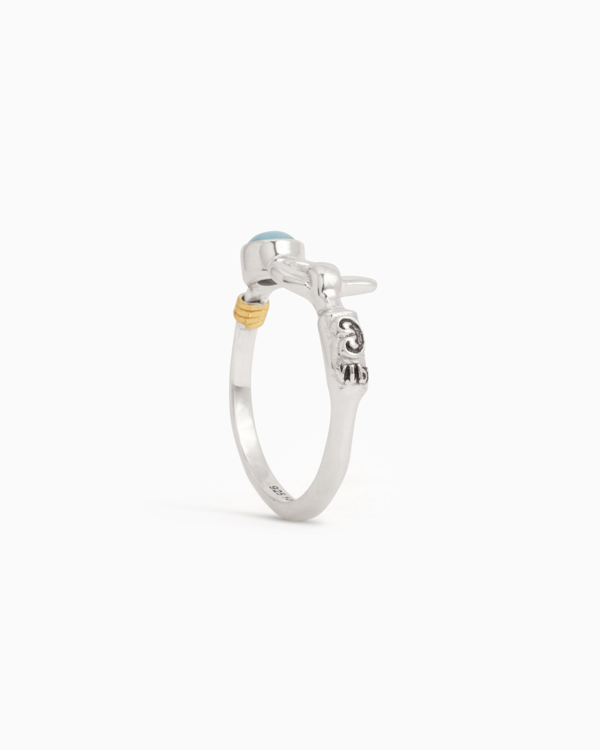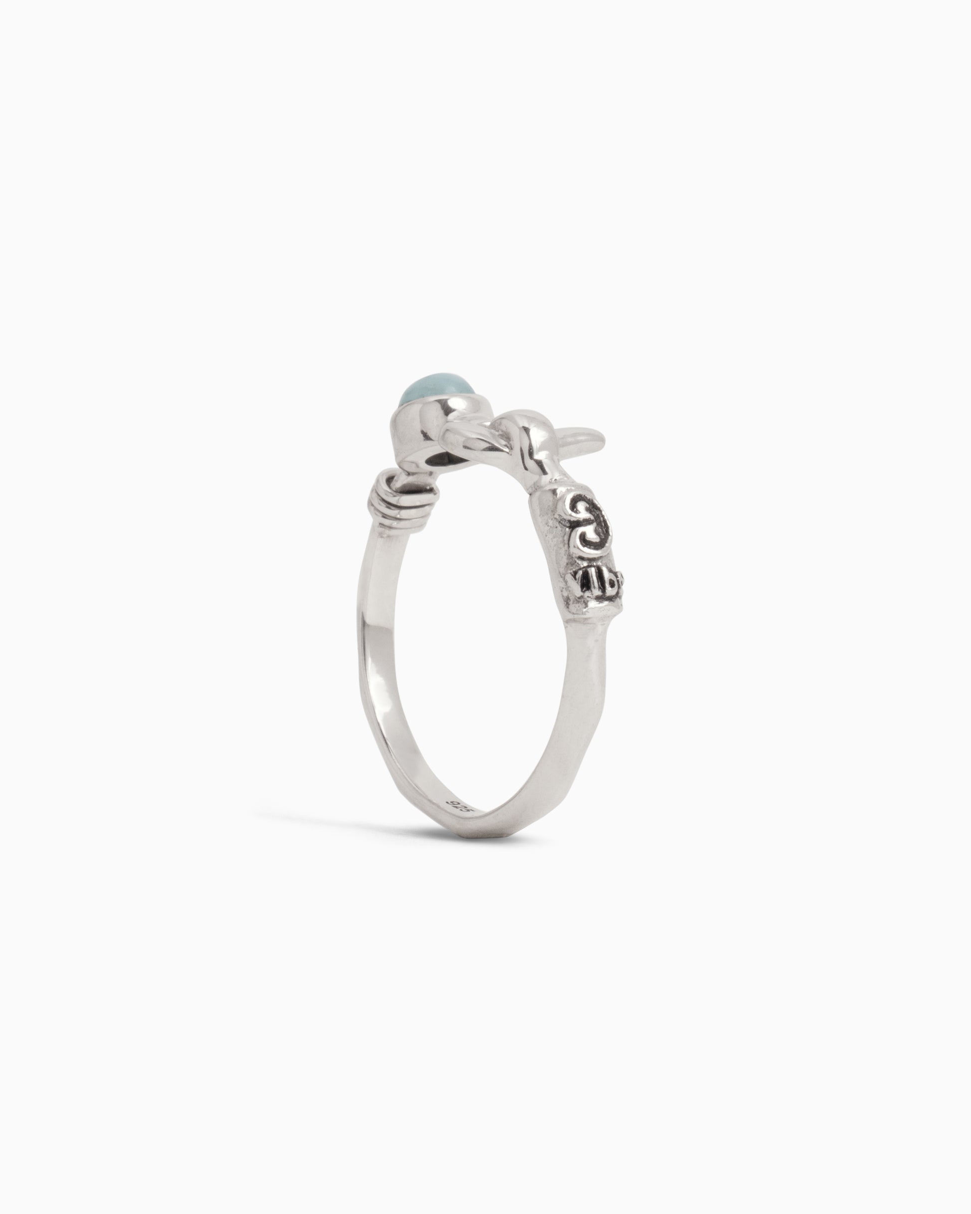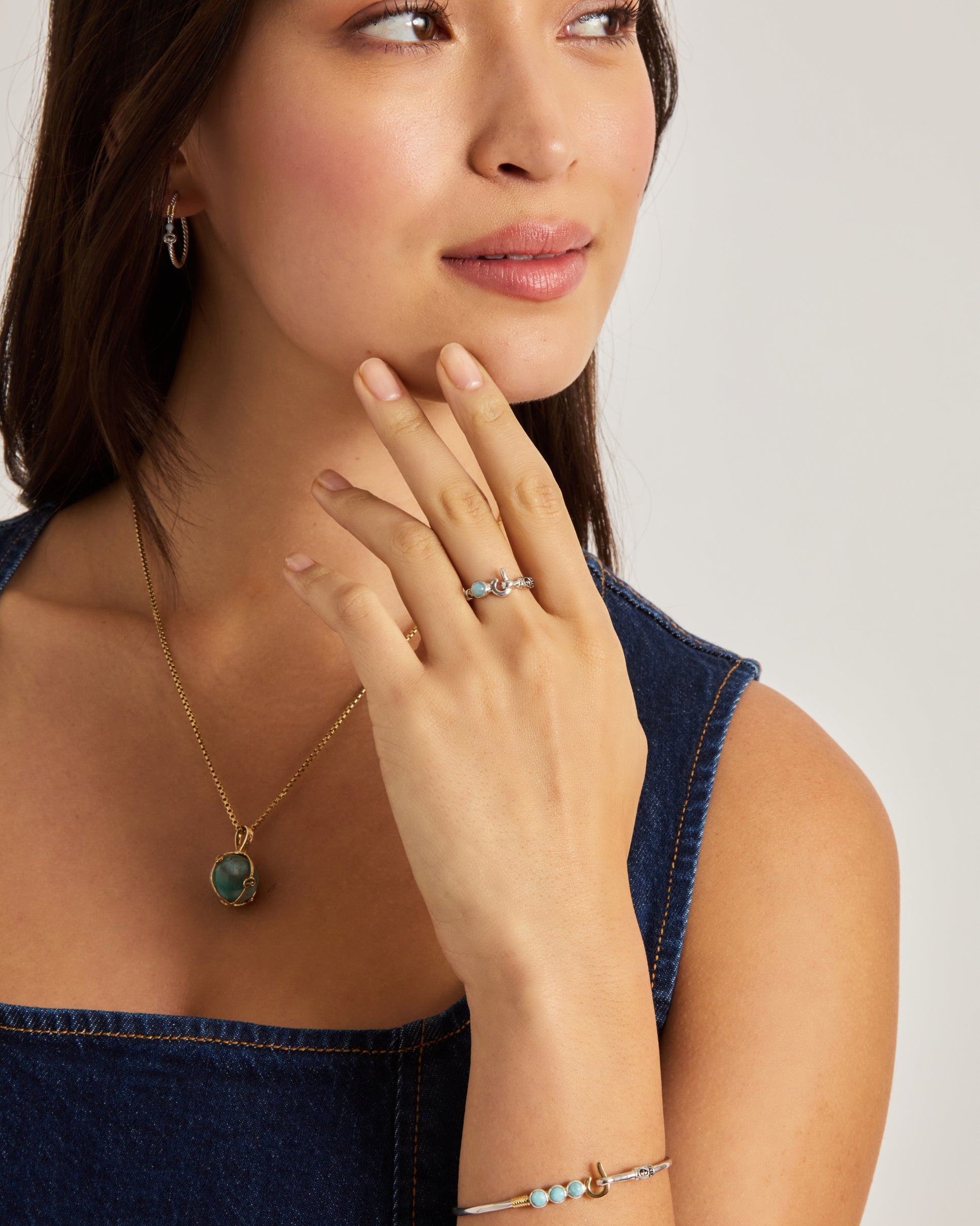 A Vibe signature, the St. John Hook Ring is handcrafted in gently hammered sterling silver and showcases a captivating larimar cabochon, a distinctive "J" hook, and a replica of the St. John petroglyph. Its three good luck wraps serve as positive affirmations to draw into your life, such as health, happiness, and prosperity. In Caribbean tradition, wear the hook inward to keep love close, or outward to attract new love.
