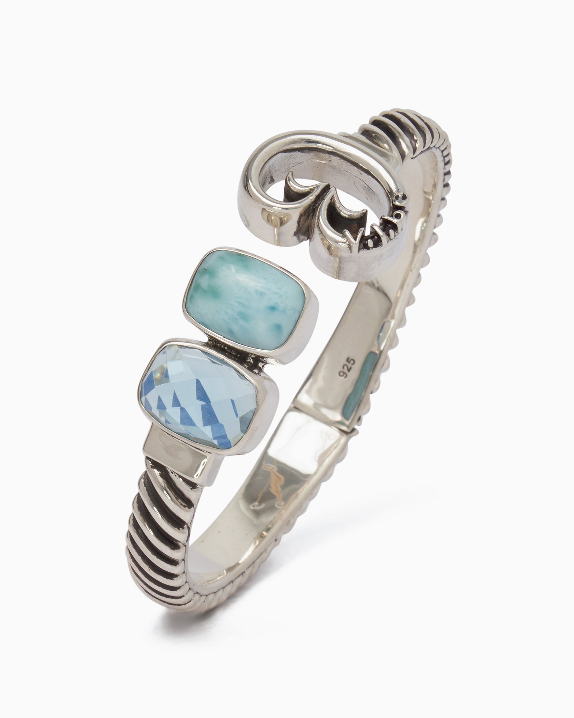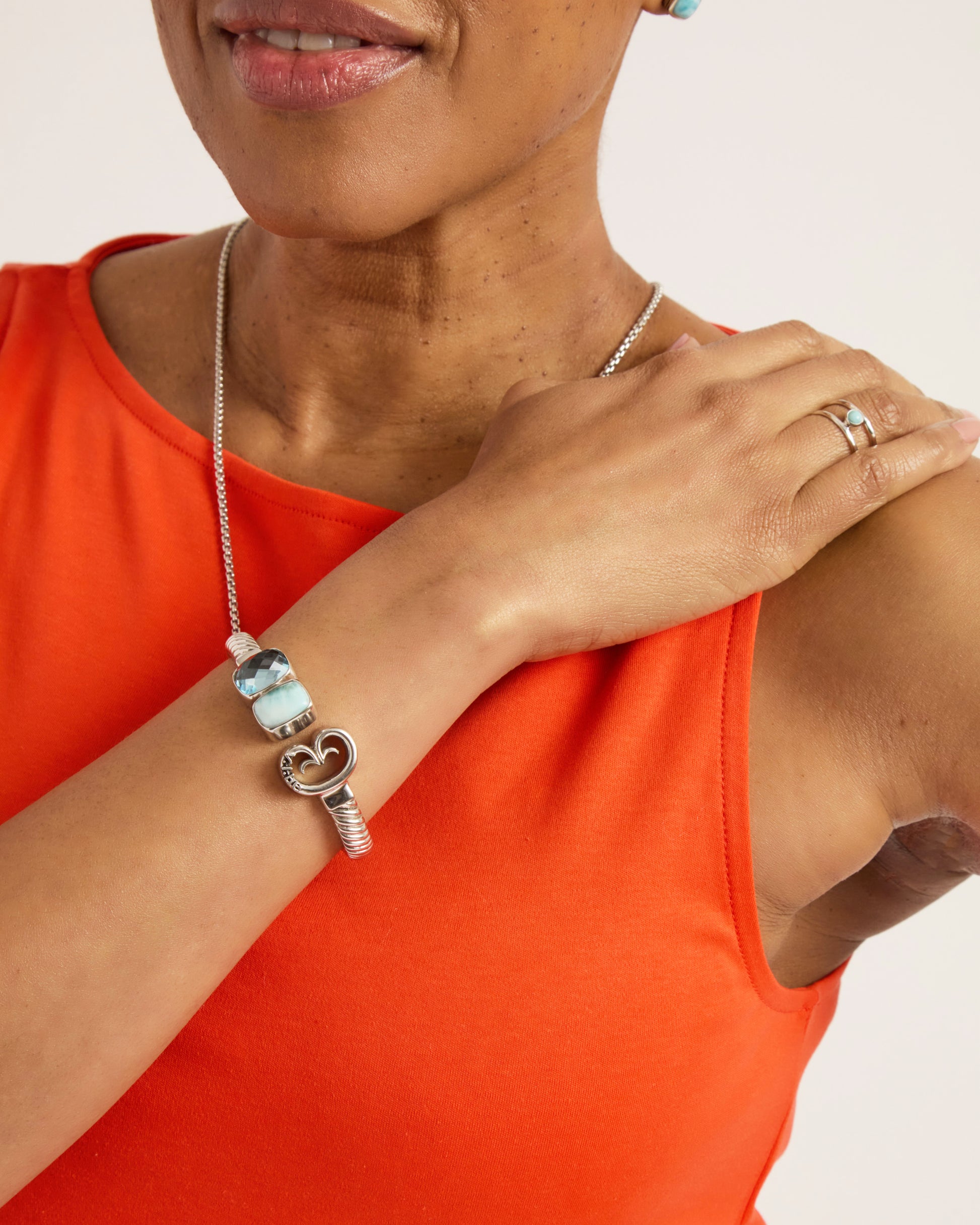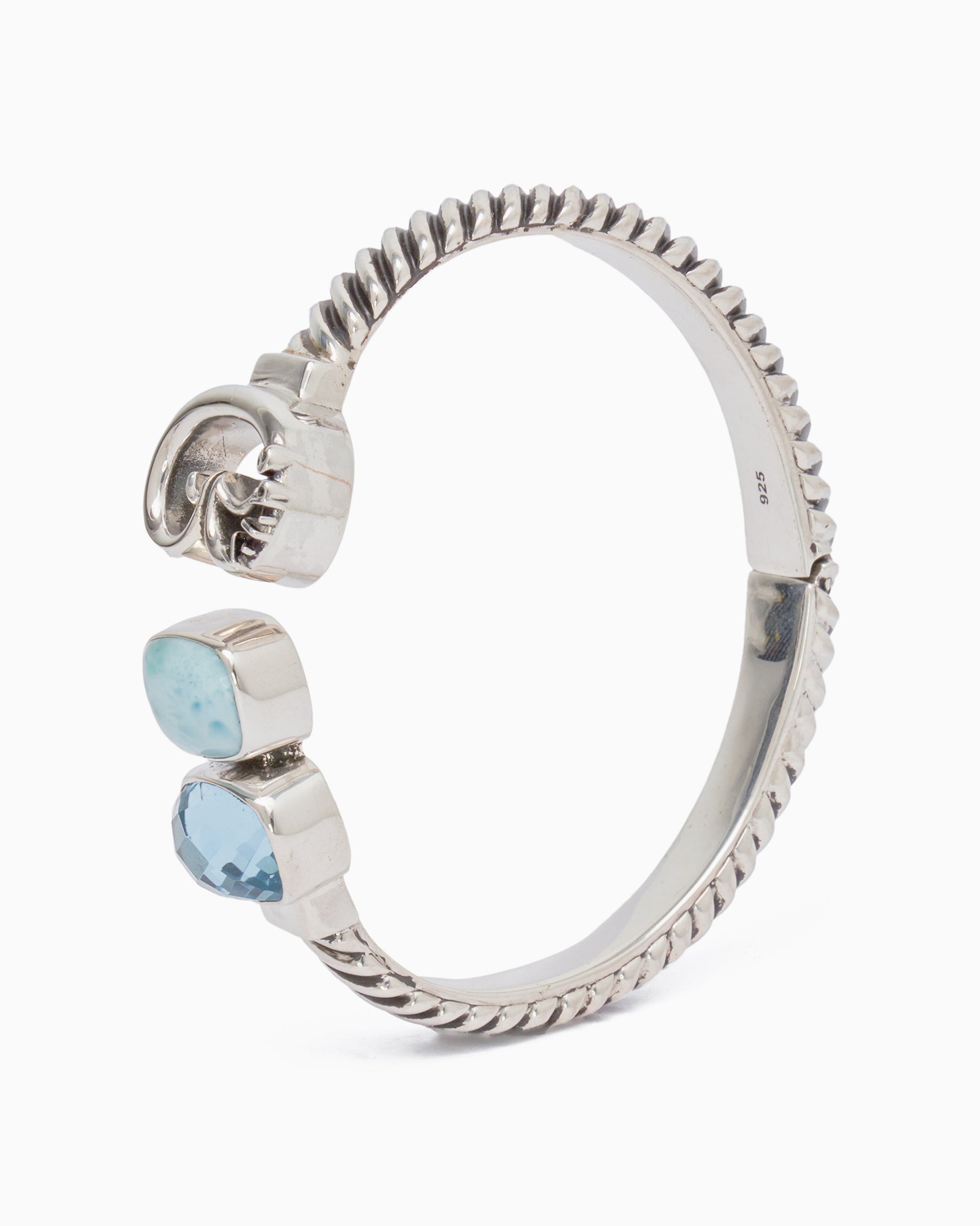 The Lagoon Double Stone Hinge Bracelet features a rope inspired band with a stone duo of sky blue topaz and larimar on one side and a statement petroglyph on the other. This statement piece dazzles on its own or can be worn stacked with a signature hook bracelet.