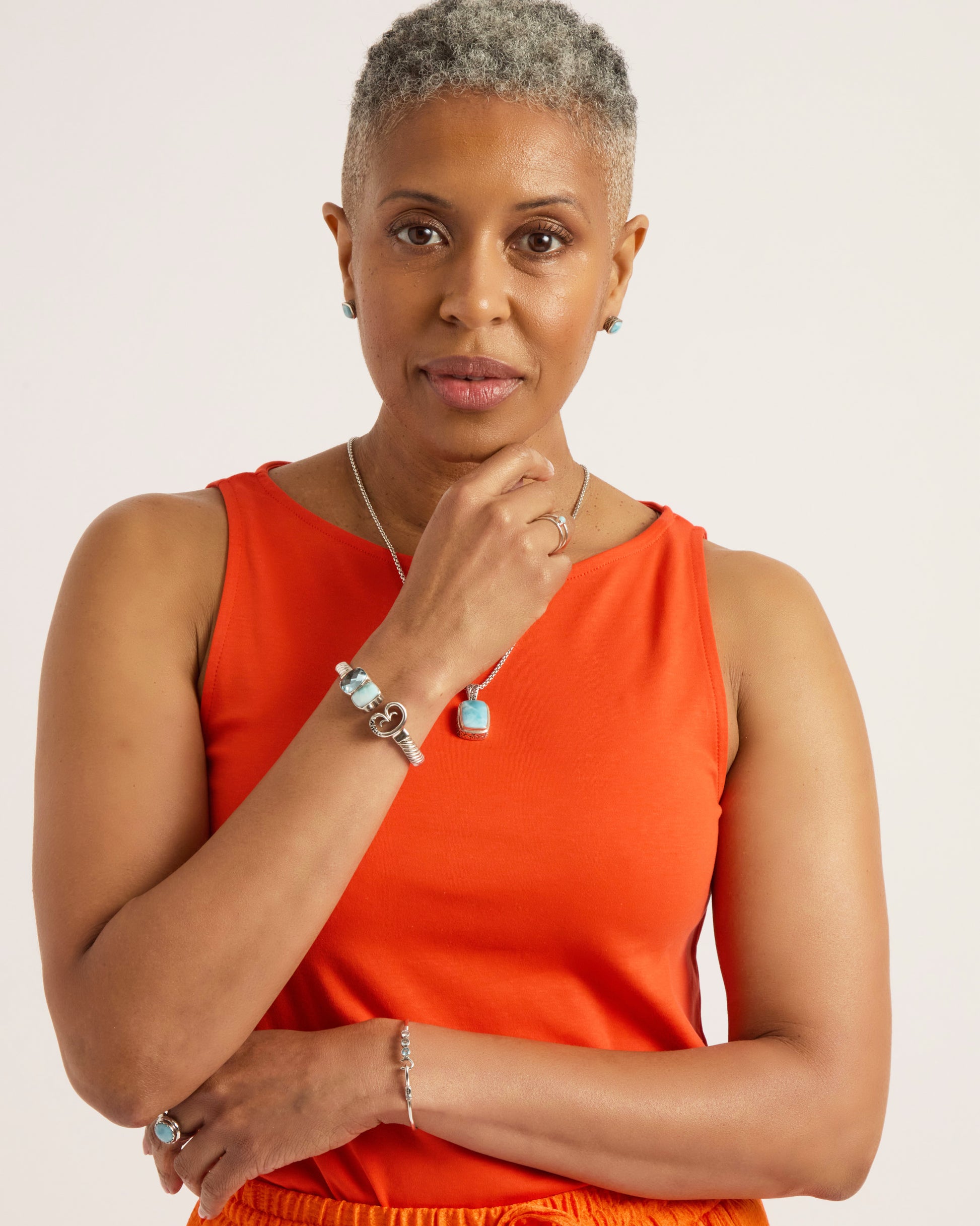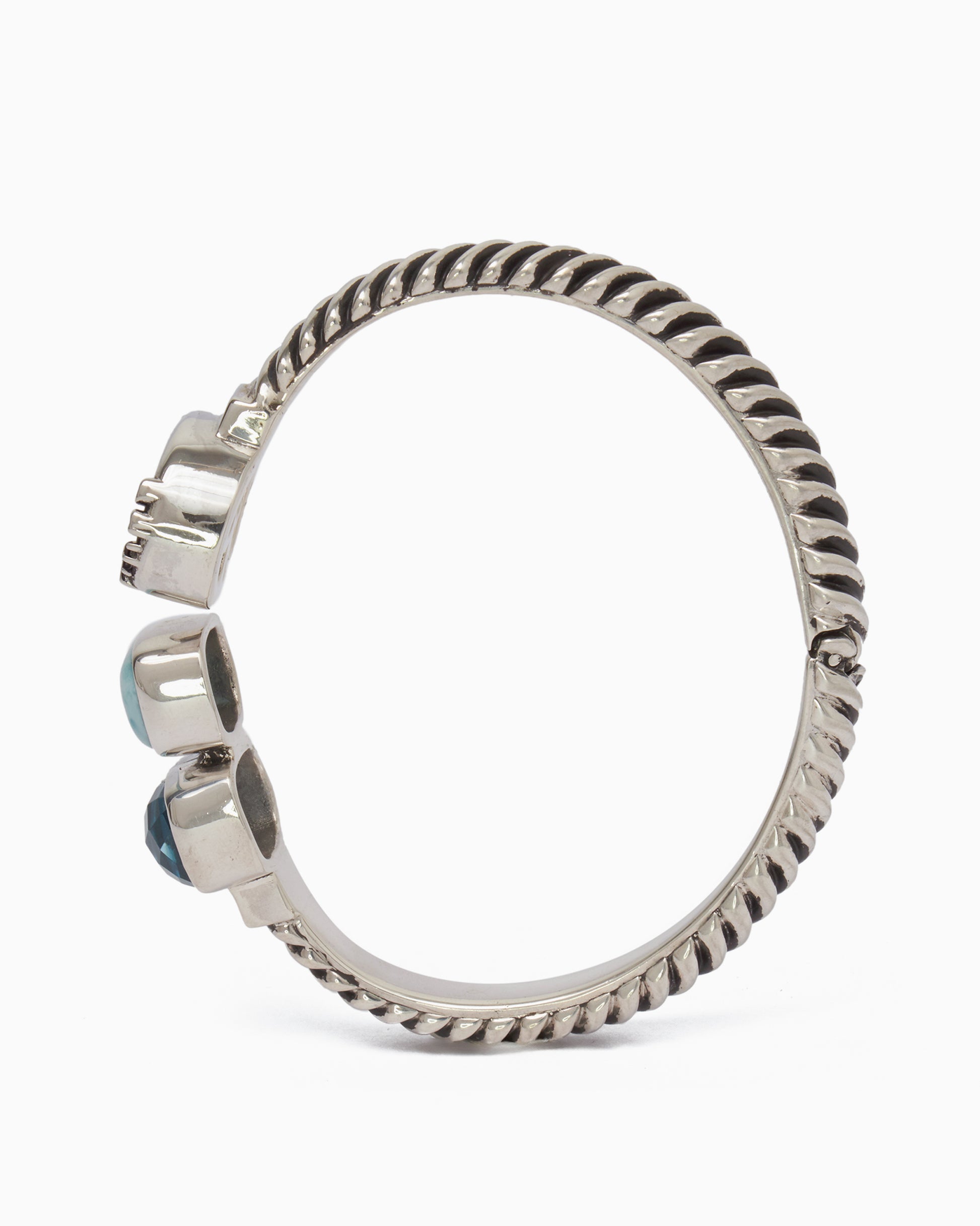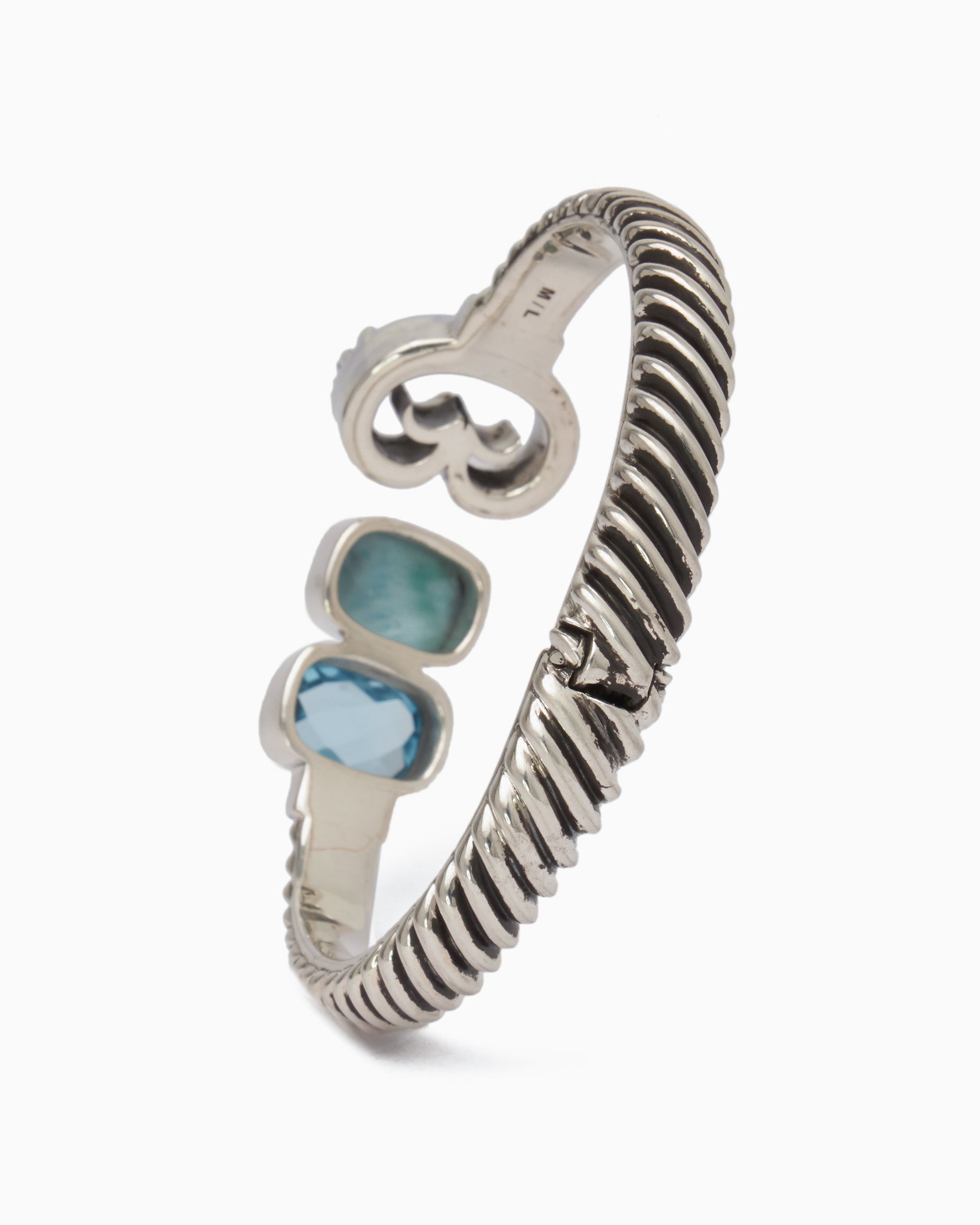 The Lagoon Double Stone Hinge Bracelet features a rope inspired band with a stone duo of sky blue topaz and larimar on one side and a statement petroglyph on the other. This statement piece dazzles on its own or can be worn stacked with a signature hook bracelet.