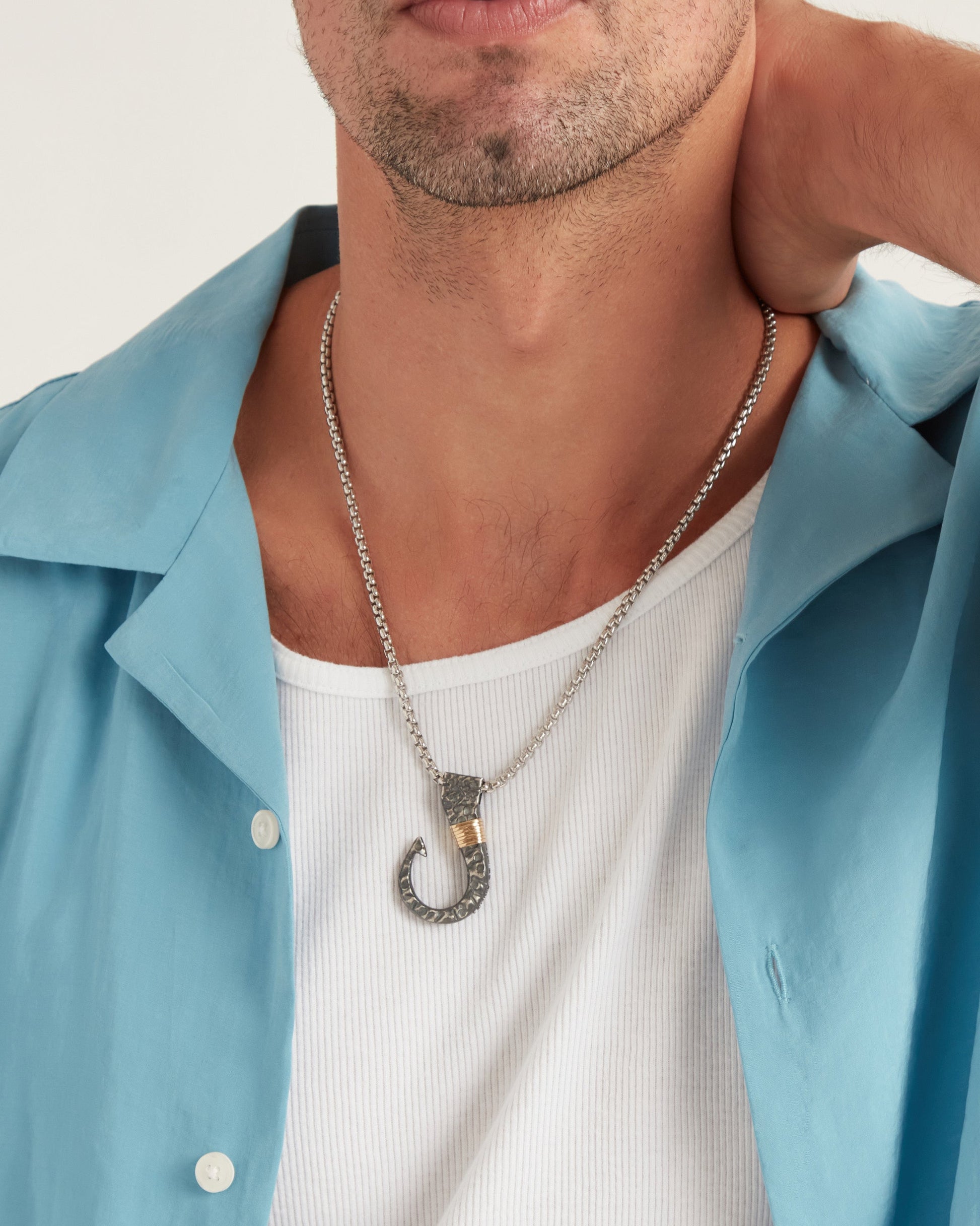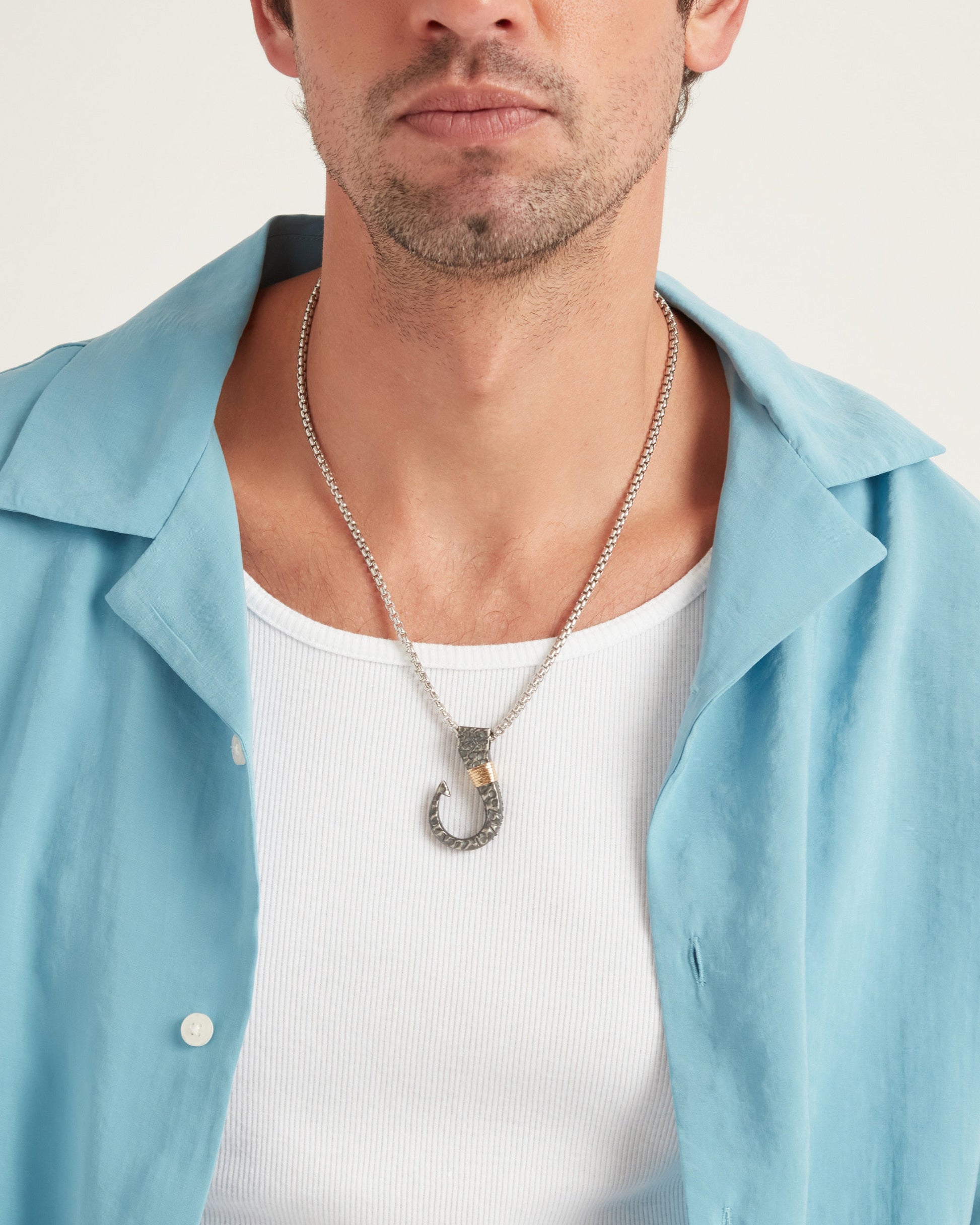 The Large Fish Hook Pendant is handcrafted from oxidized sterling silver, accented by seven 14K solid gold good luck wraps that represent love, laughter, happiness, good fortune, health, unity, and peace. A tribute to the nautical island life, this pendant features the coordinates of St. John on the side, adding a meaningful touch to its design. With our oxidized finishes, no two are alike! Each original piece is handcrafted by Vibe artisans and markings and shades will vary. Pair with your favorite chain, sold separately.