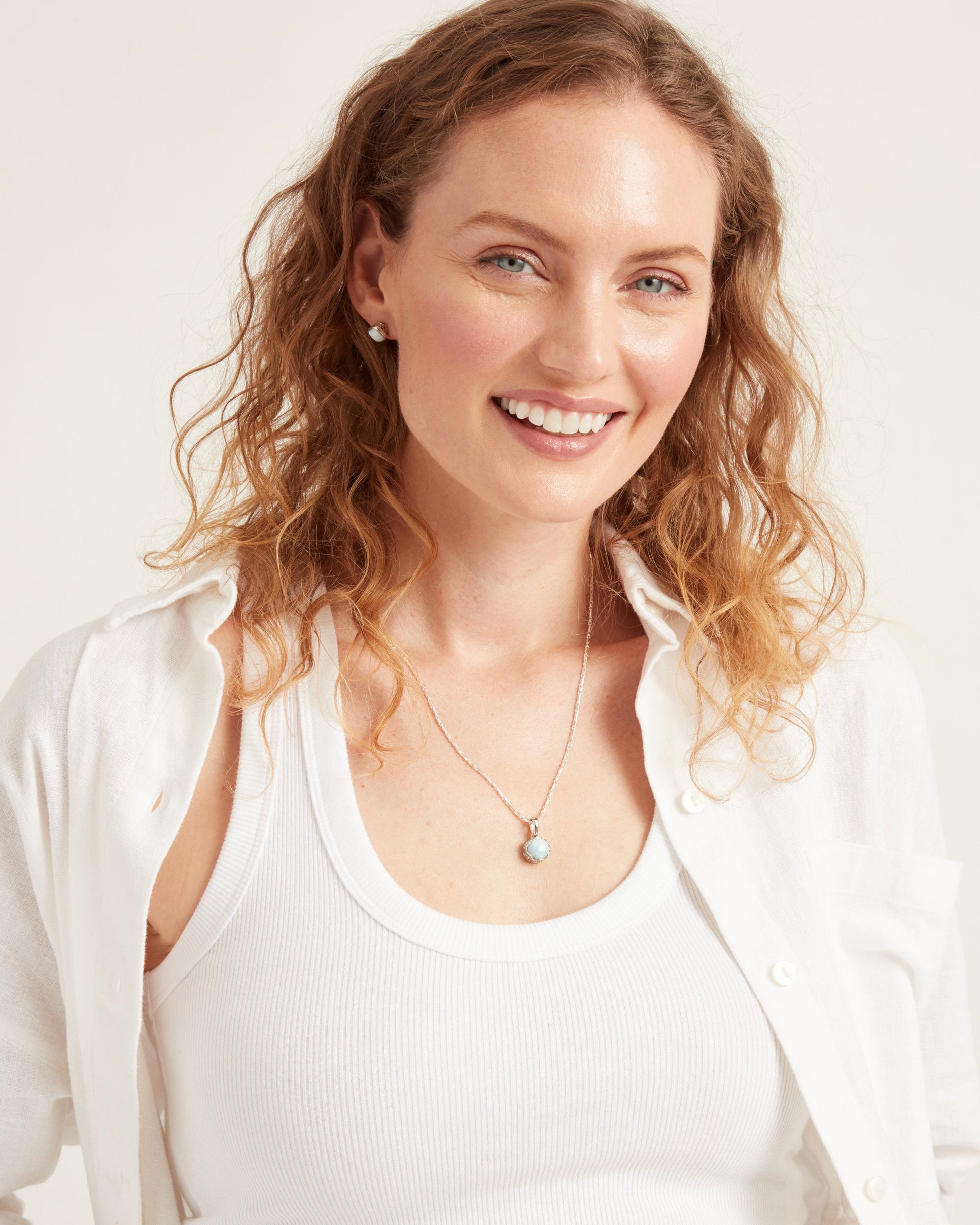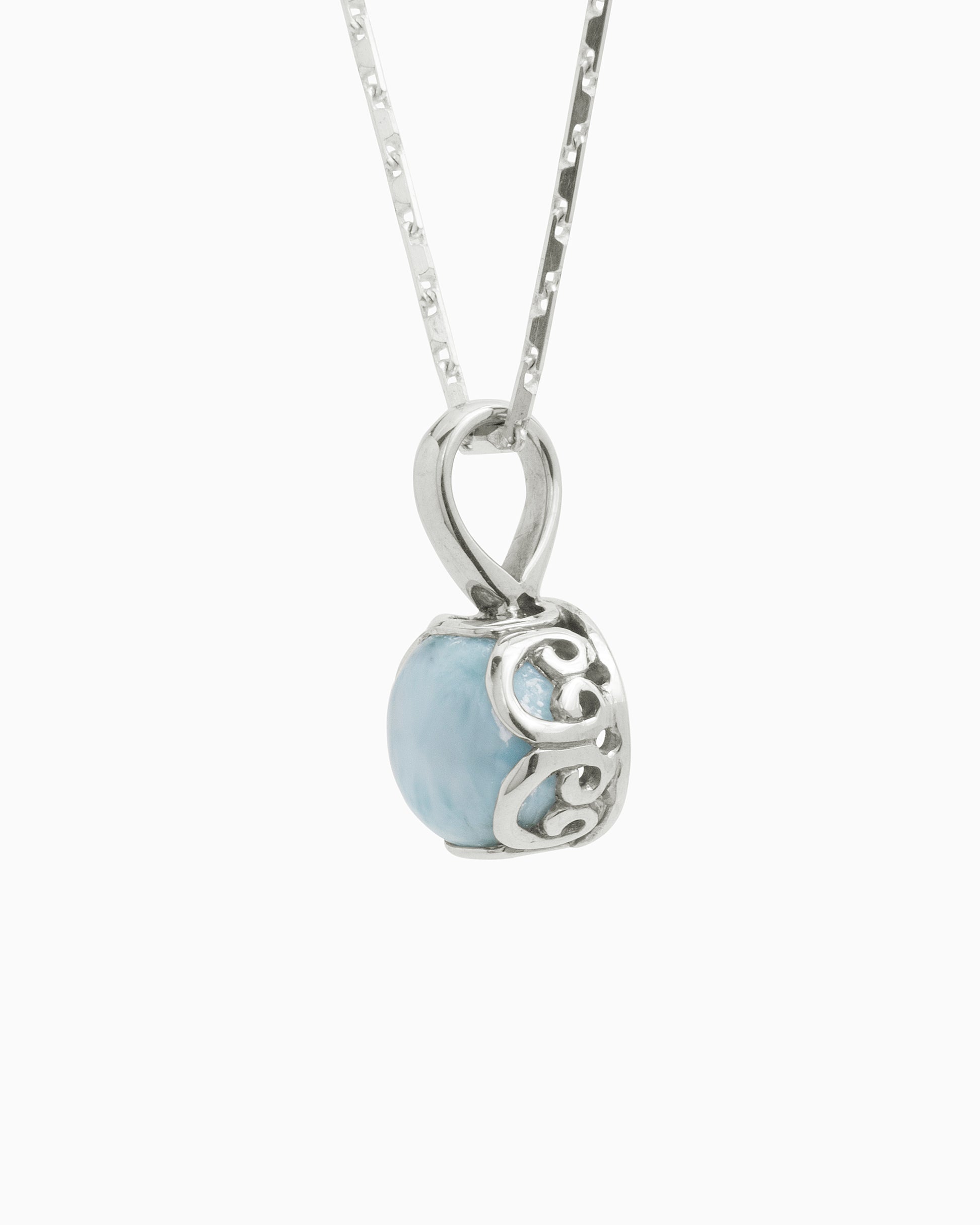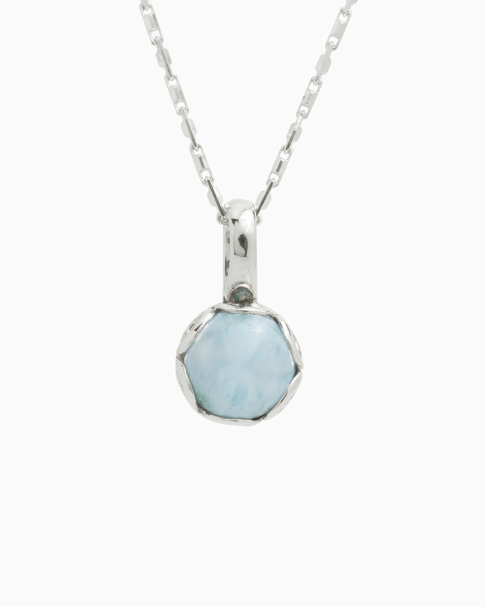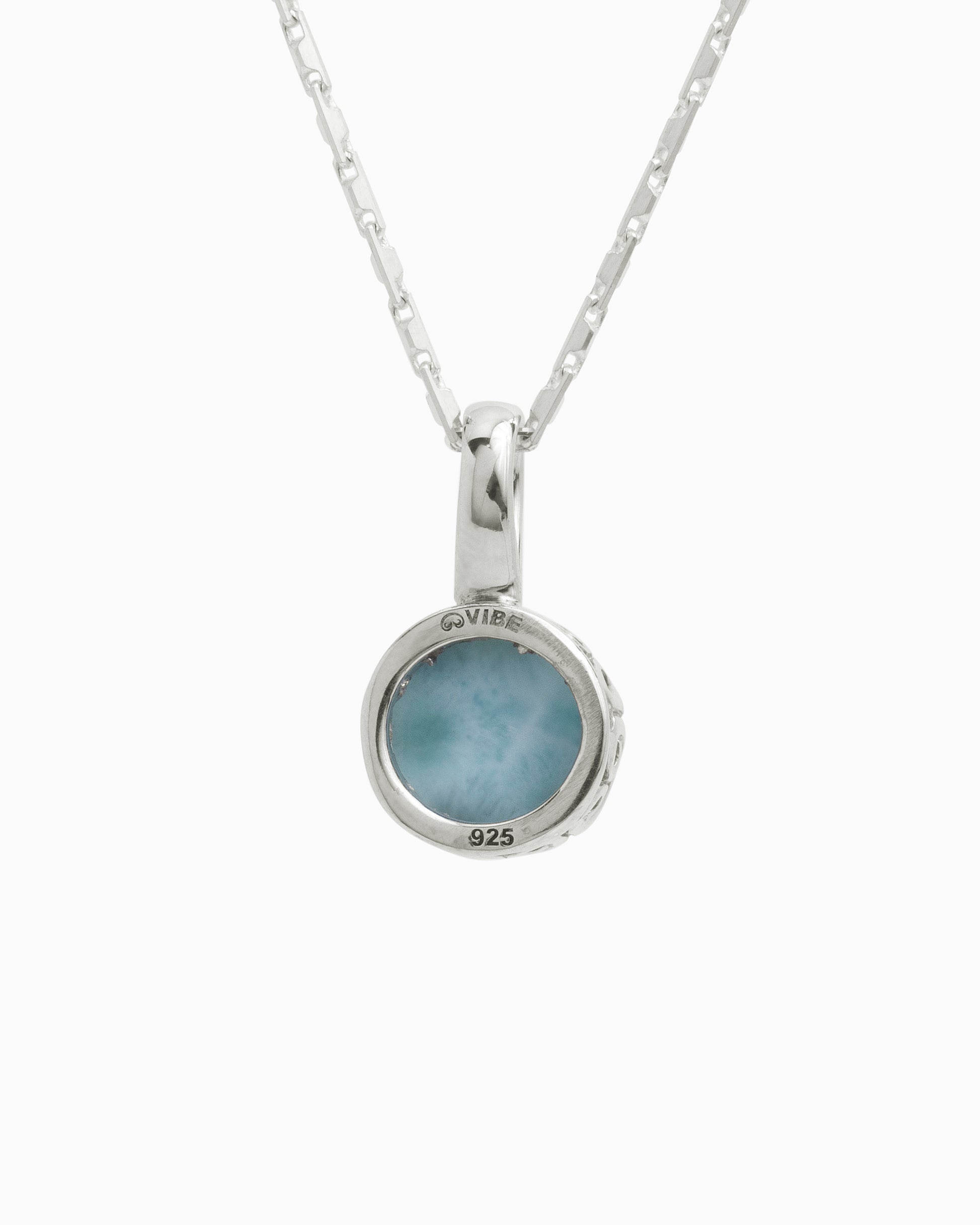 Crafted in sterling silver, the Large Princess Petroglyph Stone Pendant is a stunning statement piece that features a larimar cabochon encircled by intricate petroglyphs. Its unique design adds a touch of elegance to any outfit and matches wonderfully with our Princess Petroglyph Stone Studs. Pair with your favorite chain, sold separately.