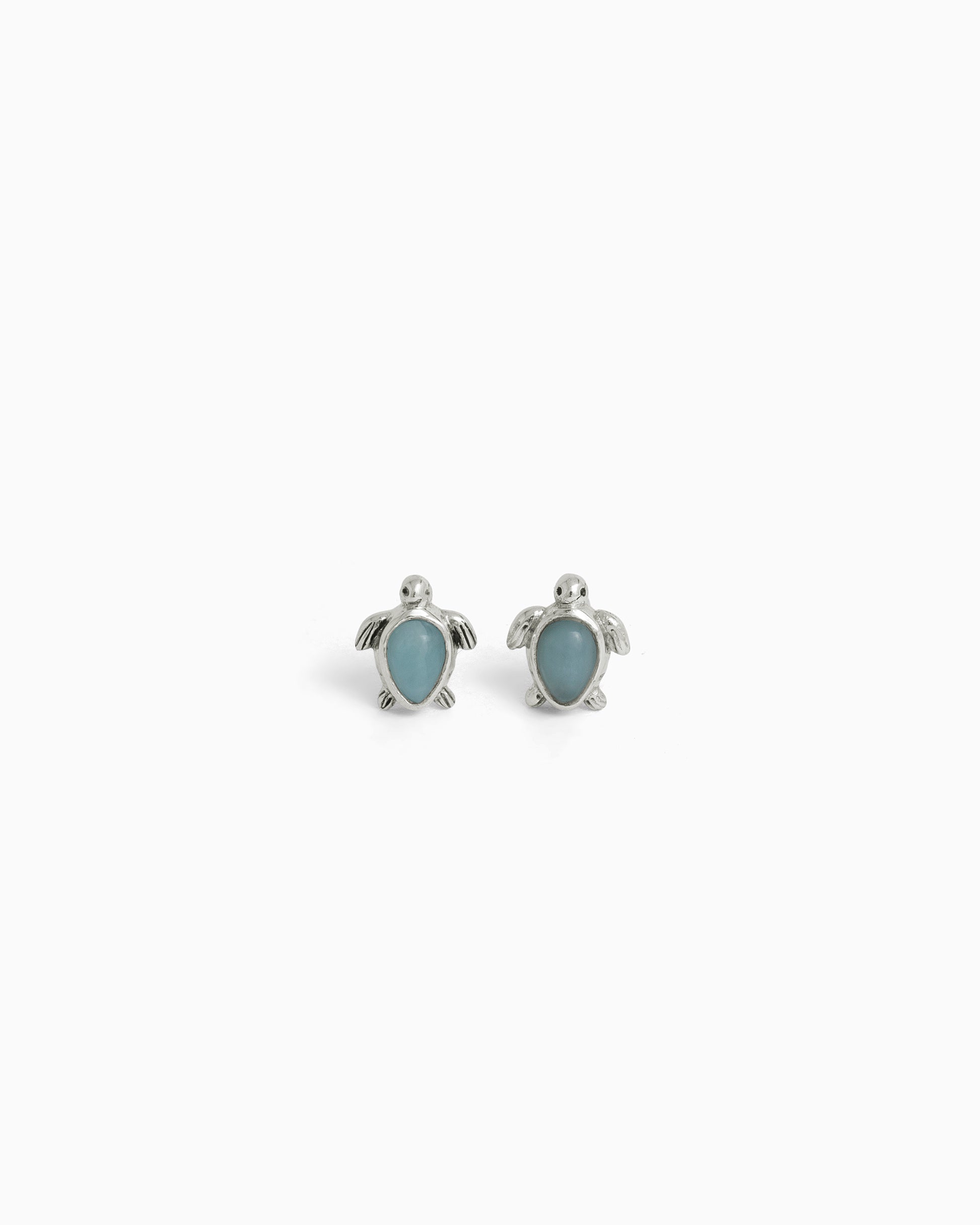 The Larimar Sea Turtle Studs are handcrafted sterling silver turtle earrings with a larimar cabochon shell. These everyday earrings are great for those who love our friends in the sea and are the perfect reminder of fun times on St. John.