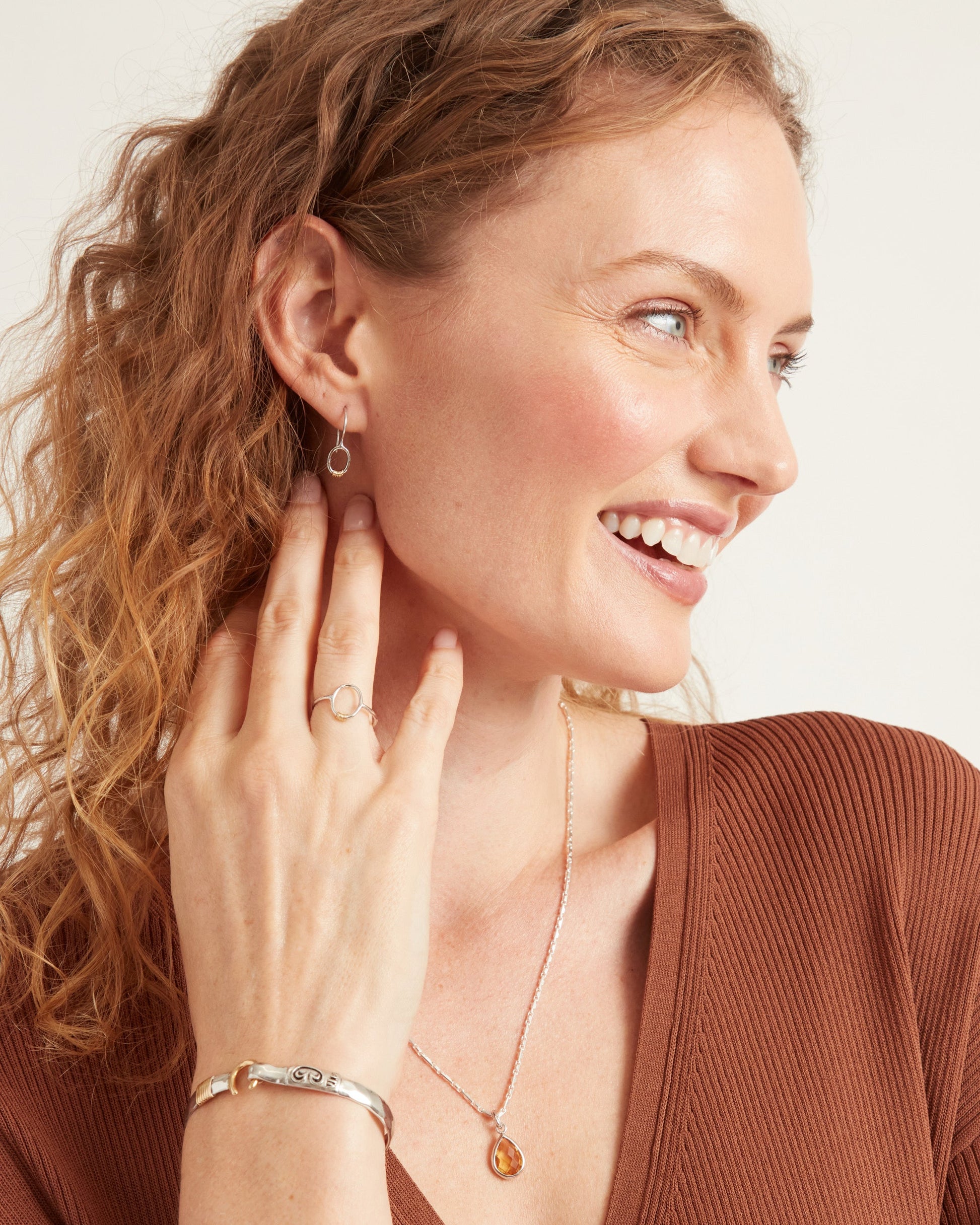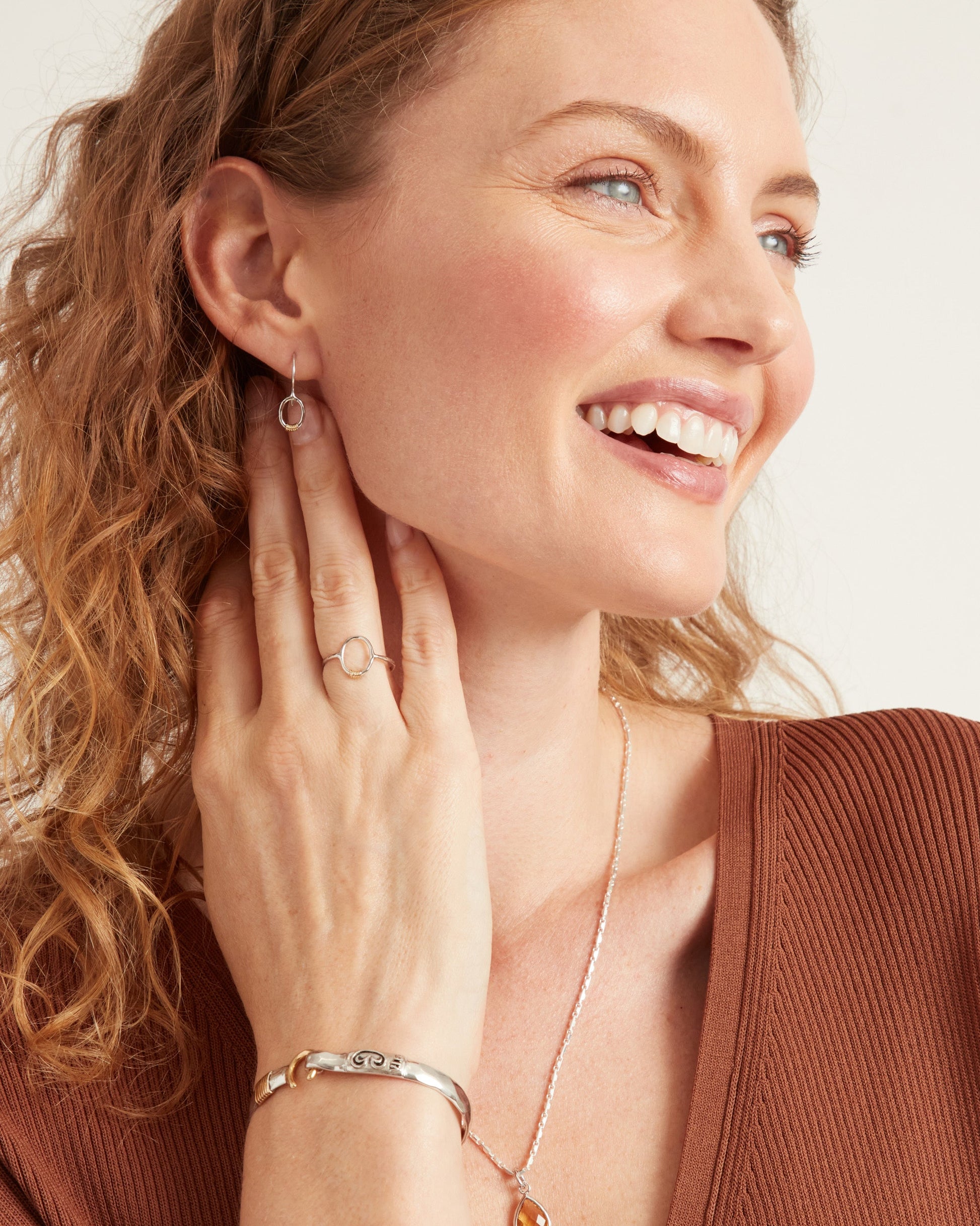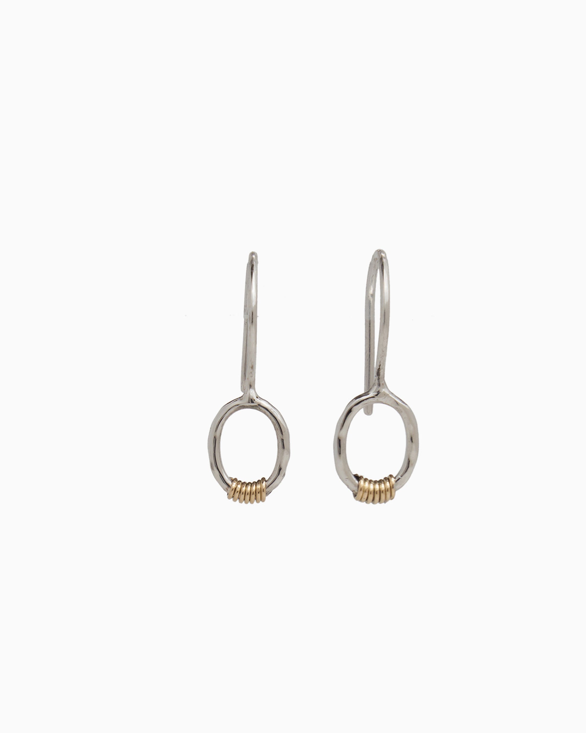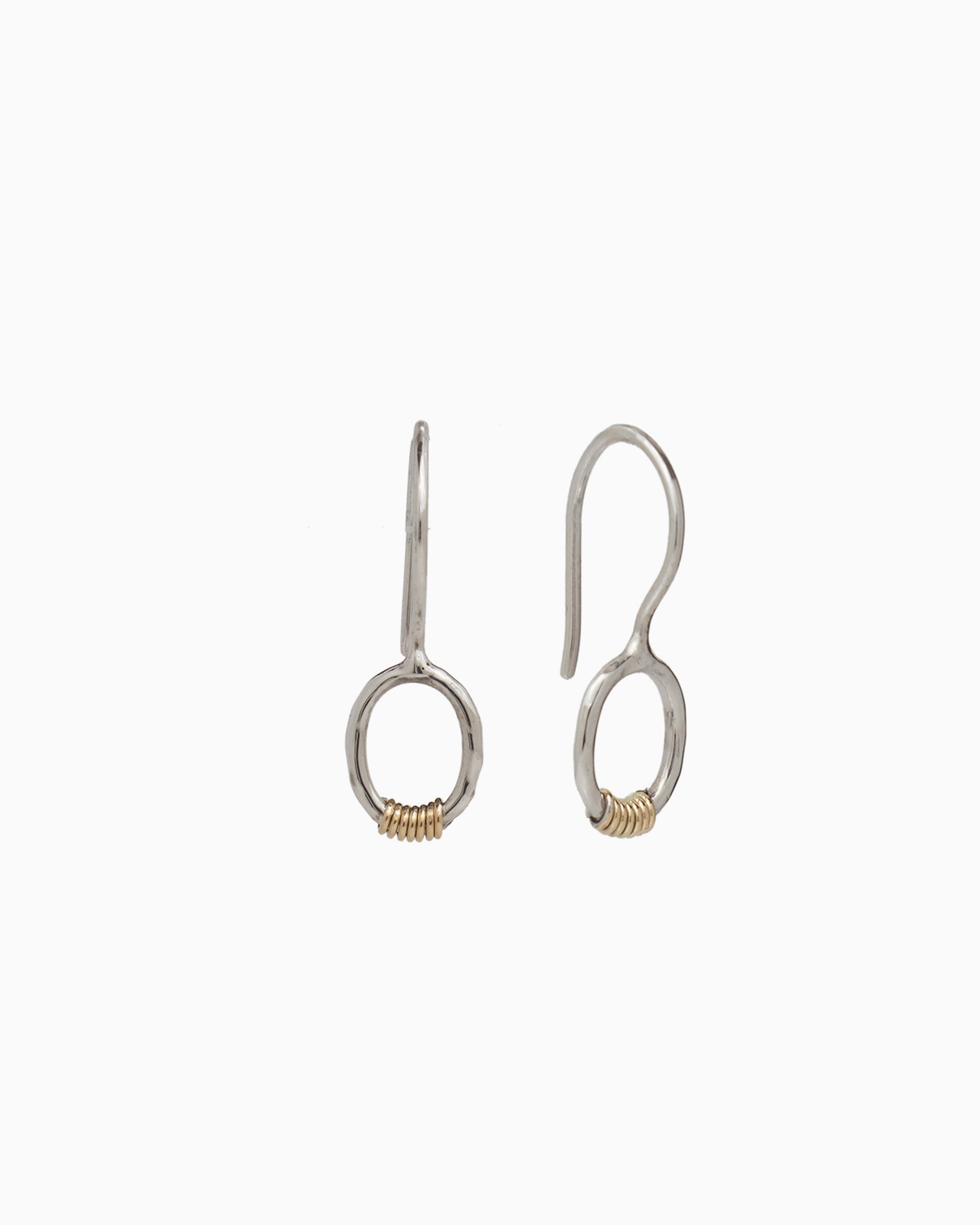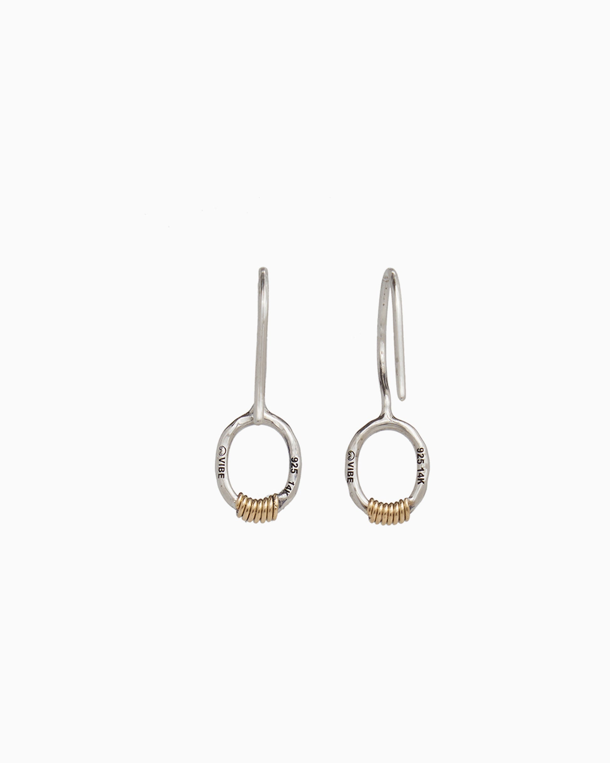 Vibe's delicate Lucky Loop Drop Earrings perfectly encompass good vibes with seven 14K gold wraps of good luck encircling an infinite oval handcrafted from gently hammered sterling silver. Found in many of our designs, Vibe’s 7 wraps represent love, laughter, happiness, good fortune, health, unity, and peace. Pair with other styles in the Lucky Loop Collection for a cohesive look.