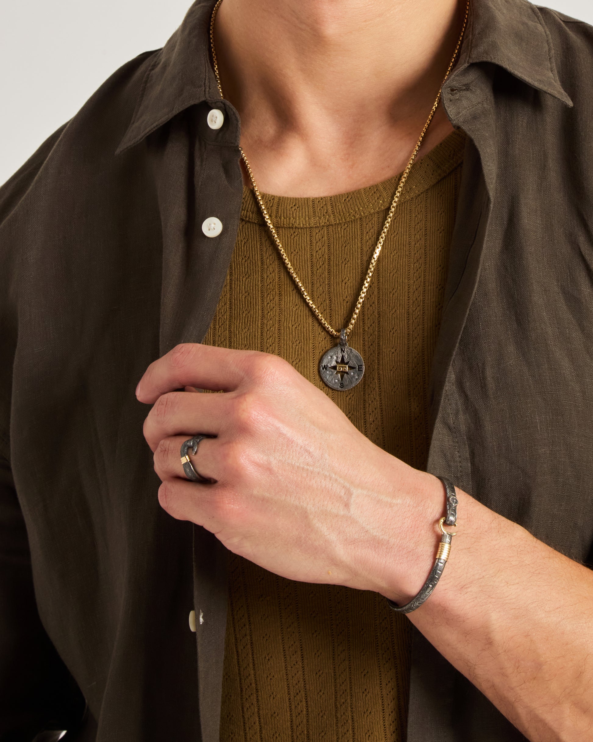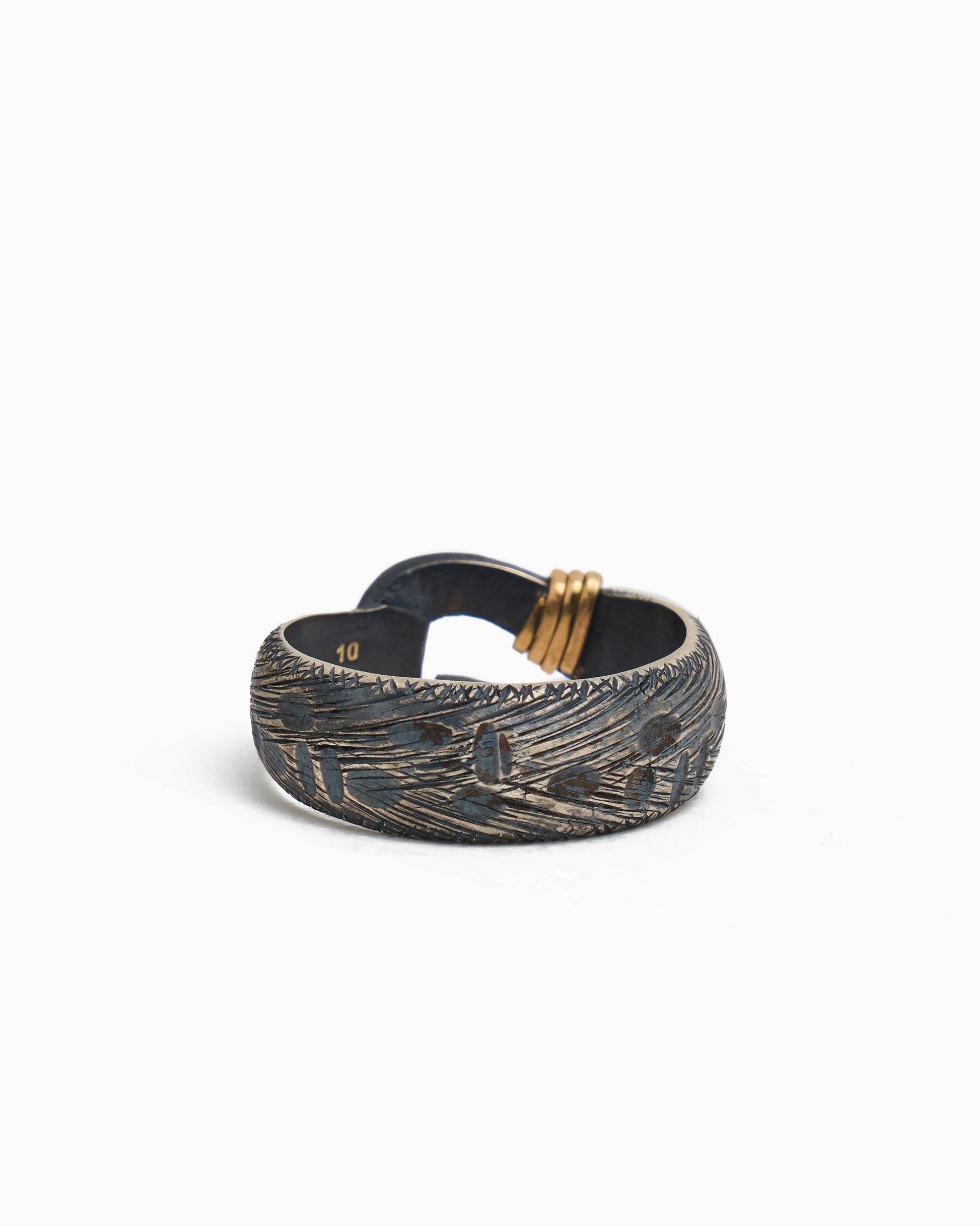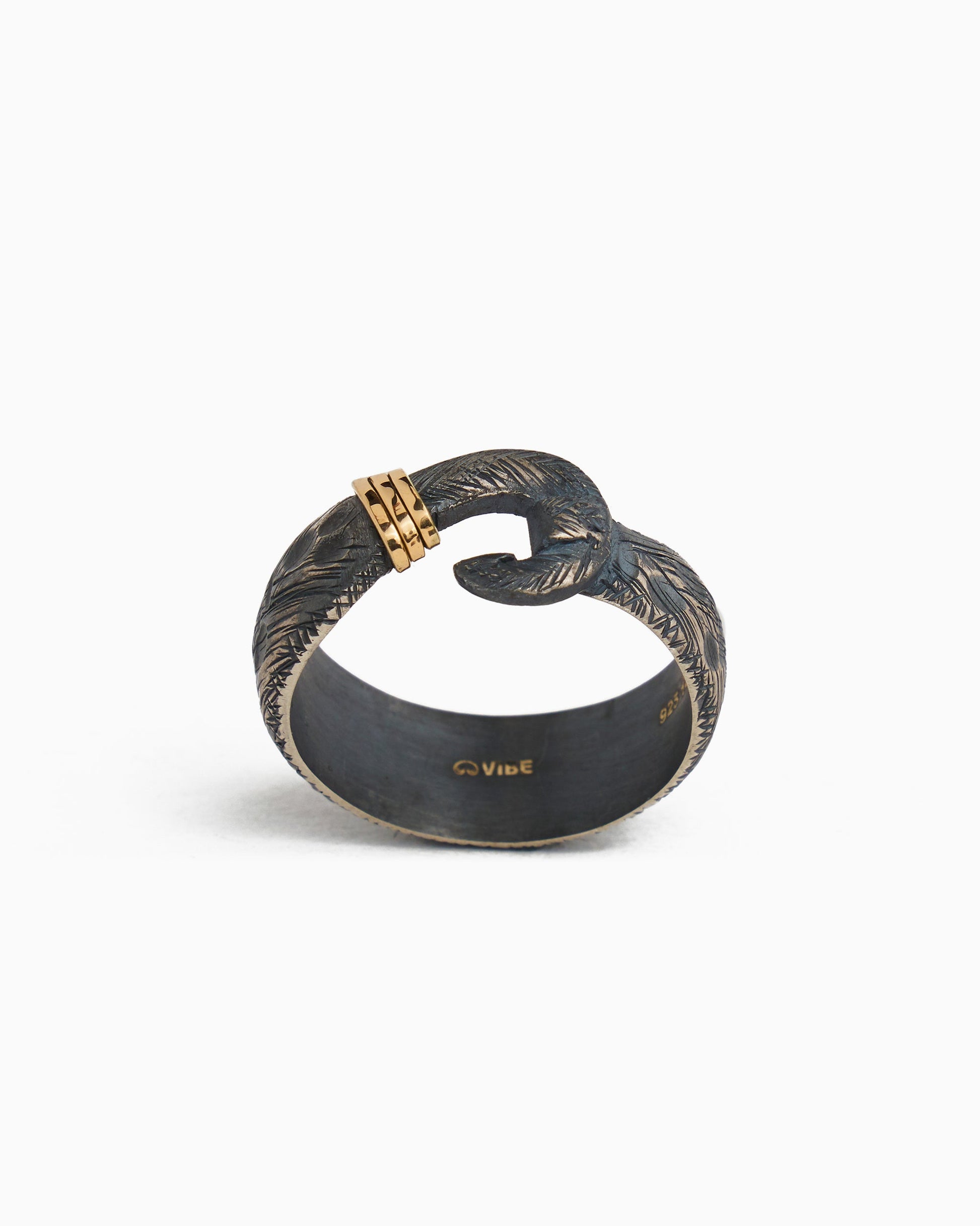 The Marine Texture Angler Hook Ring is fashioned in oxidized sterling silver and features a fish hook adorned with three 14K gold good luck wraps. This ring embodies the spirit of the sea and showcases our signature marine texture, inspired by the ocean and featuring cross hatching and distressed details throughout. With our oxidized finishes, no two are alike. Each original piece is handcrafted by Vibe artisans and markings and shades will vary.