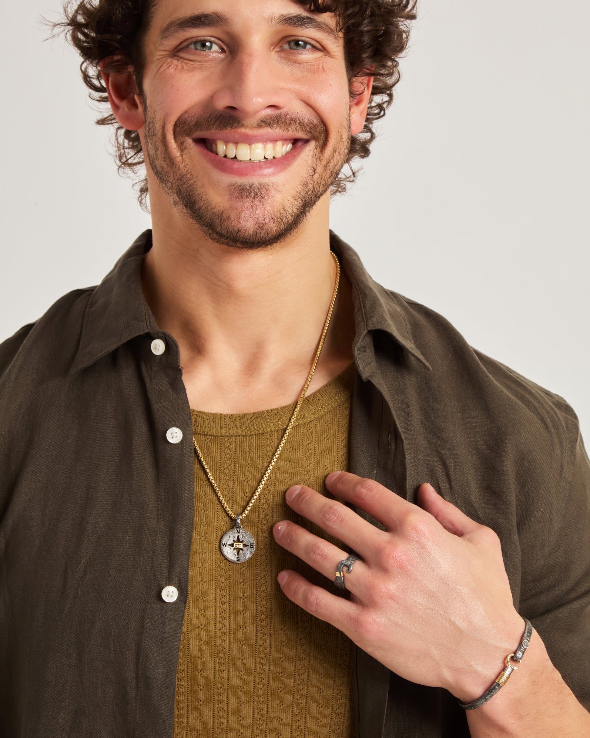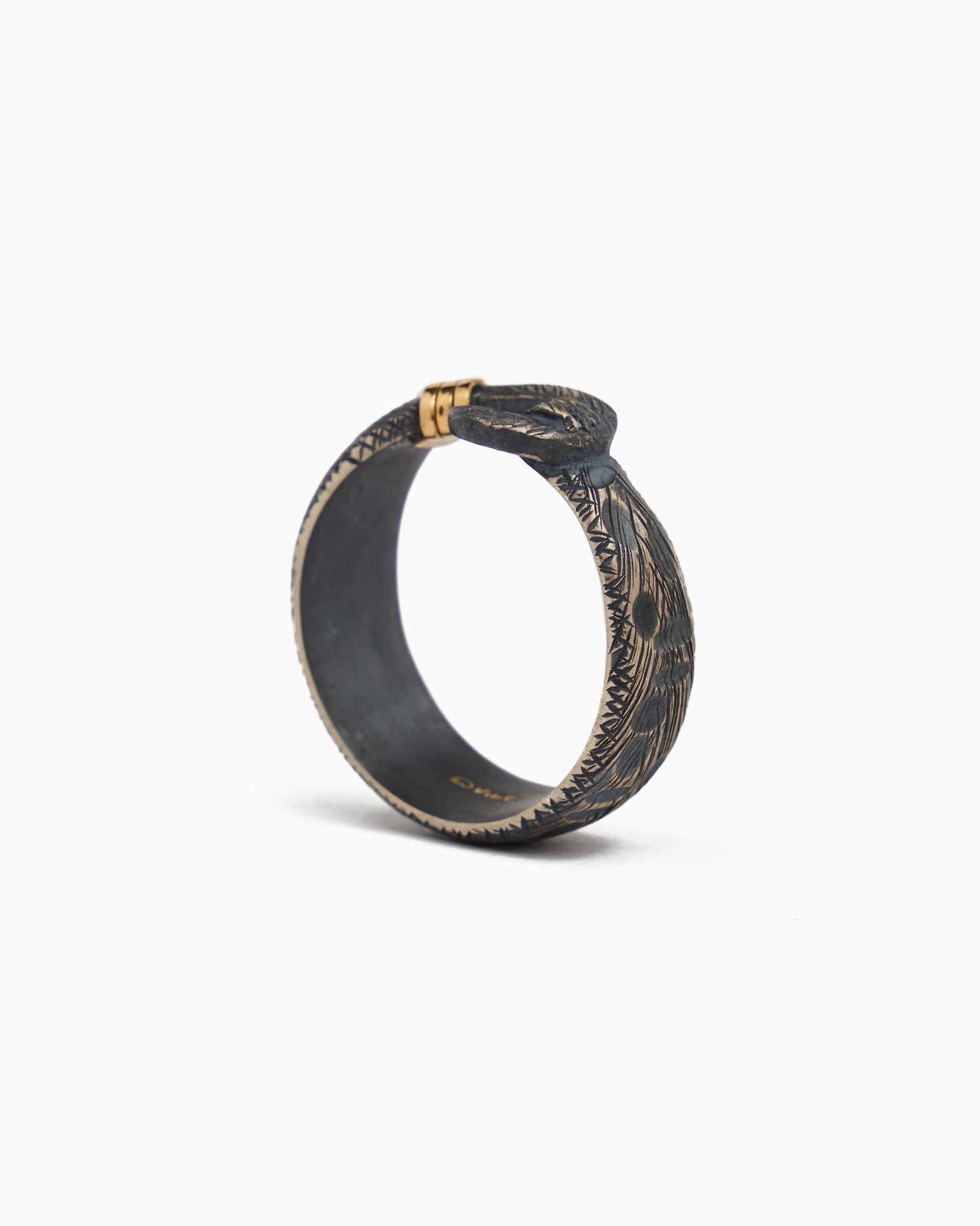 - Metal: Oxidized sterling silver with 14K gold wraps