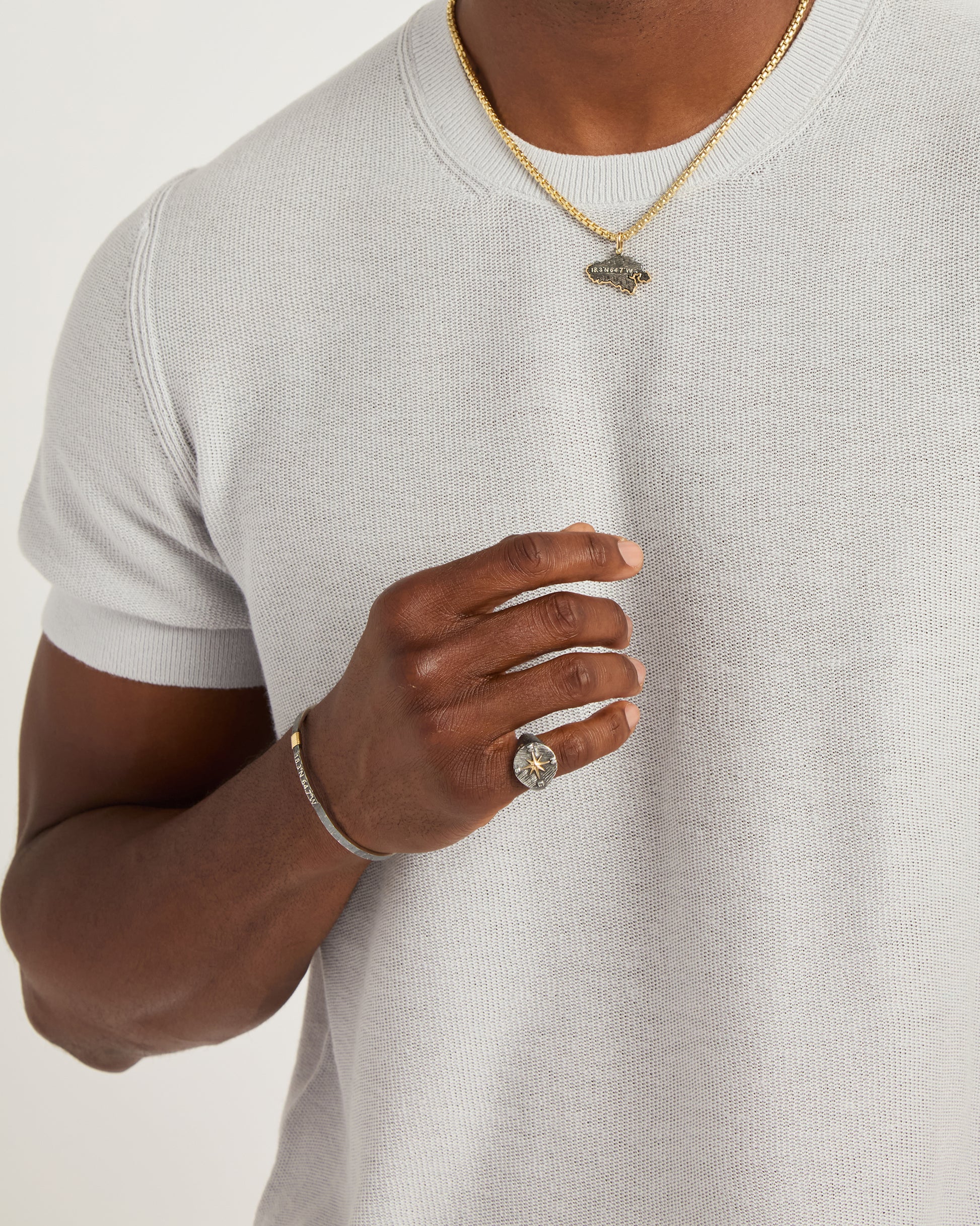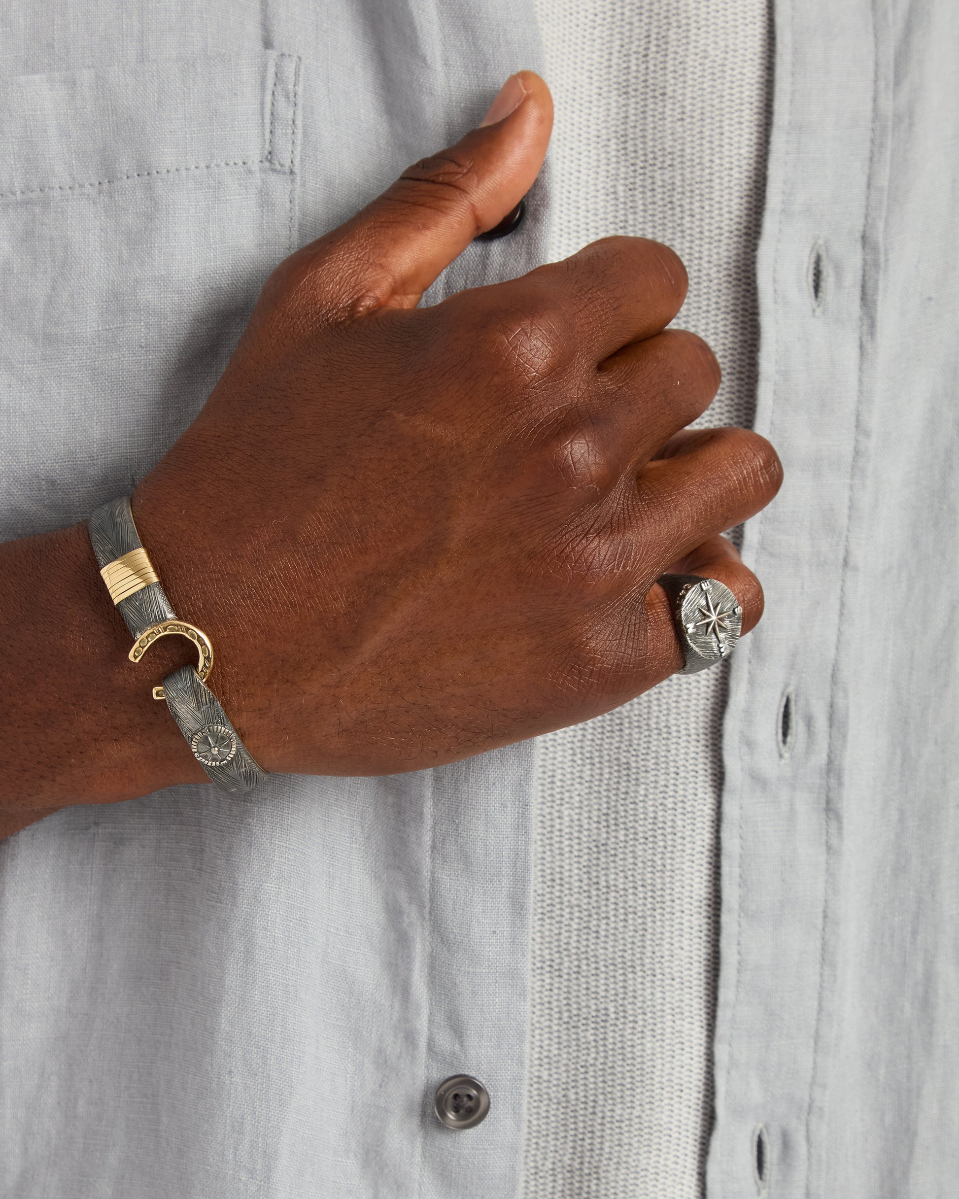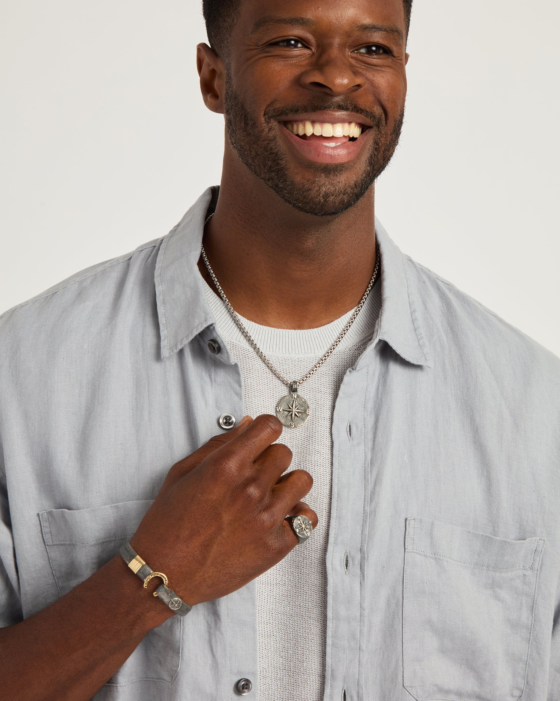 Channel your inner adventurer with the Compass Ring, a tribute to the spirit of the sea. Its unique compass face and marine-inspired texture, crafted with intricate cross-hatching and distressed details, make every piece as one-of-a-kind as the tides. Engraved with St. John’s coordinates on the side, it carries a piece of the island’s guiding spirit wherever you go. Handcrafted by Vibe artisans, the oxidized finish ensures no two rings are alike, each telling its own story.