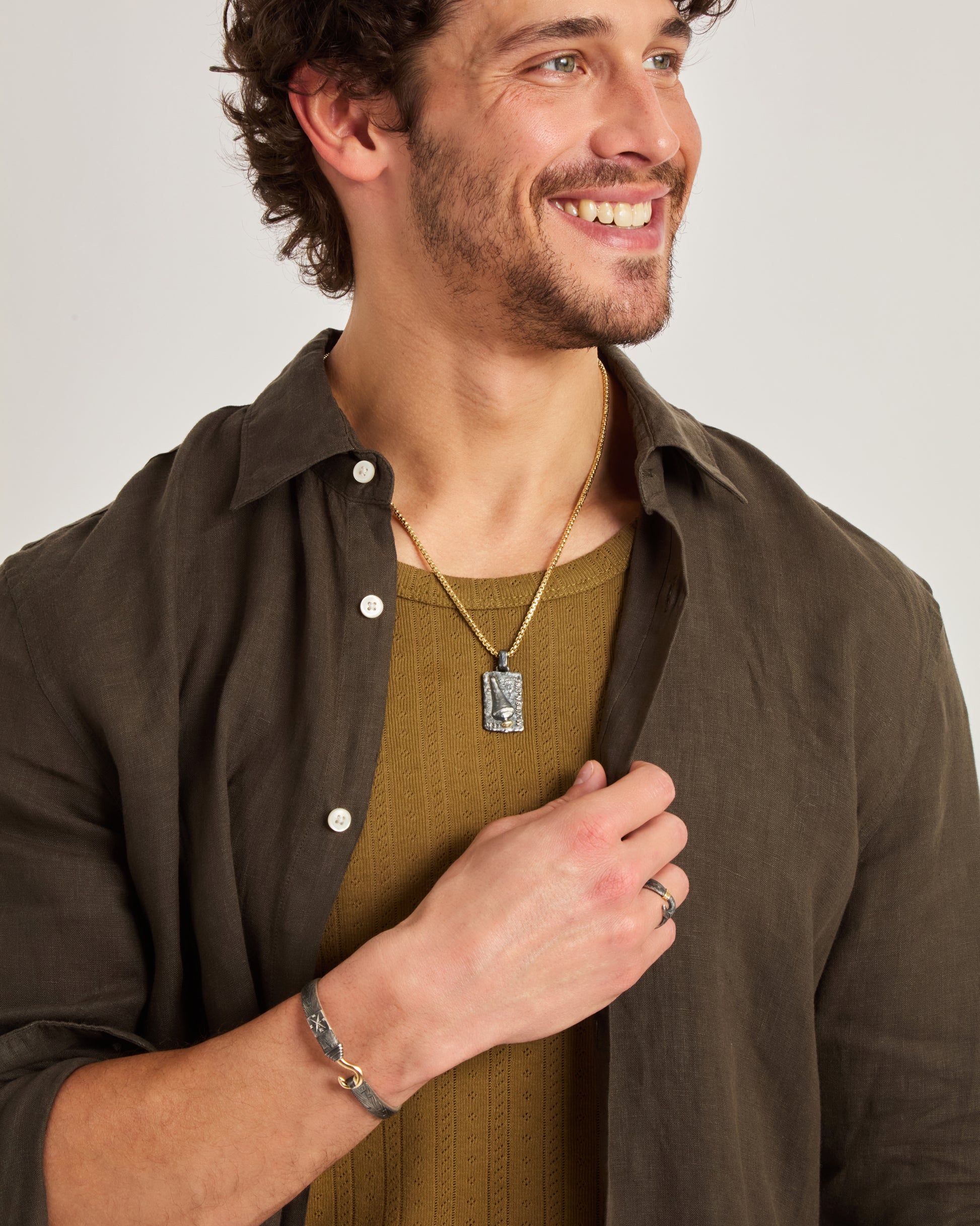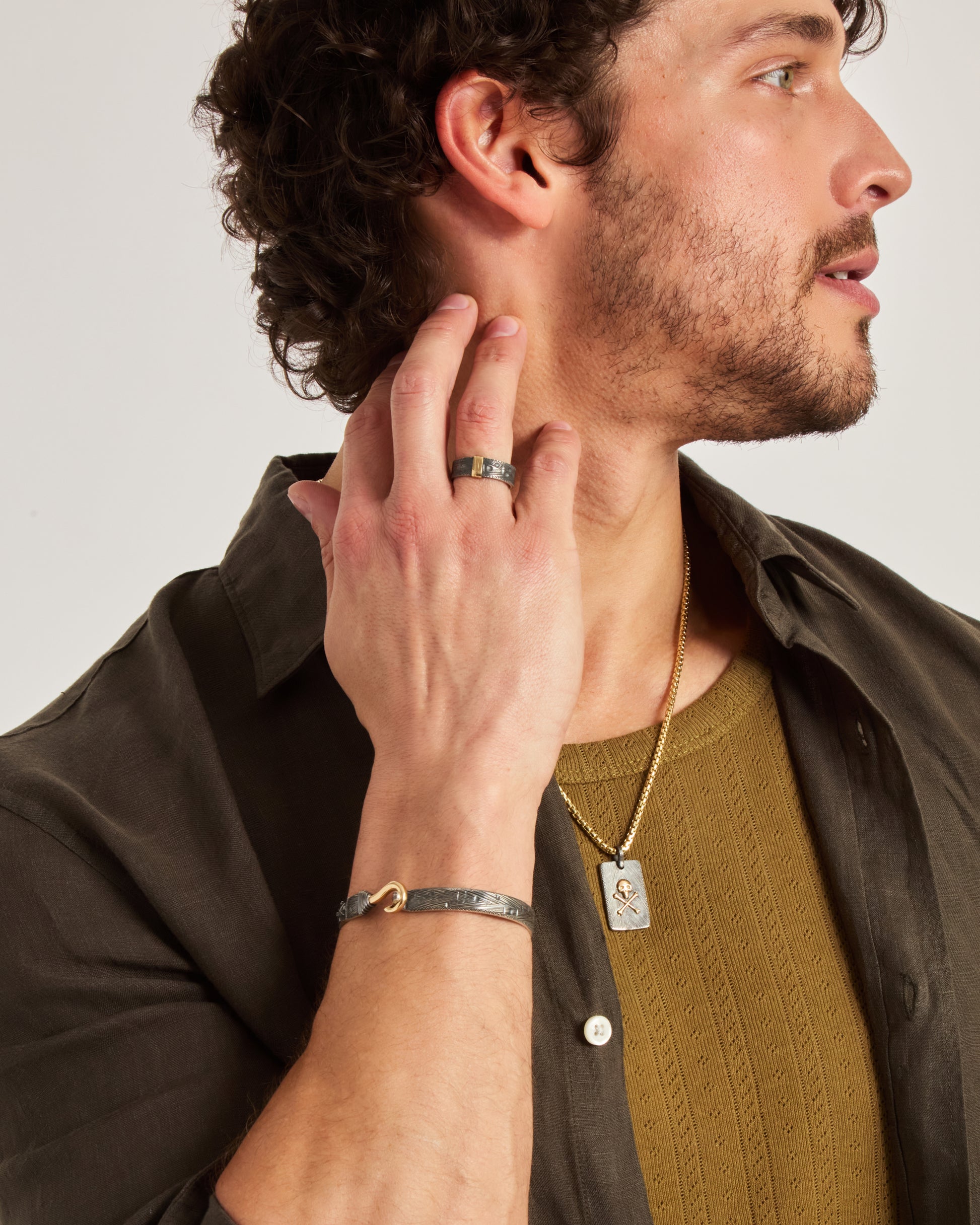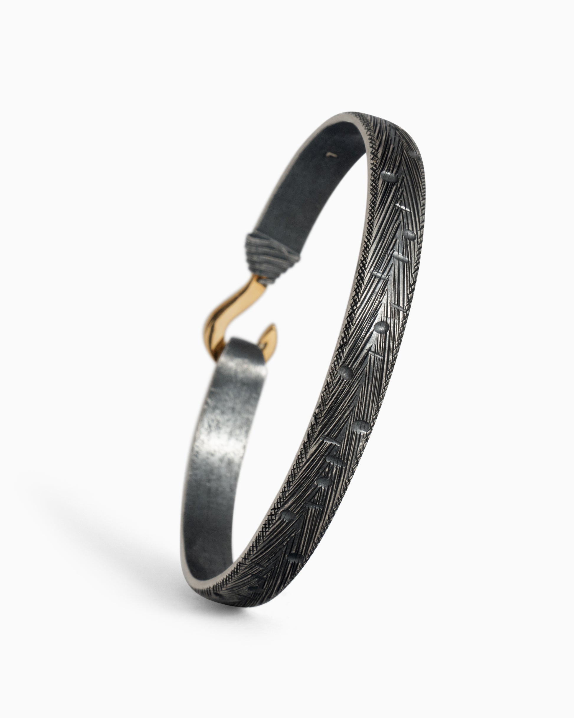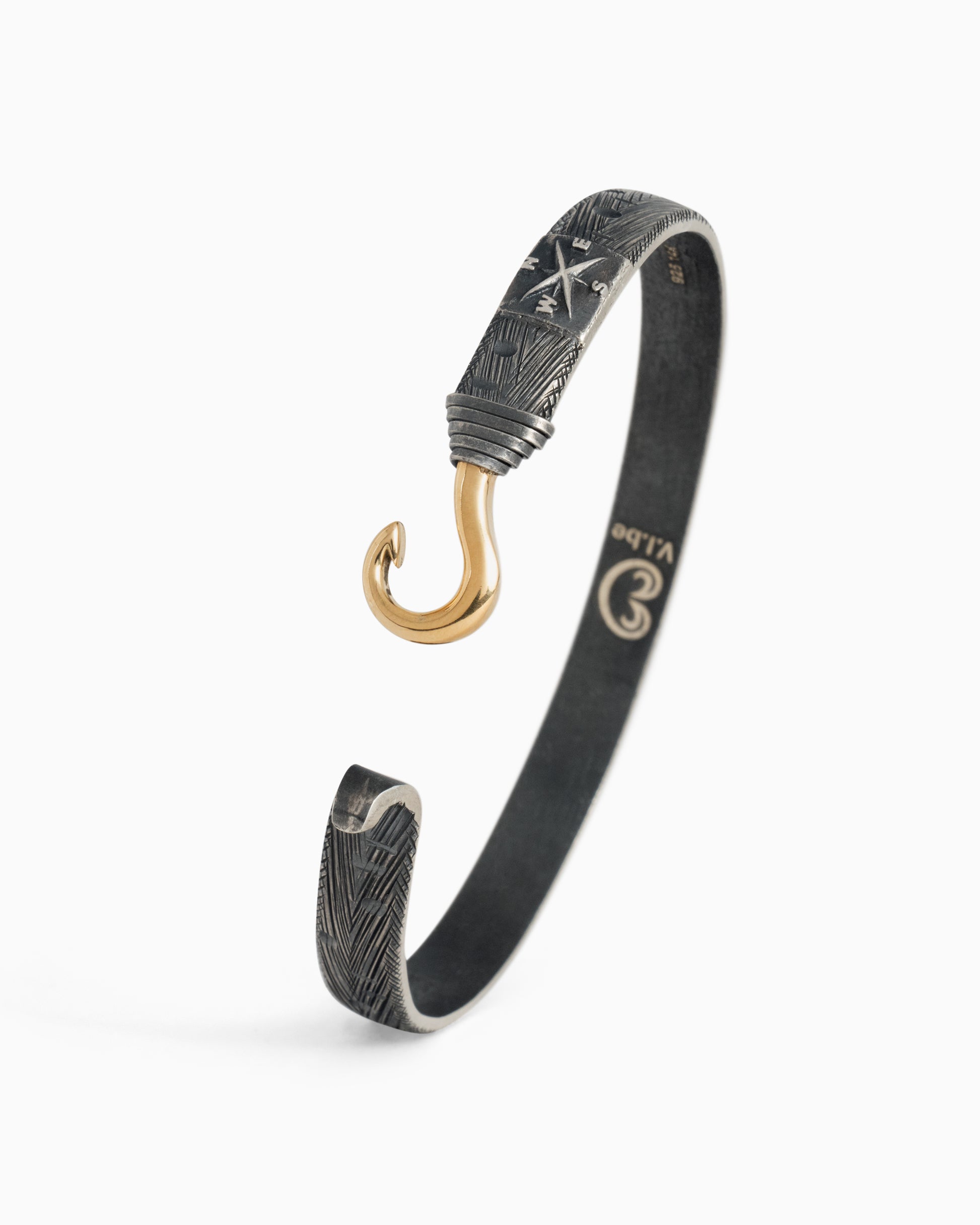 The Marine Texture Fish Hook Bracelet is handcrafted in oxidized sterling silver with a 14K solid gold fish hook clasp. The band features our signature marine texture, with cross-hatching and distressed details inspired by the ocean. A compass motif is worked into the band, adding nautical charm and a sense of direction. With our oxidized finishes, no two are alike—each piece is uniquely marked and handcrafted by Vibe artisans.