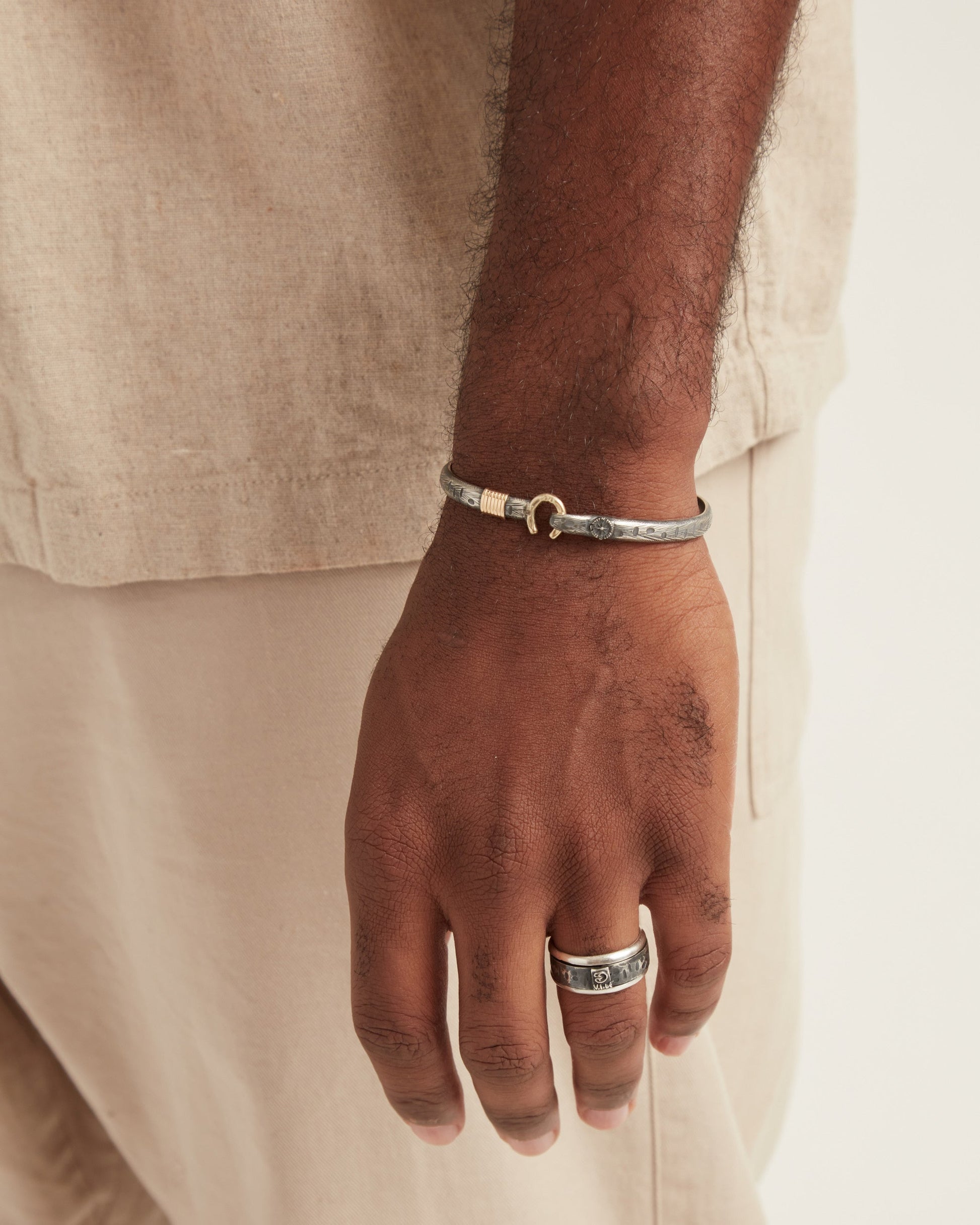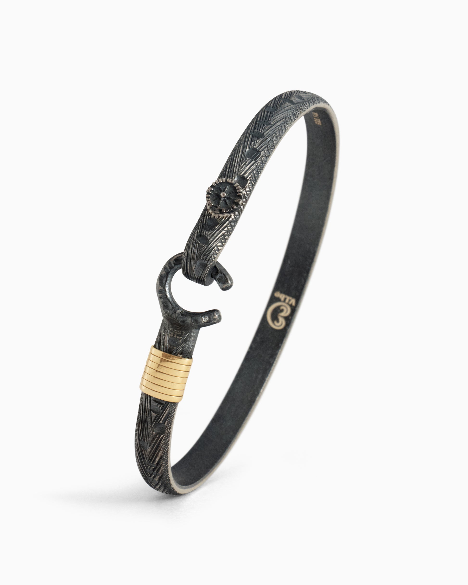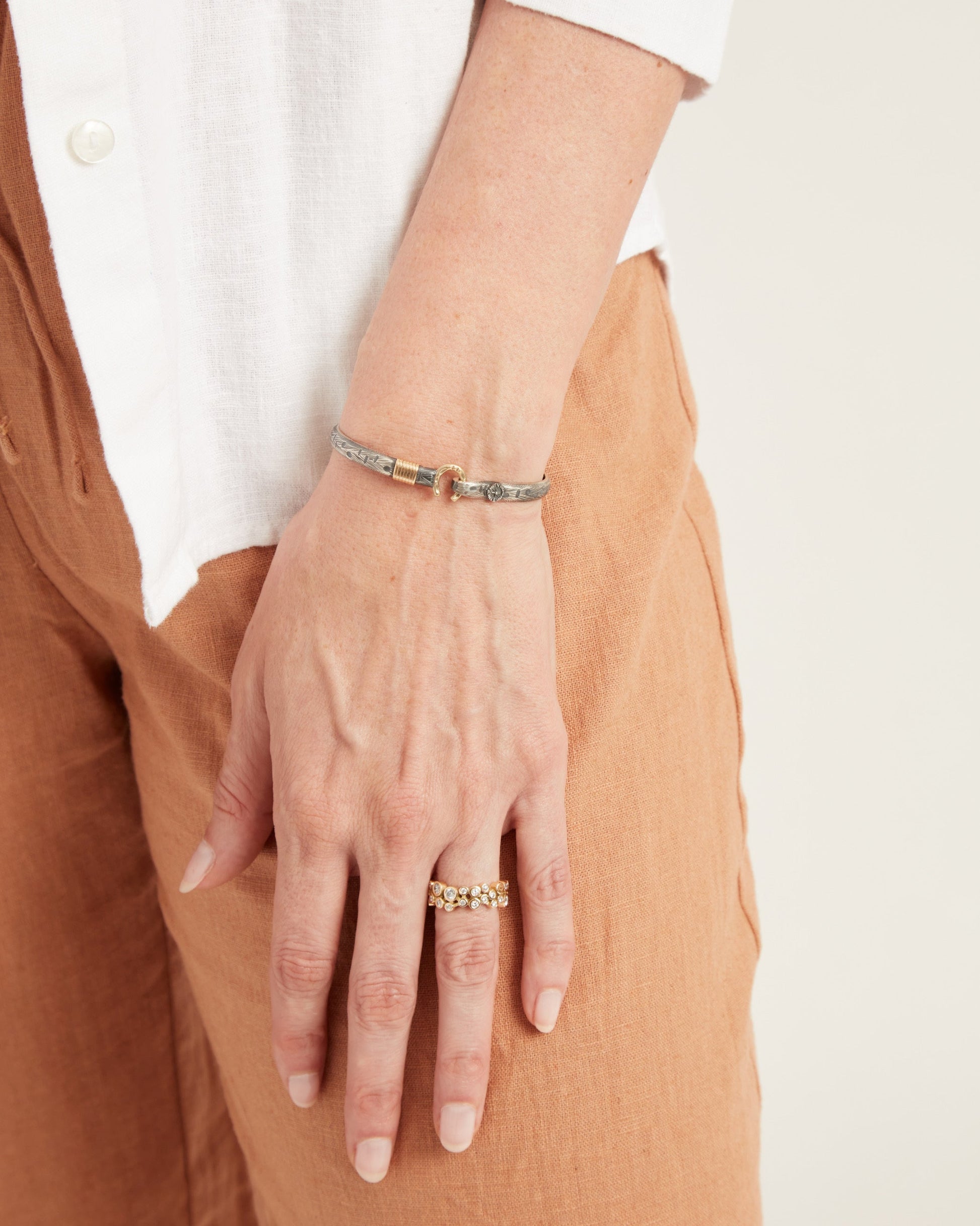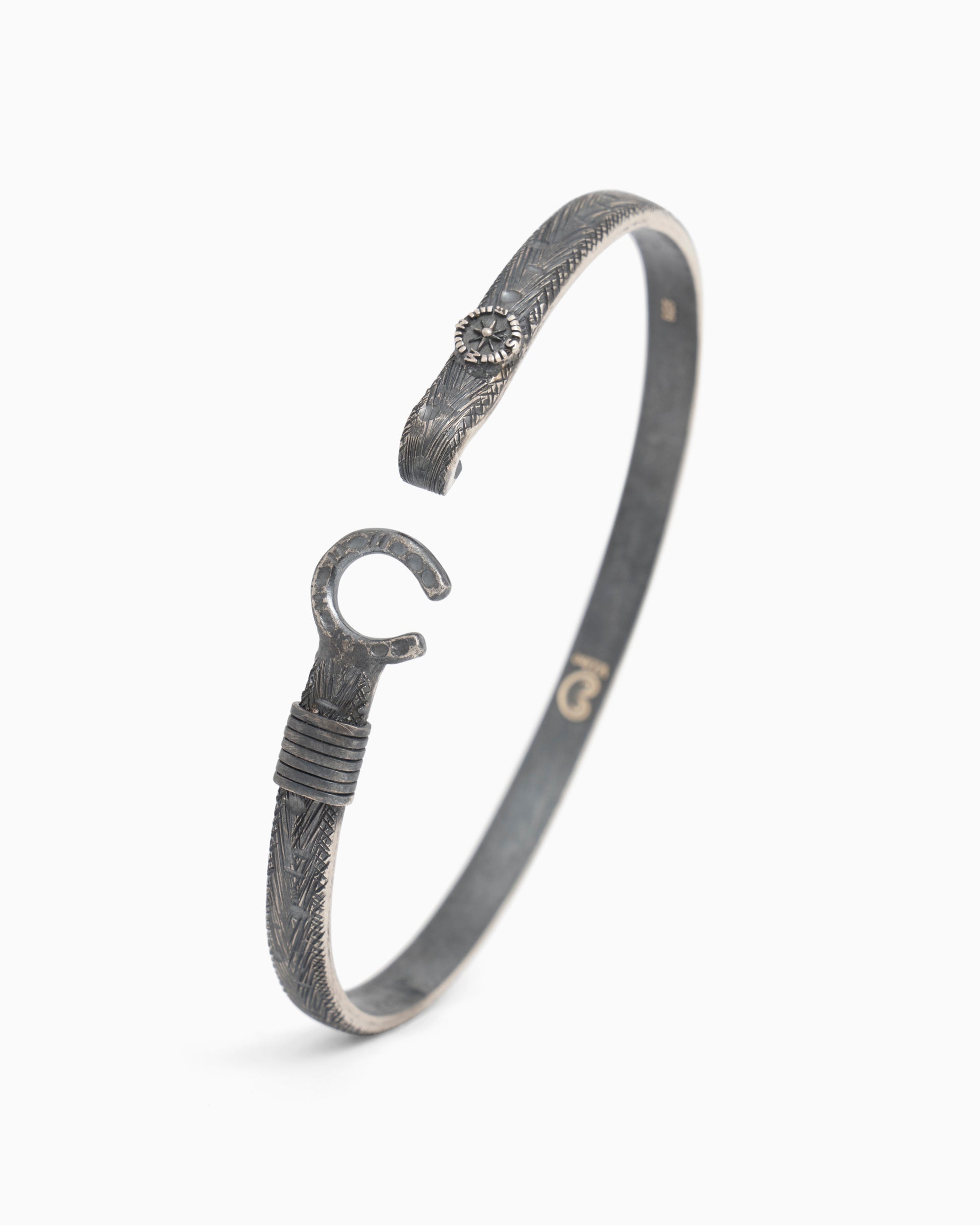 A Vibe signature, the Marine Texture Hook Bracelet is fashioned in oxidized sterling silver with a "C" hook clasp. Our signature marine texture is ocean inspired and features cross hatching and distressed details throughout. Featuring a compass and seven good luck wraps, solo or stacked, it is sure to be a favorite statement piece. Found in many of our designs, Vibe’s seven good luck wraps represent love, laughter, happiness, good fortune, health, unity, and peace. Wear this piece on its own or stack it with other bracelets for a layered look. With our oxidized finishes, no two are alike. Each original piece is handcrafted by Vibe artisans and markings and shades will vary.