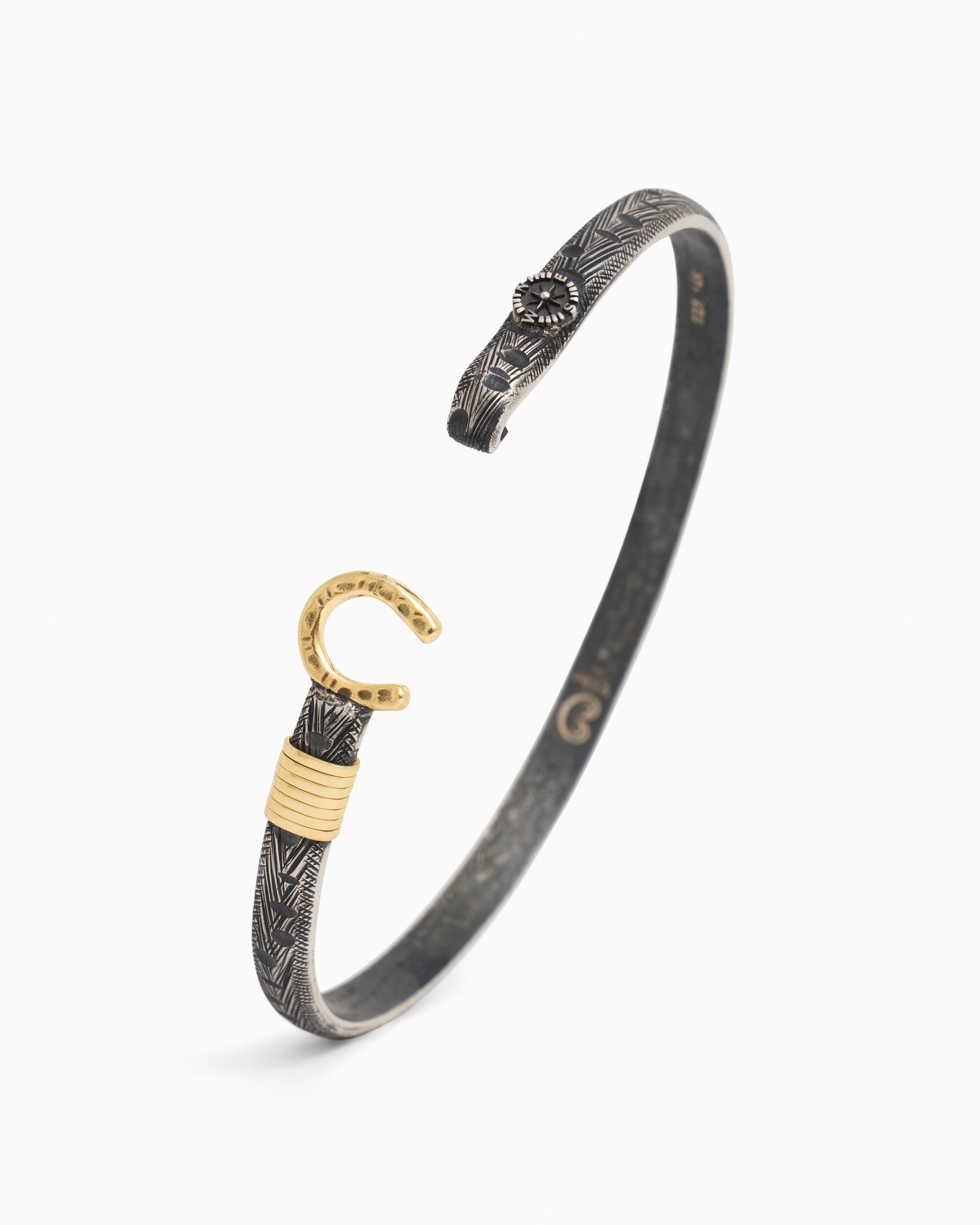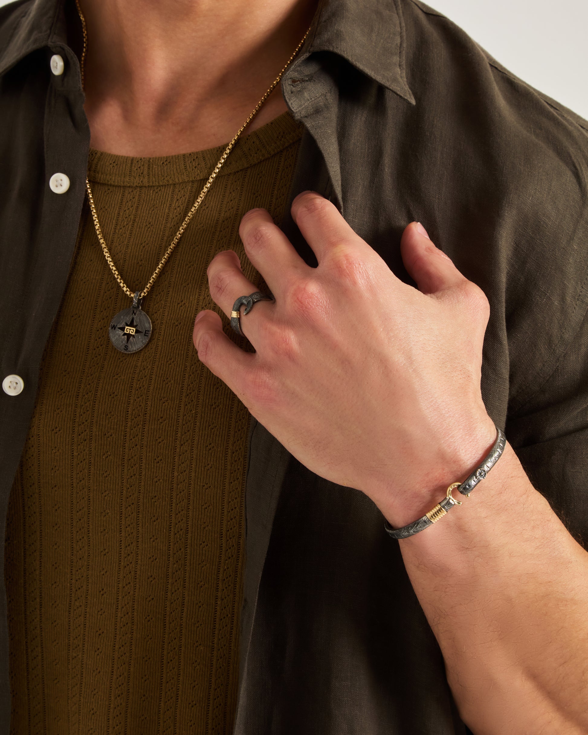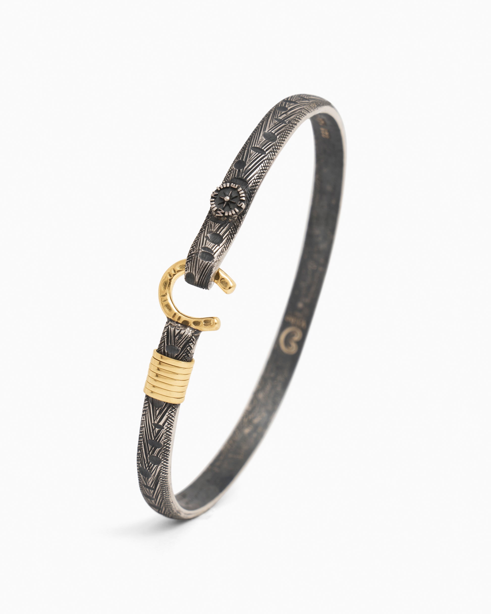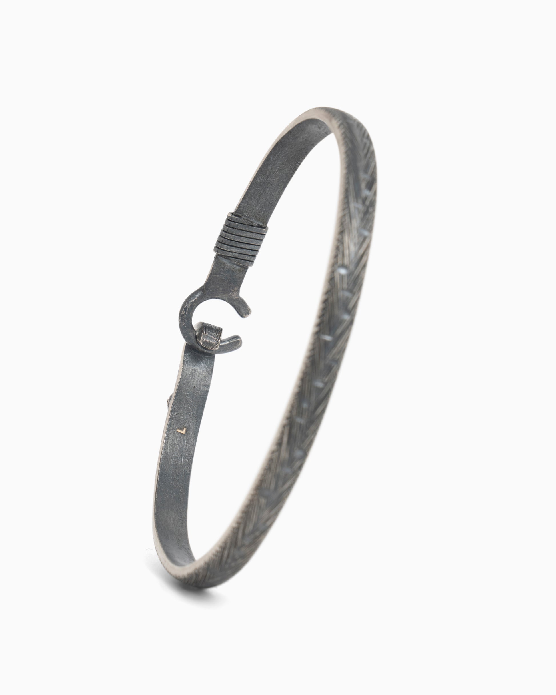 A Vibe signature, the Marine Texture Hook Bracelet is fashioned in oxidized sterling silver with a "C" hook clasp. Our signature marine texture is ocean inspired and features cross hatching and distressed details throughout. Featuring a compass and seven good luck wraps, solo or stacked, it is sure to be a favorite statement piece. Found in many of our designs, Vibe’s seven good luck wraps represent love, laughter, happiness, good fortune, health, unity, and peace. Wear this piece on its own or stack it with other bracelets for a layered look. With our oxidized finishes, no two are alike. Each original piece is handcrafted by Vibe artisans and markings and shades will vary.