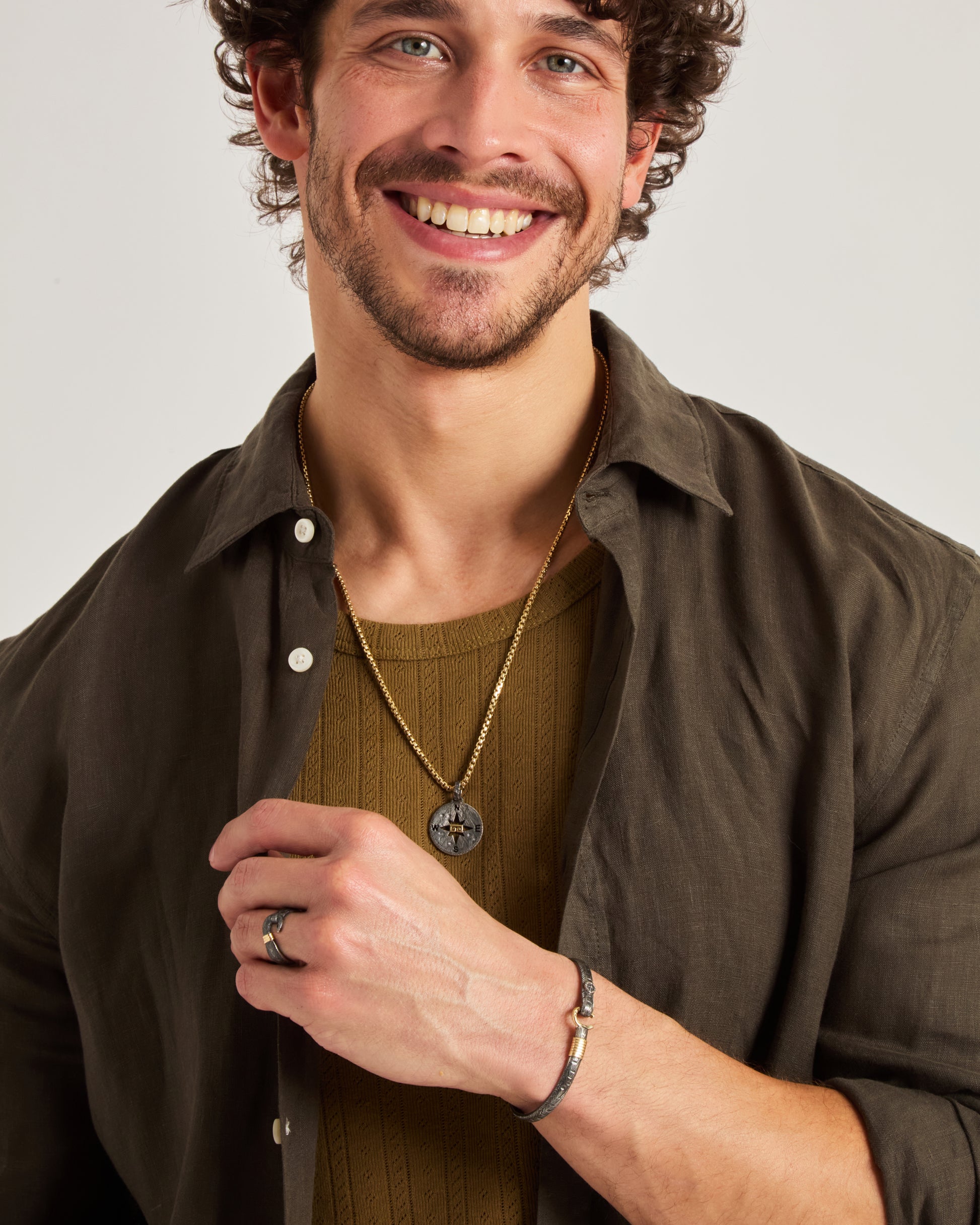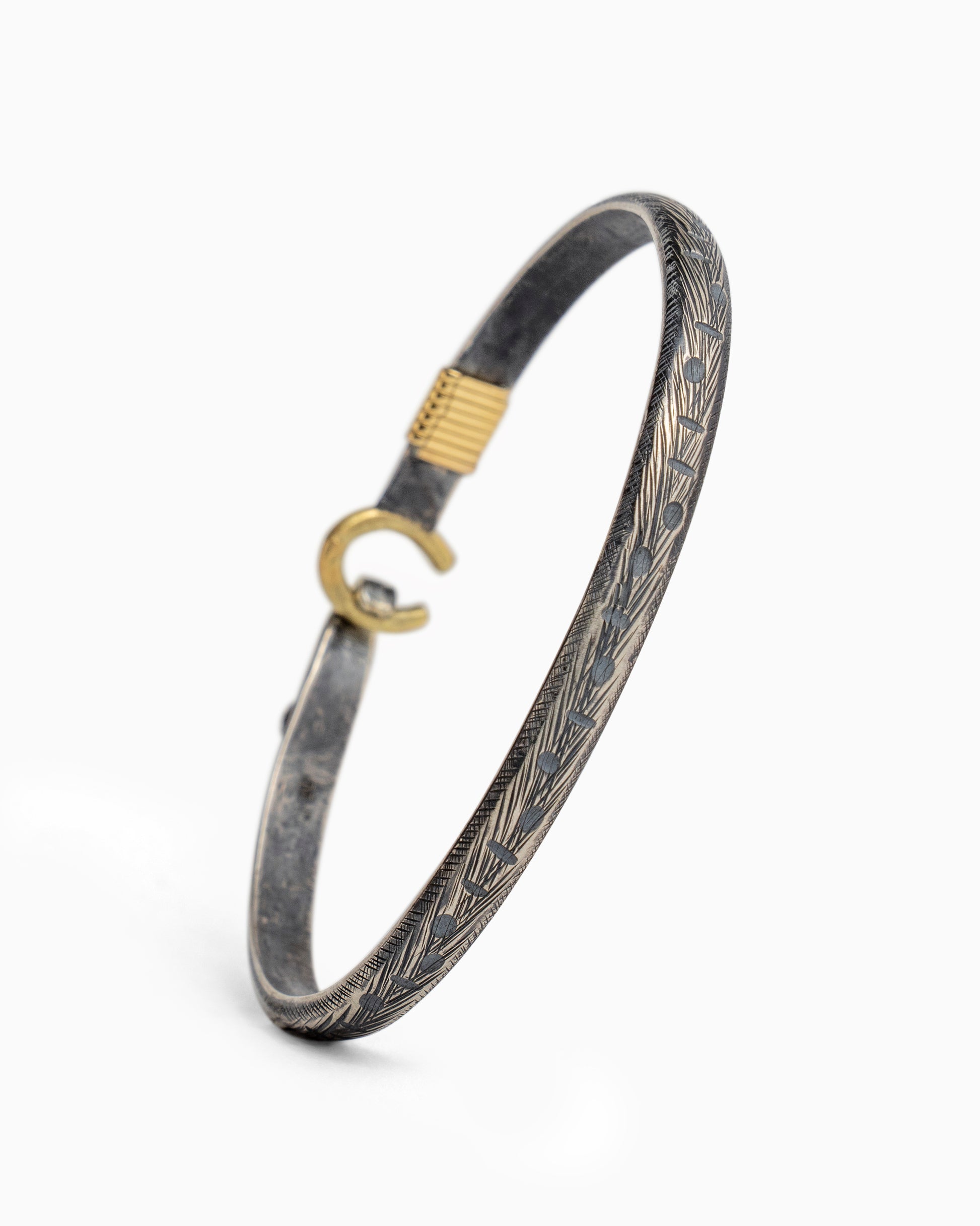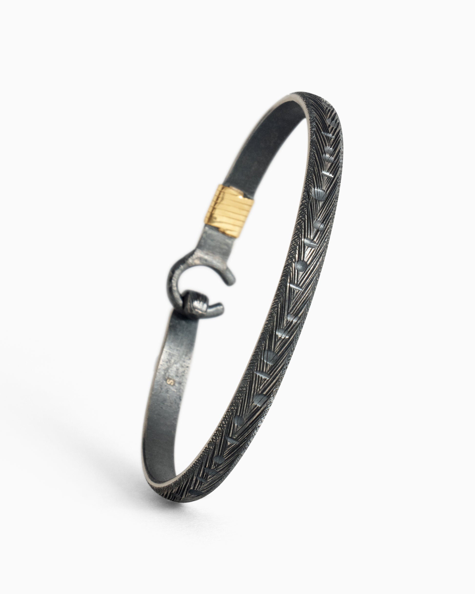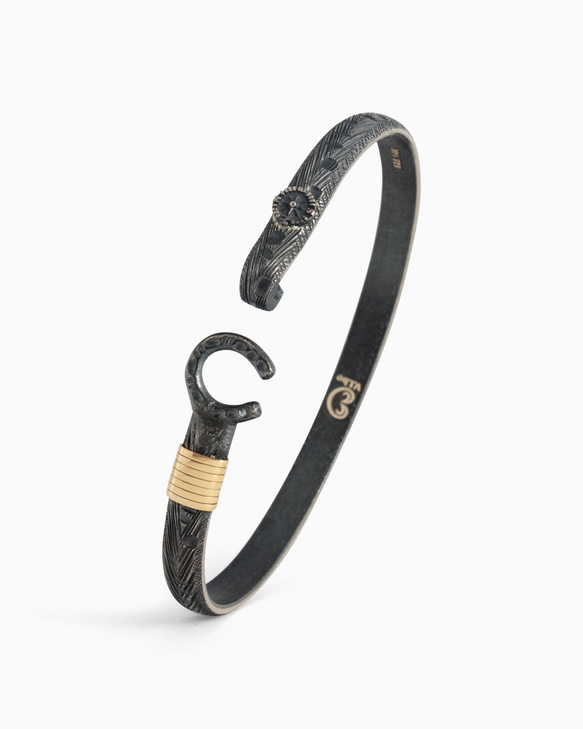 A Vibe signature, the Marine Texture Hook Bracelet is fashioned in oxidized sterling silver with a "C" hook clasp. Our signature marine texture is ocean inspired and features cross hatching and distressed details throughout. Featuring a compass and seven good luck wraps, solo or stacked, it is sure to be a favorite statement piece. Found in many of our designs, Vibe’s seven good luck wraps represent love, laughter, happiness, good fortune, health, unity, and peace. Wear this piece on its own or stack it with other bracelets for a layered look. With our oxidized finishes, no two are alike. Each original piece is handcrafted by Vibe artisans and markings and shades will vary.
