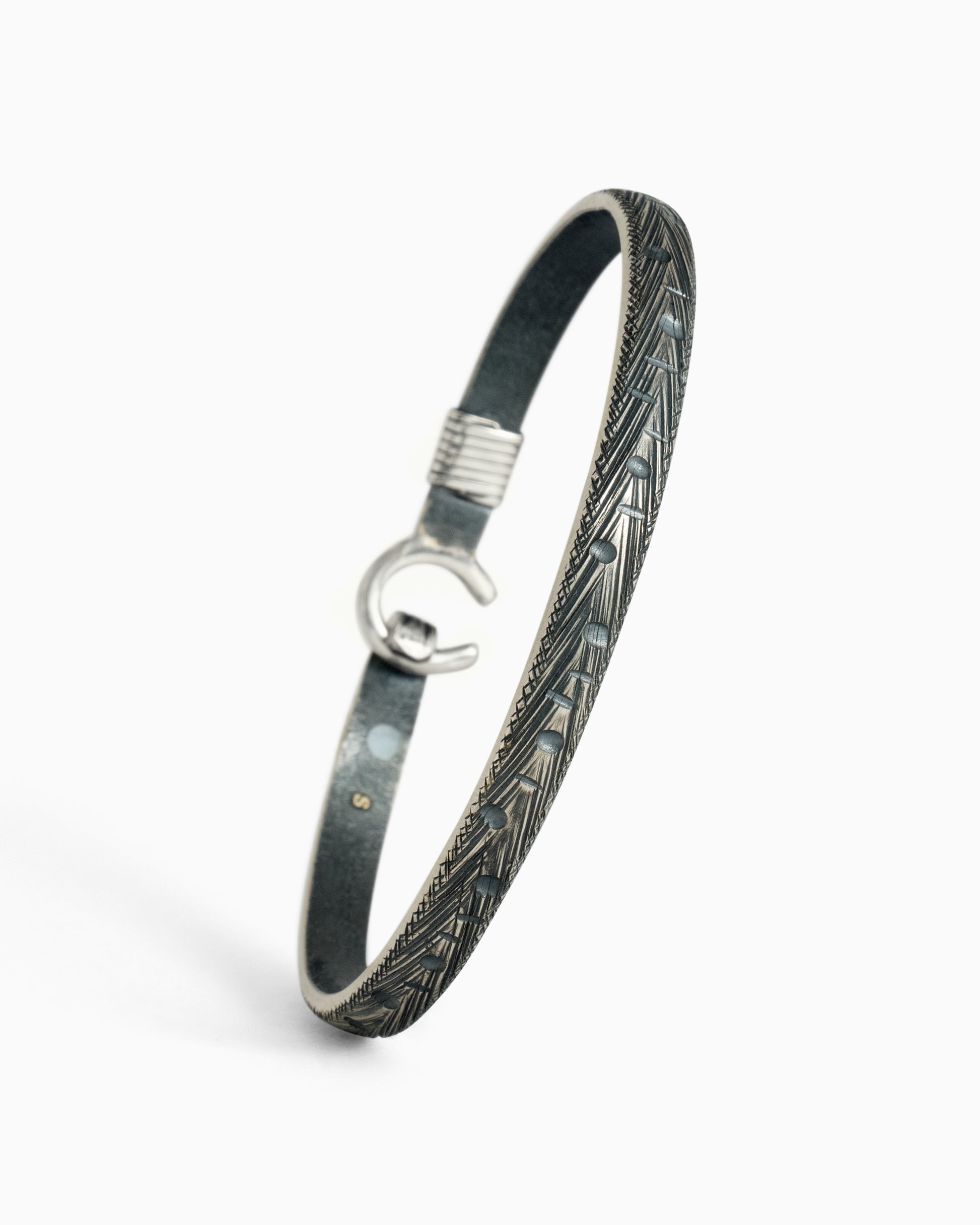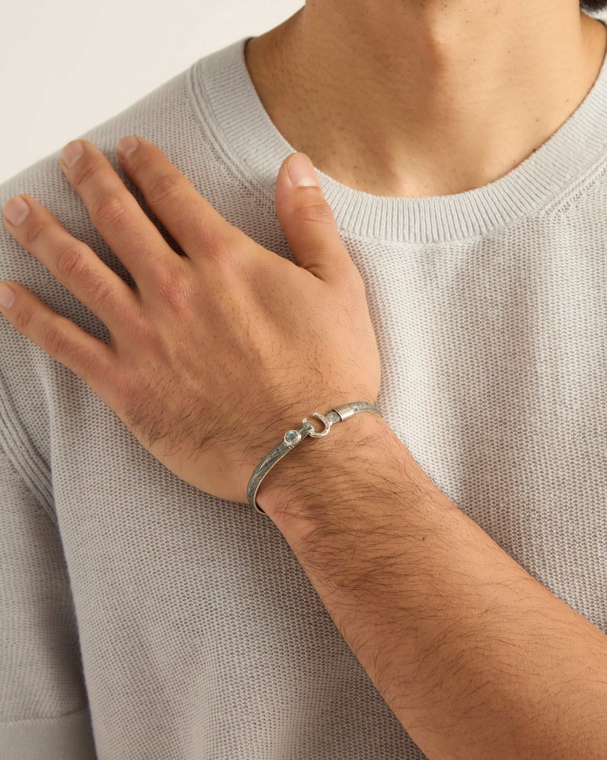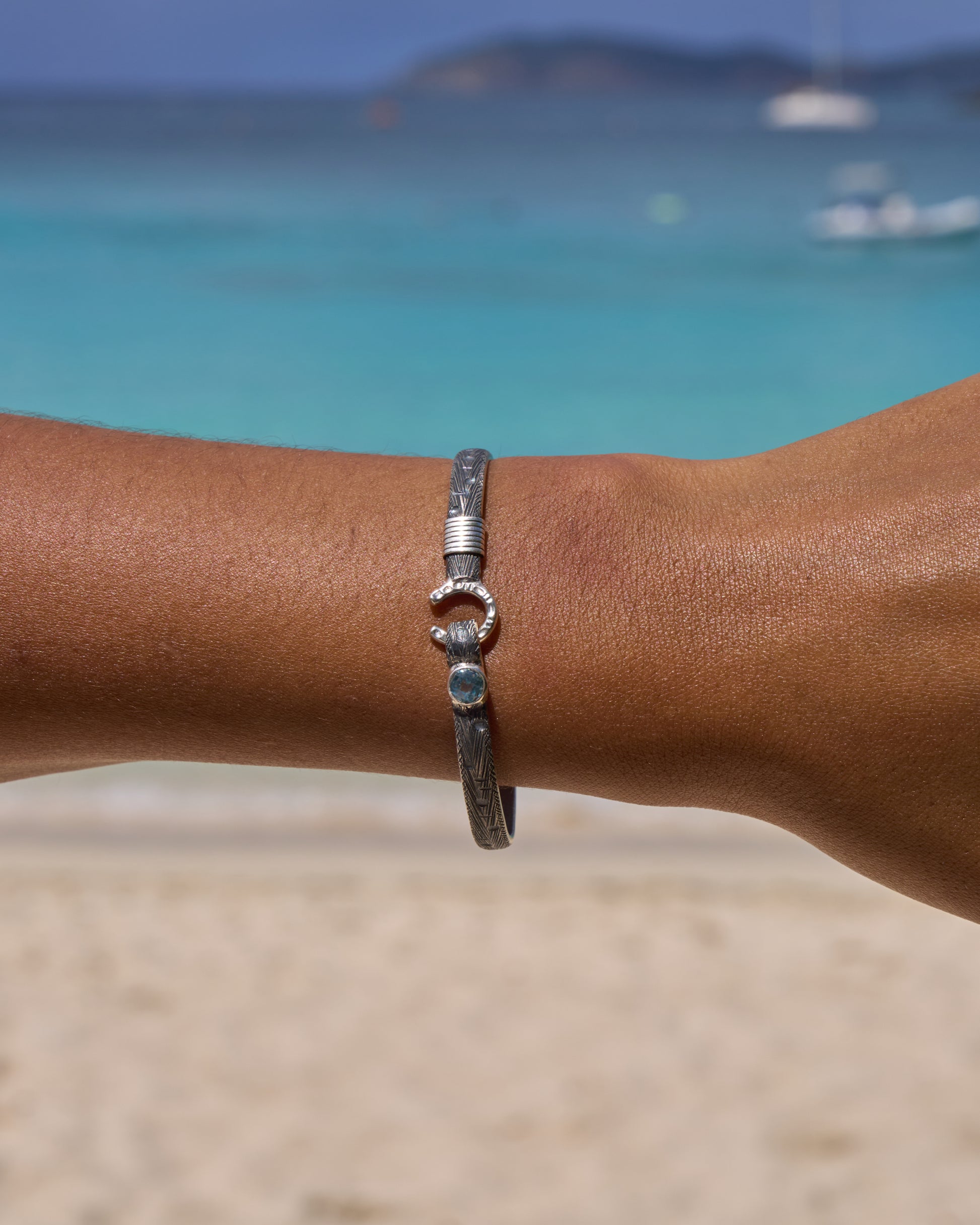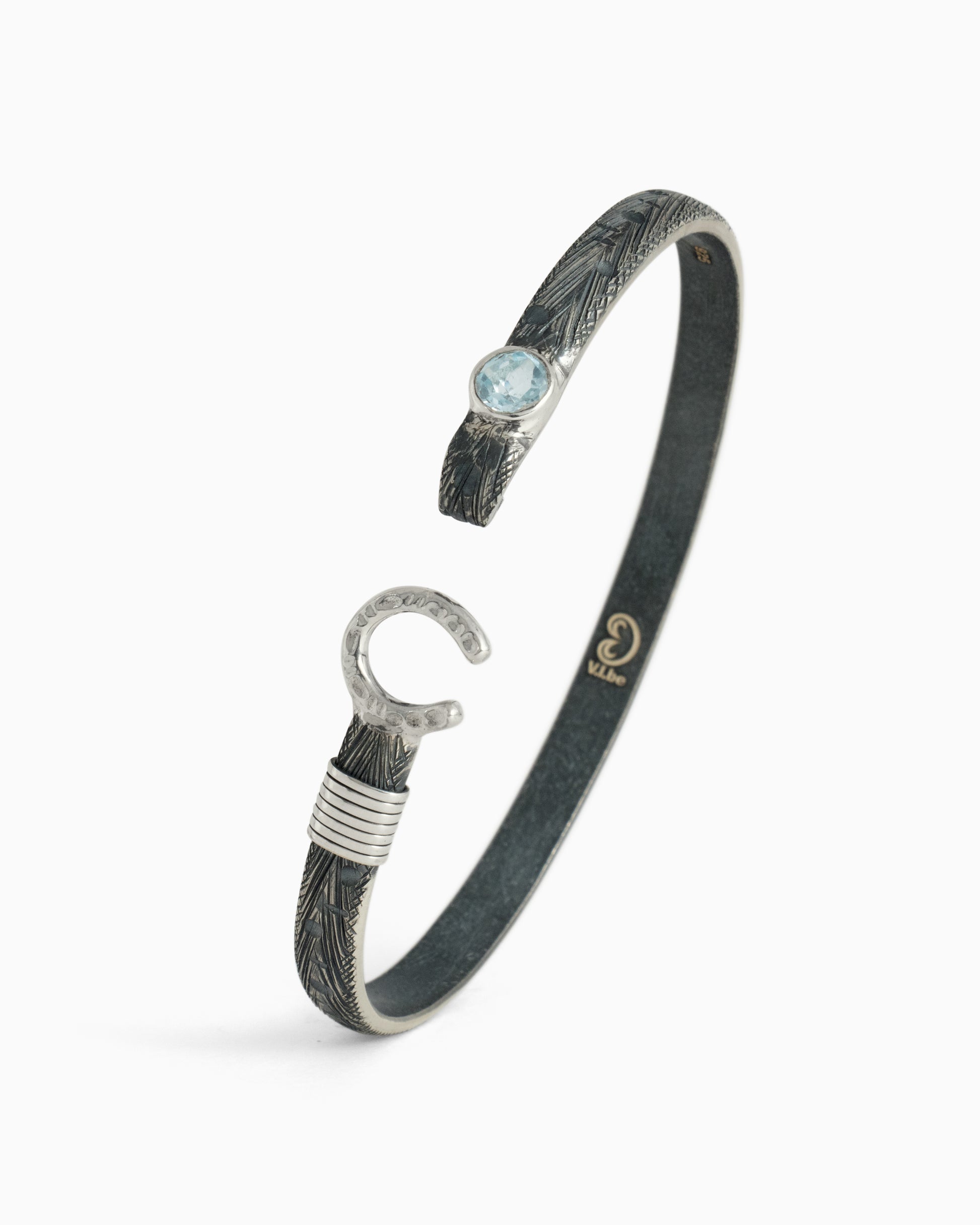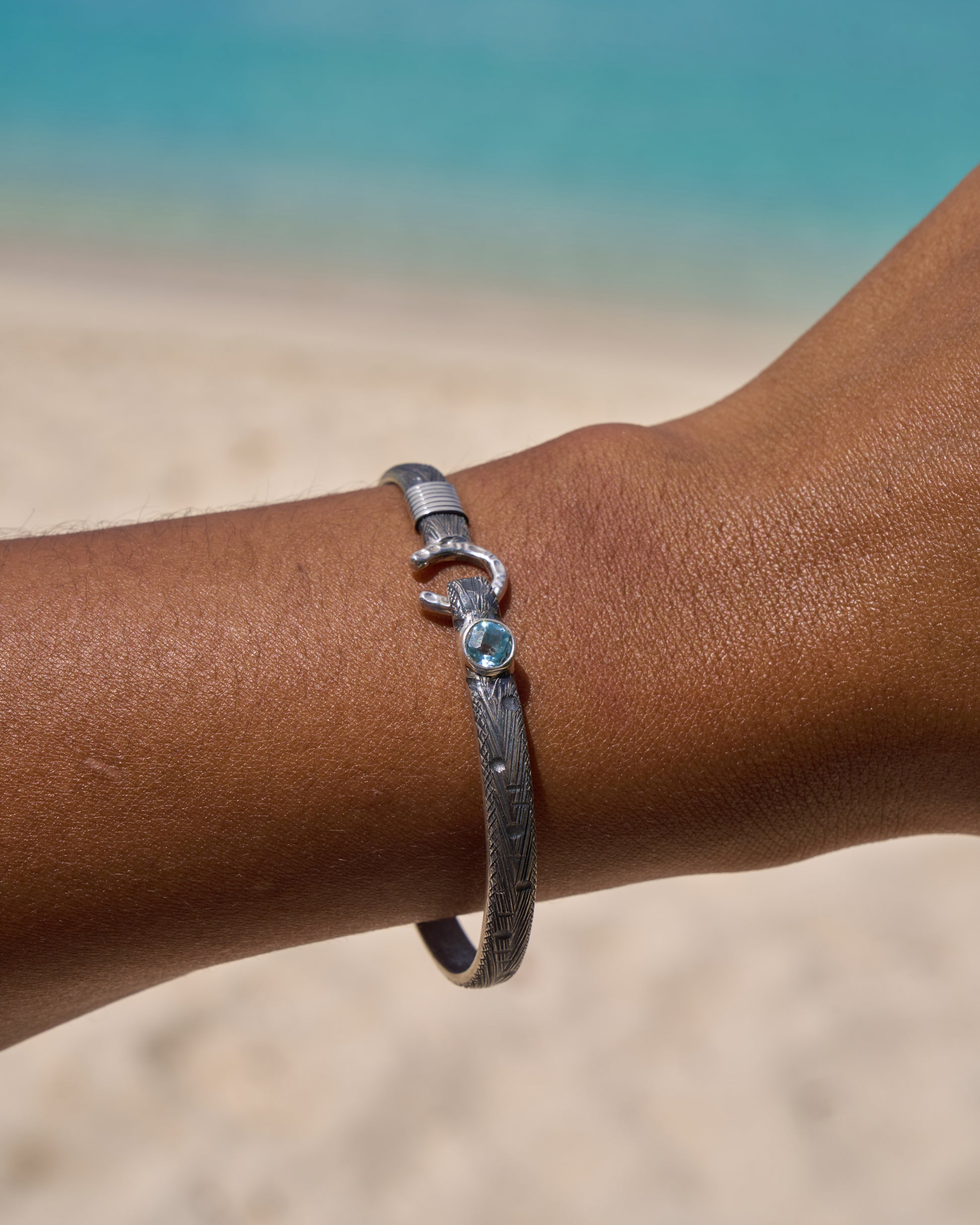 The Marine Texture Hook Bracelet with Stone is crafted in oxidized sterling silver with a marine texture band, featuring cross-hatching and distressed details throughout. A faceted sky blue topaz stone, along with a “C” hook clasp and seven good luck wraps, are set in polished sterling silver, creating a striking contrast against the textured band. Found in many of our designs, Vibe’s seven good luck wraps represent love, laughter, happiness, good fortune, health, unity, and peace. In the Caribbean tradition, wear your hook facing in to keep love close to your heart, and facing out if you are open to a new love in your life. Wear this piece on its own or stack it with other bracelets for a layered look.