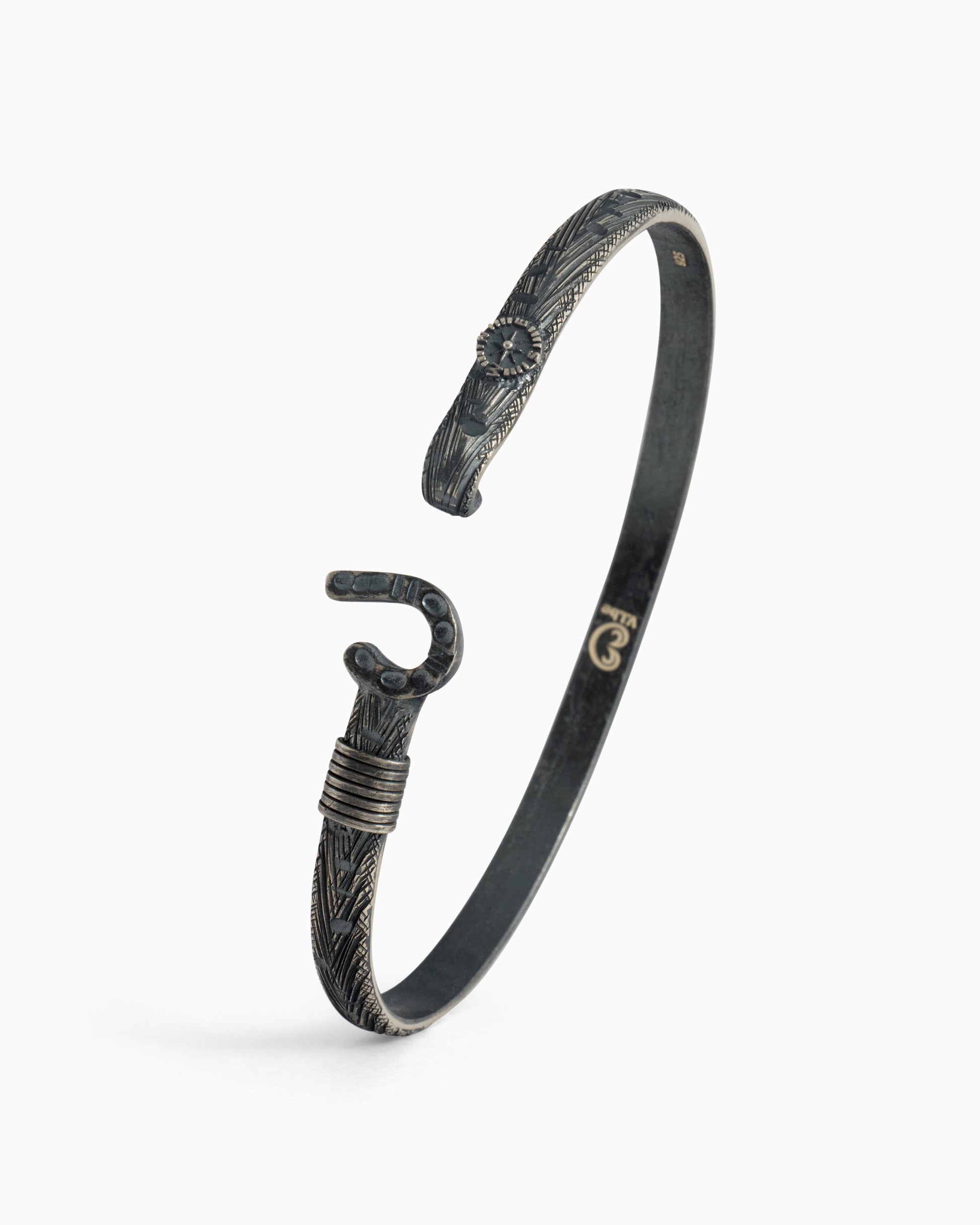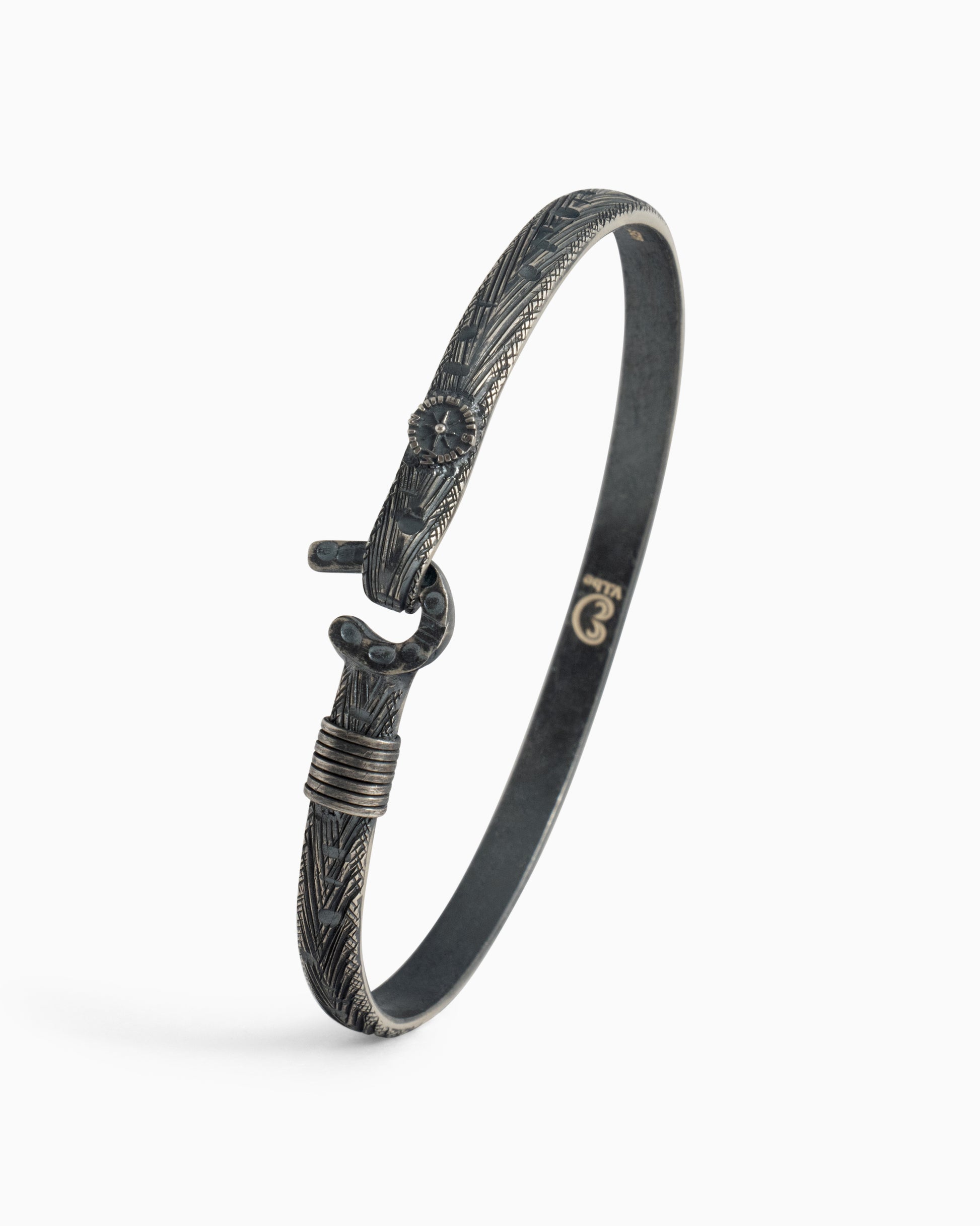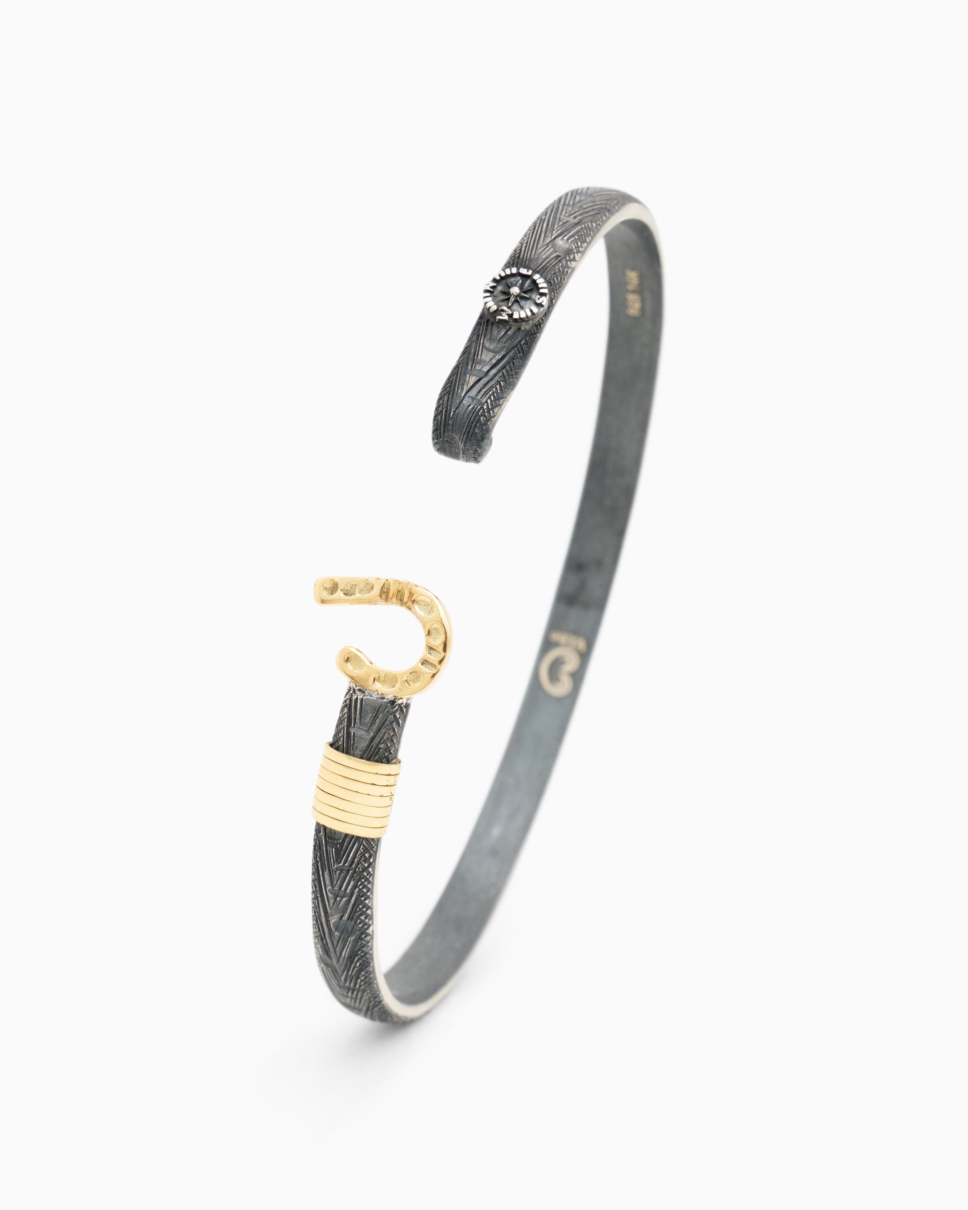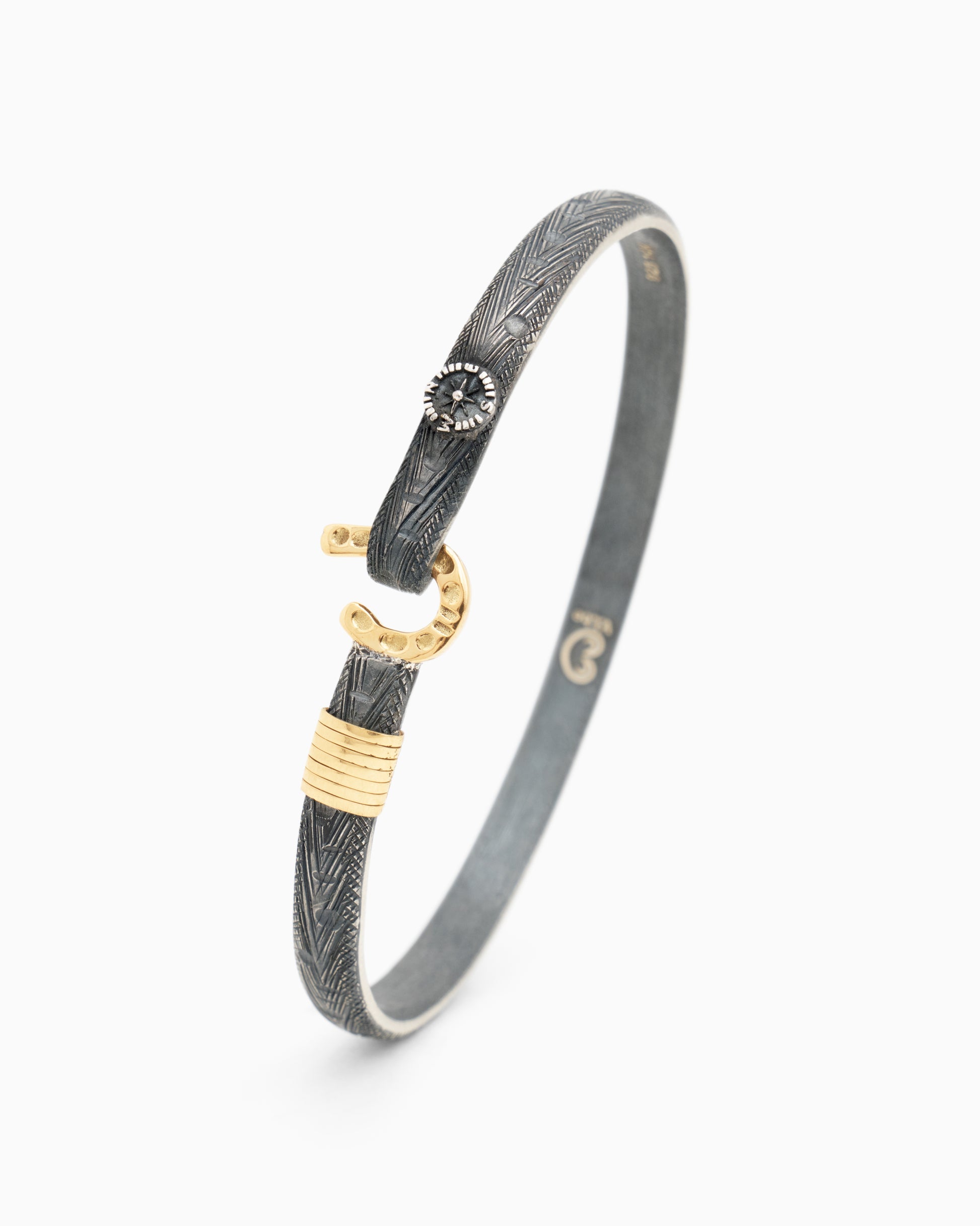 A Vibe signature, the Marine Texture St. John Hook Bracelet is fashioned in oxidized sterling silver with a "J" hook clasp to honor the island of St. John. Our signature marine texture is ocean inspired and features crosshatching and distressed details throughout. Featuring a compass and seven 14K gold good luck wraps, solo or stacked, it is sure to be a favorite statement piece. Found in many of our designs, Vibe’s seven good luck wraps represent love, laughter, happiness, good fortune, health, unity, and peace. Wear this piece on its own or stack it with other bracelets for a layered look. With our oxidized finishes, no two are alike. Each original piece is handcrafted by Vibe artisans and markings and shades will vary.