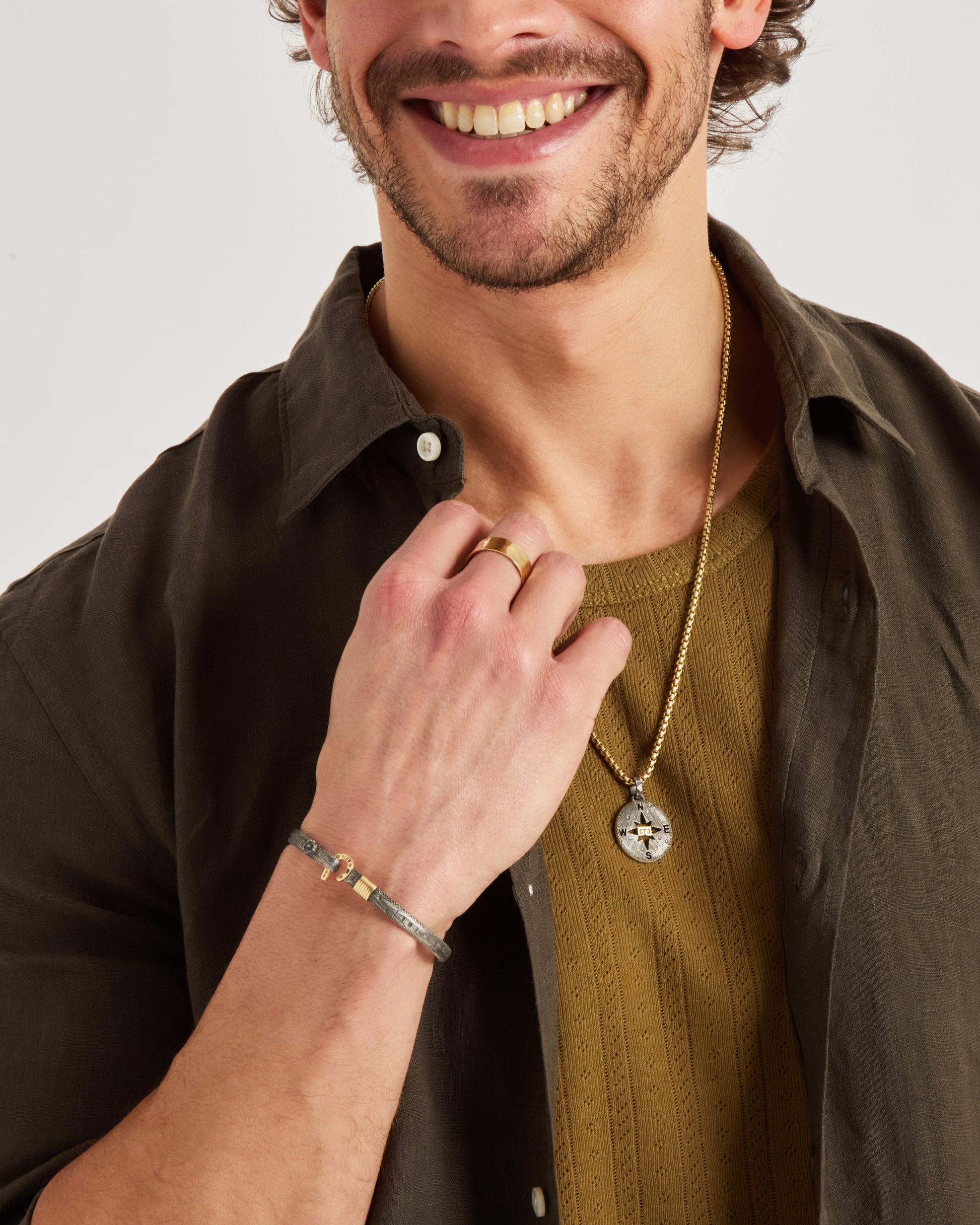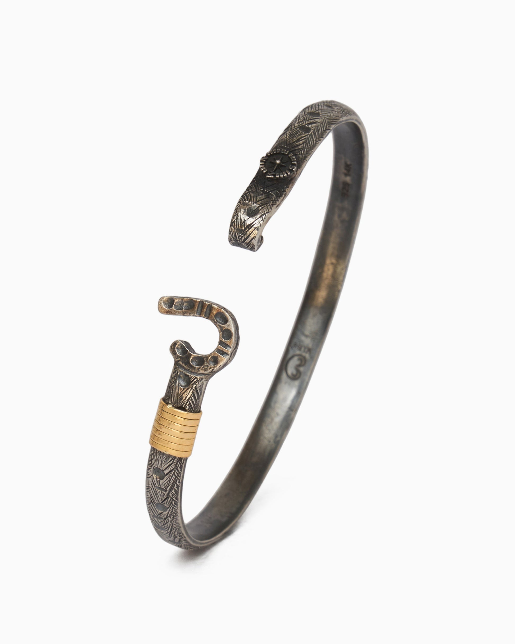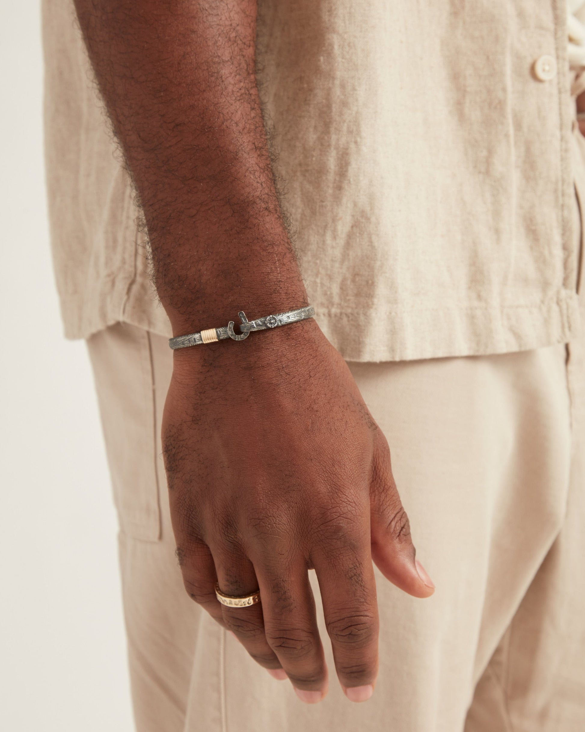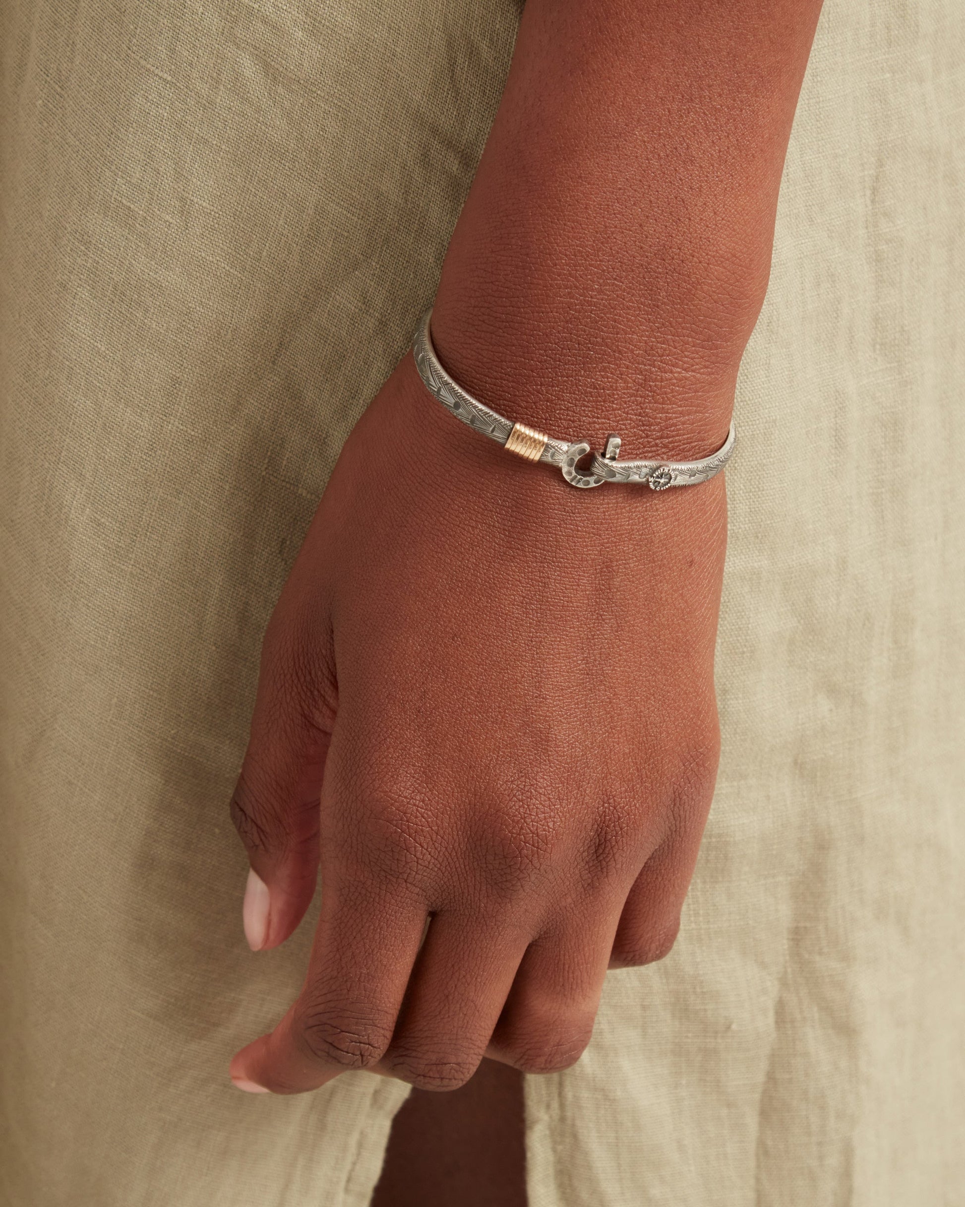 A Vibe signature, the Marine Texture St. John Hook Bracelet is fashioned in oxidized sterling silver with a "J" hook clasp to honor the island of St. John. Our signature marine texture is ocean inspired and features crosshatching and distressed details throughout. Featuring a compass and seven 14K gold good luck wraps, solo or stacked, it is sure to be a favorite statement piece. Found in many of our designs, Vibe’s seven good luck wraps represent love, laughter, happiness, good fortune, health, unity, and peace. Wear this piece on its own or stack it with other bracelets for a layered look. With our oxidized finishes, no two are alike. Each original piece is handcrafted by Vibe artisans and markings and shades will vary.