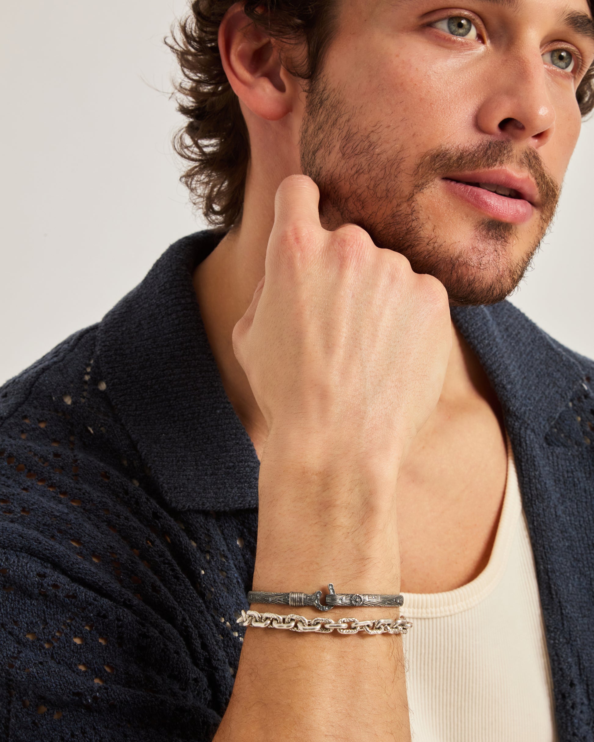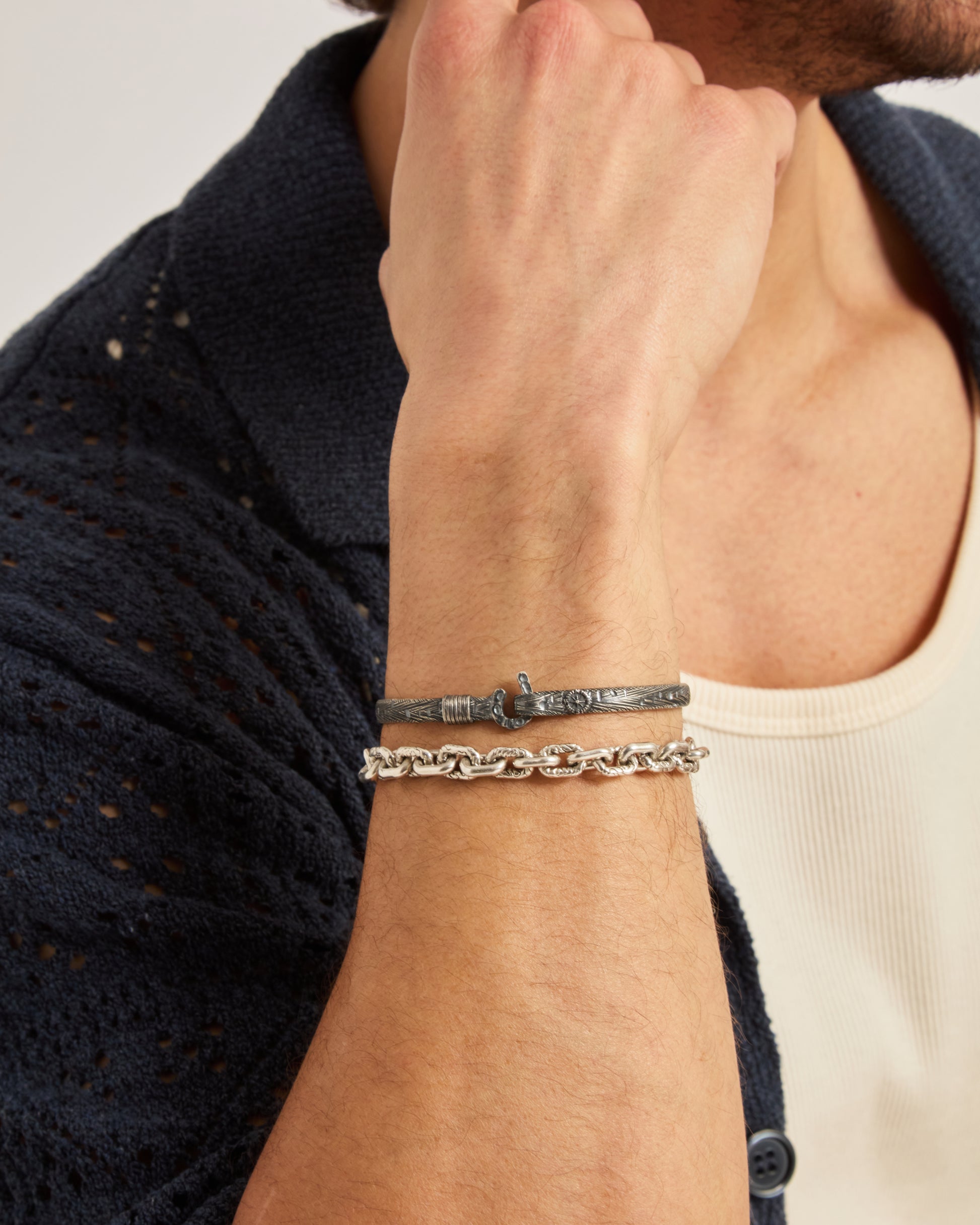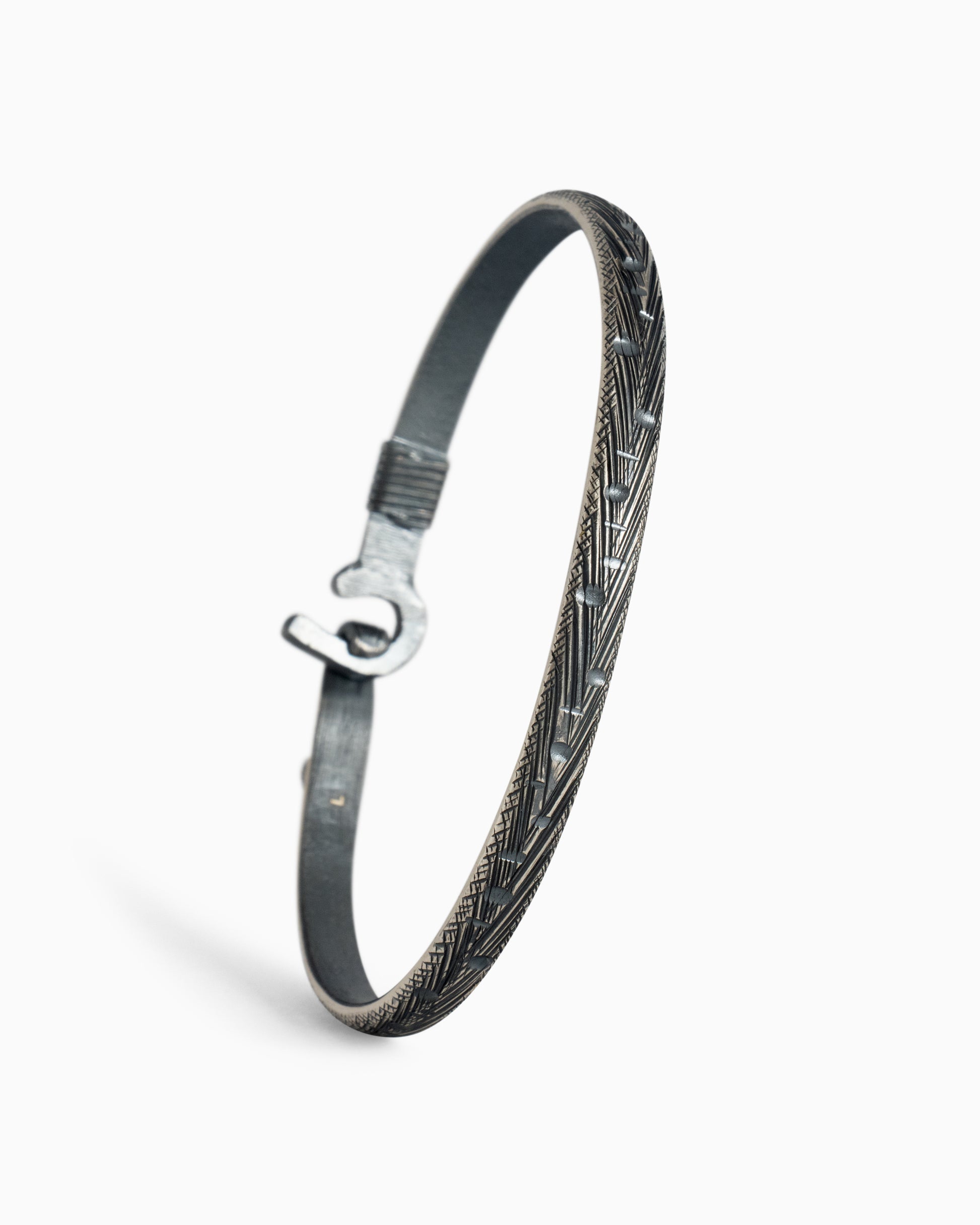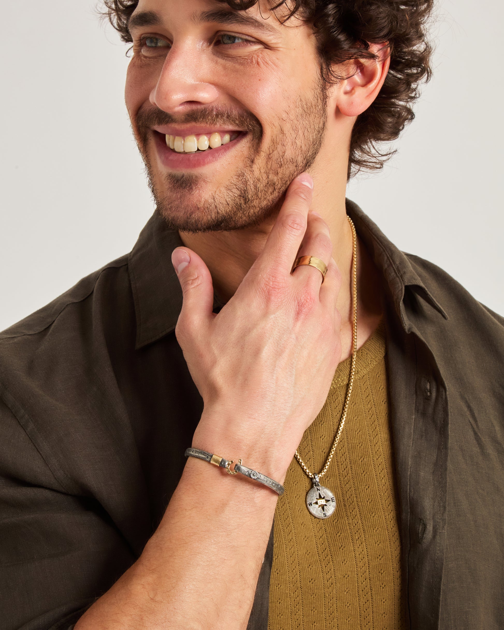 A Vibe signature, the Marine Texture St. John Hook Bracelet is fashioned in oxidized sterling silver with a "J" hook clasp to honor the island of St. John. Our signature marine texture is ocean inspired and features crosshatching and distressed details throughout. Featuring a compass and seven 14K gold good luck wraps, solo or stacked, it is sure to be a favorite statement piece. Found in many of our designs, Vibe’s seven good luck wraps represent love, laughter, happiness, good fortune, health, unity, and peace. Wear this piece on its own or stack it with other bracelets for a layered look. With our oxidized finishes, no two are alike. Each original piece is handcrafted by Vibe artisans and markings and shades will vary.