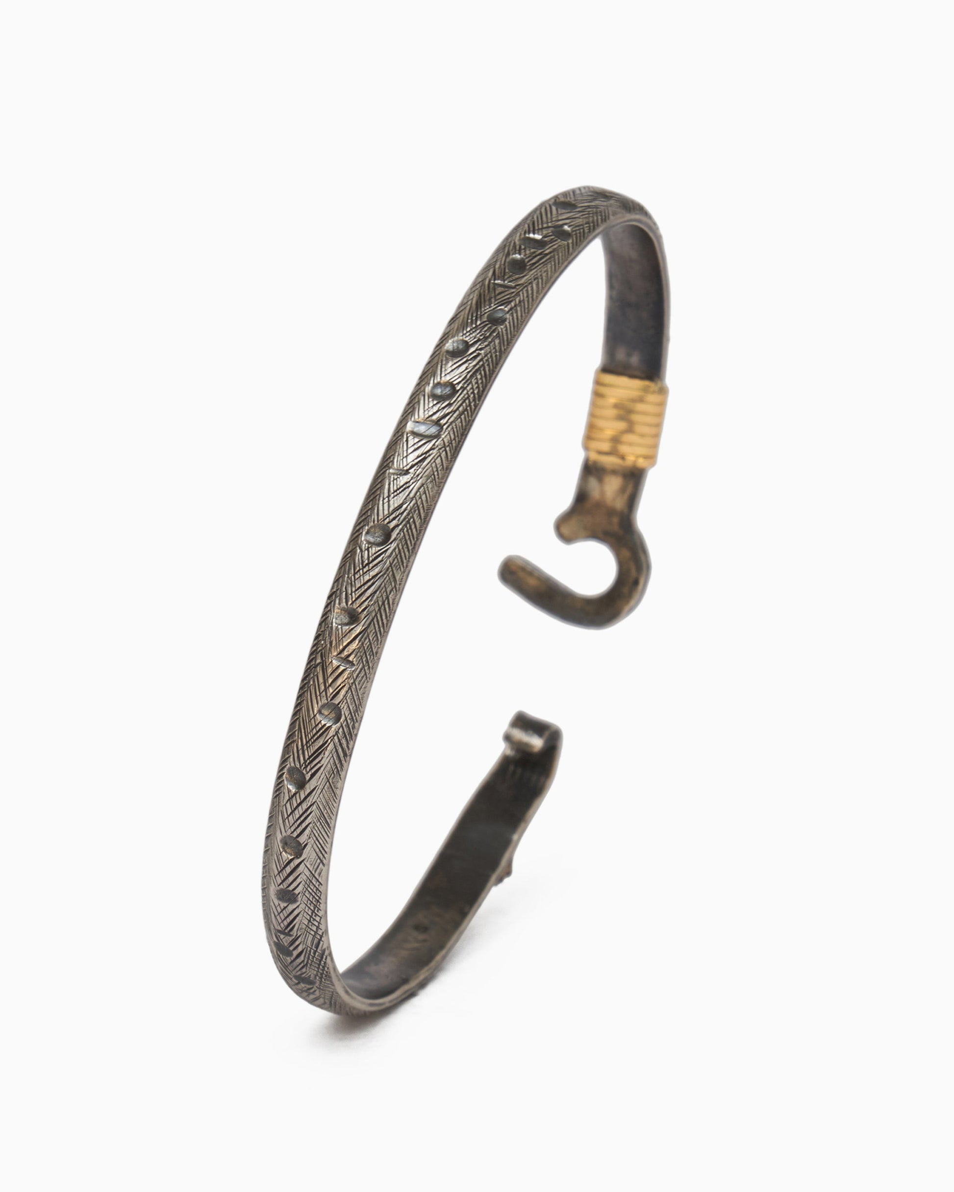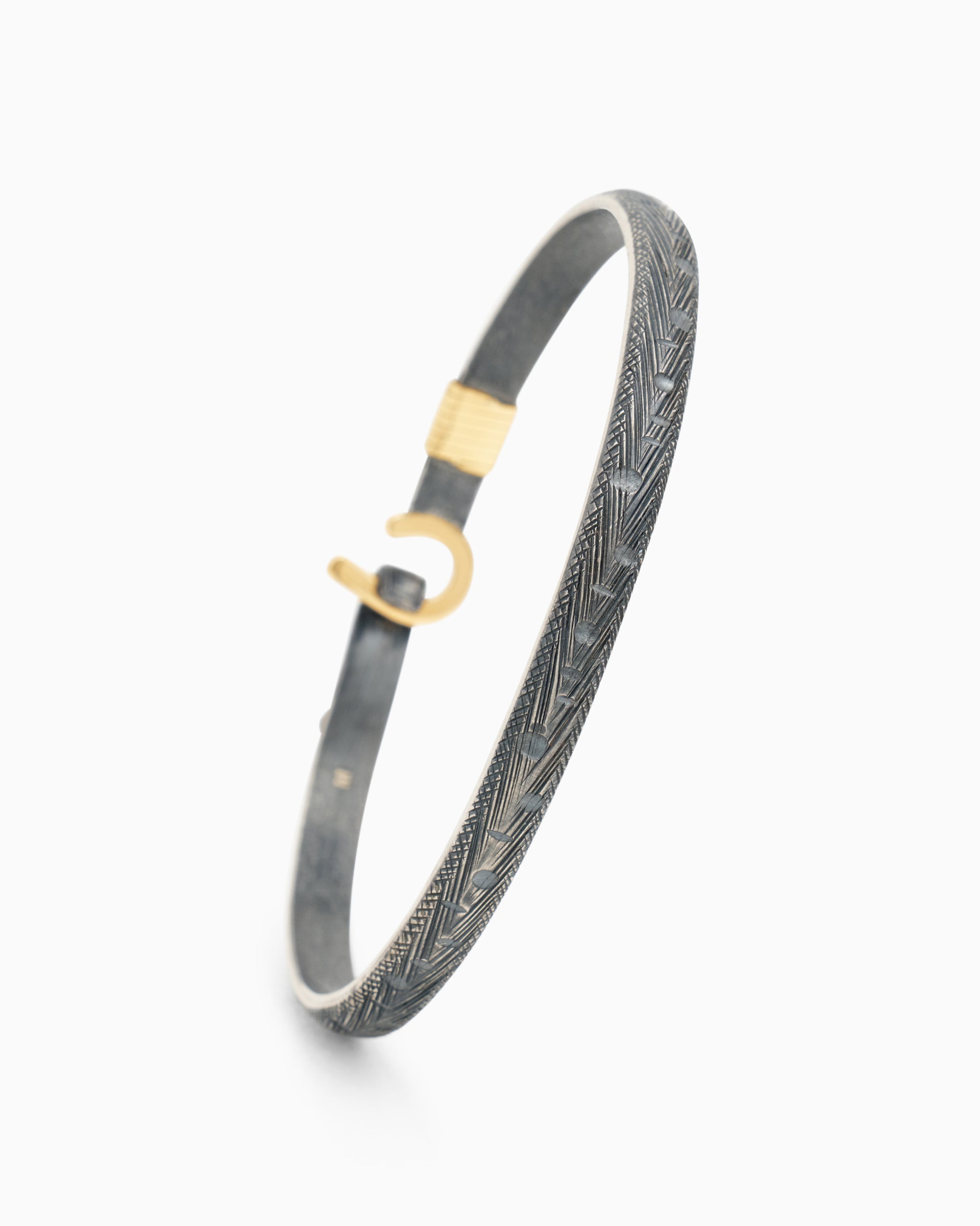 - Metal: Oxidized sterling silver with 14K gold wraps