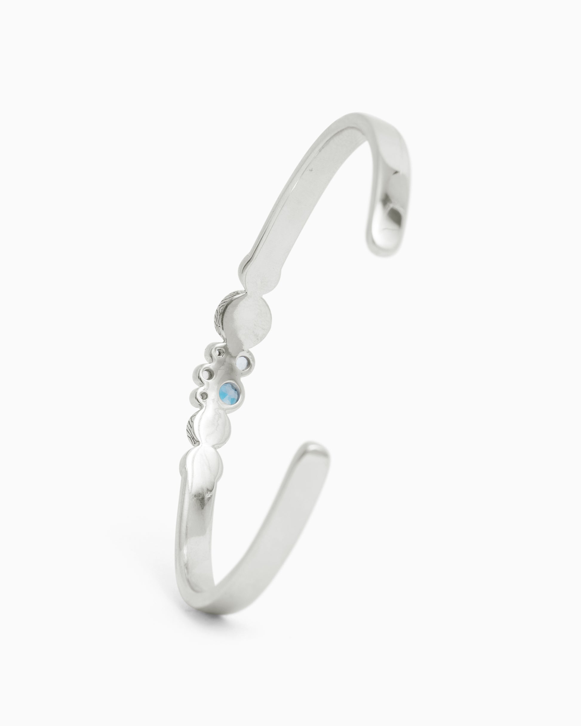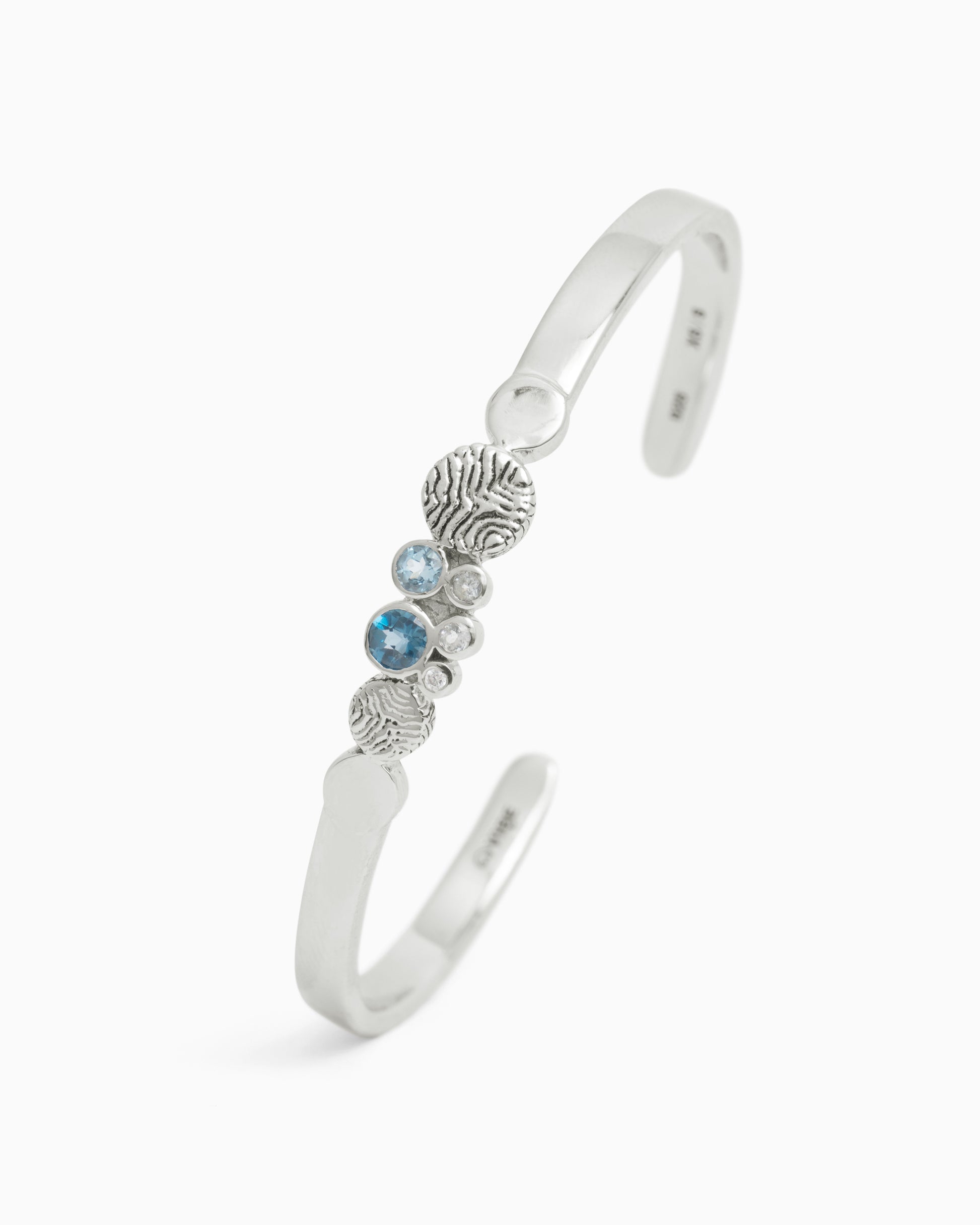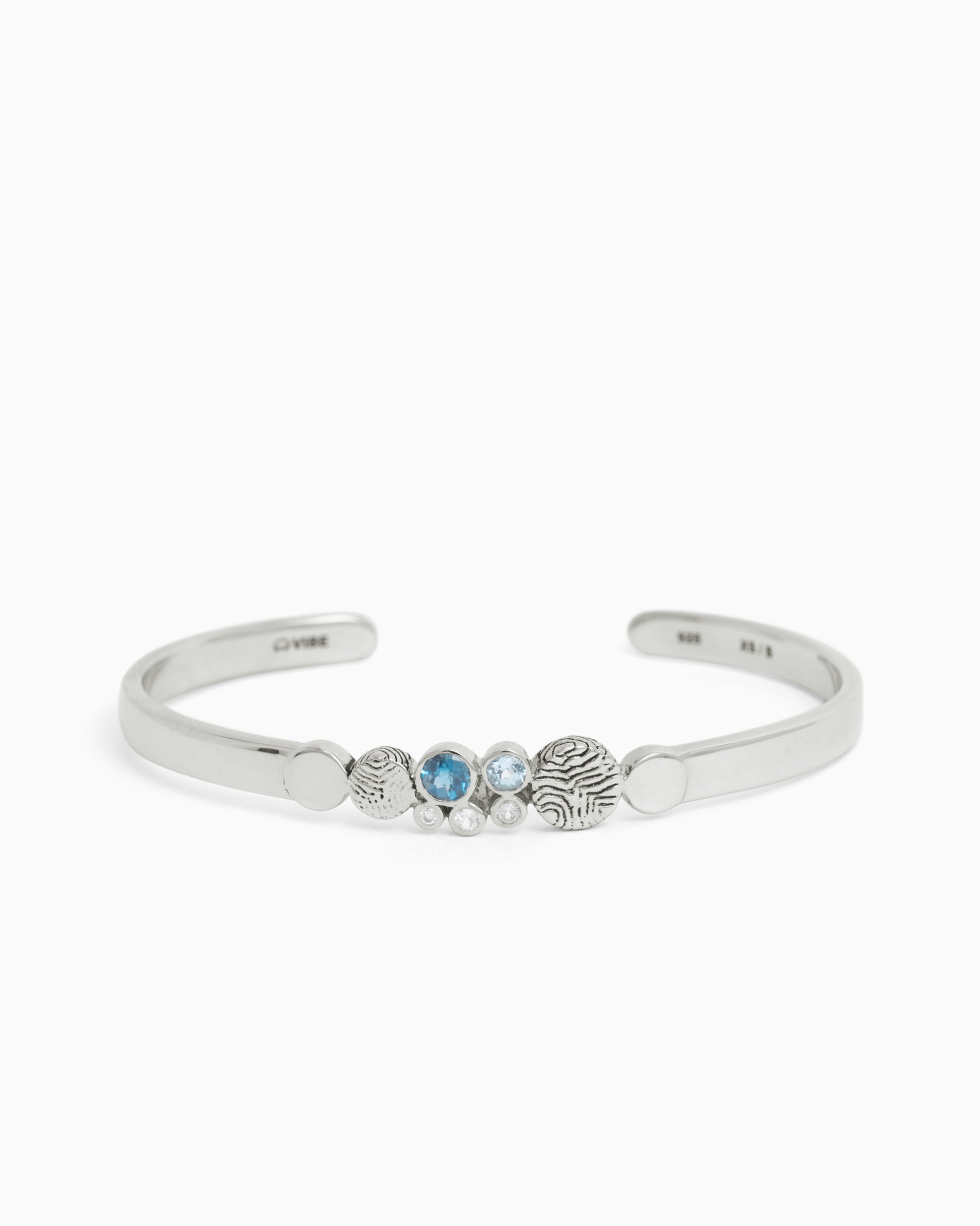 The Multi Stone Cuff is a sterling silver bracelet featuring our signature reef texture. Including five faceted stones that differ in size and color from white zircon to London blue topaz. This piece is a unique addition to your collection that will have you living the island life every day!