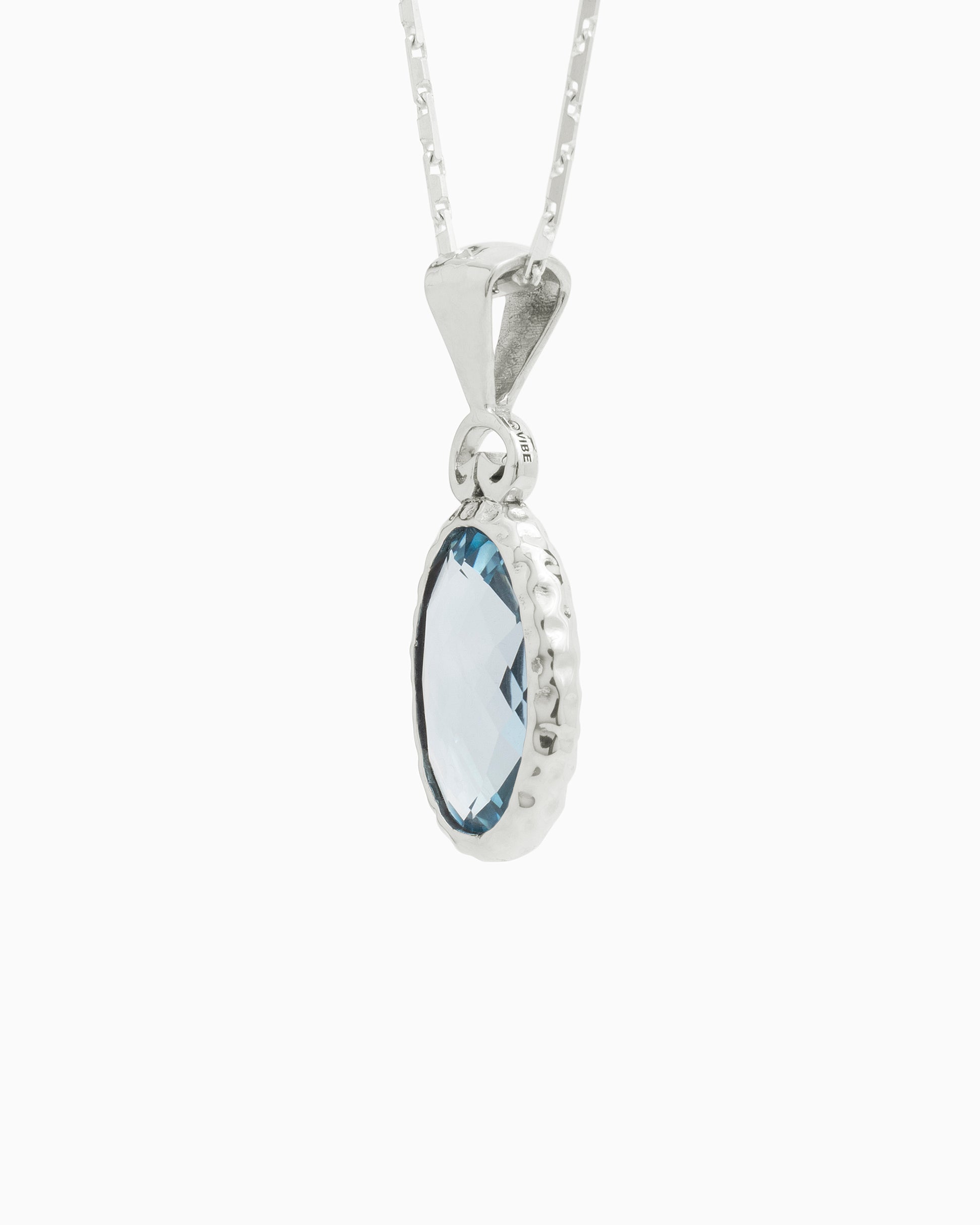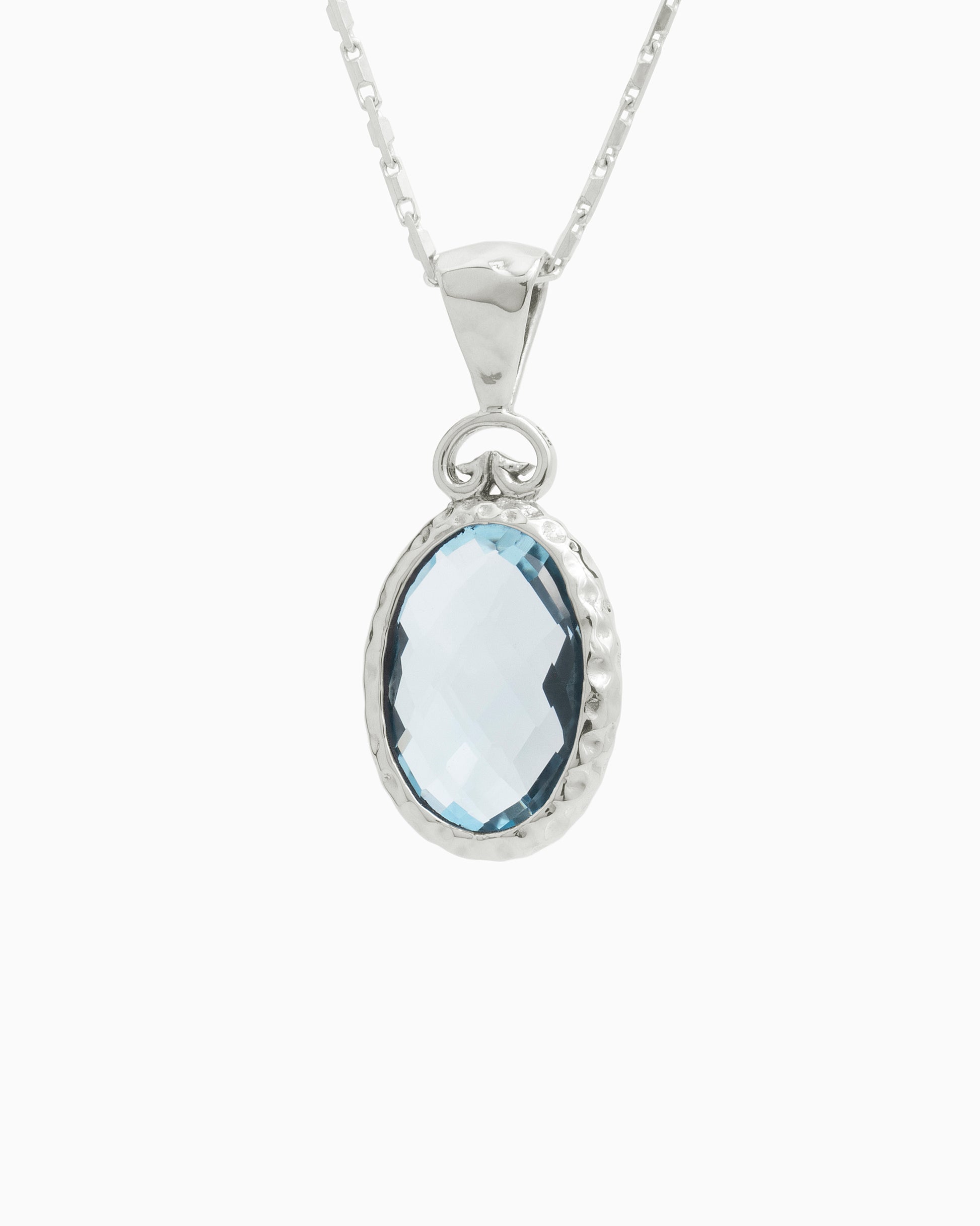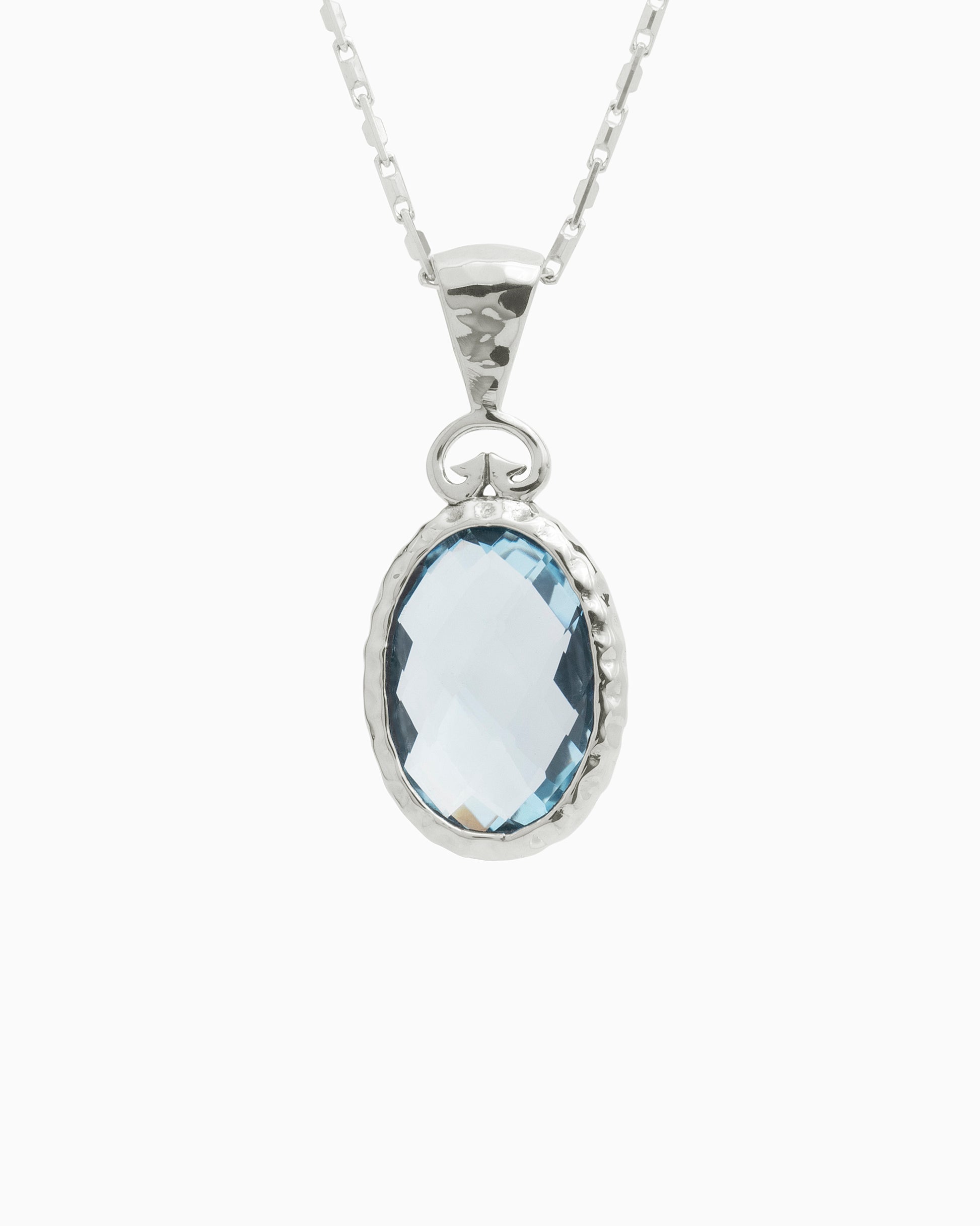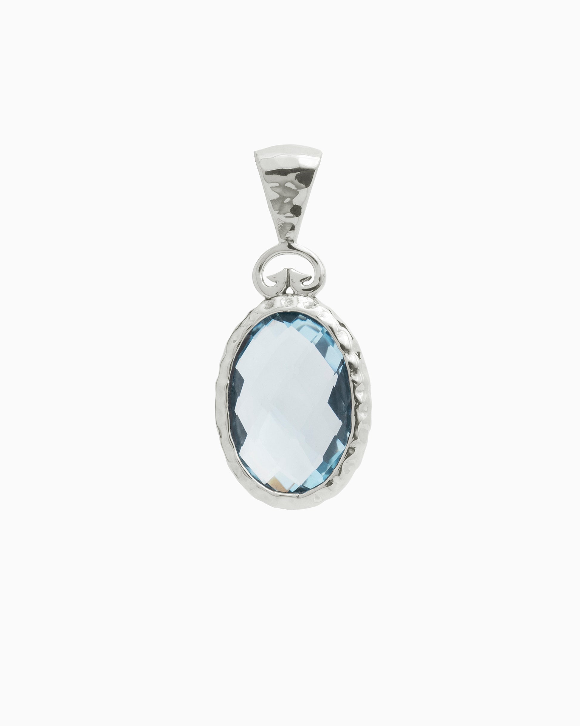 The Oval Stone Pendant is a stunning style handcrafted in gently hammered sterling silver. This piece features a faceted sky blue topaz stone with a petroglyph at the top. This versatile pendant can be worn with your casual everyday outfits or worn for a more formal occasion. Pair with your favorite chain, sold separately.