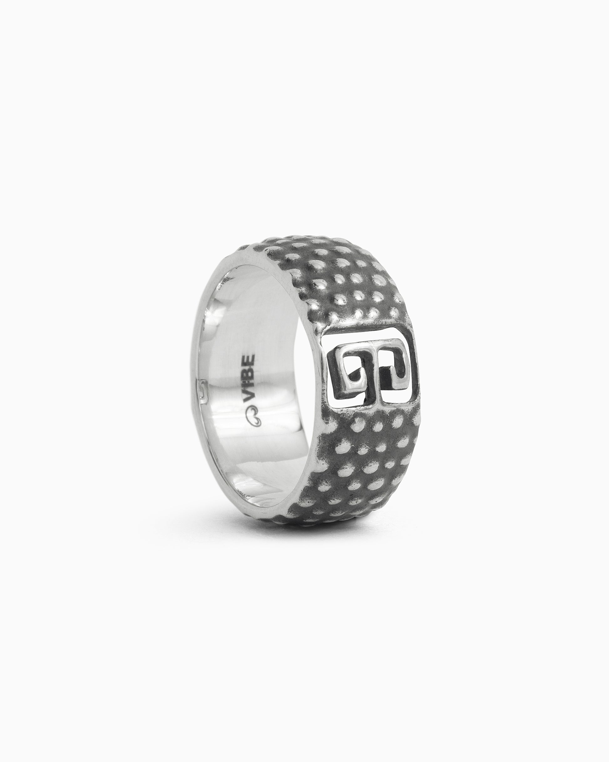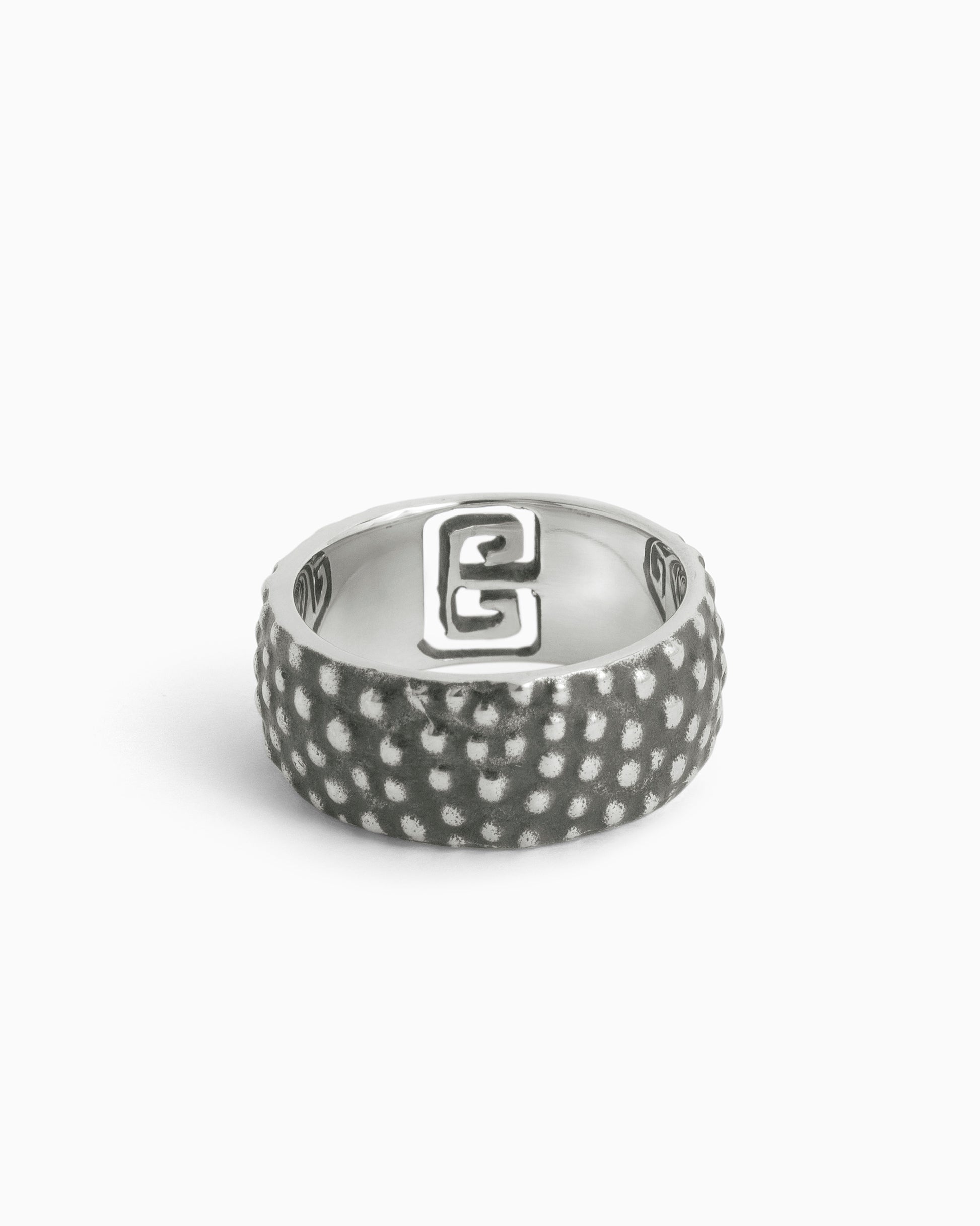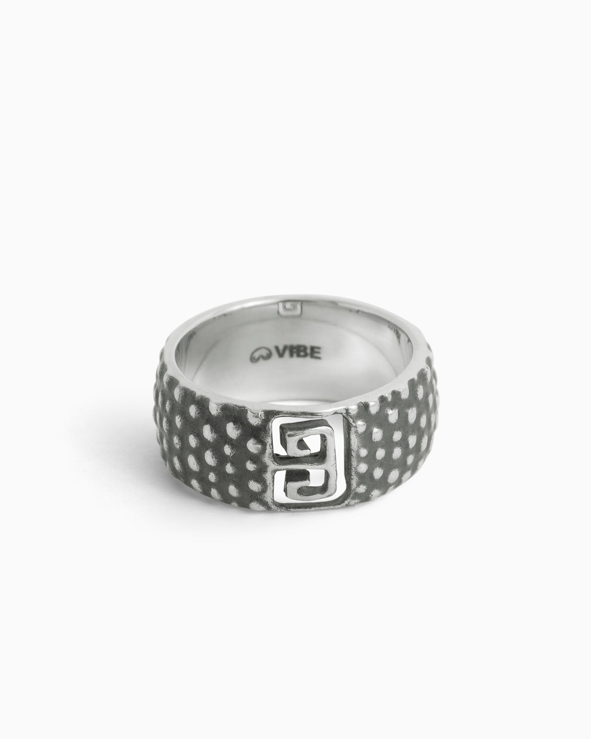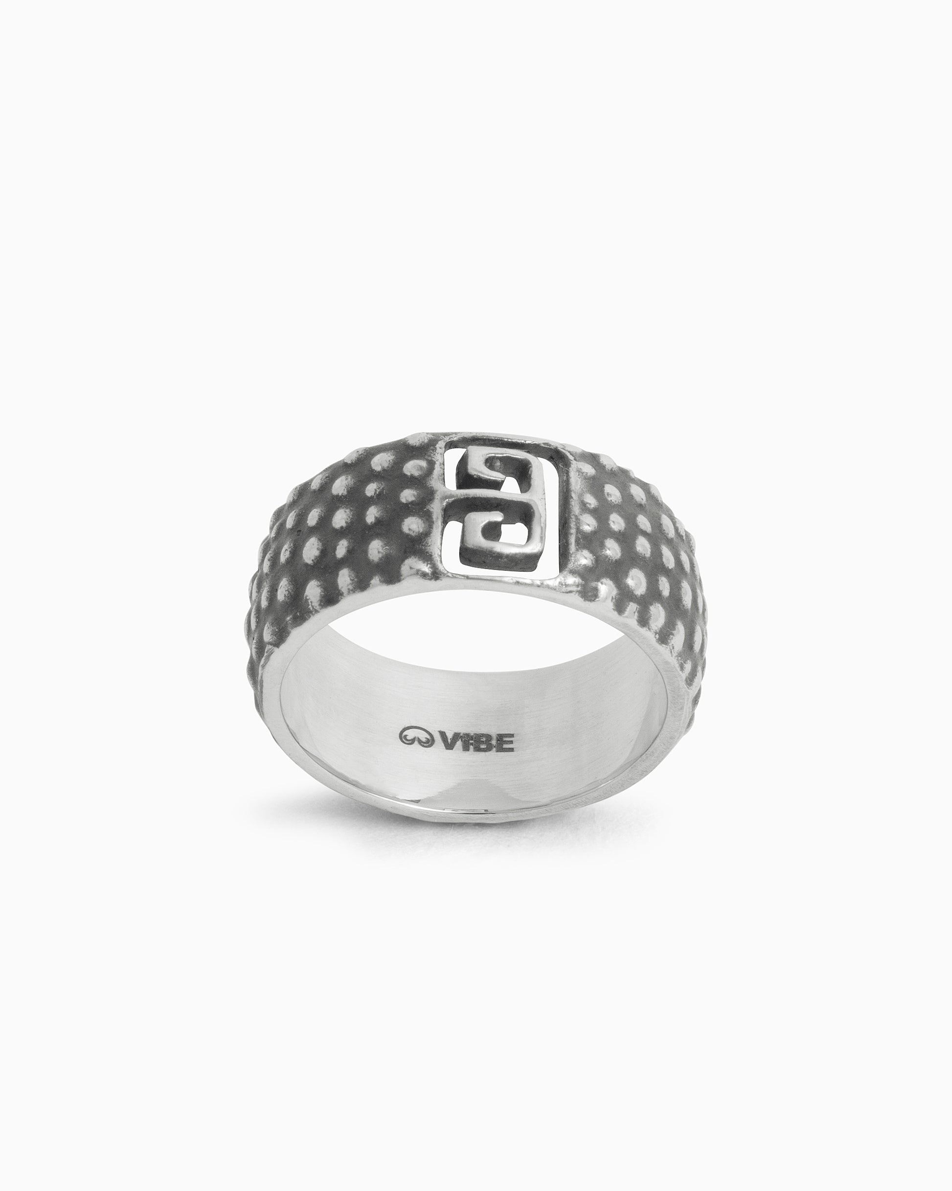 Handcrafted in oxidized sterling silver, the Sea Urchin Band Ring has a detailed texture along the whole band meant to resemble a sea urchin. Adorned in the center is a replica of the signature petroglyph with a different look. Wear this rugged style alone or stack with others for a statement look.