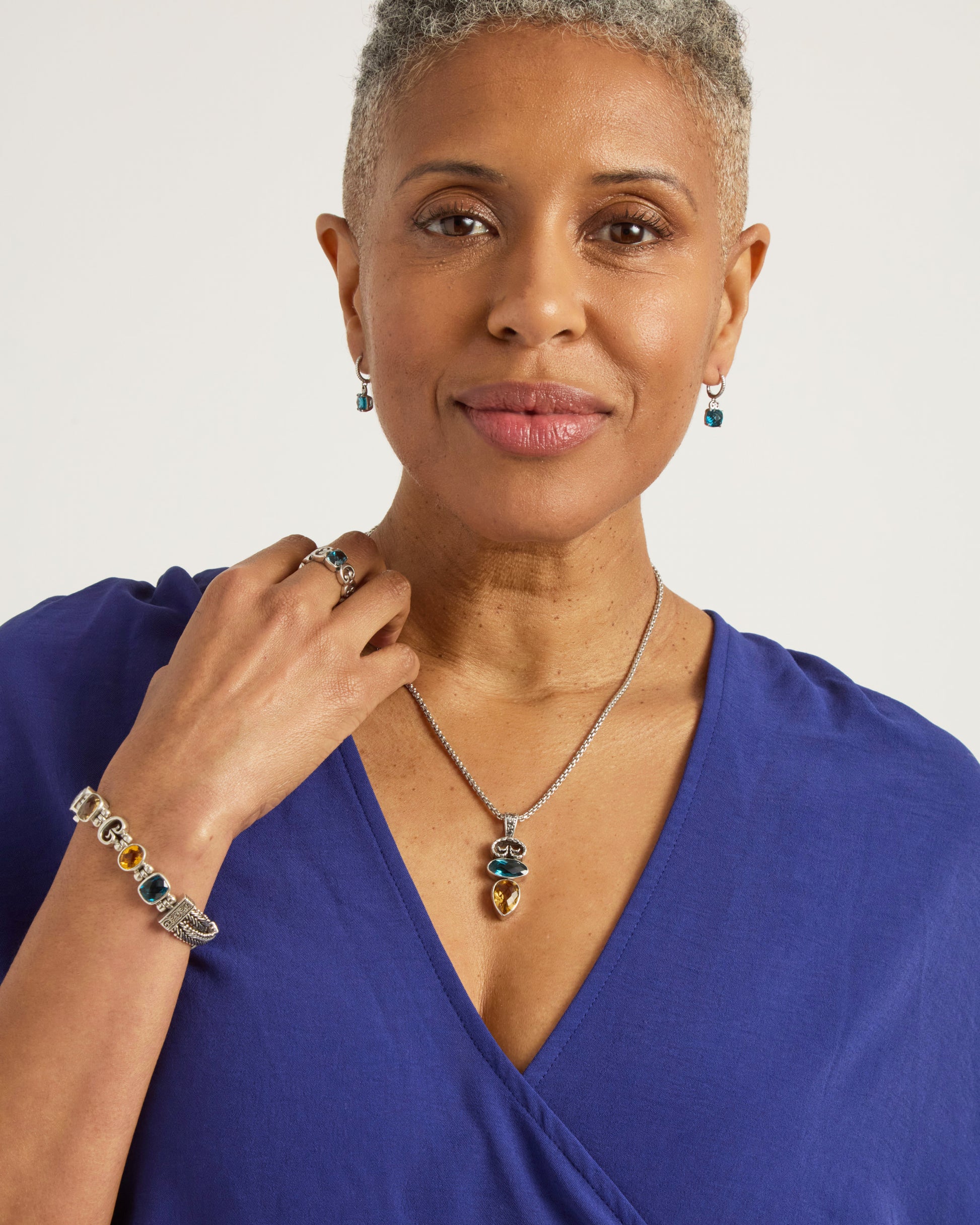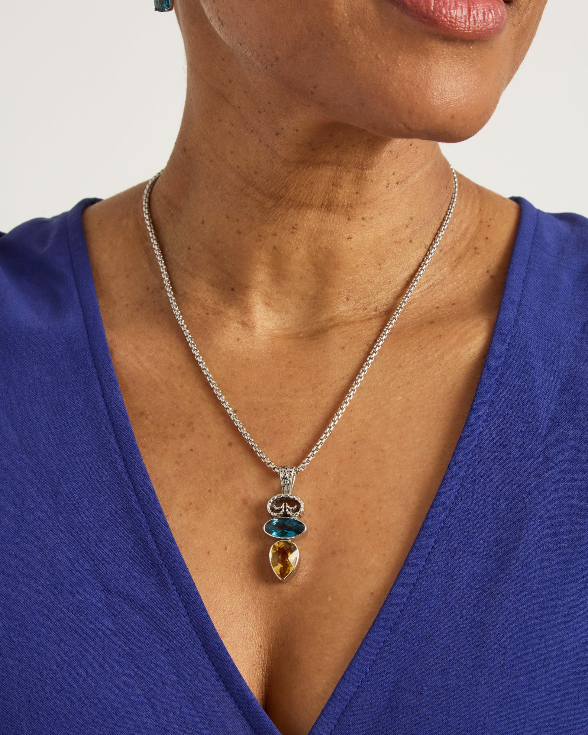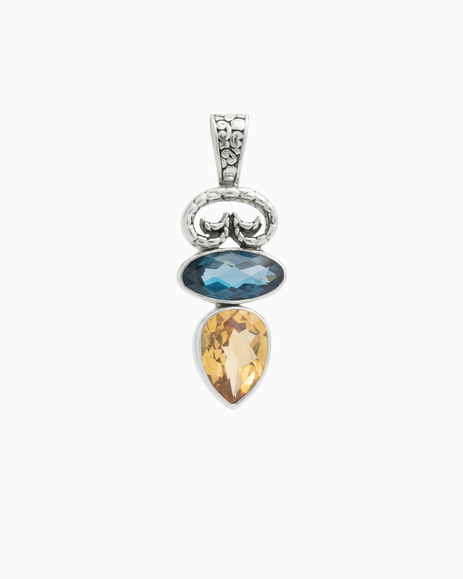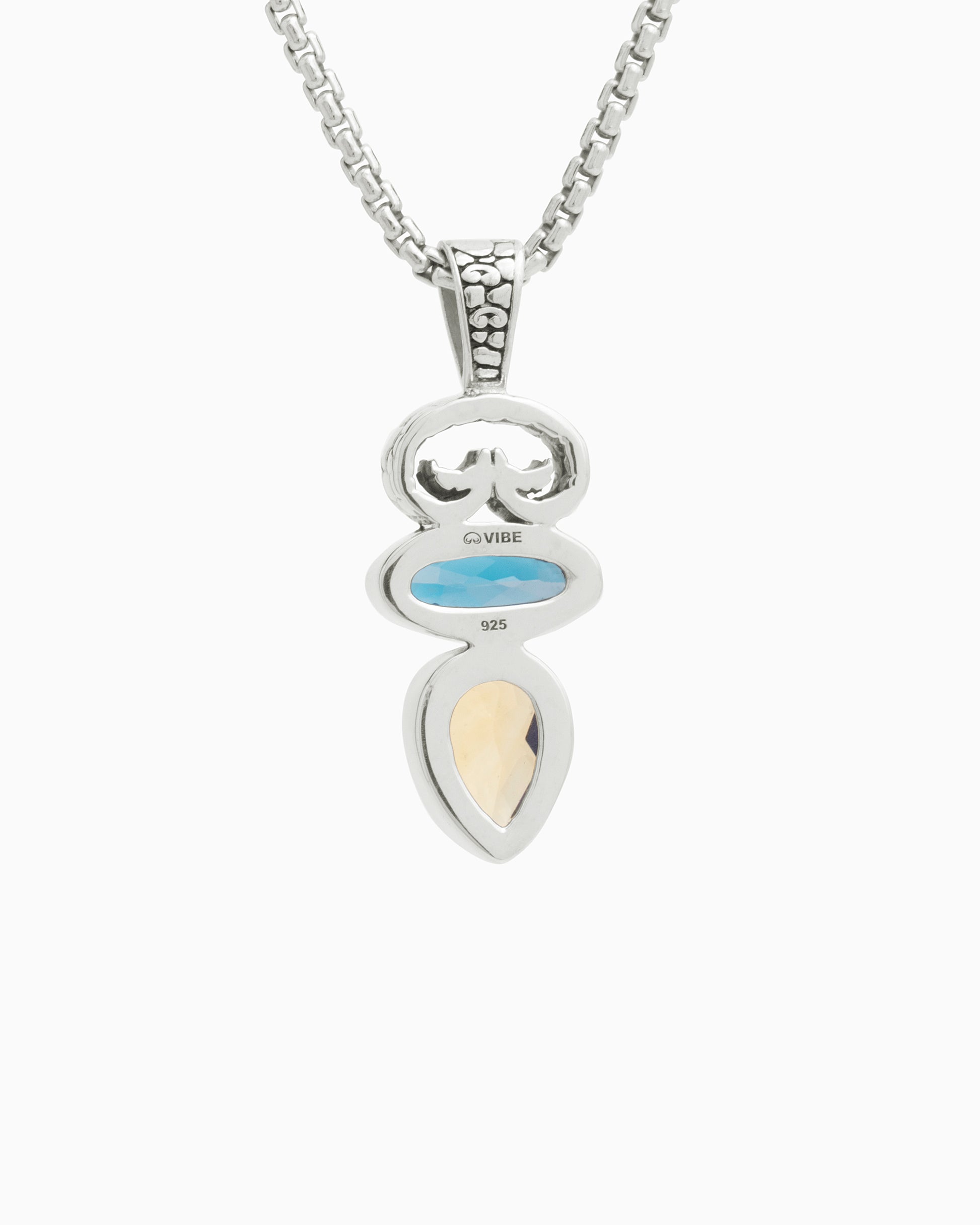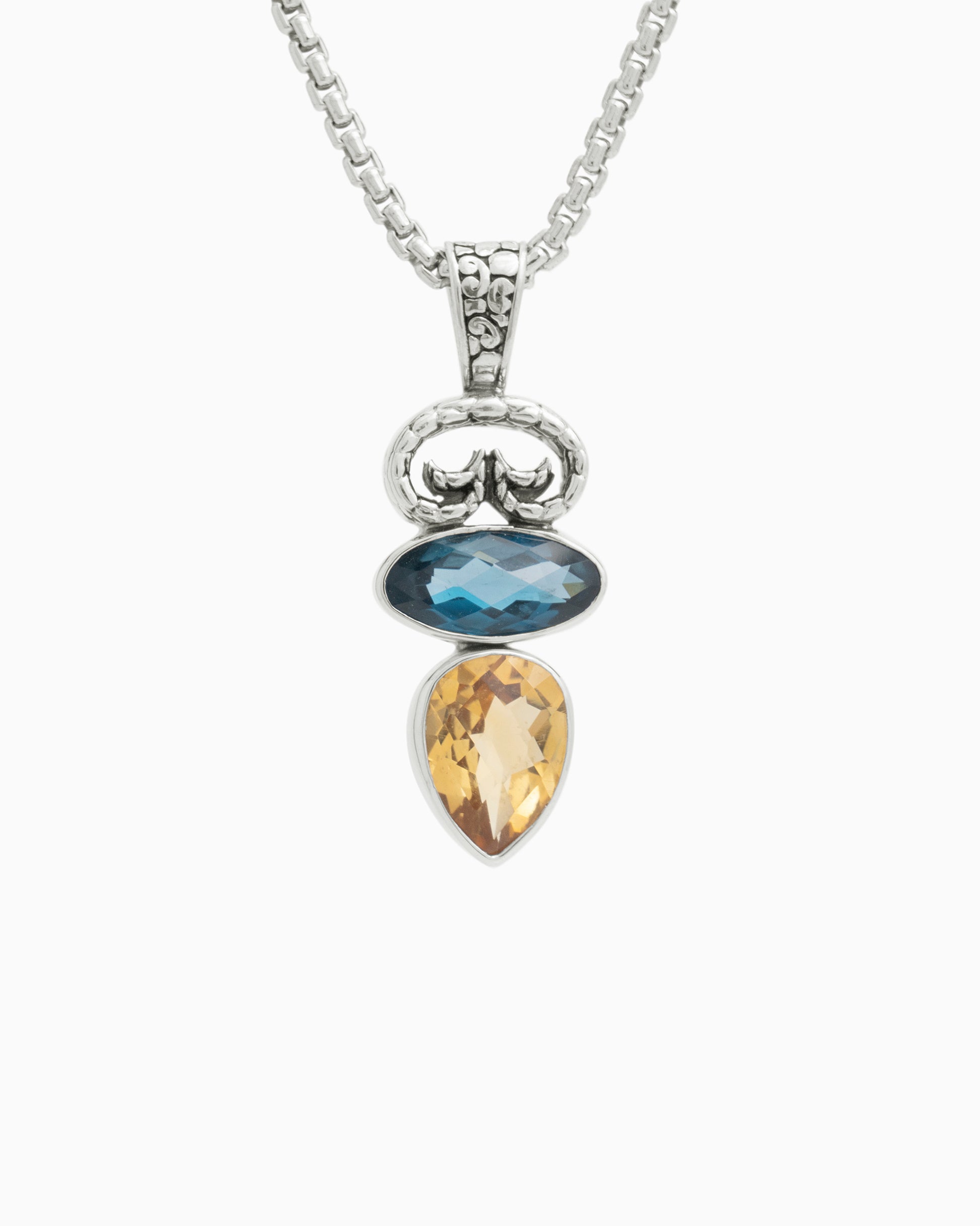 The North Shore Pendant showcases a petroglyph design accompanied by two exquisite stones: an oval faceted London blue topaz and a faceted pear-shaped citrine. Both the petroglyph and the bail are embedded in our exclusive turtle texture with petroglyphs, adding a distinctive and captivating detail. Whether worn solo for an elegant touch or layered for a bold statement, this pendant offers versatile style options. Pair with your favorite chain, sold separately.