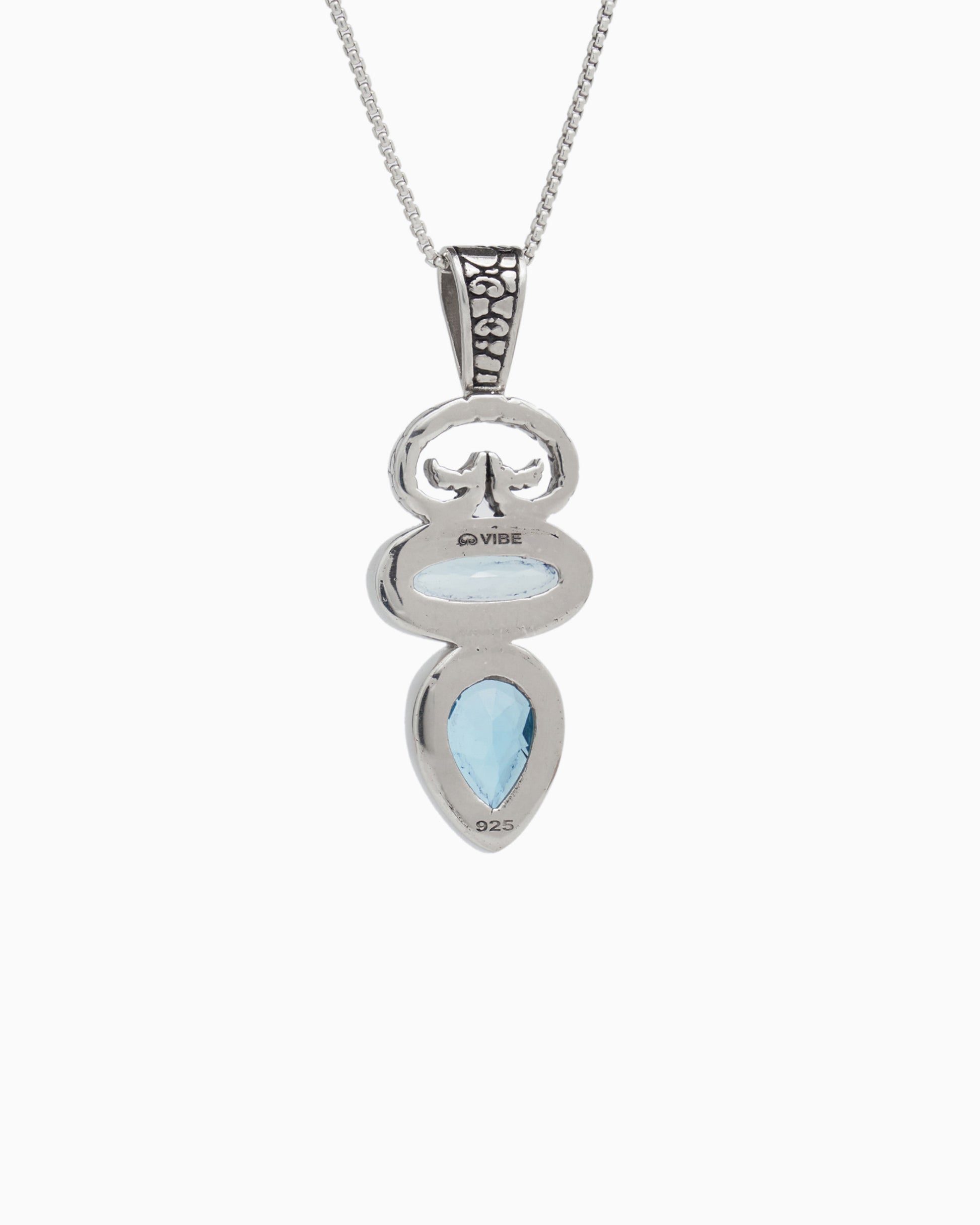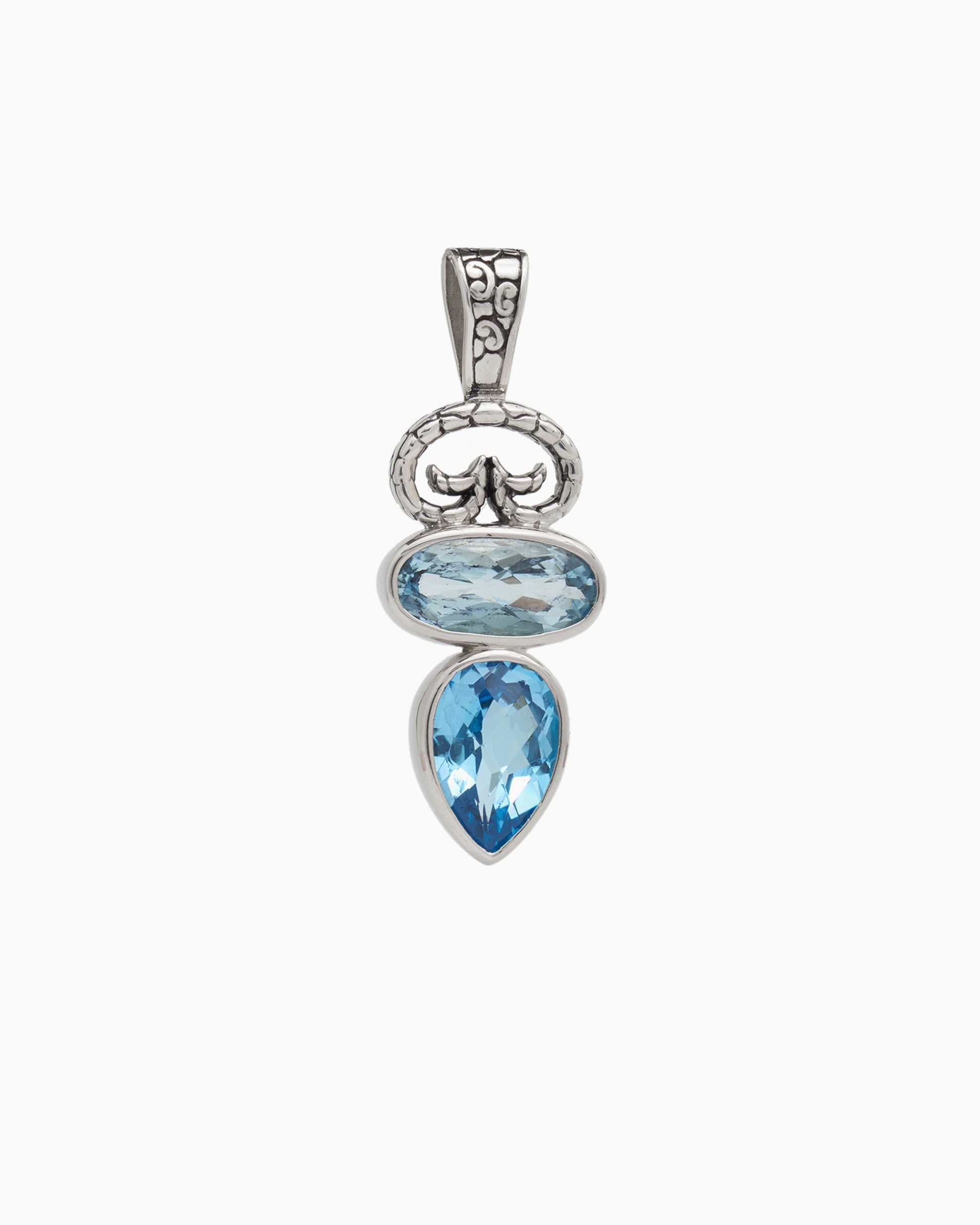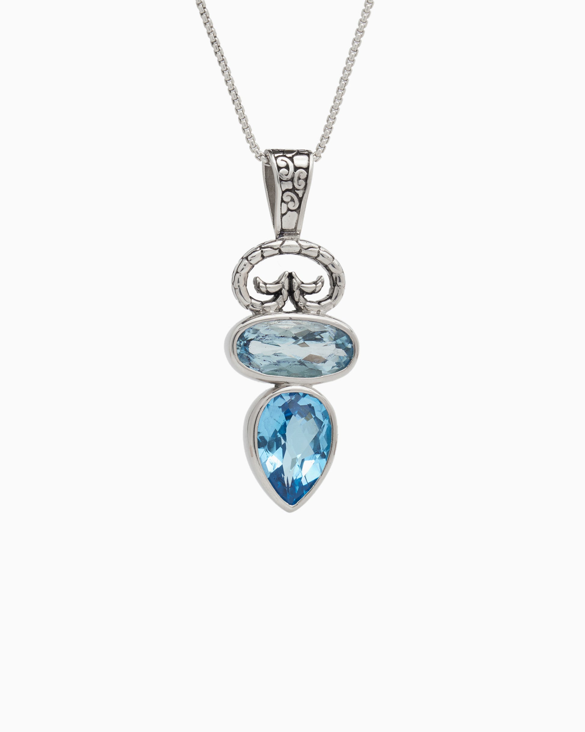 The North Shore Pendant showcases a petroglyph design accompanied by two exquisite stones: an oval faceted sky blue topaz and a pear-shaped faceted Hampton blue topaz. Both the petroglyph and the bail are embedded in our exclusive turtle texture with petroglyphs, adding a distinctive and captivating detail. Whether worn solo for an elegant touch or layered for a bold statement, this pendant offers versatile style options. Pair with your favorite chain, sold separately.