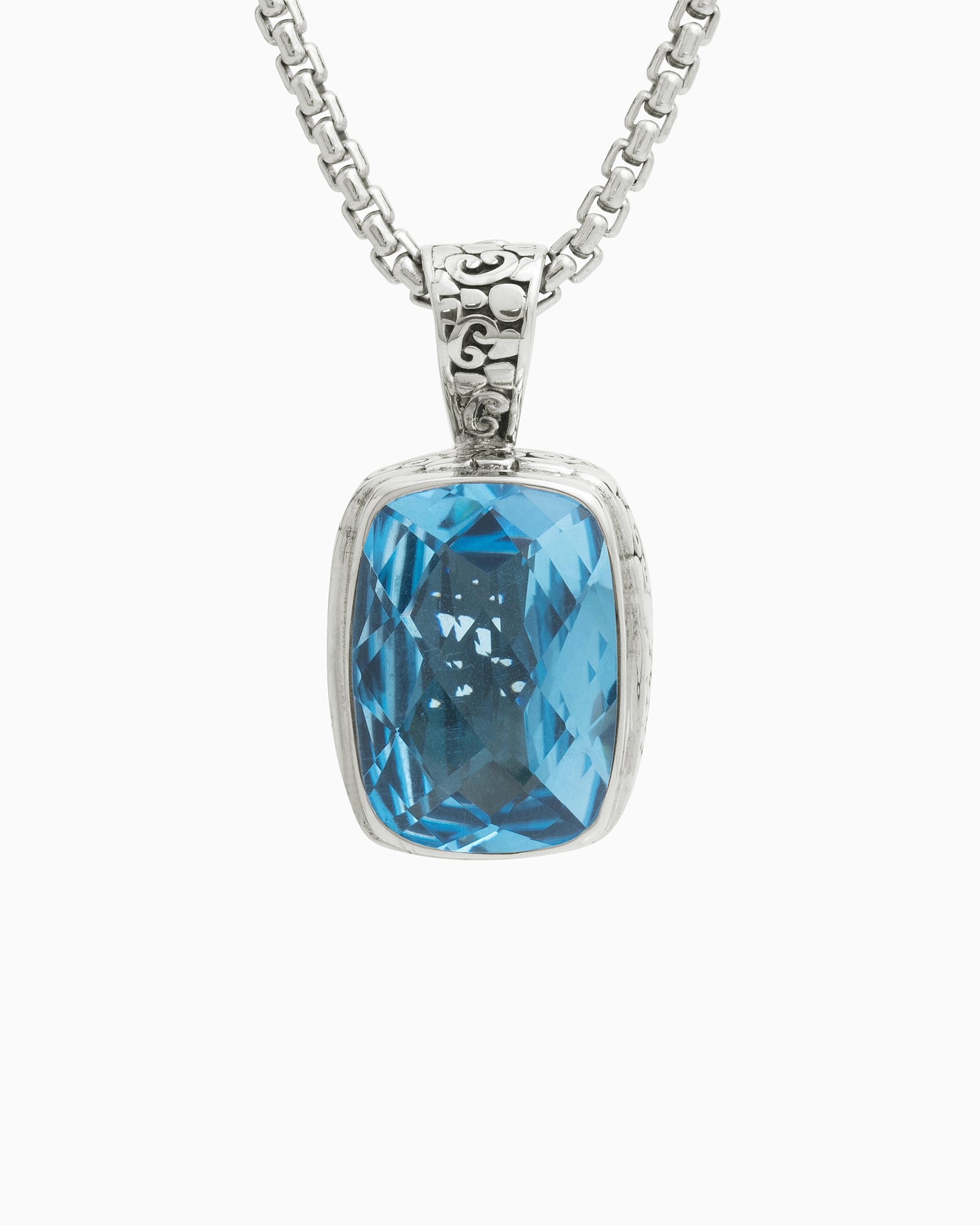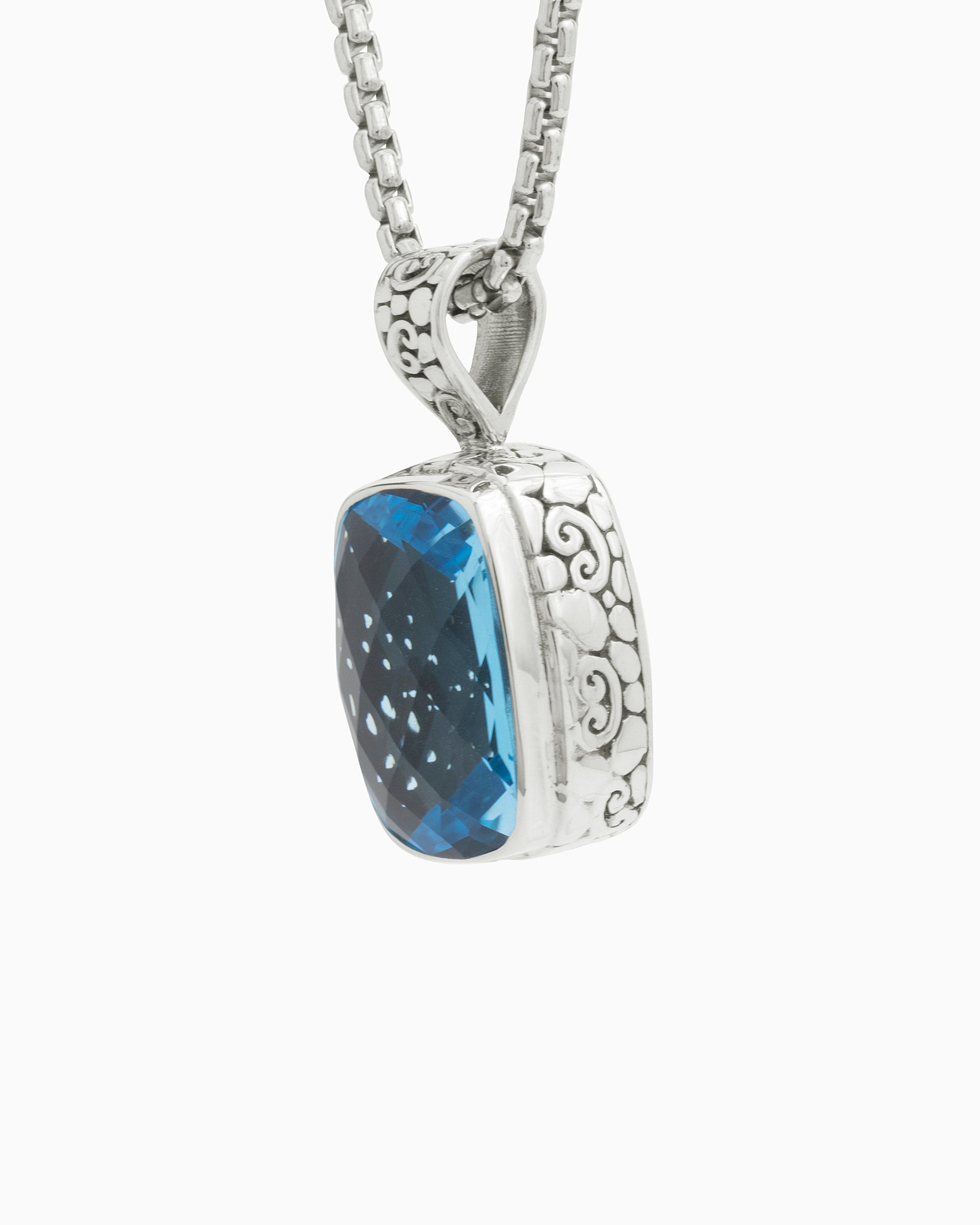 The North Star Stone Pendant is a statement piece that will add a playful touch to your look. Featuring a faceted Hampton blue topaz stone set in sterling silver and our signature turtle texture with petroglyphs. Pair with your favorite chain, sold separately.