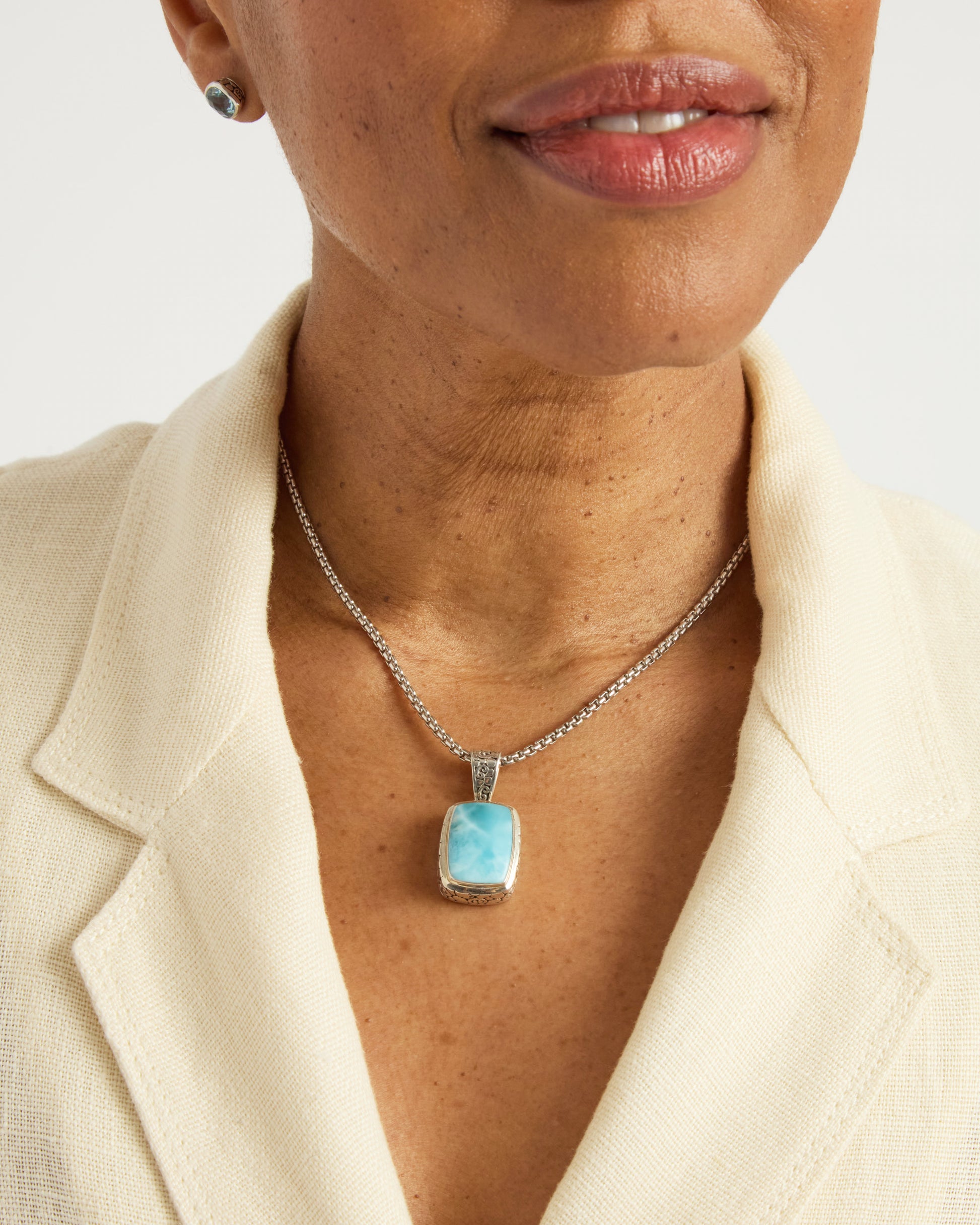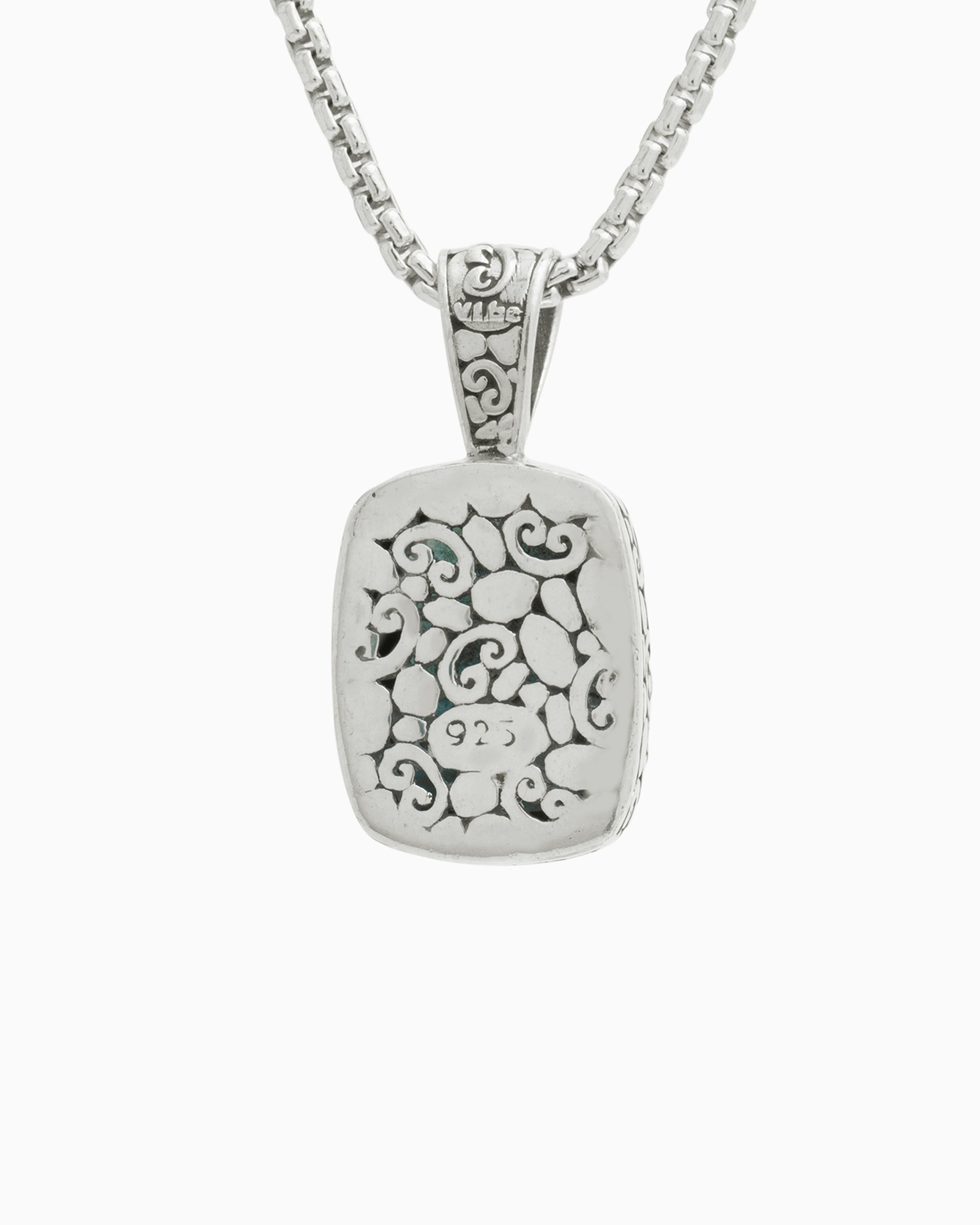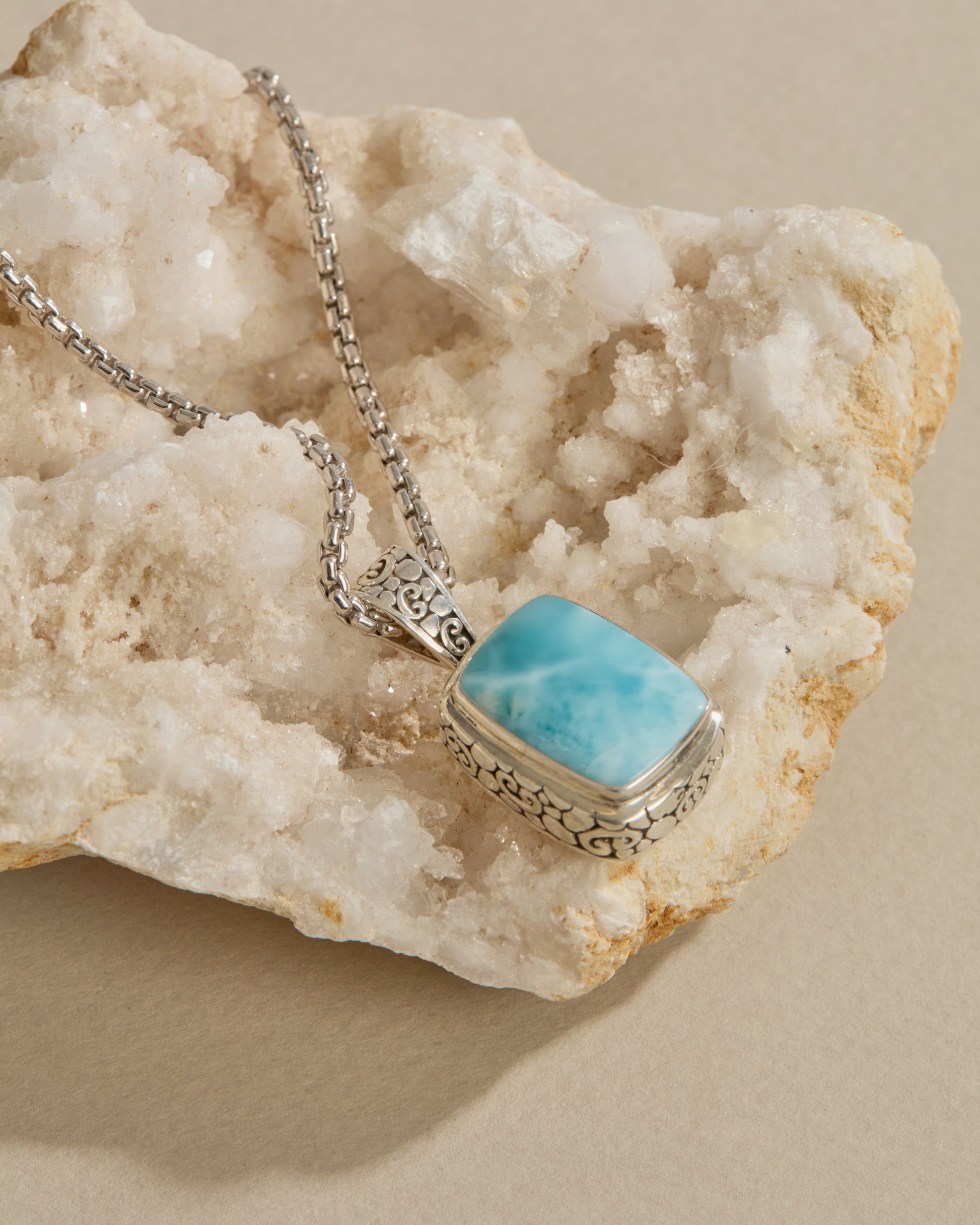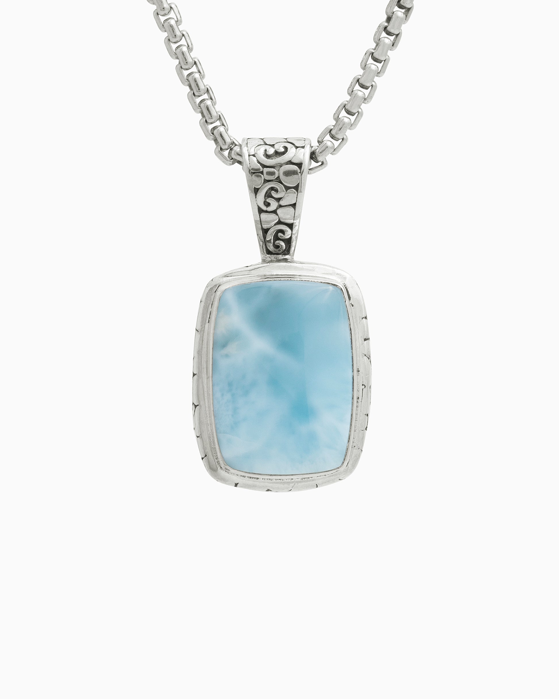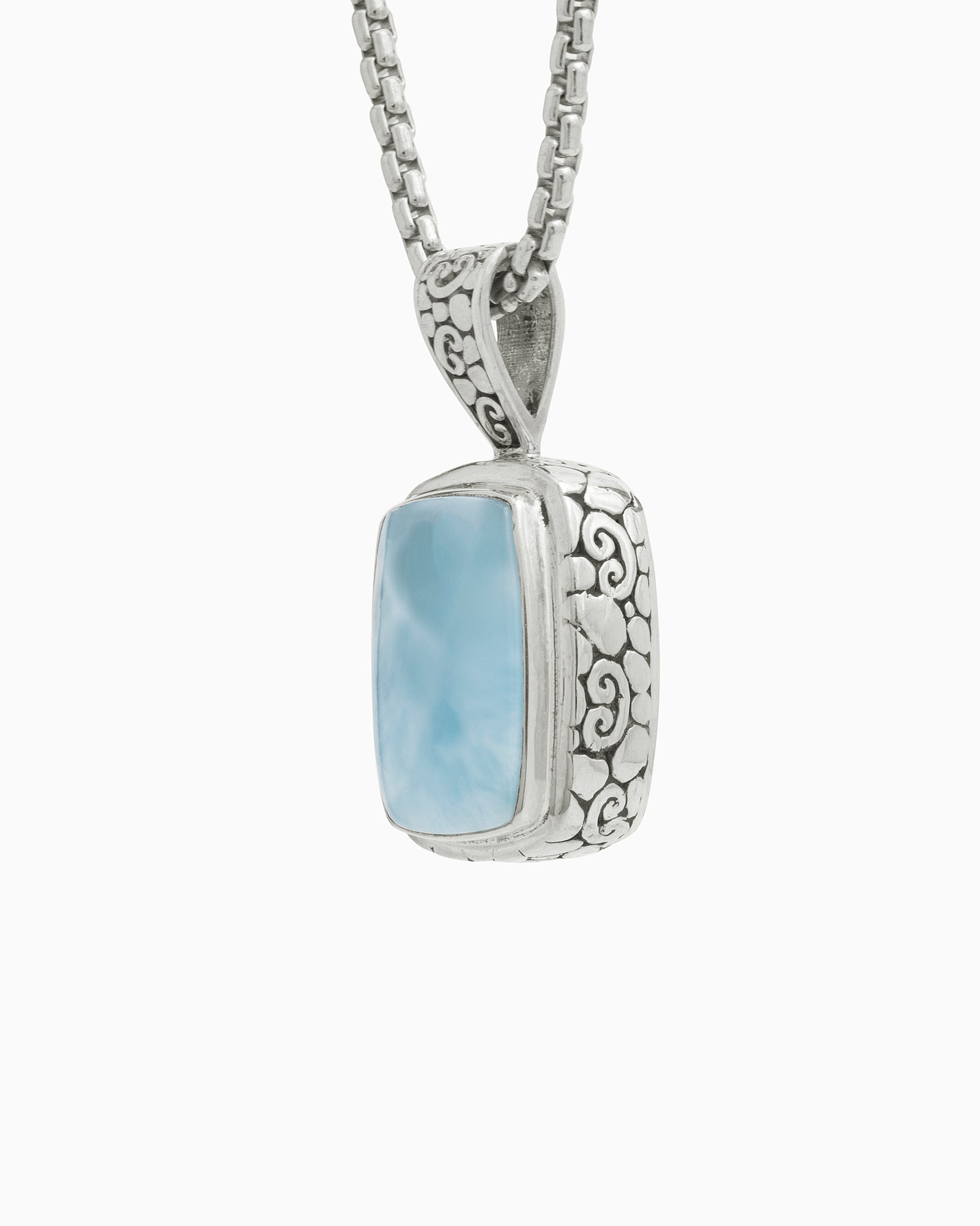 The North Star Stone Pendant is a statement piece that will add a playful touch to your look. Featuring a larimar cabochon set in sterling silver and our signature turtle texture with petroglyphs. Pair with your favorite chain, sold separately.