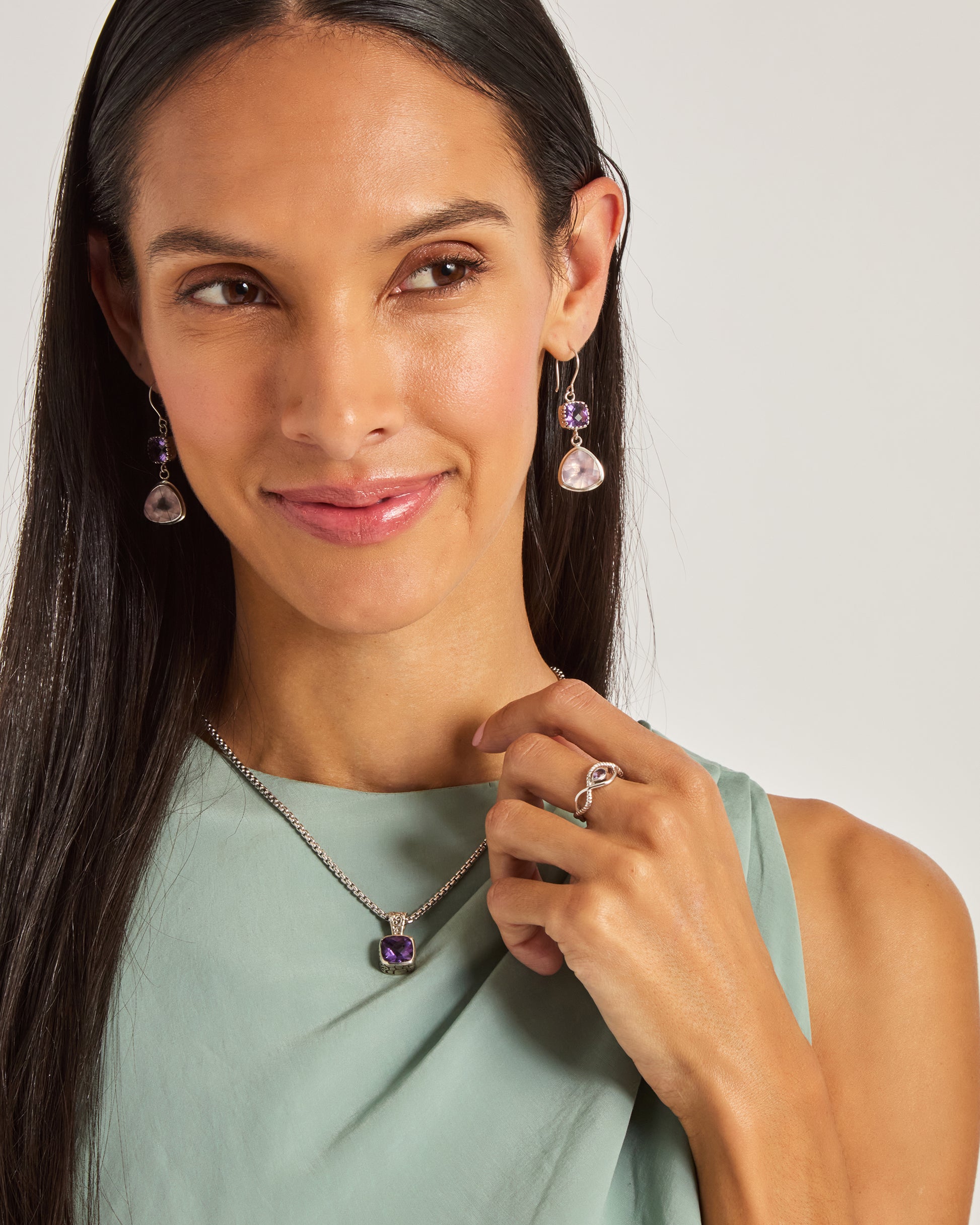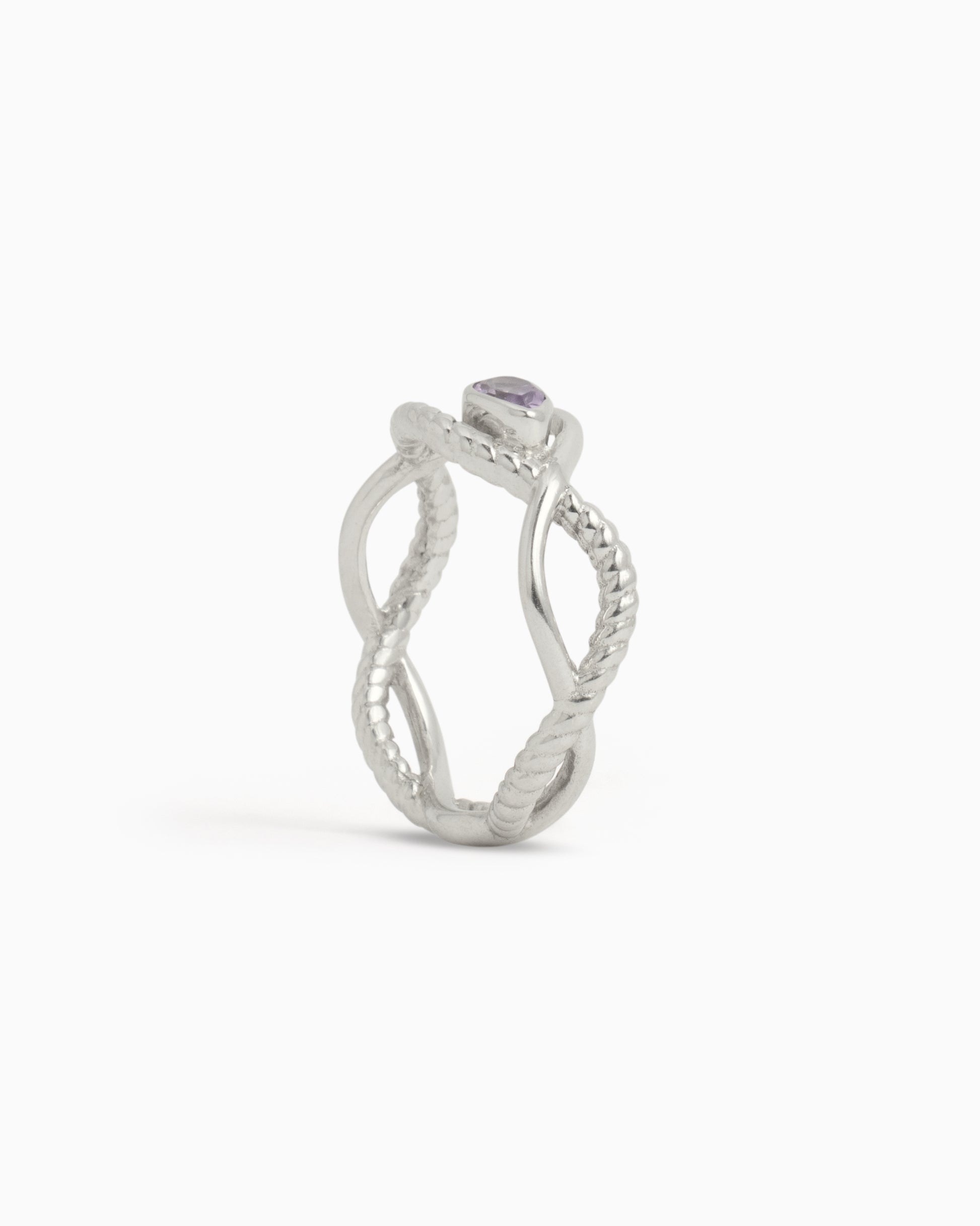Follow the current of the ocean with the Ocean Current Ring. This unique piece is handcrafted from sterling silver with a wave and rope-inspired band and features a luminous pear-cut amethyst stone.